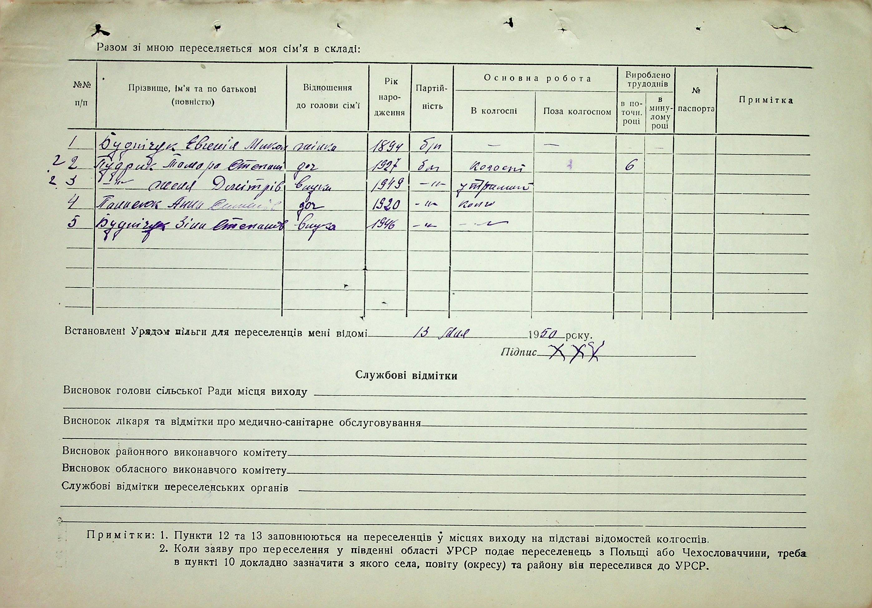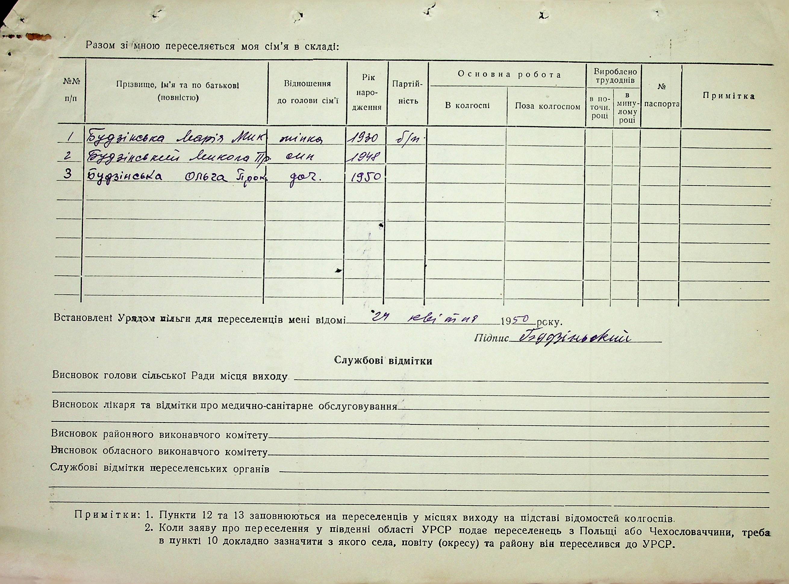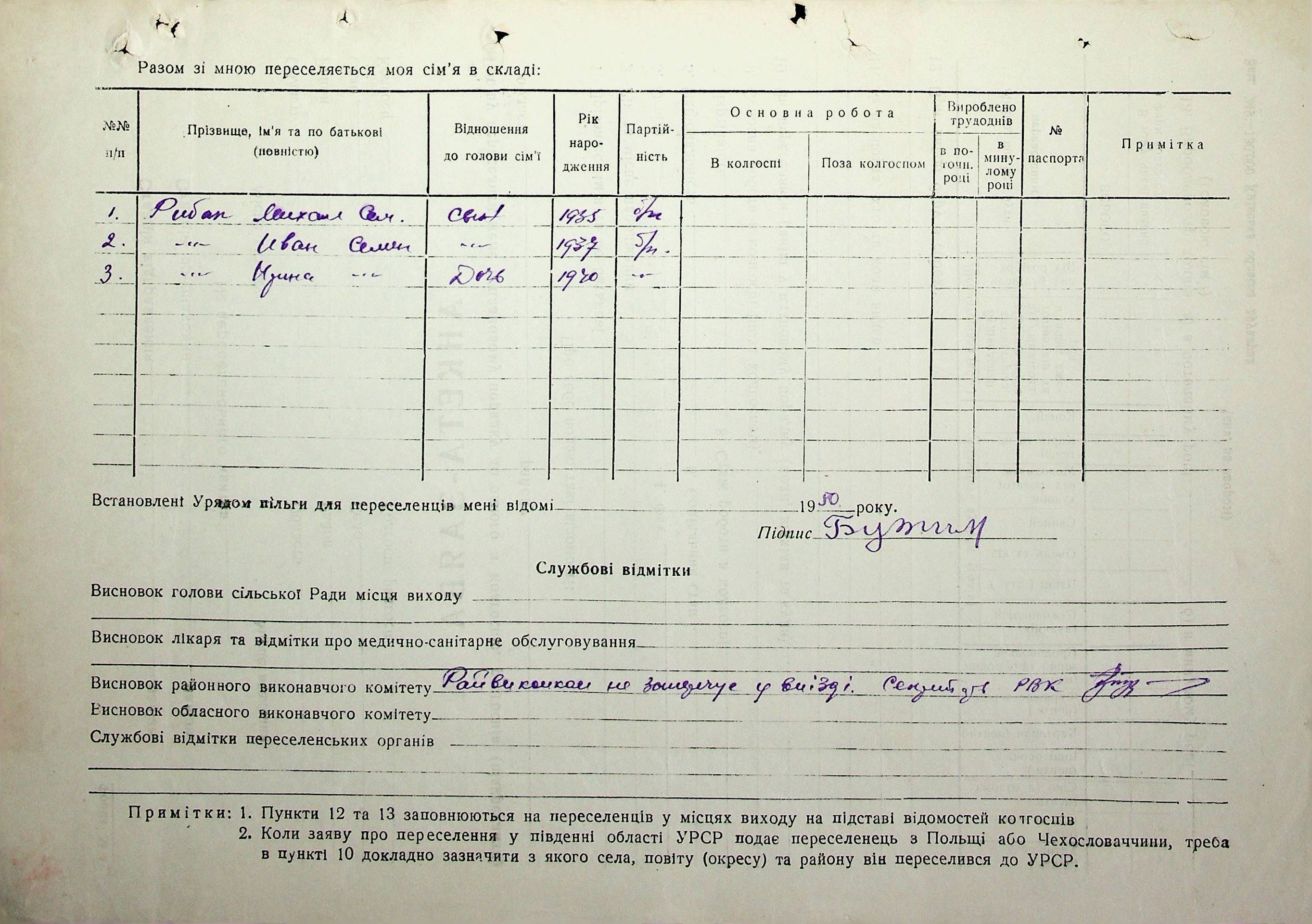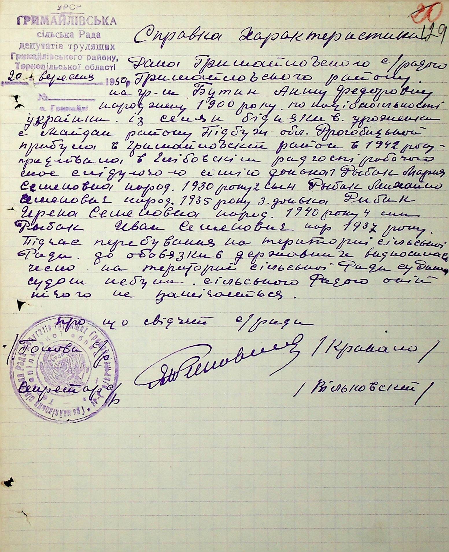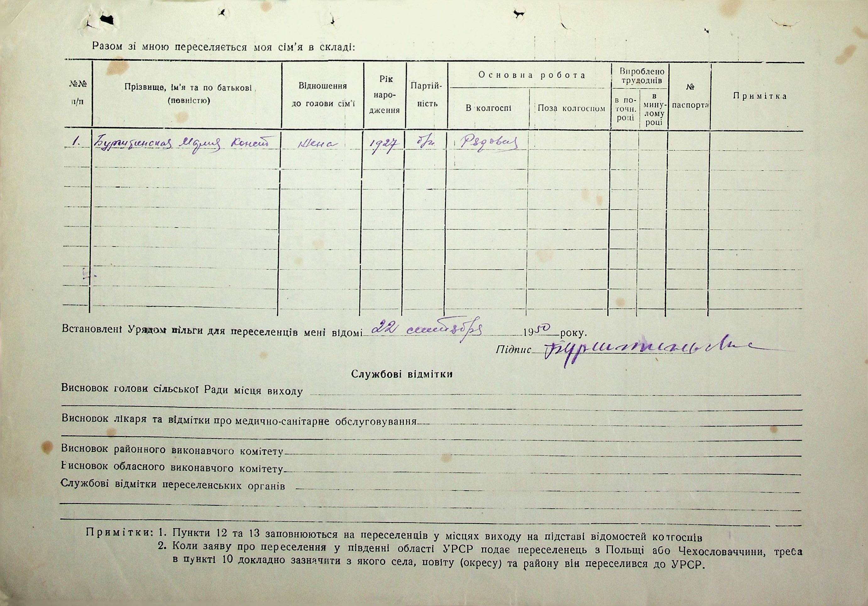 Довідки-характеристики, надані сільськими та селищними Радами депутатів трудящих на від’їжджаючих голів сімей та склад їх родин”