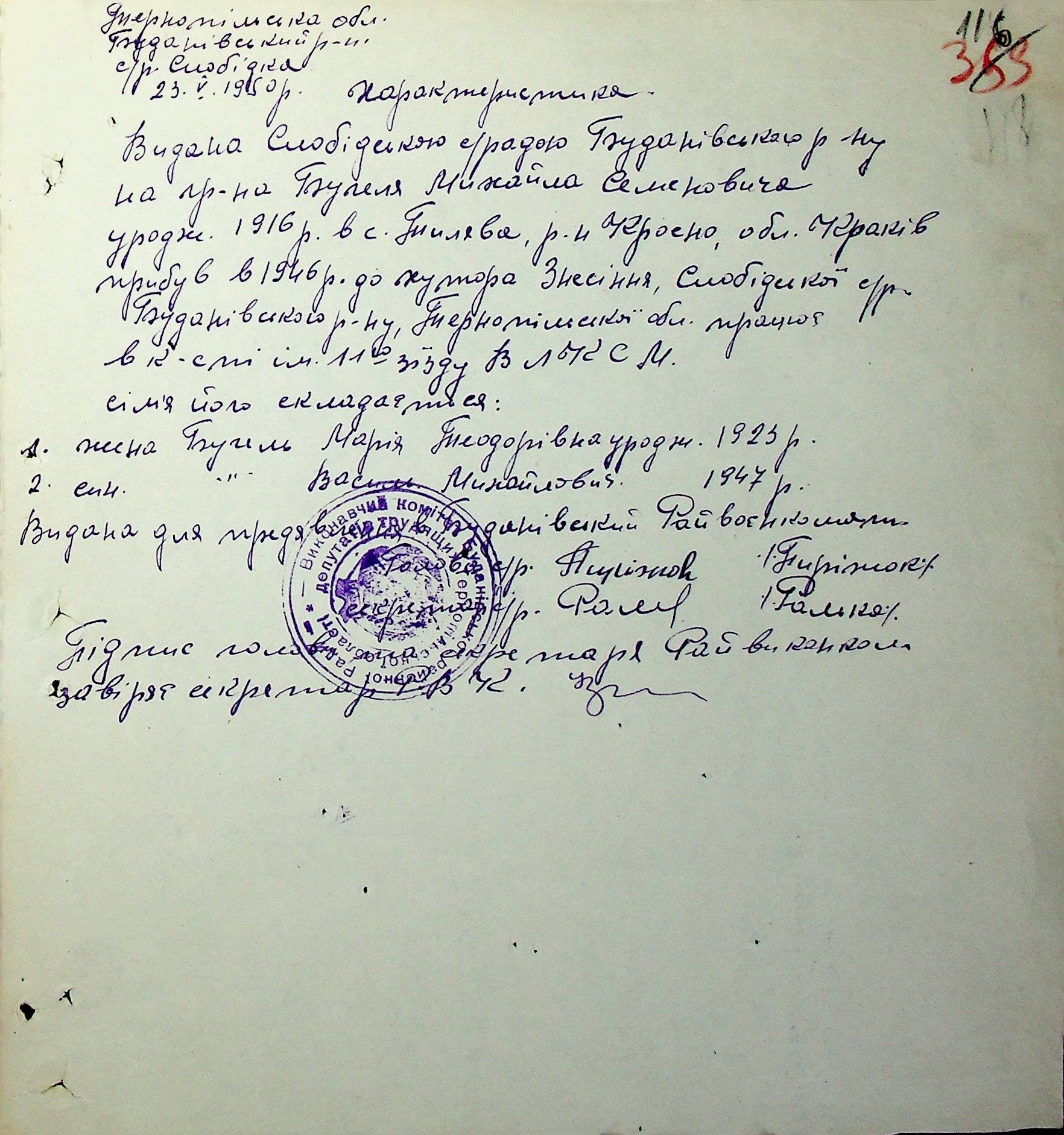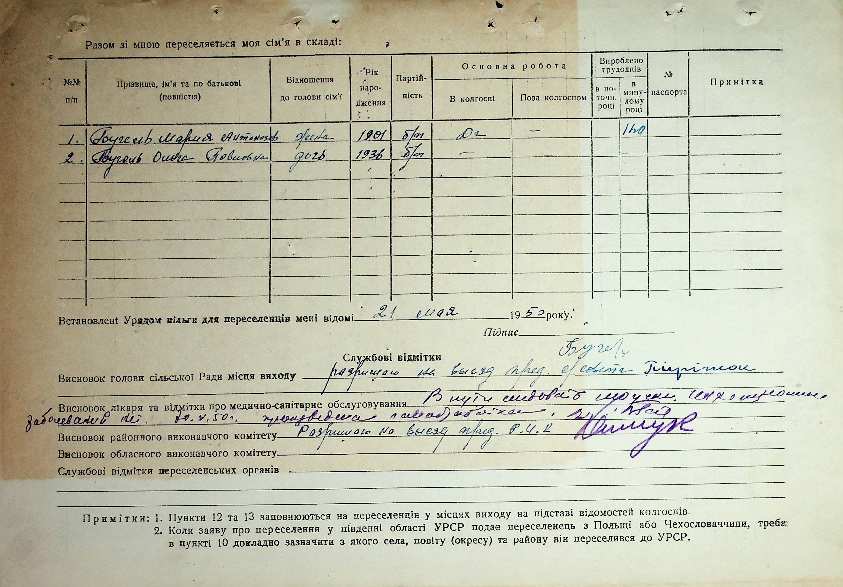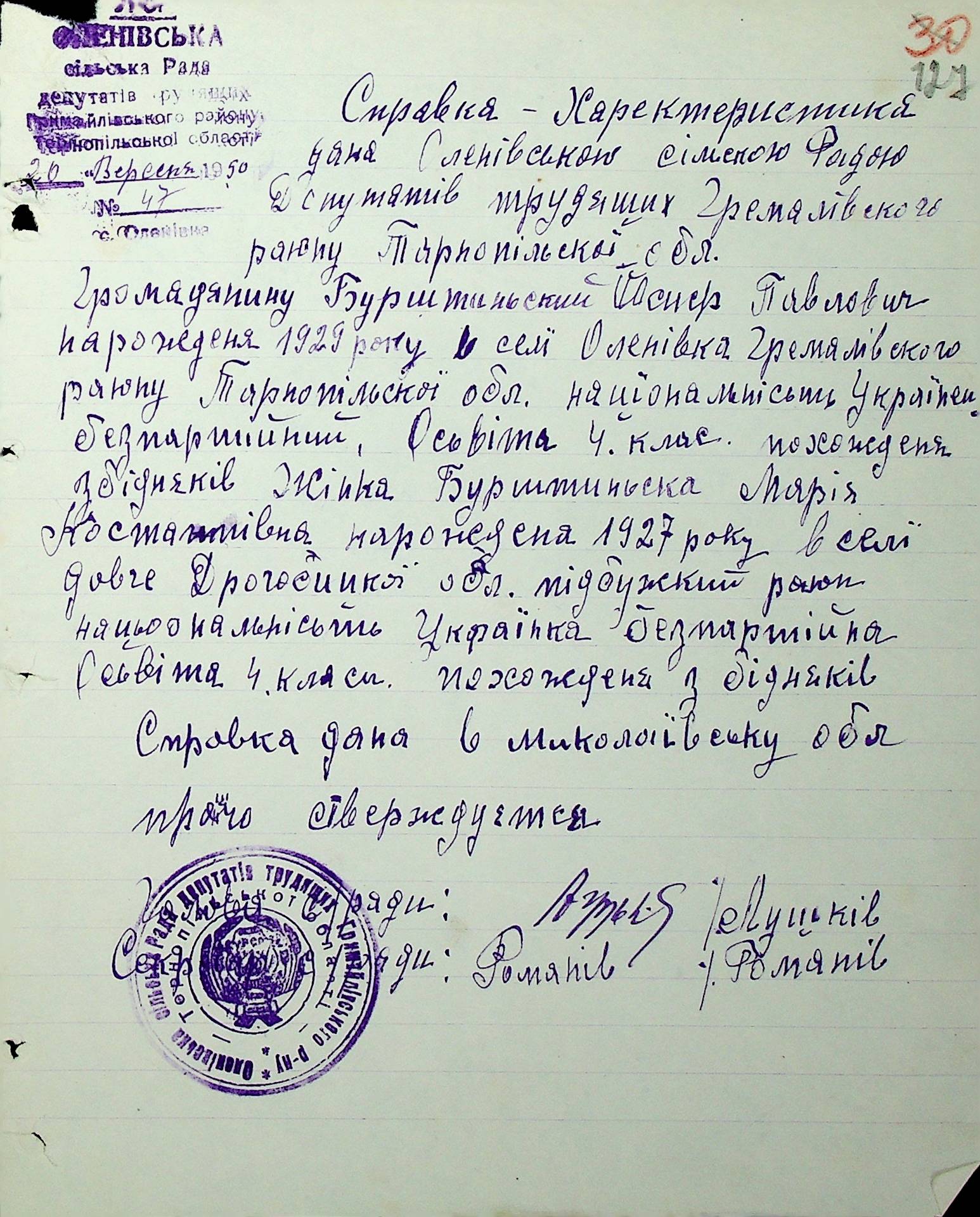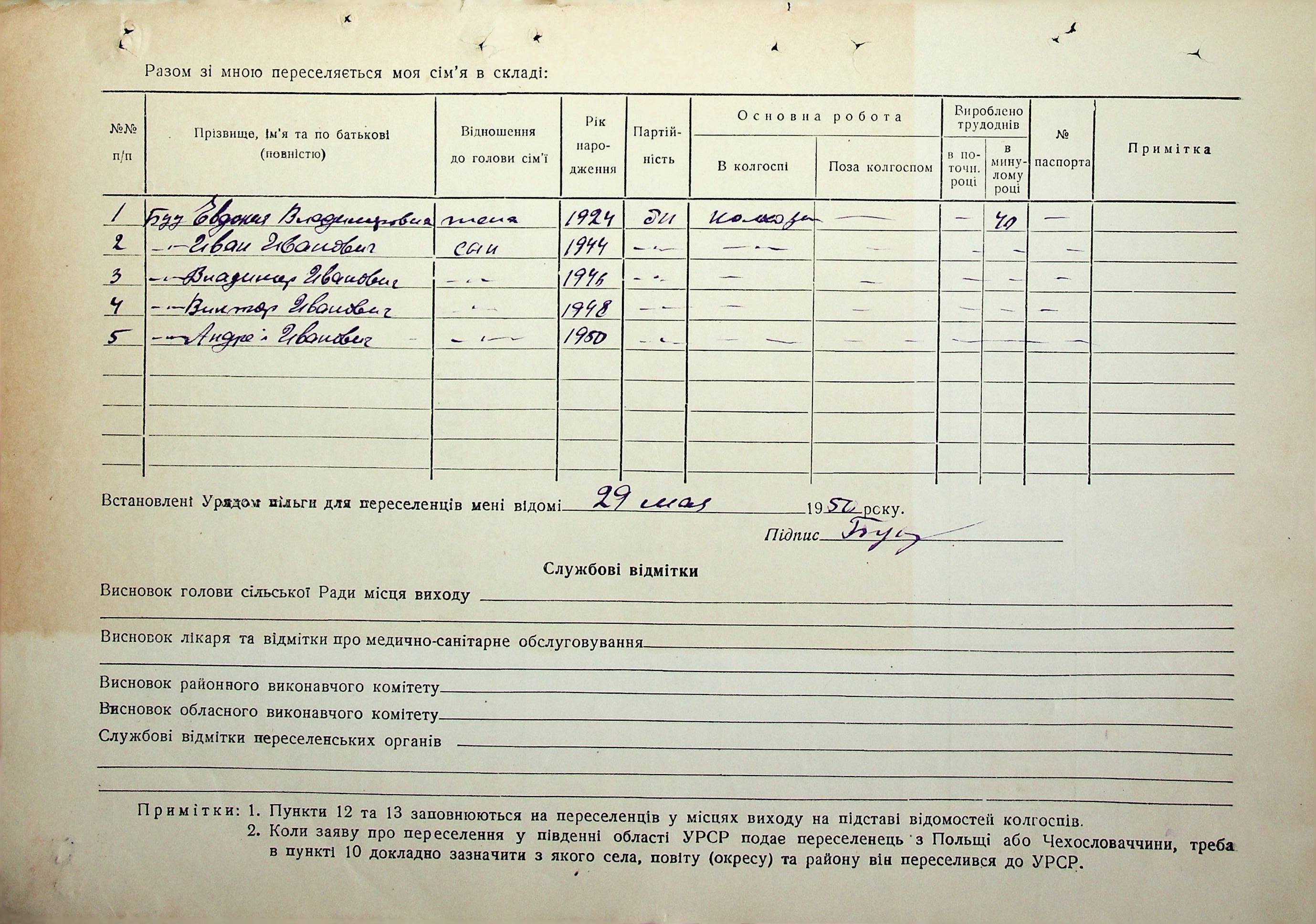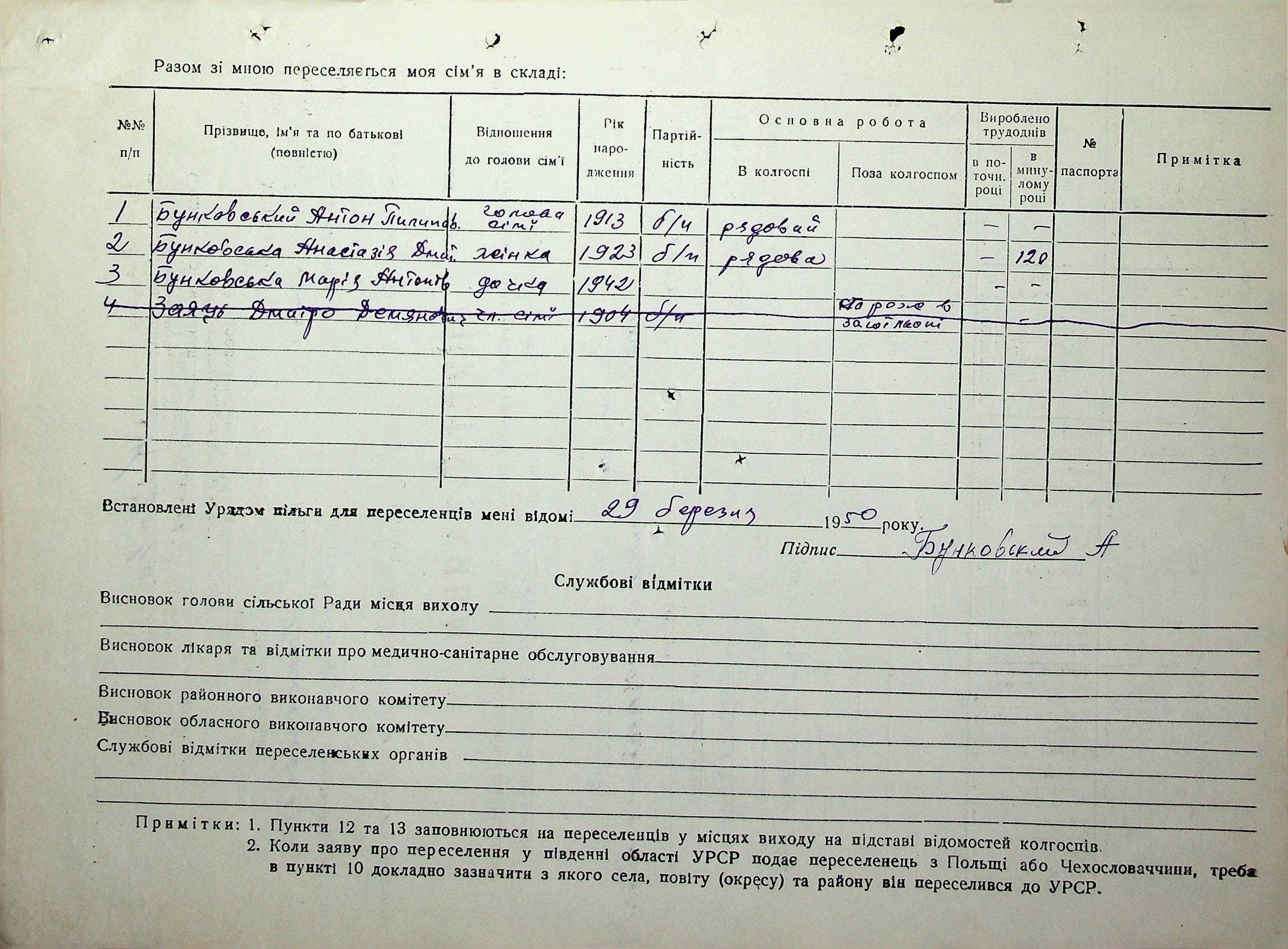 Довідки-характеристики, надані сільськими та селищними Радами депутатів трудящих на від’їжджаючих голів сімей та склад їх родин”