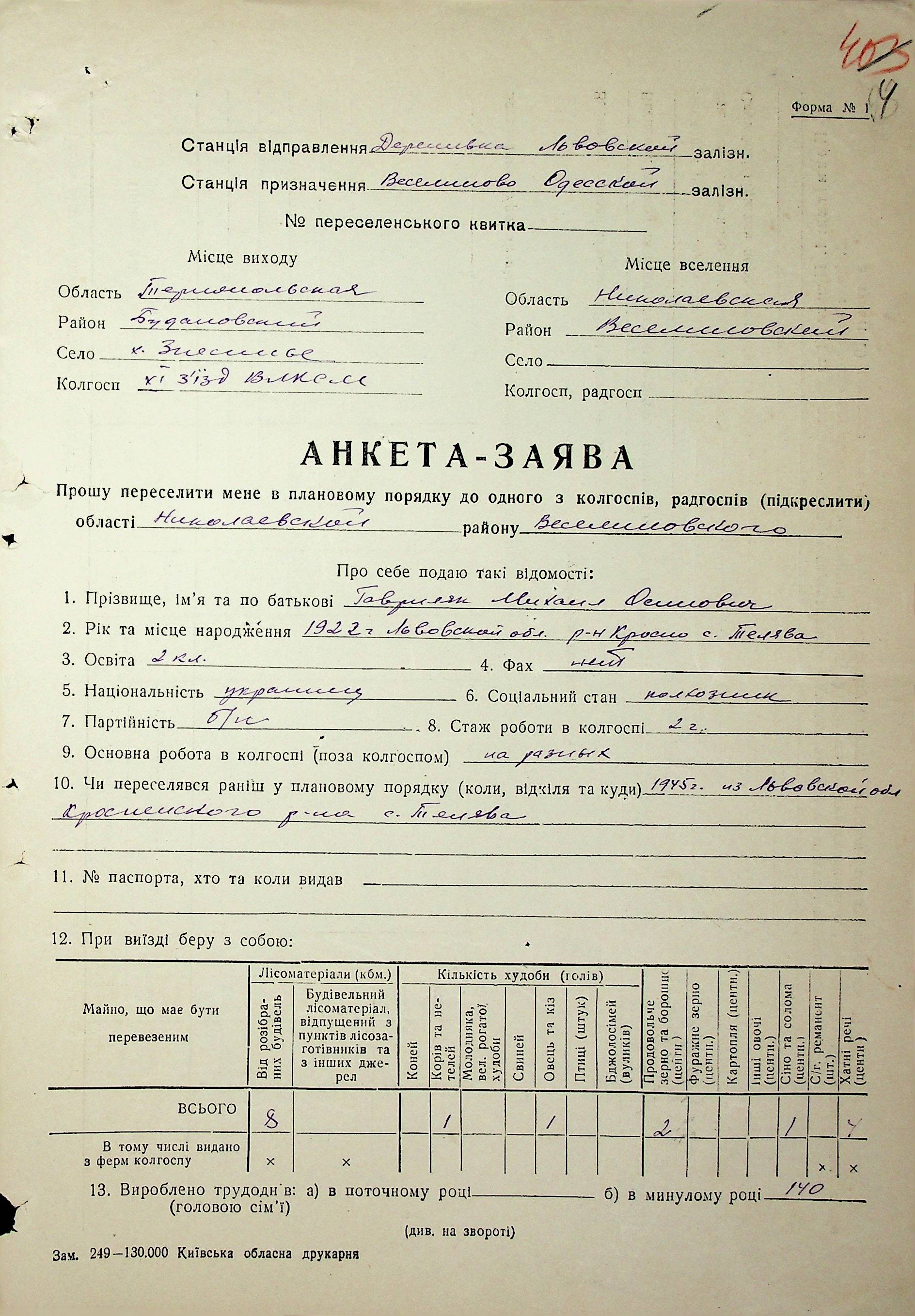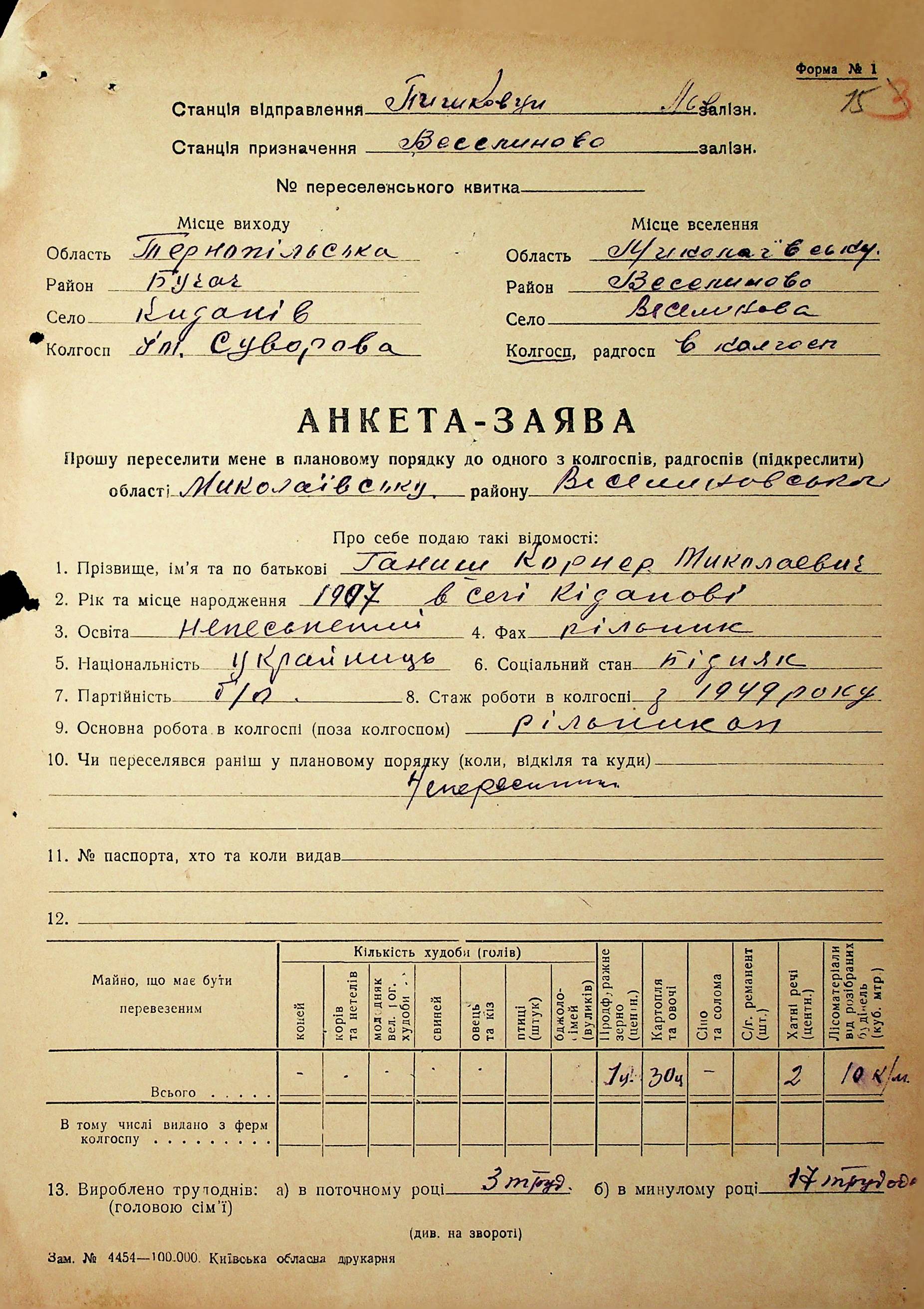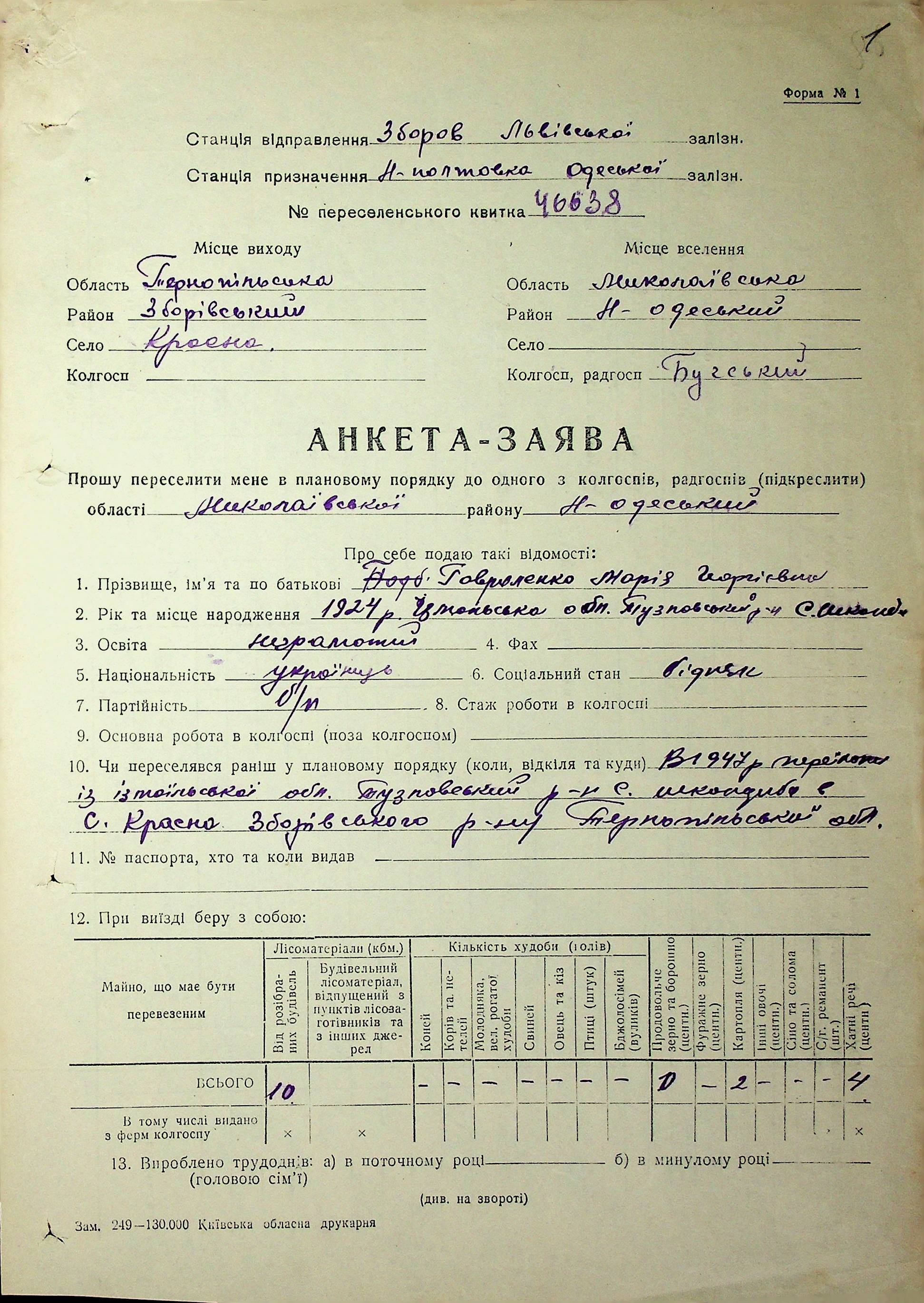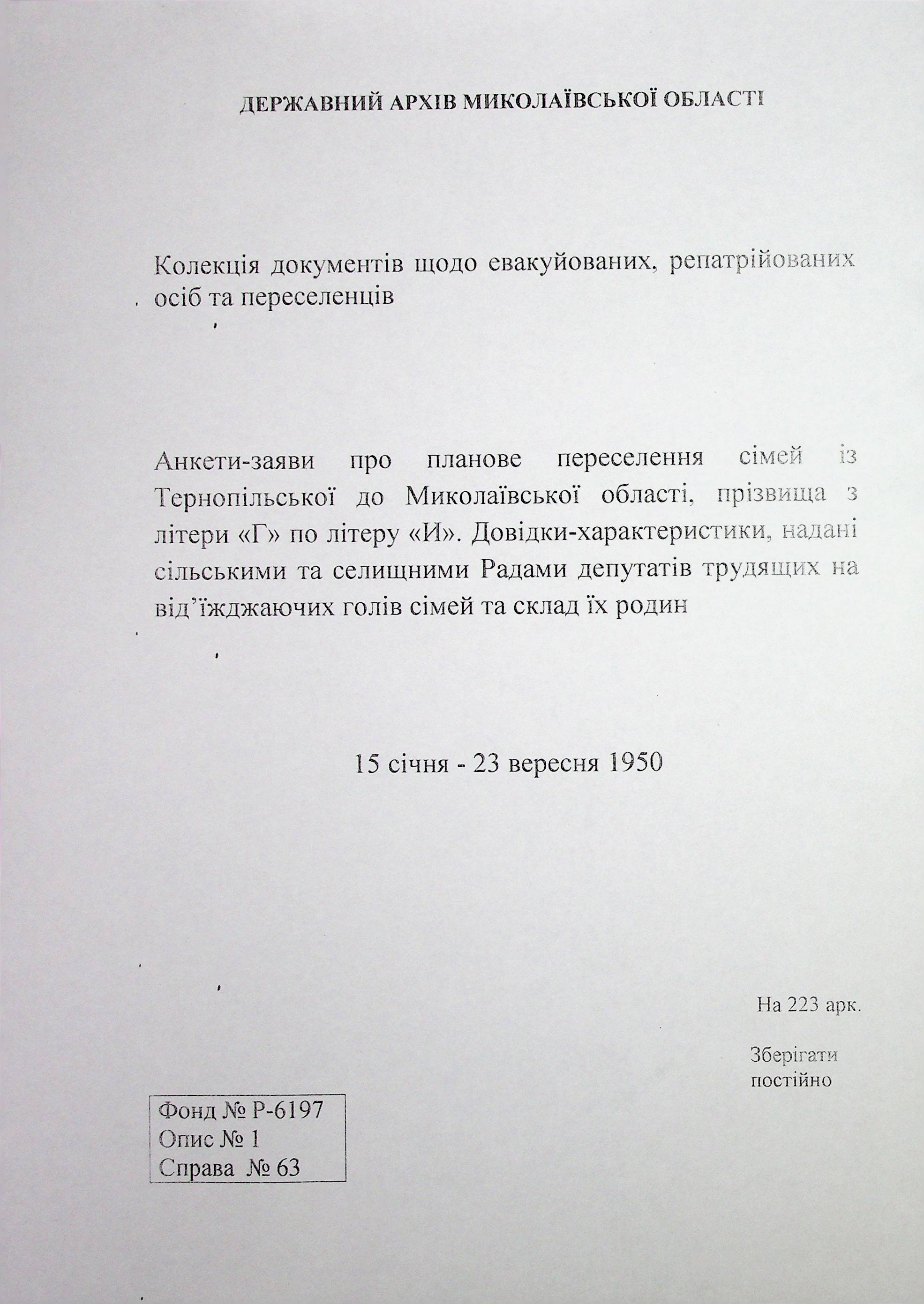 • • • • Справа № 63 “Анкети-заяви про планове переселення сімей з Тернопільської до Миколаївської області, прізвища з літери «Г» по літеру «И».