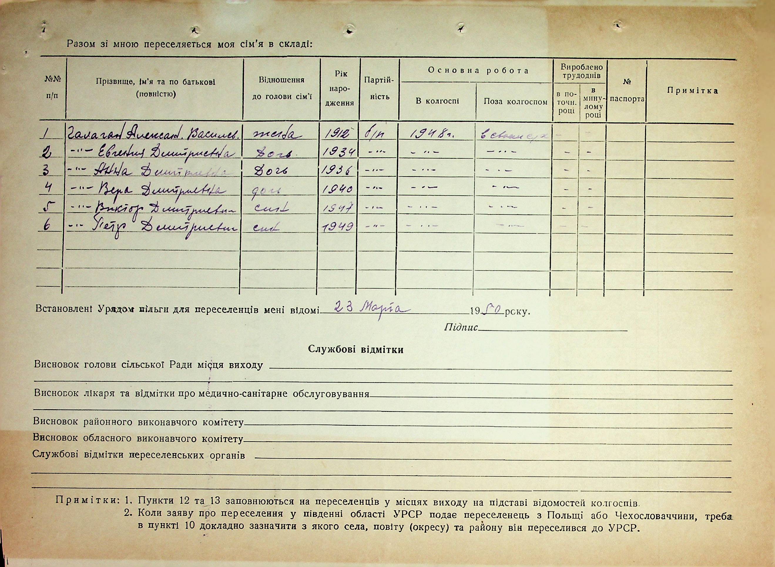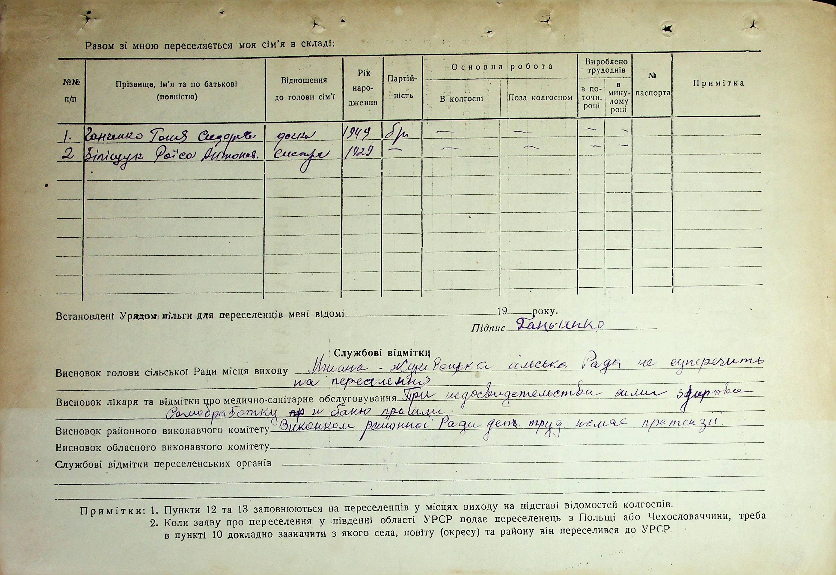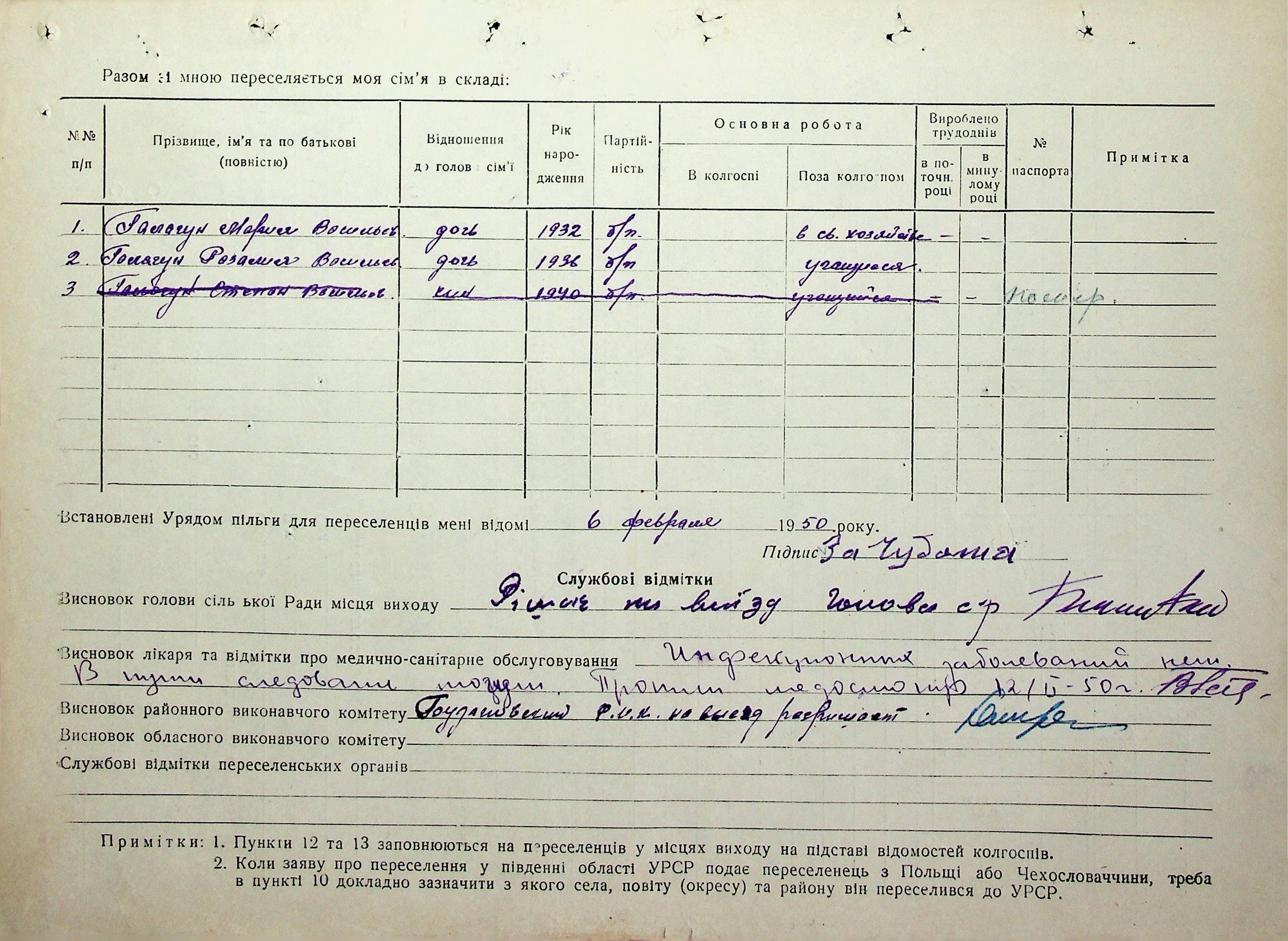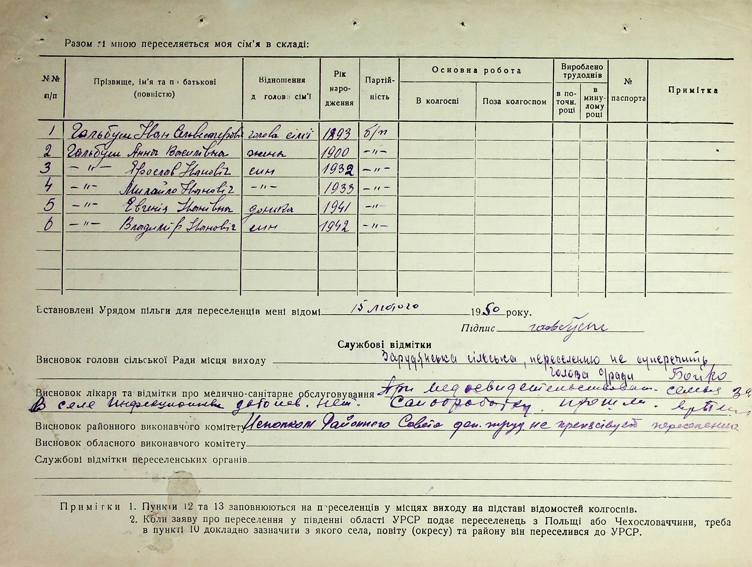 Довідки-характеристики, надані сільськими та селищними Радами депутатів трудящих на від’їжджаючих голів сімей та склад їх родин”