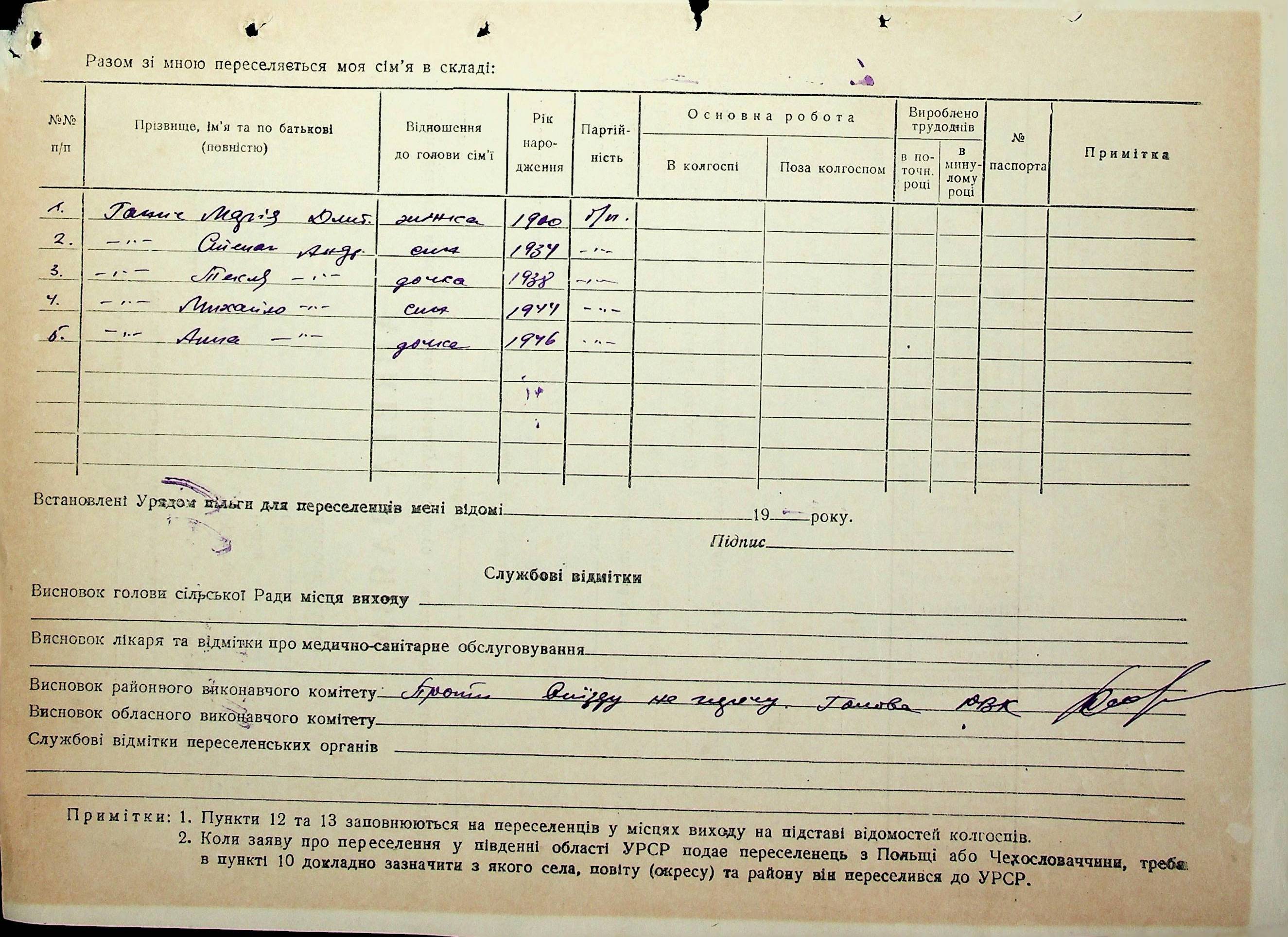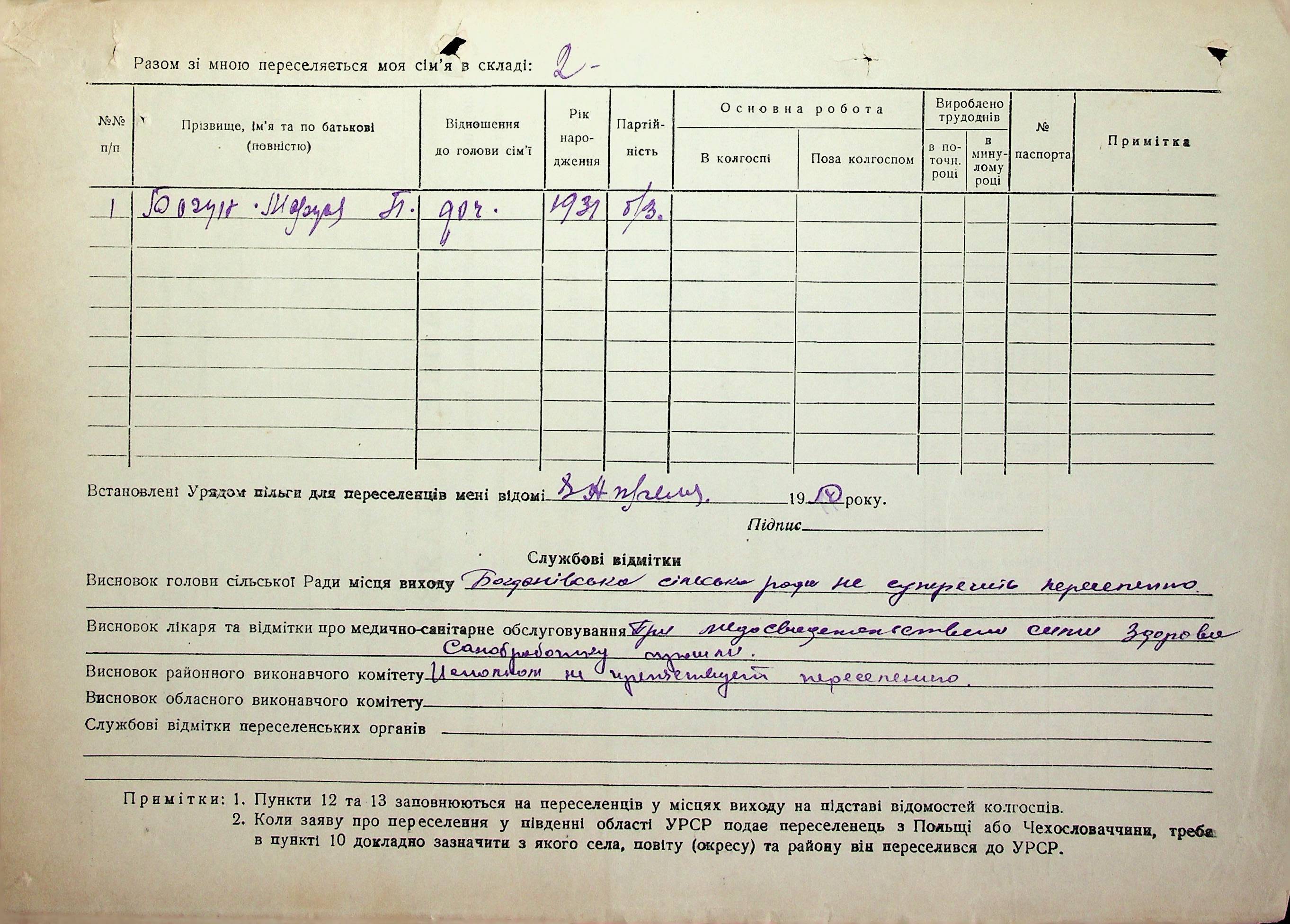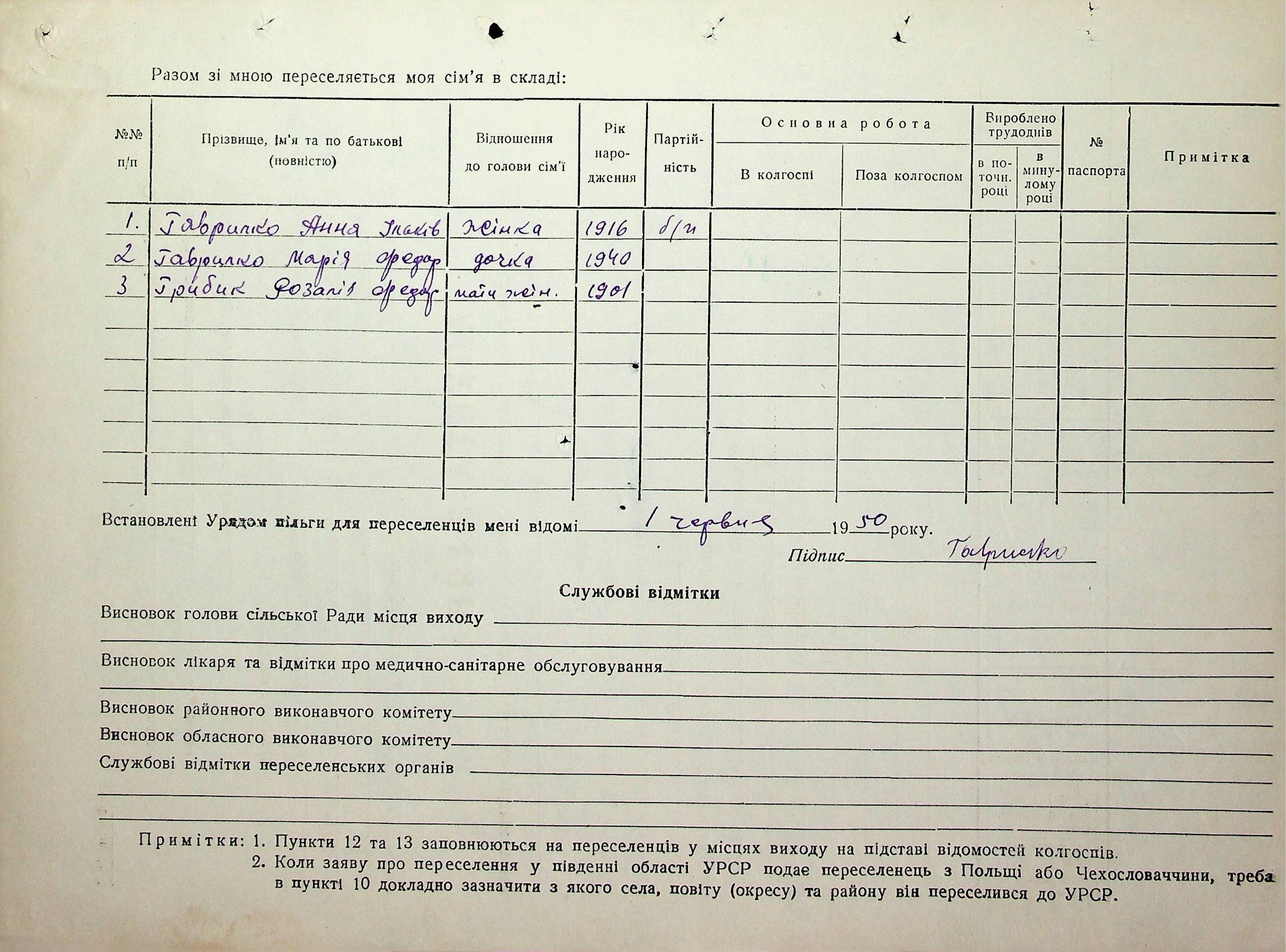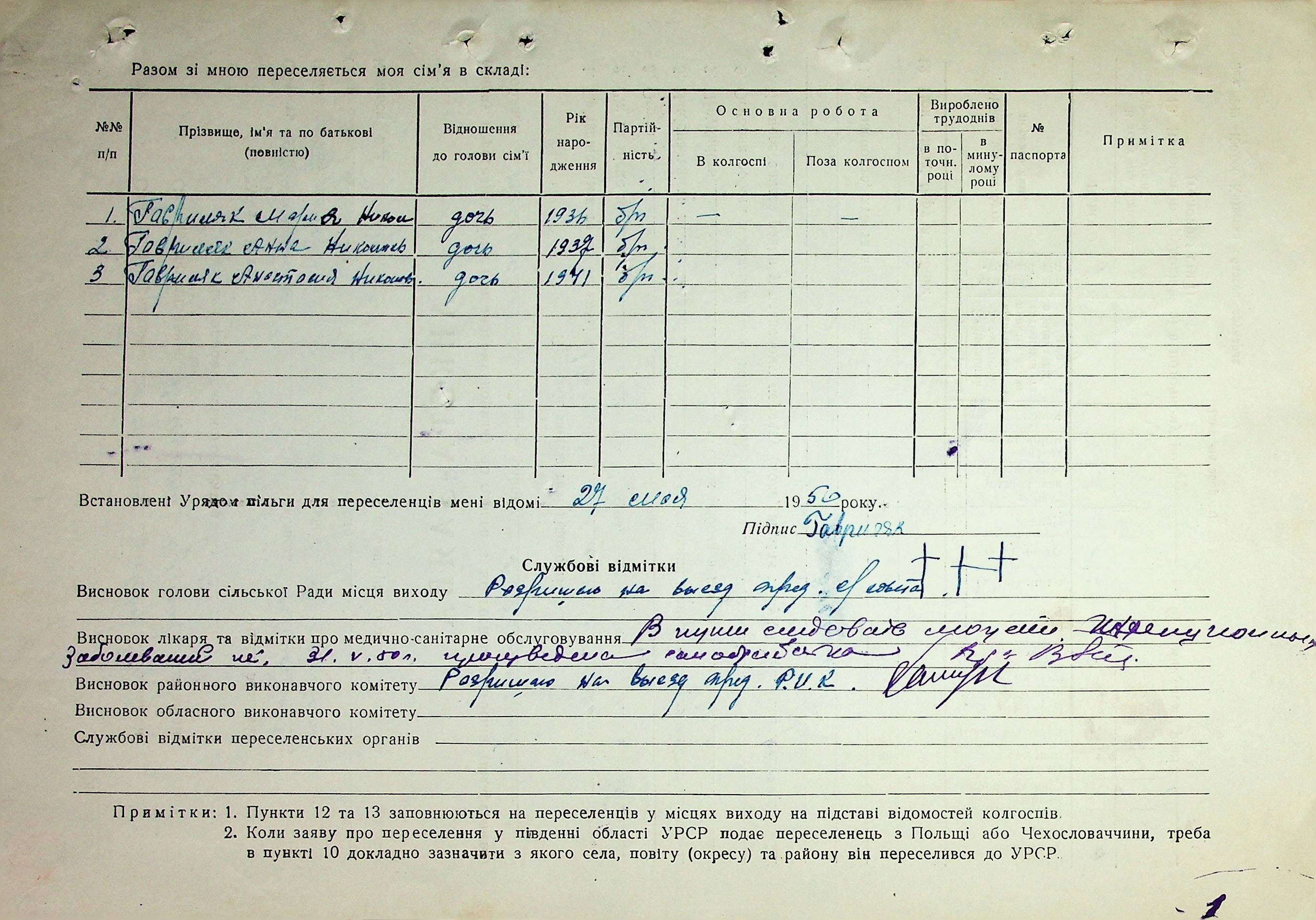 Довідки-характеристики, надані сільськими та селищними Радами депутатів трудящих на від’їжджаючих голів сімей та склад їх родин”