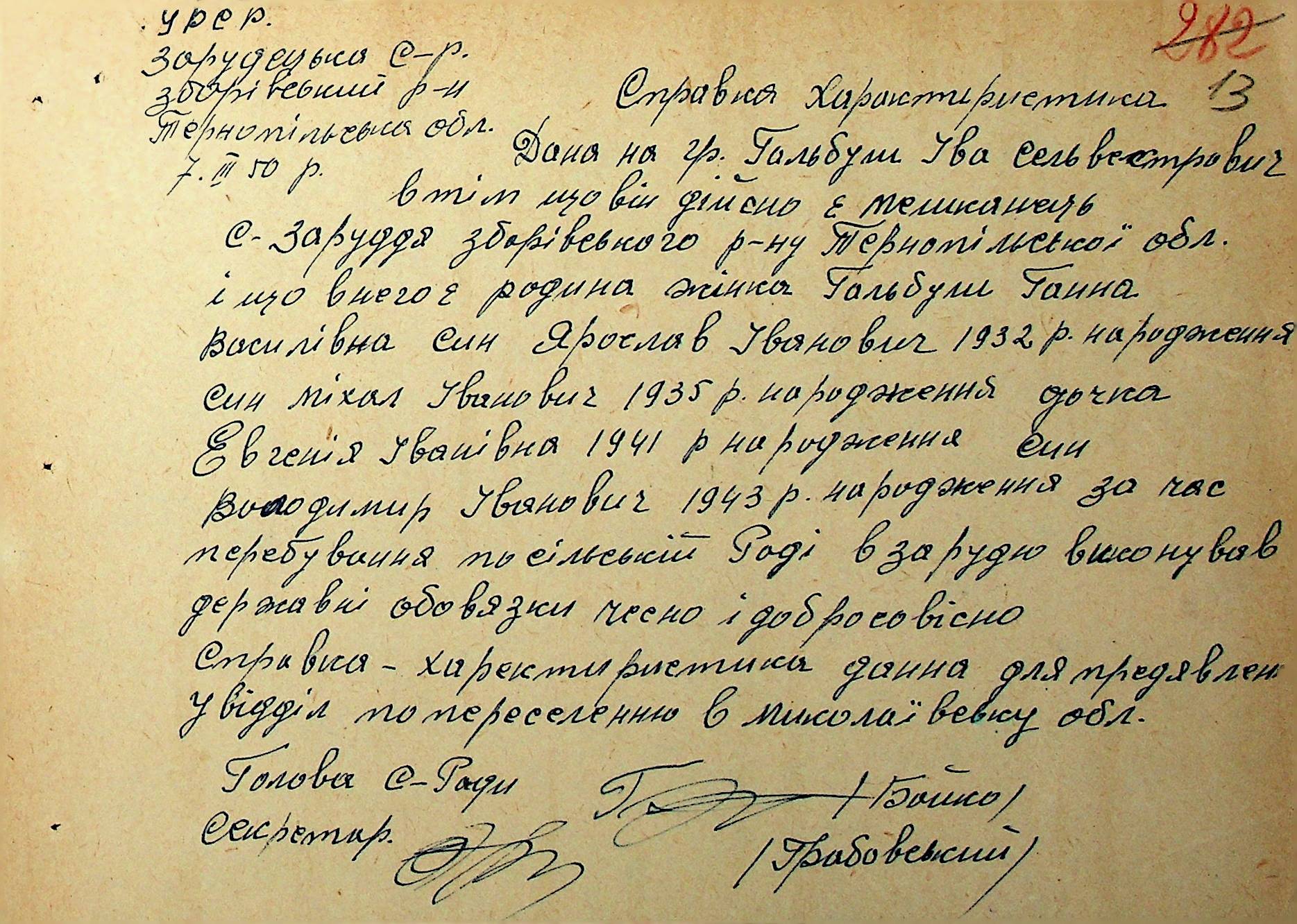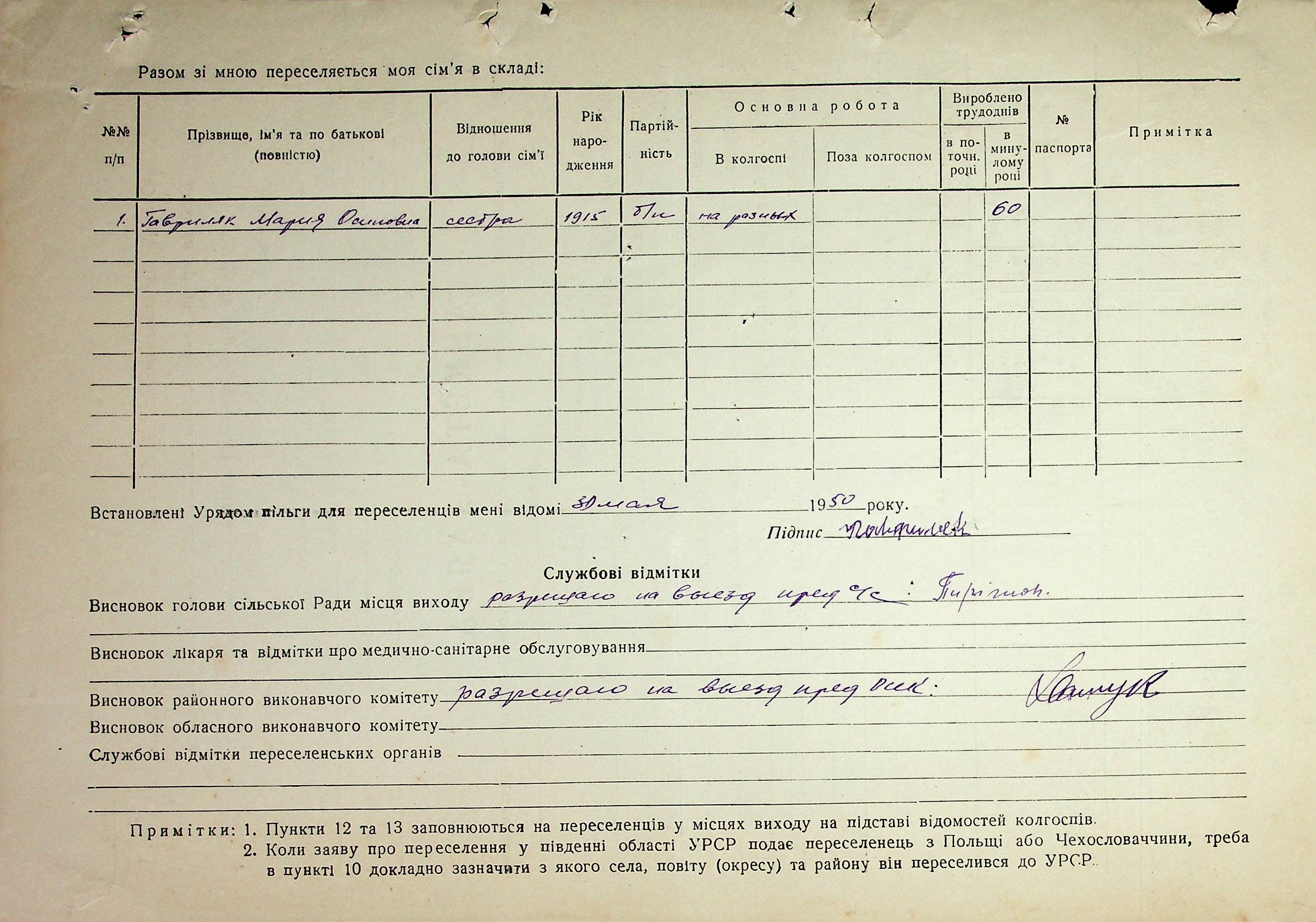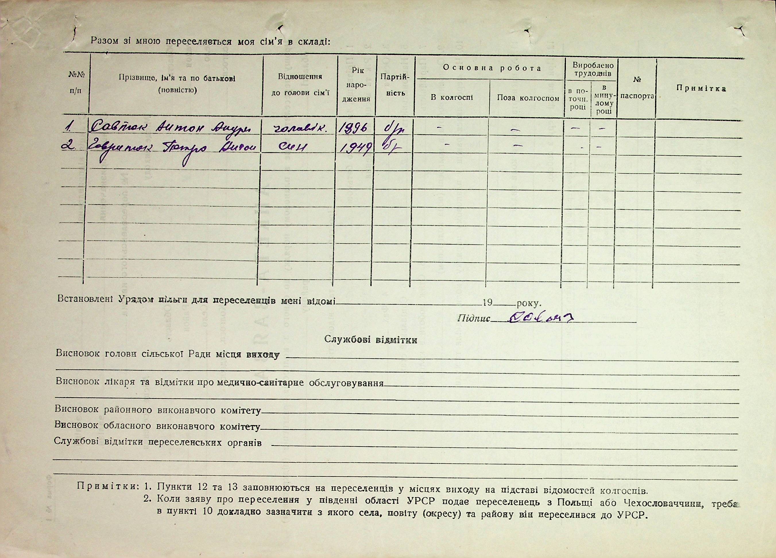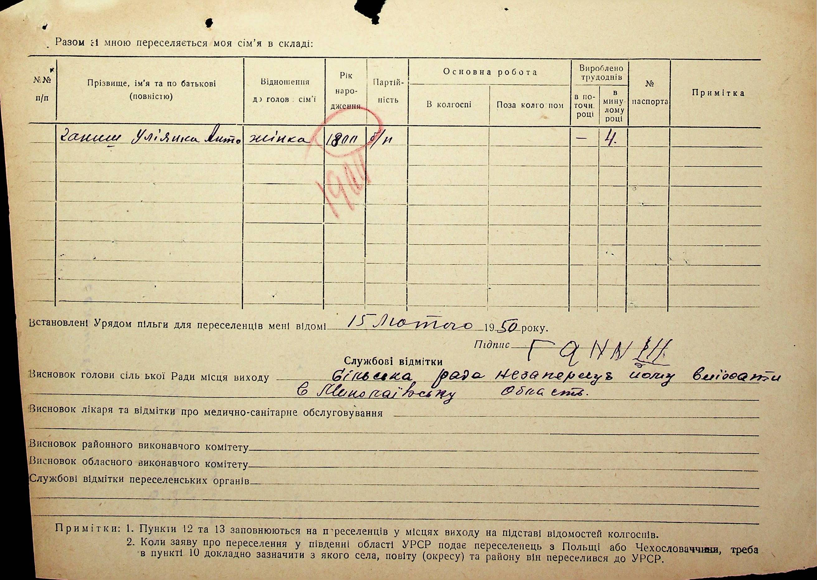 Довідки-характеристики, надані сільськими та селищними Радами депутатів трудящих на від’їжджаючих голів сімей та склад їх родин”