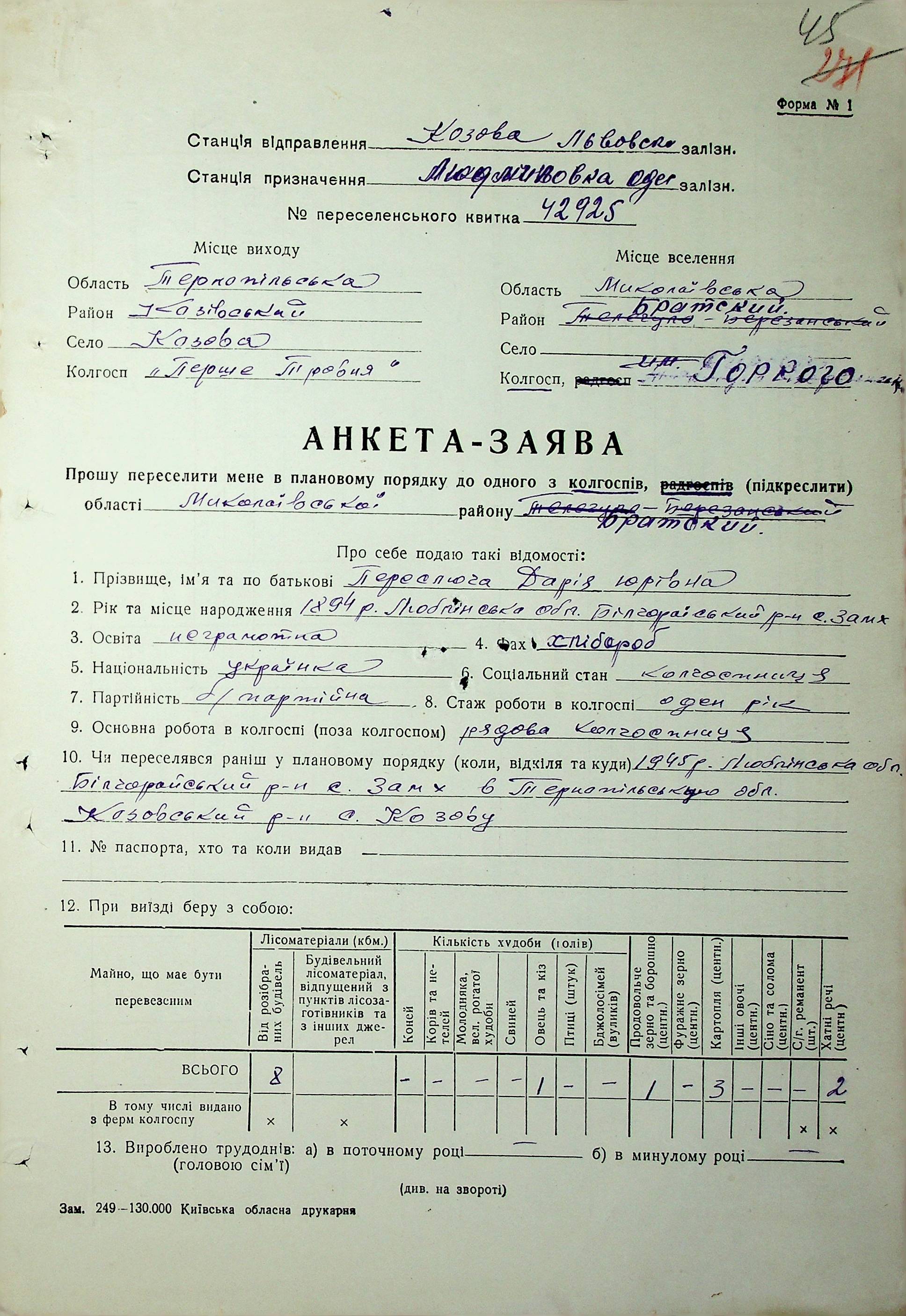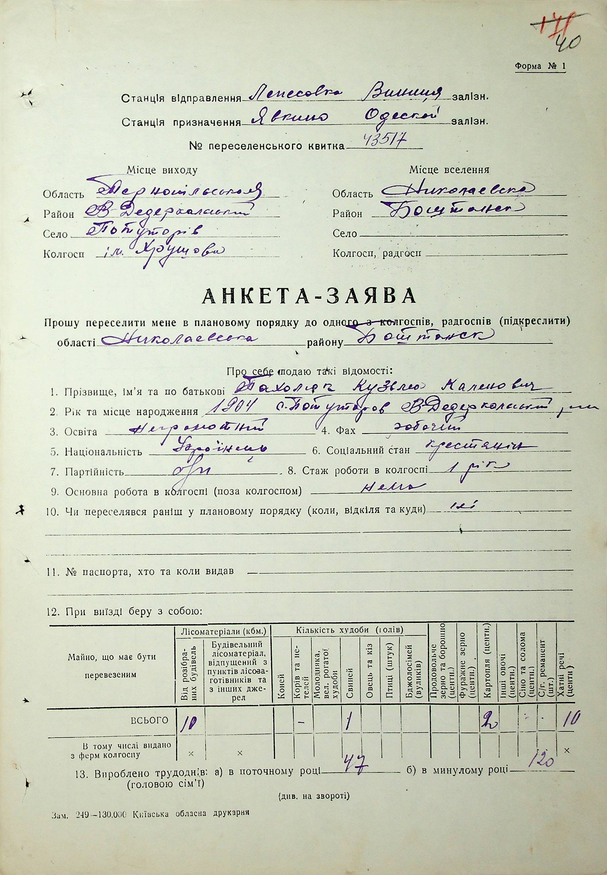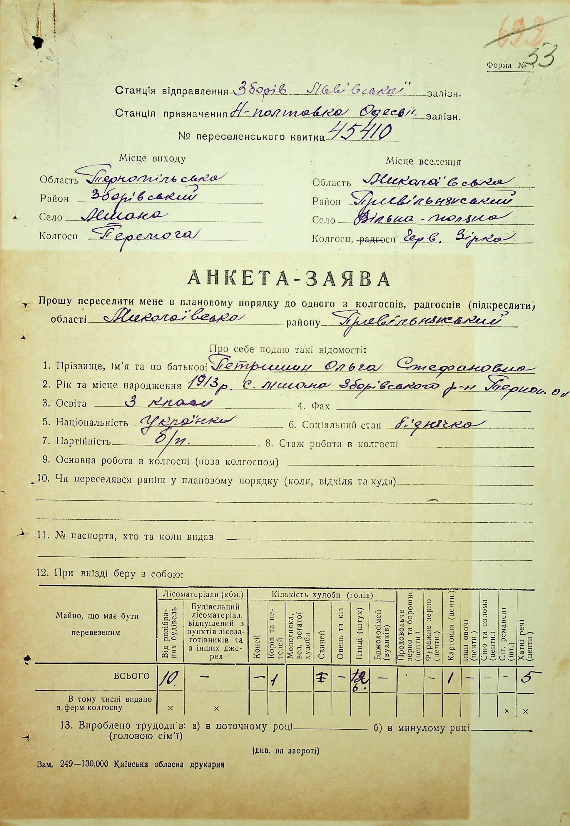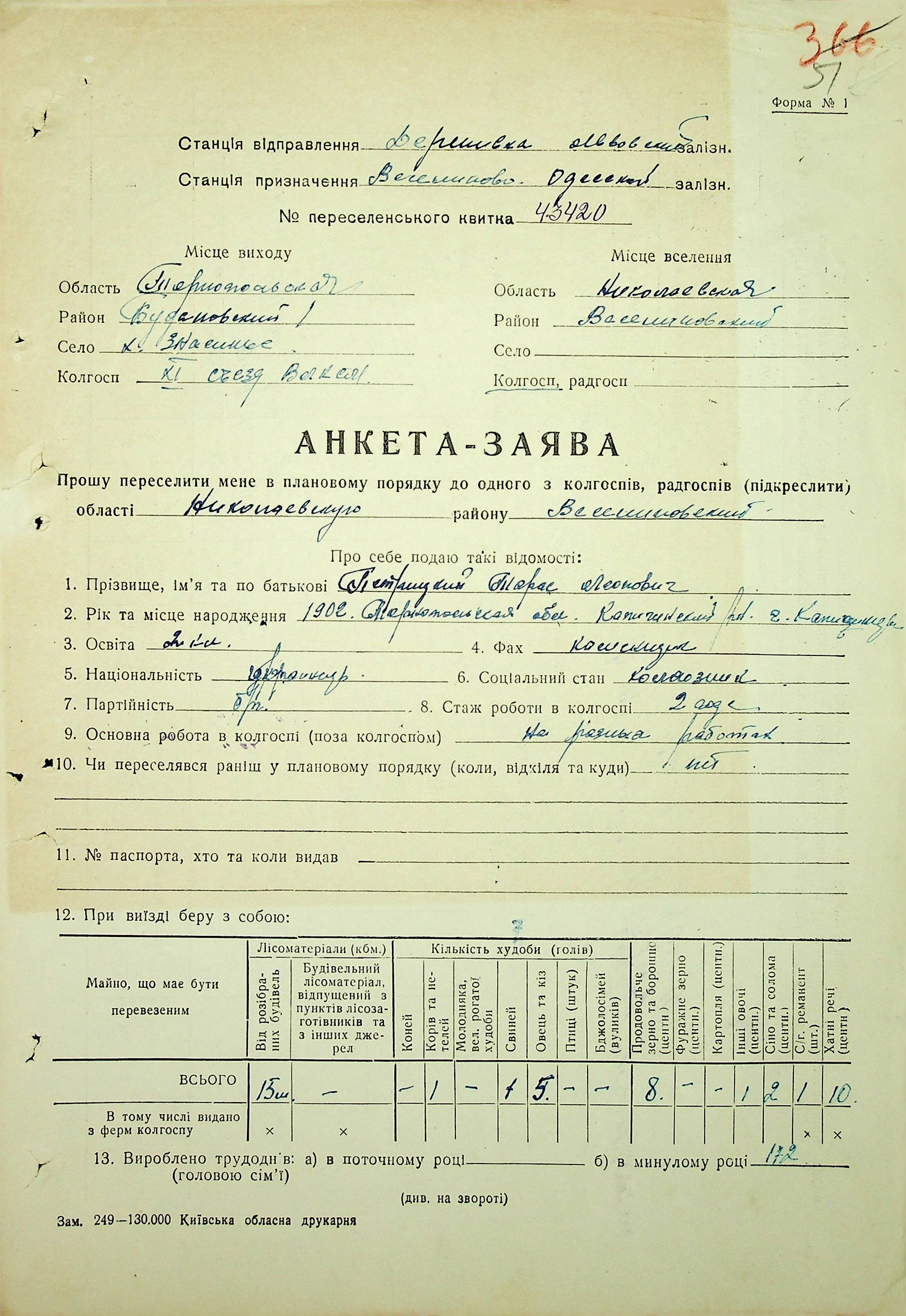 • • • • Справа № 66 “Анкети-заяви про планове переселення сімей з Тернопільської до Миколаївської області, прізвища з літери «П» по літеру «С».