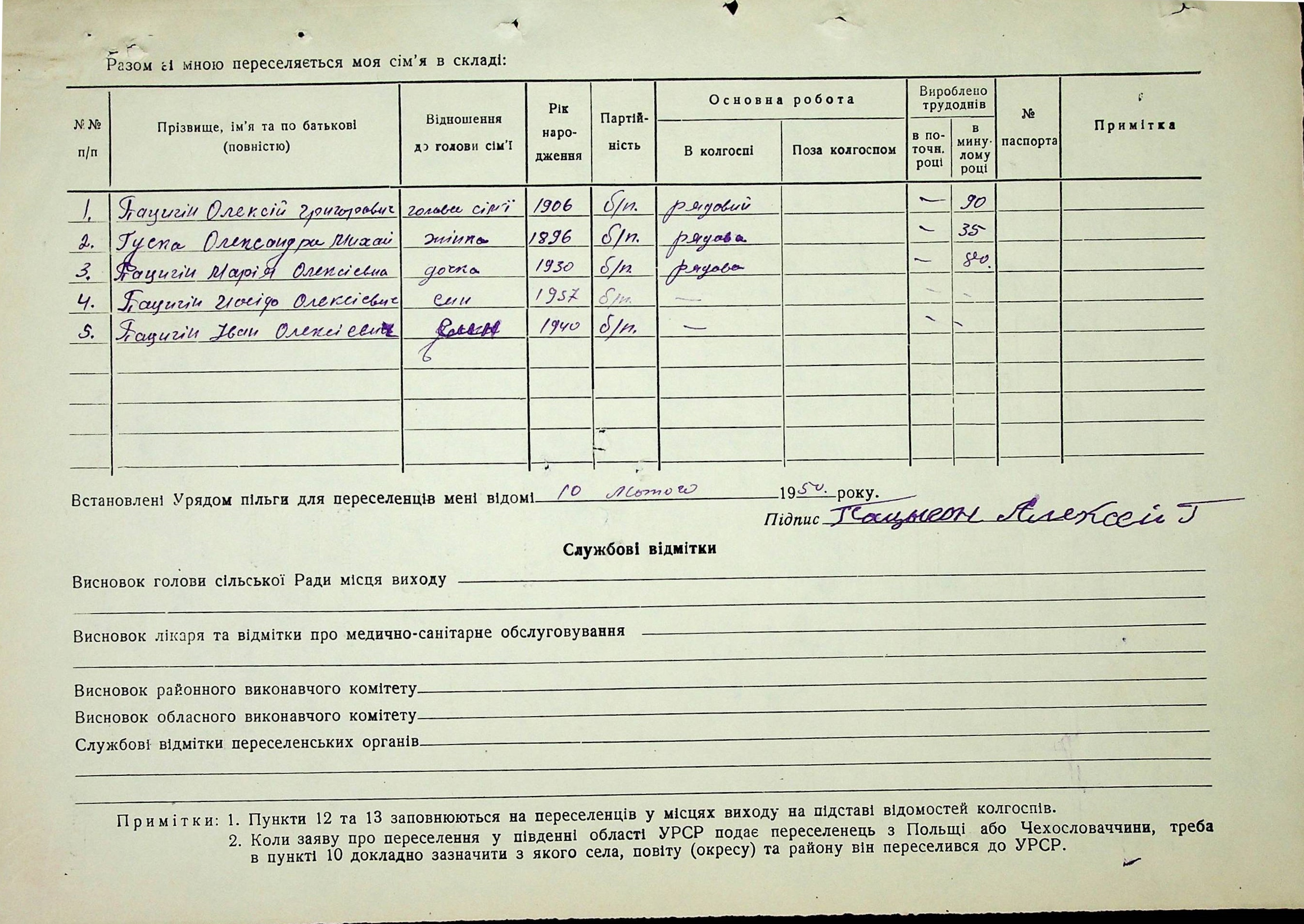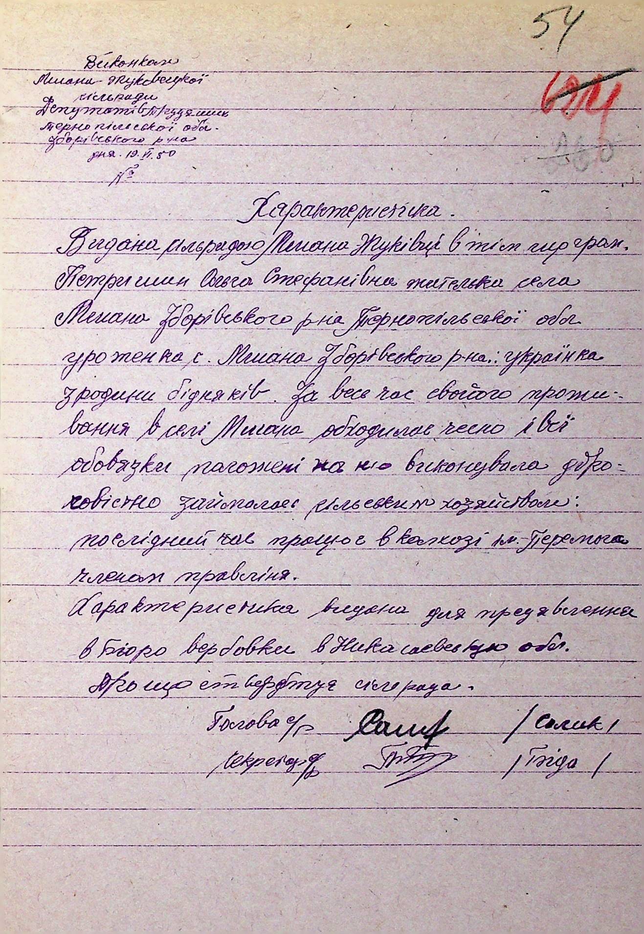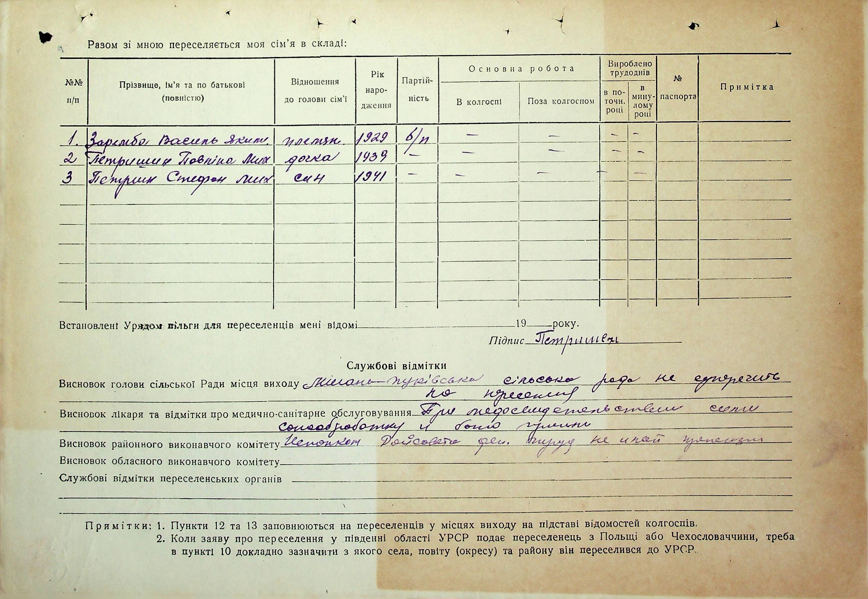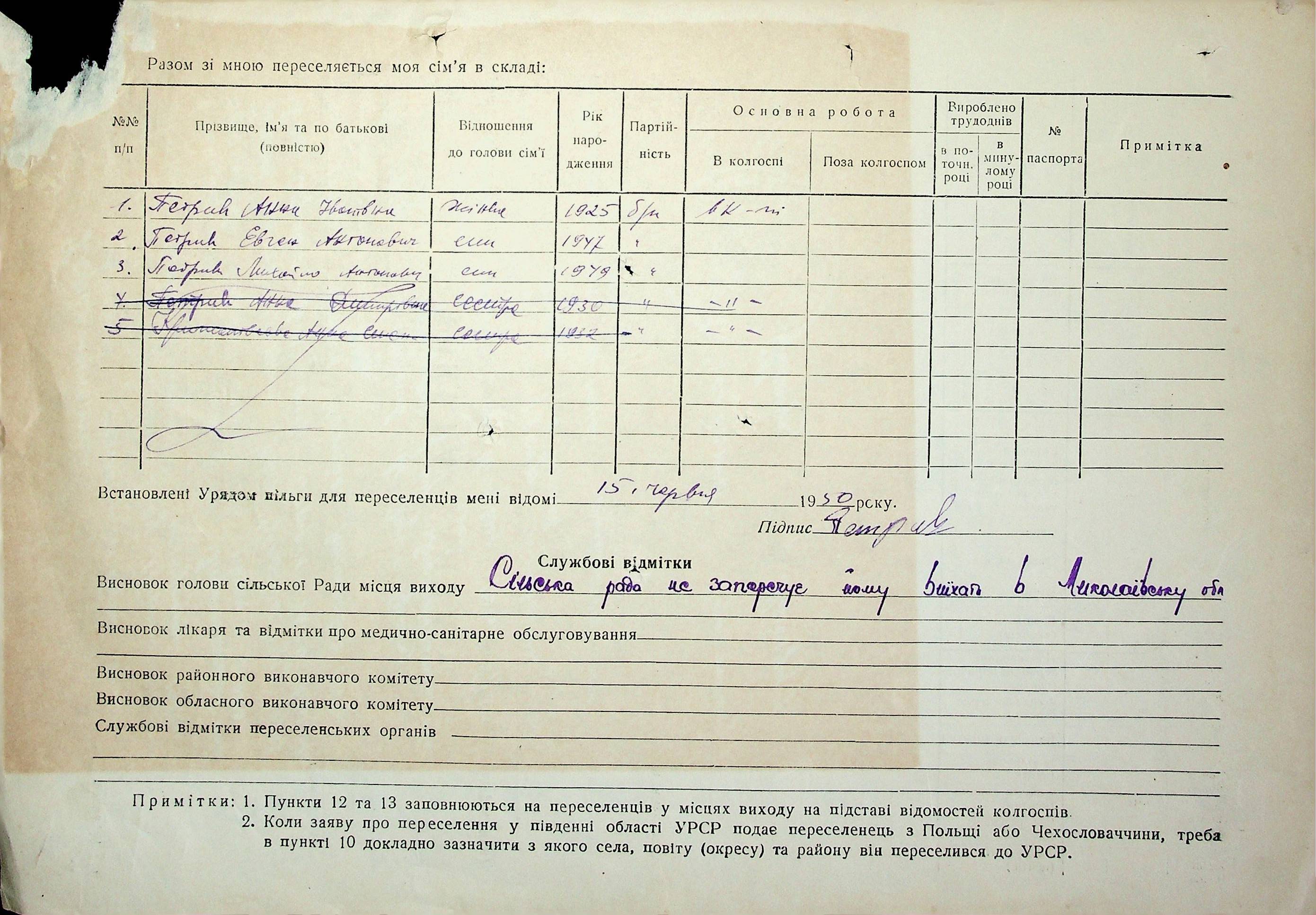 Довідки-характеристики, надані сільськими та селищними Радами депутатів трудящих на від’їжджаючих голів сімей та склад їх родин”