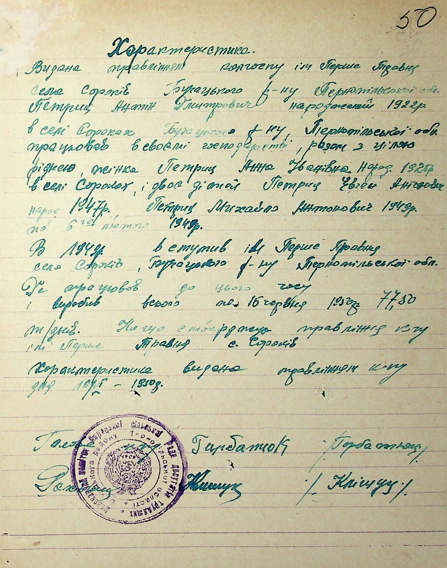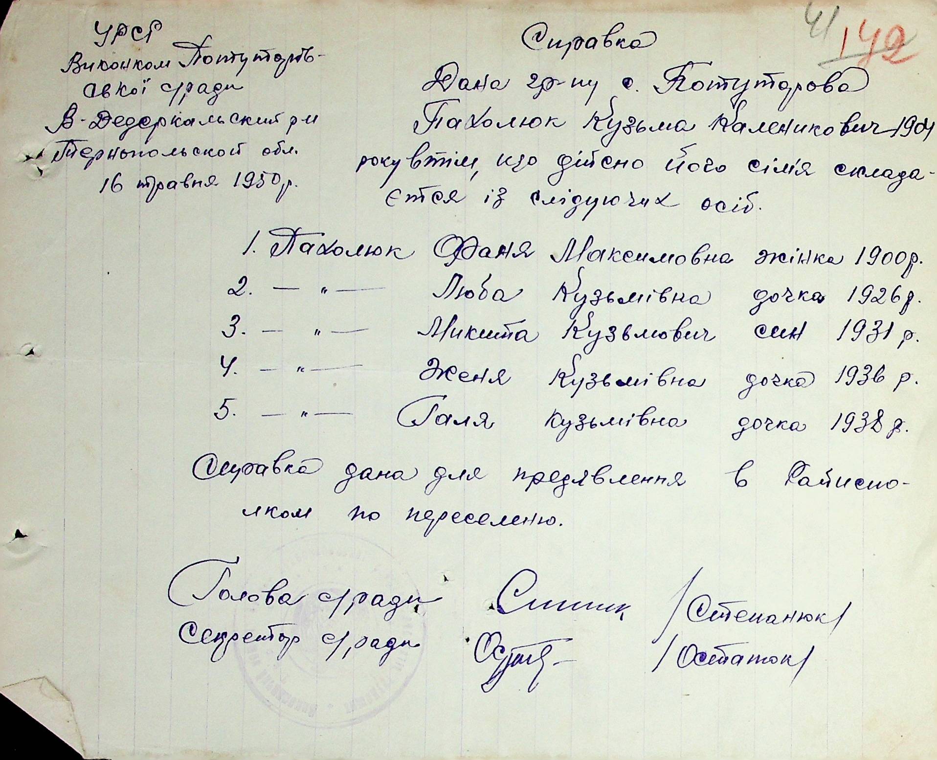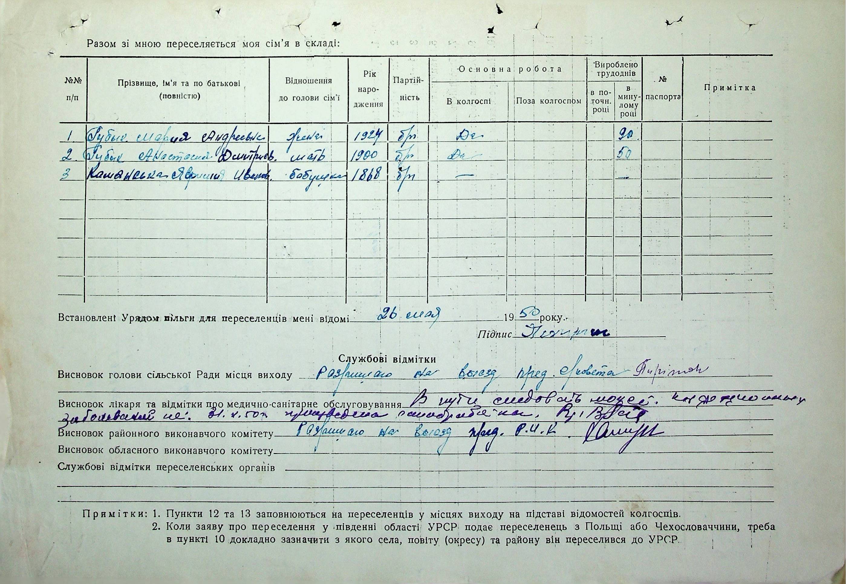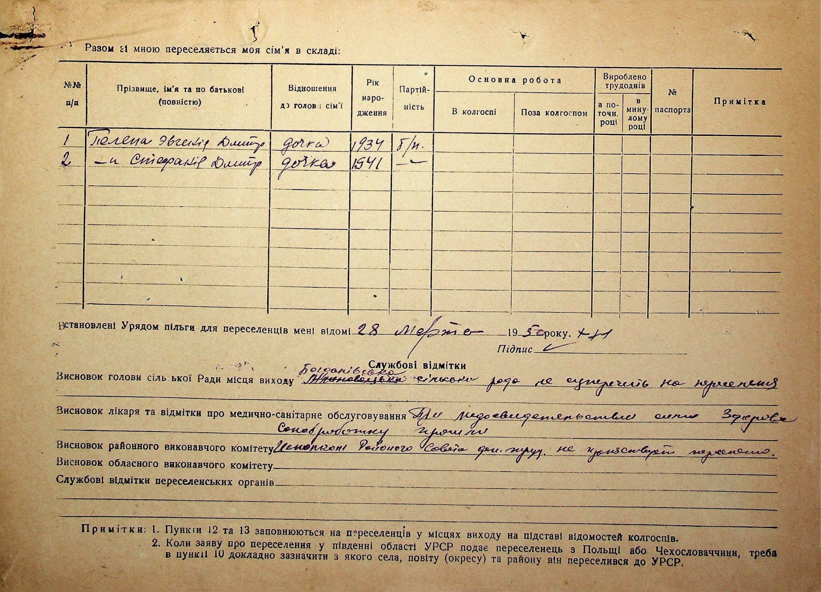 Довідки-характеристики, надані сільськими та селищними Радами депутатів трудящих на від’їжджаючих голів сімей та склад їх родин”