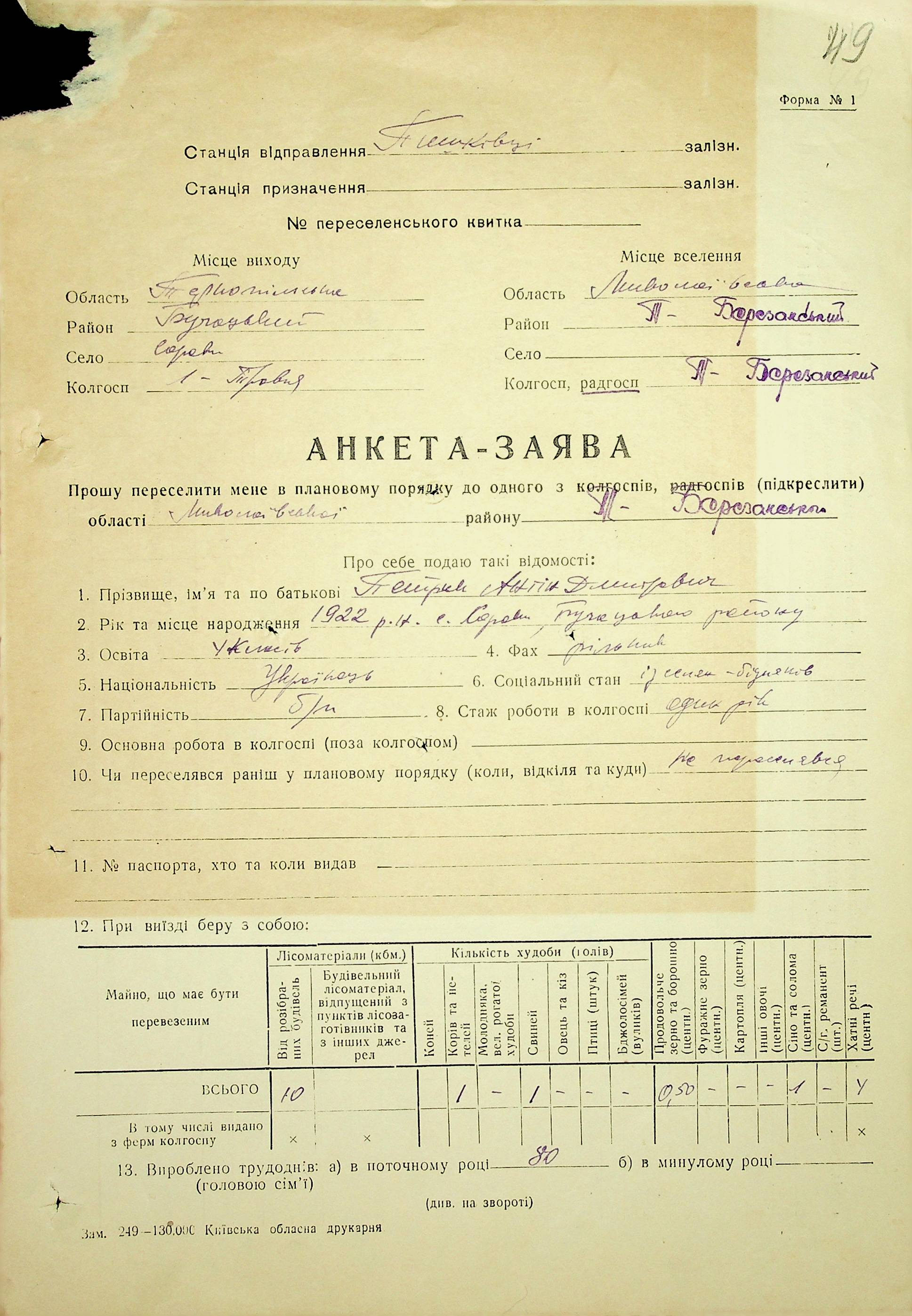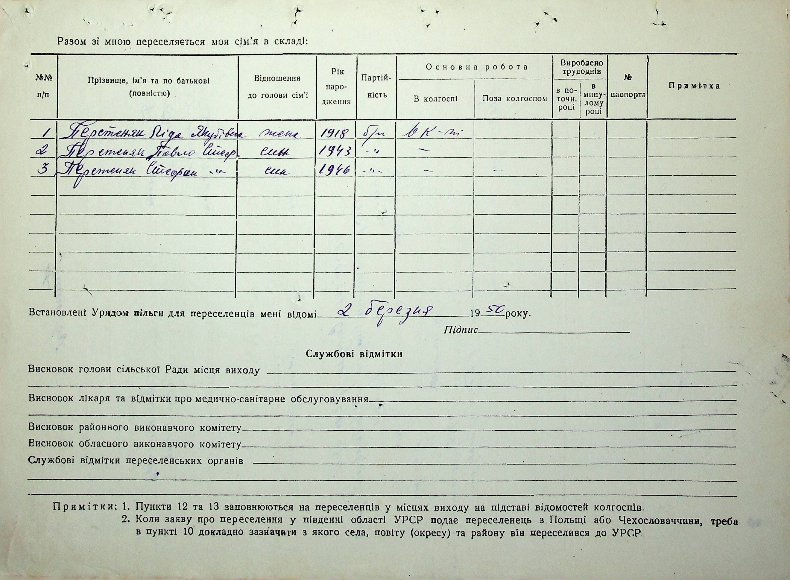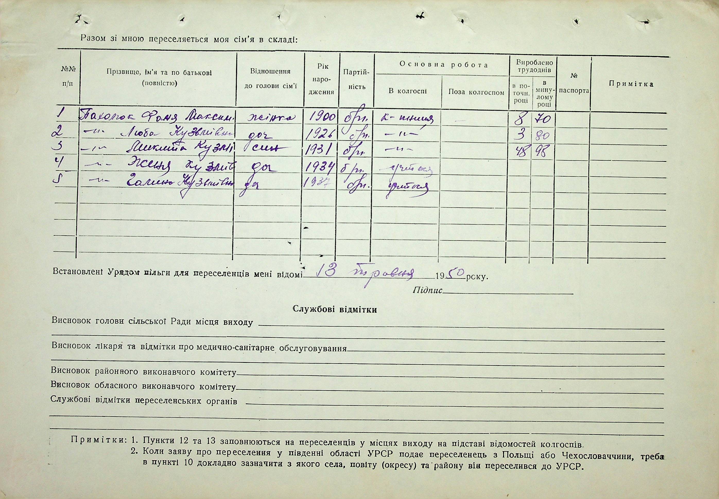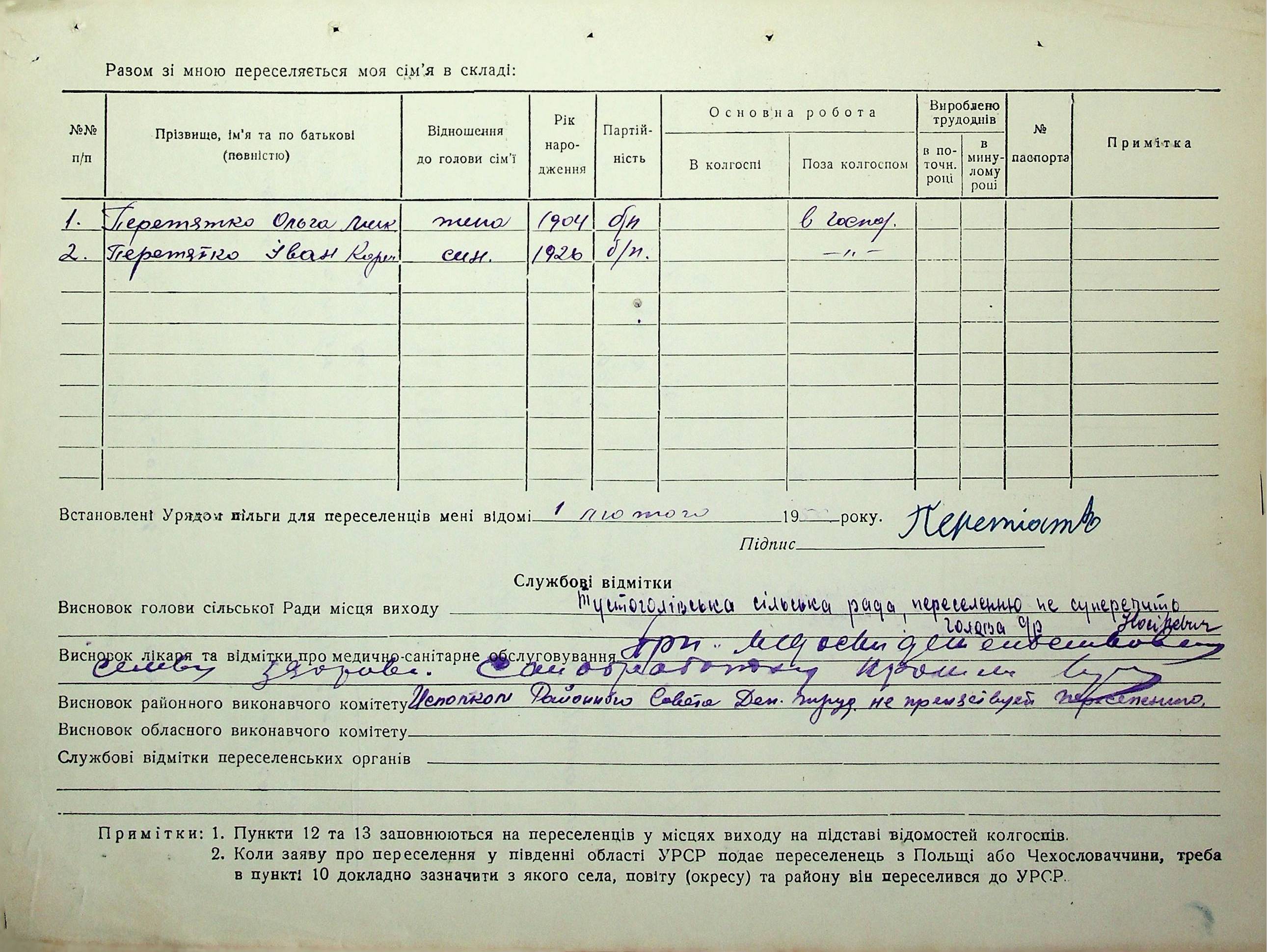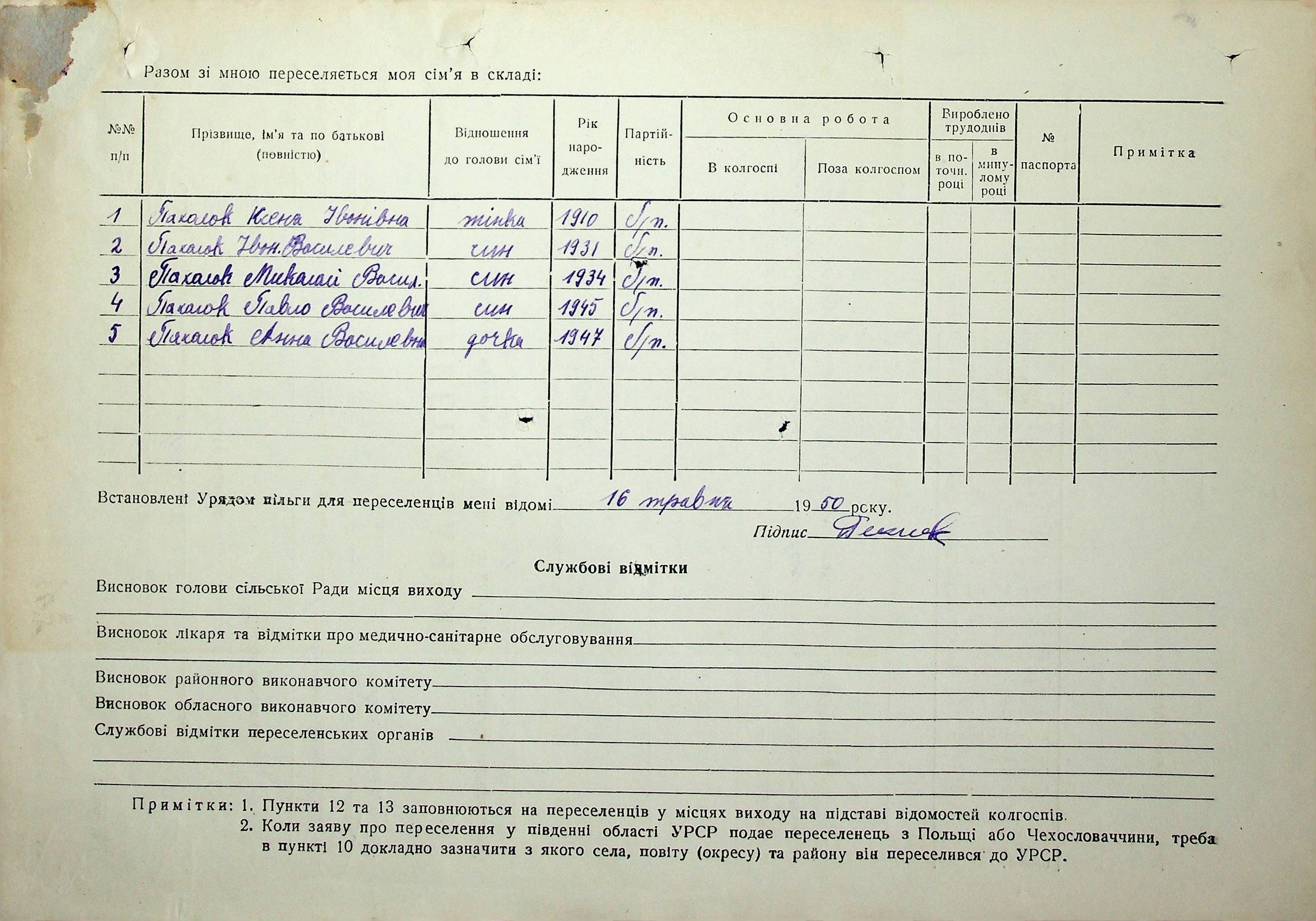 Довідки-характеристики, надані сільськими та селищними Радами депутатів трудящих на від’їжджаючих голів сімей та склад їх родин”