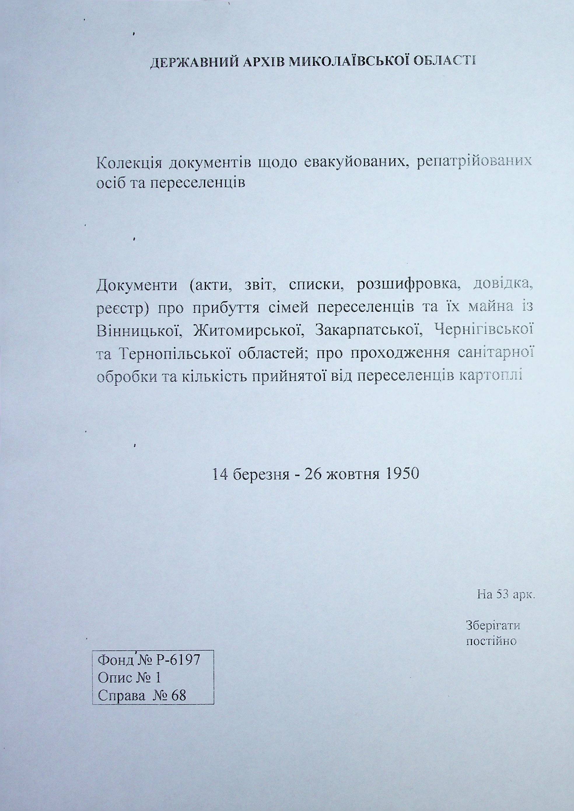 ◦ ◦ Фонд № Р-6197 “Колекція документів щодо евакуйованих, репатрійованих осіб та переселенців”