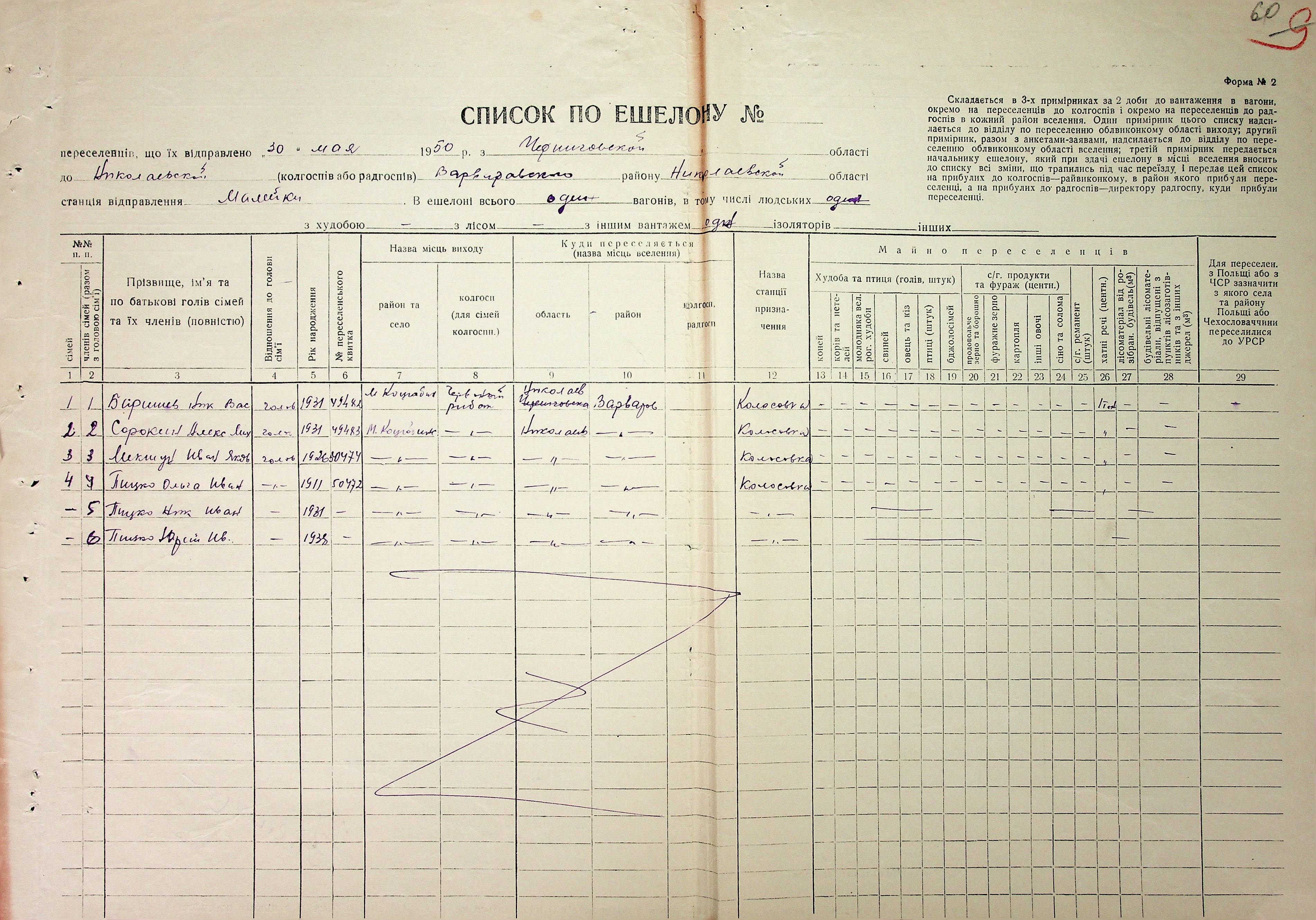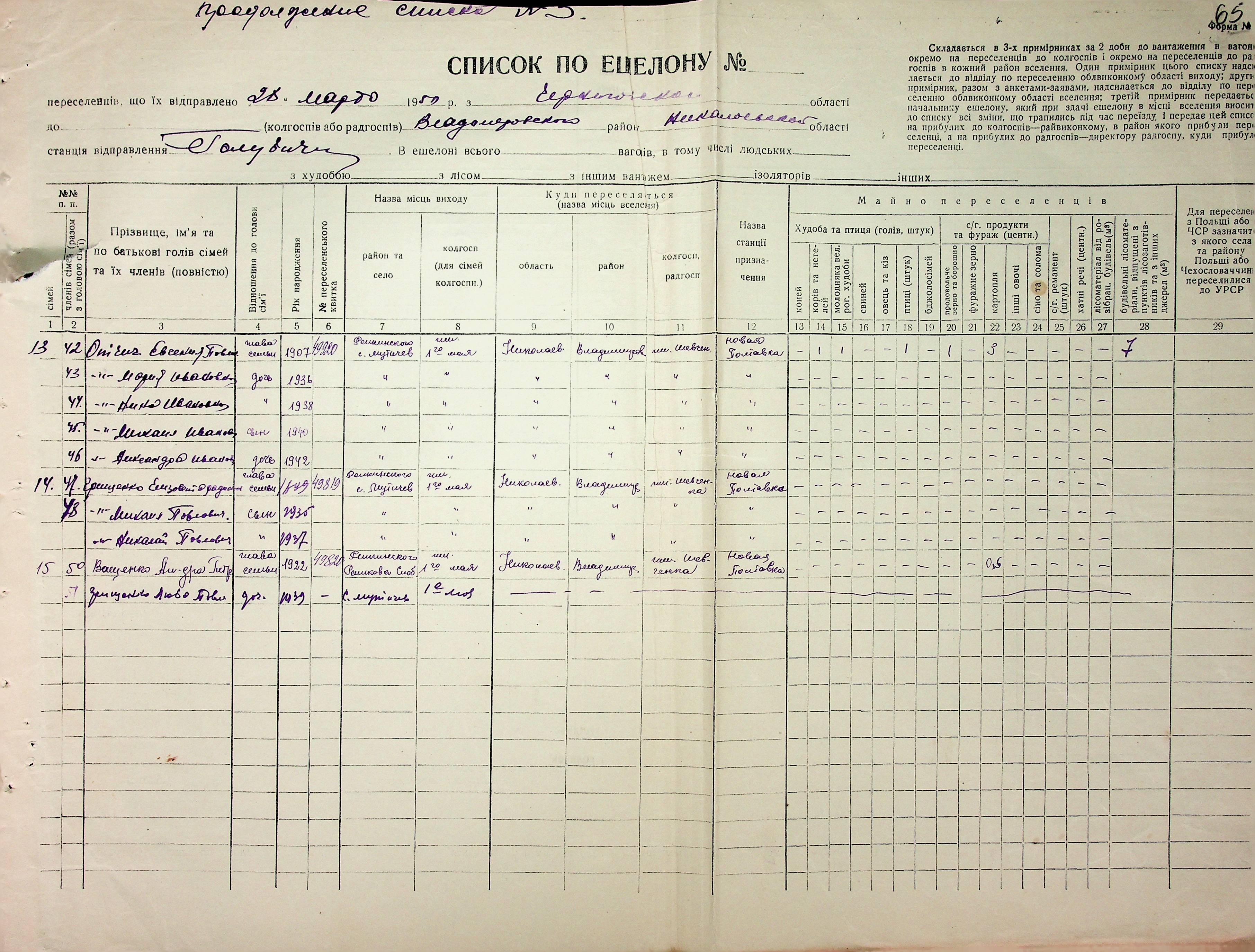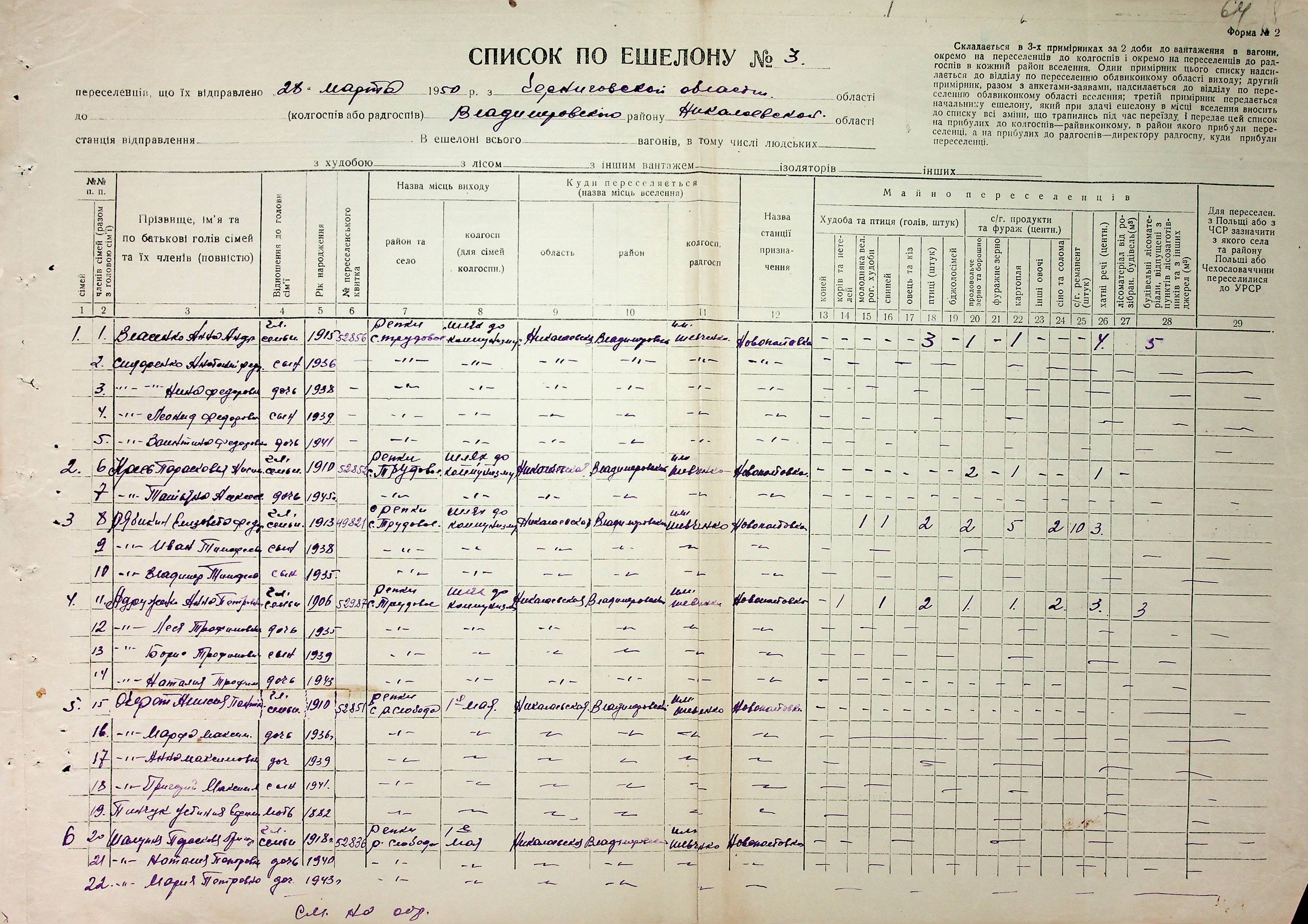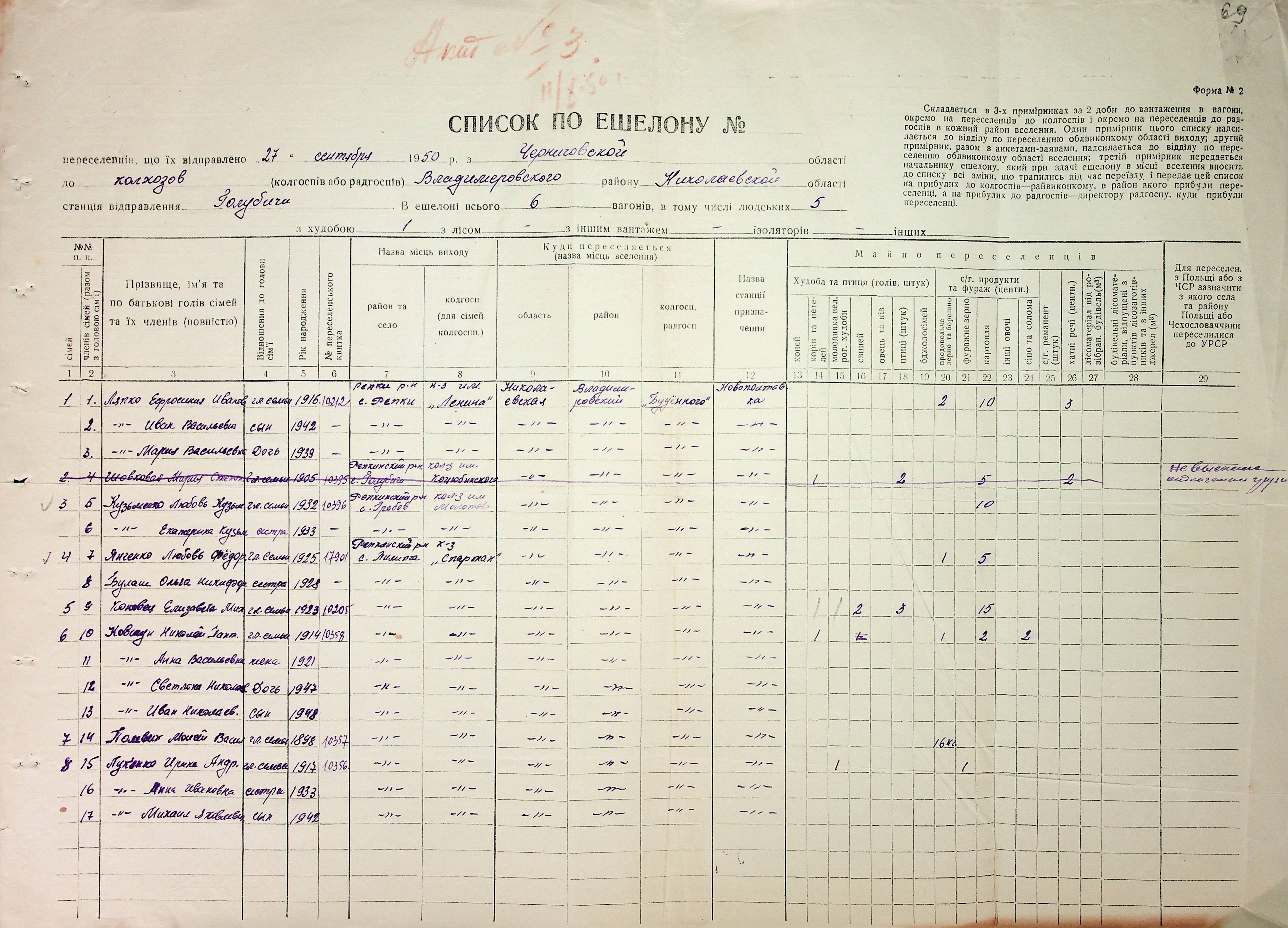 • • • • Справа № 69 “Ешелонні списки на осіб, відправлених із Вінницької, Закарпатської та Чернігівської областей до Миколаївської області”