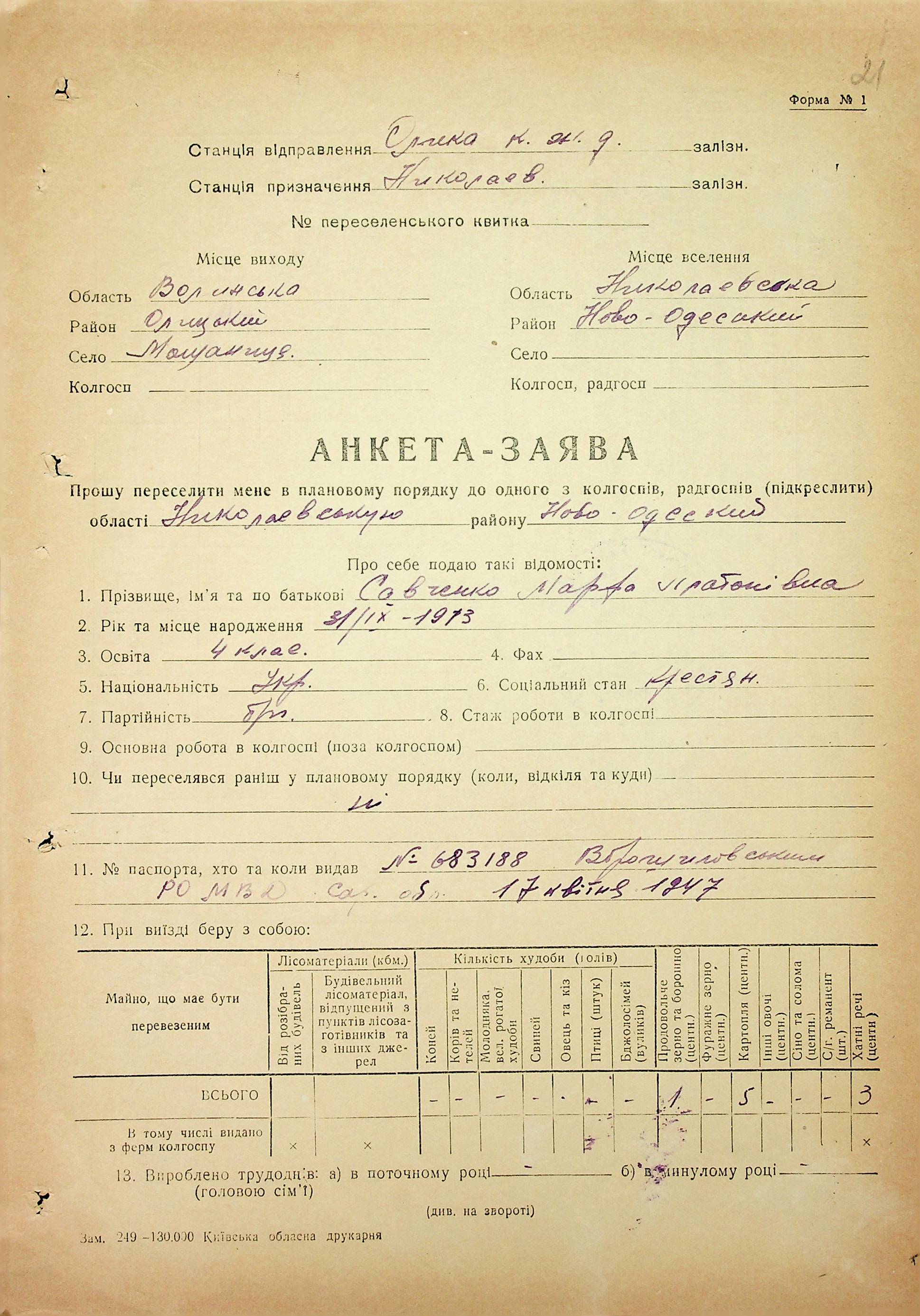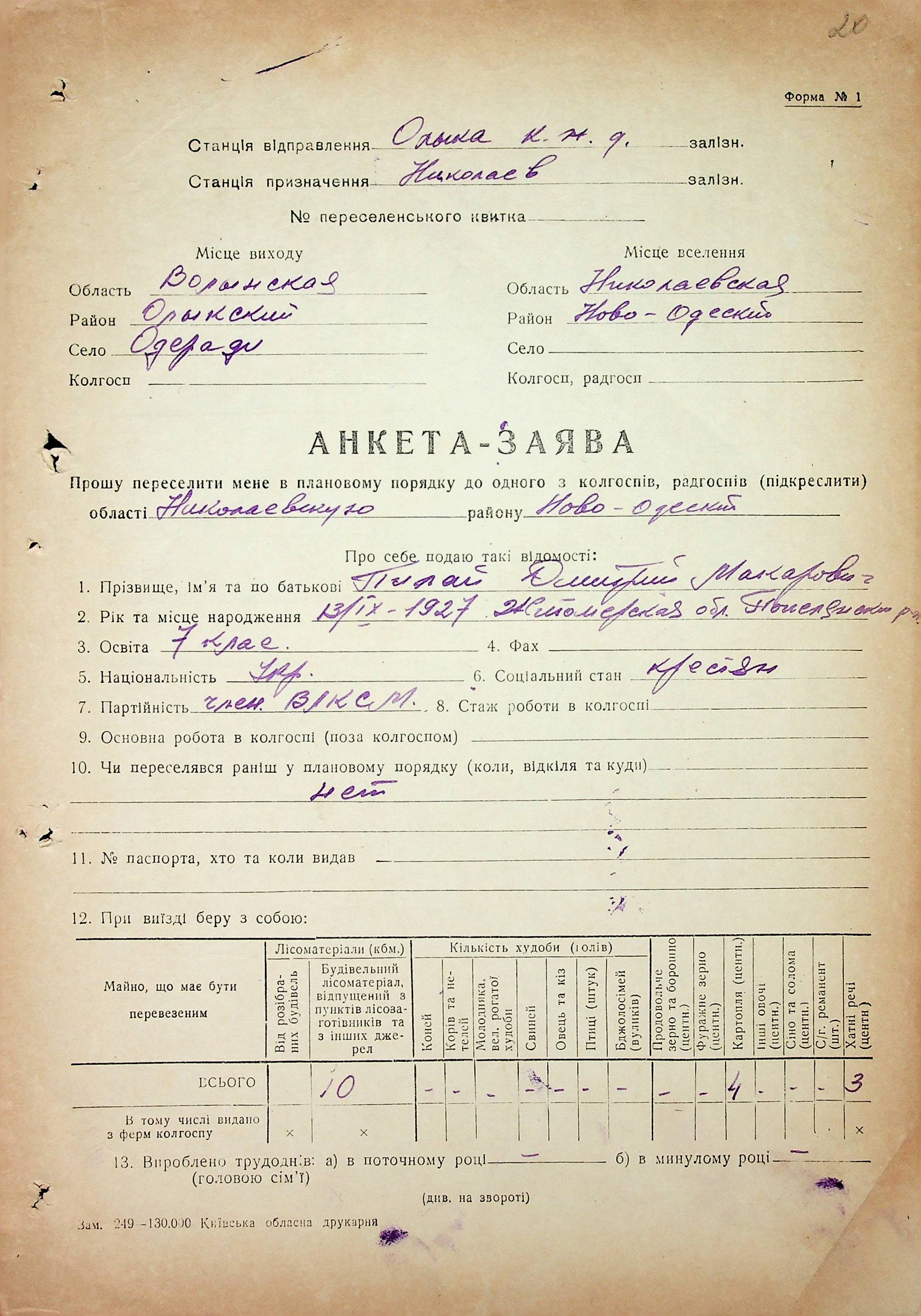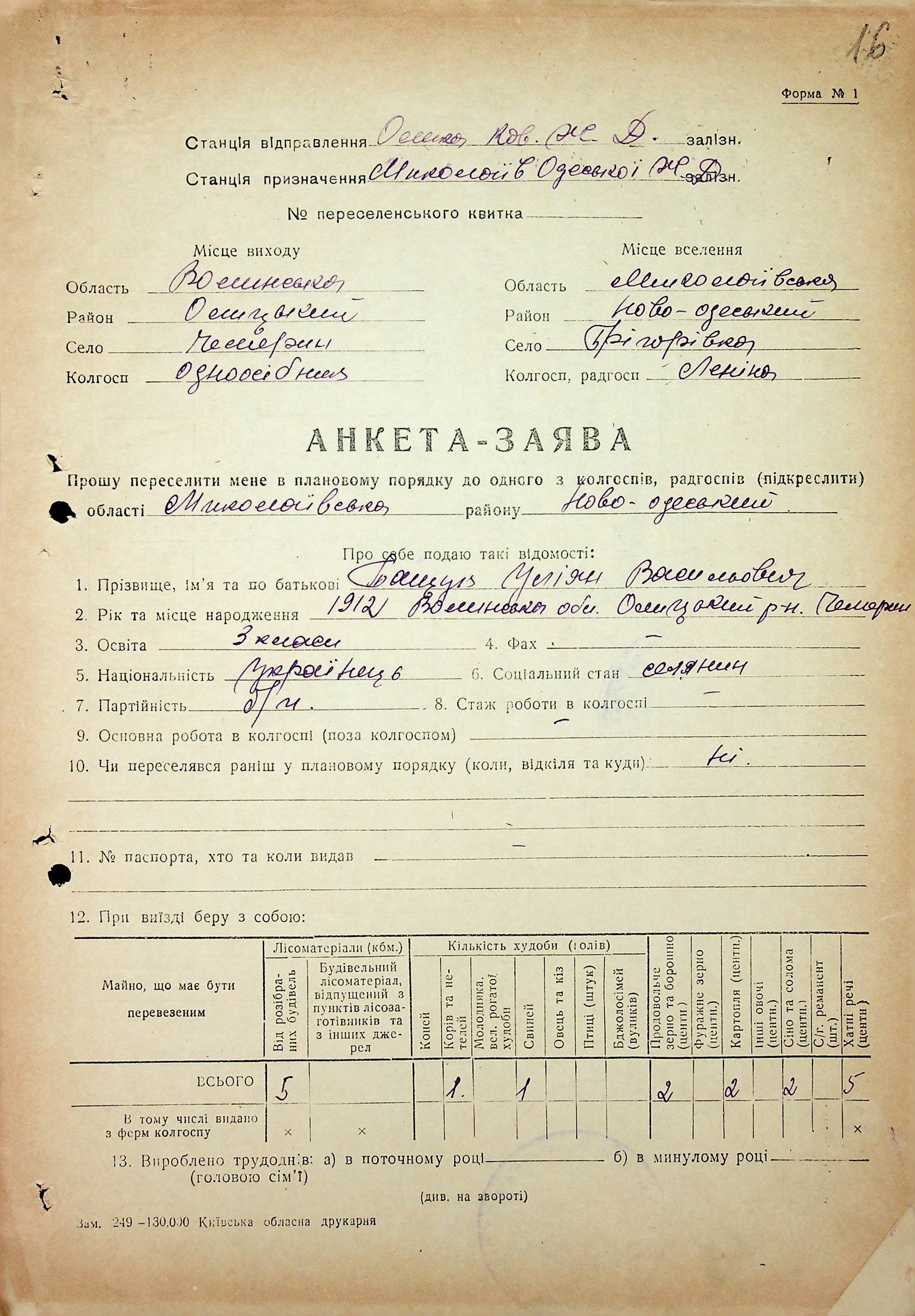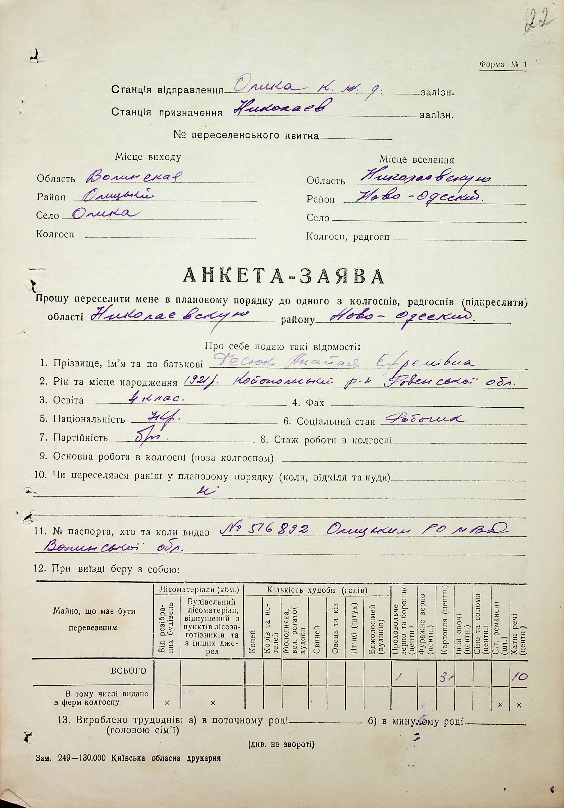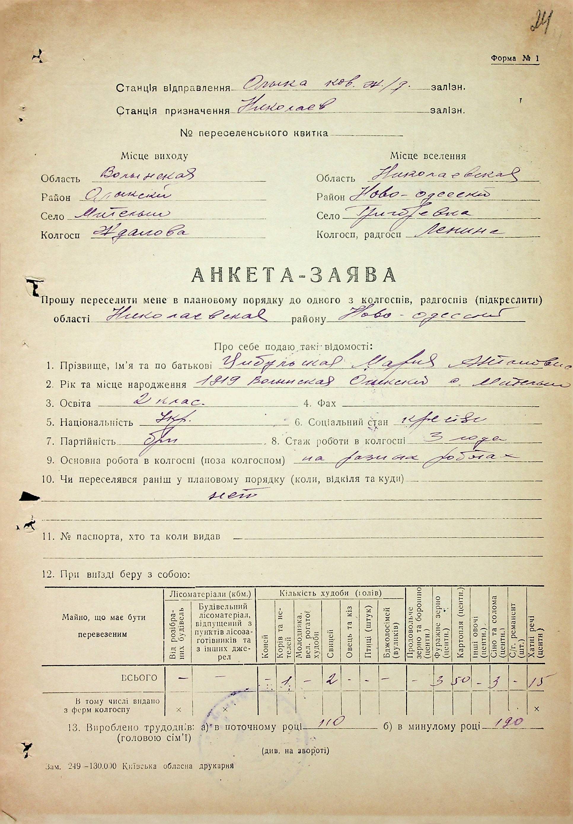 • • • • Справа № 73 “Анкети-заяви про планове переселення сімей з Волинської до Миколаївської області”