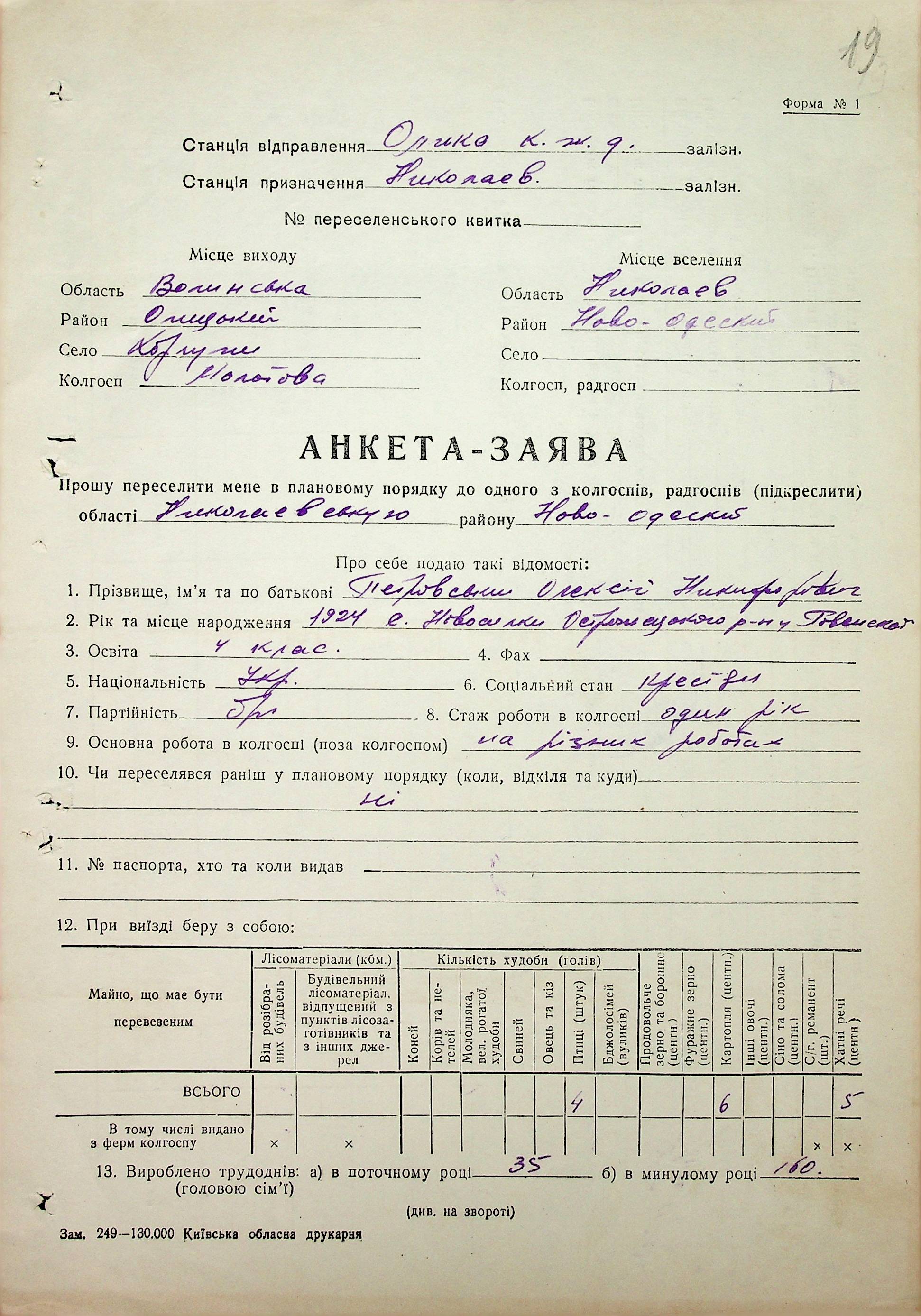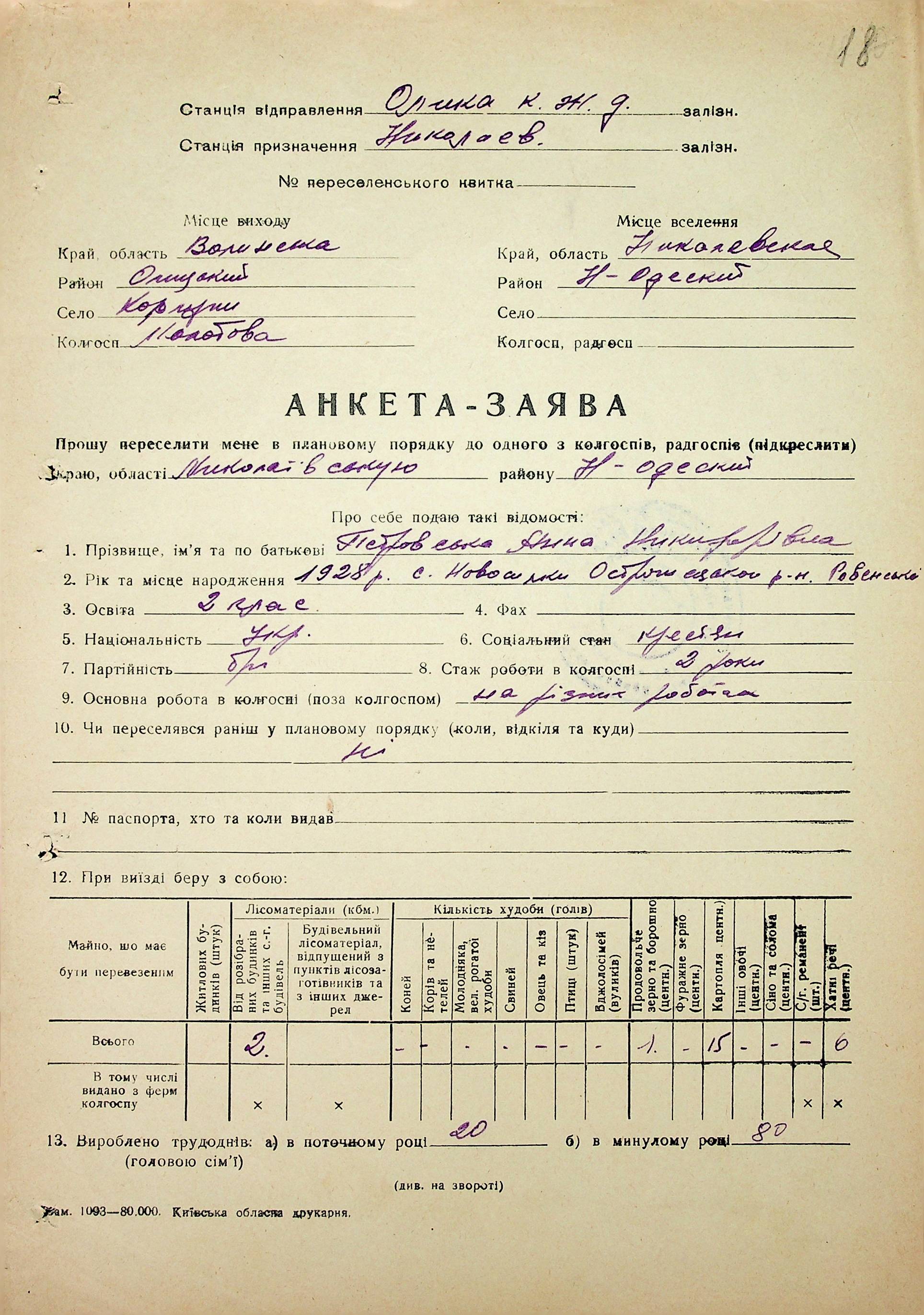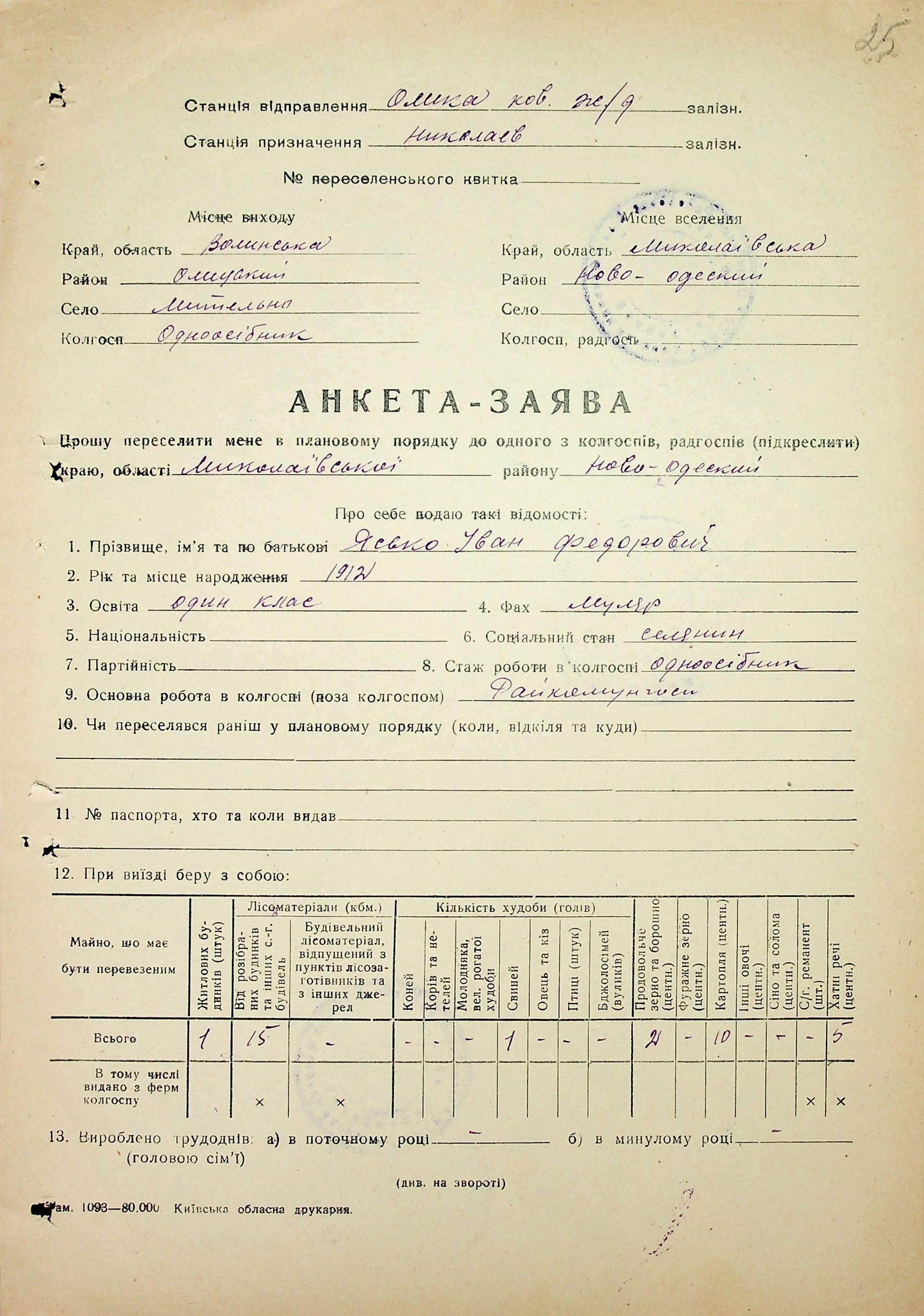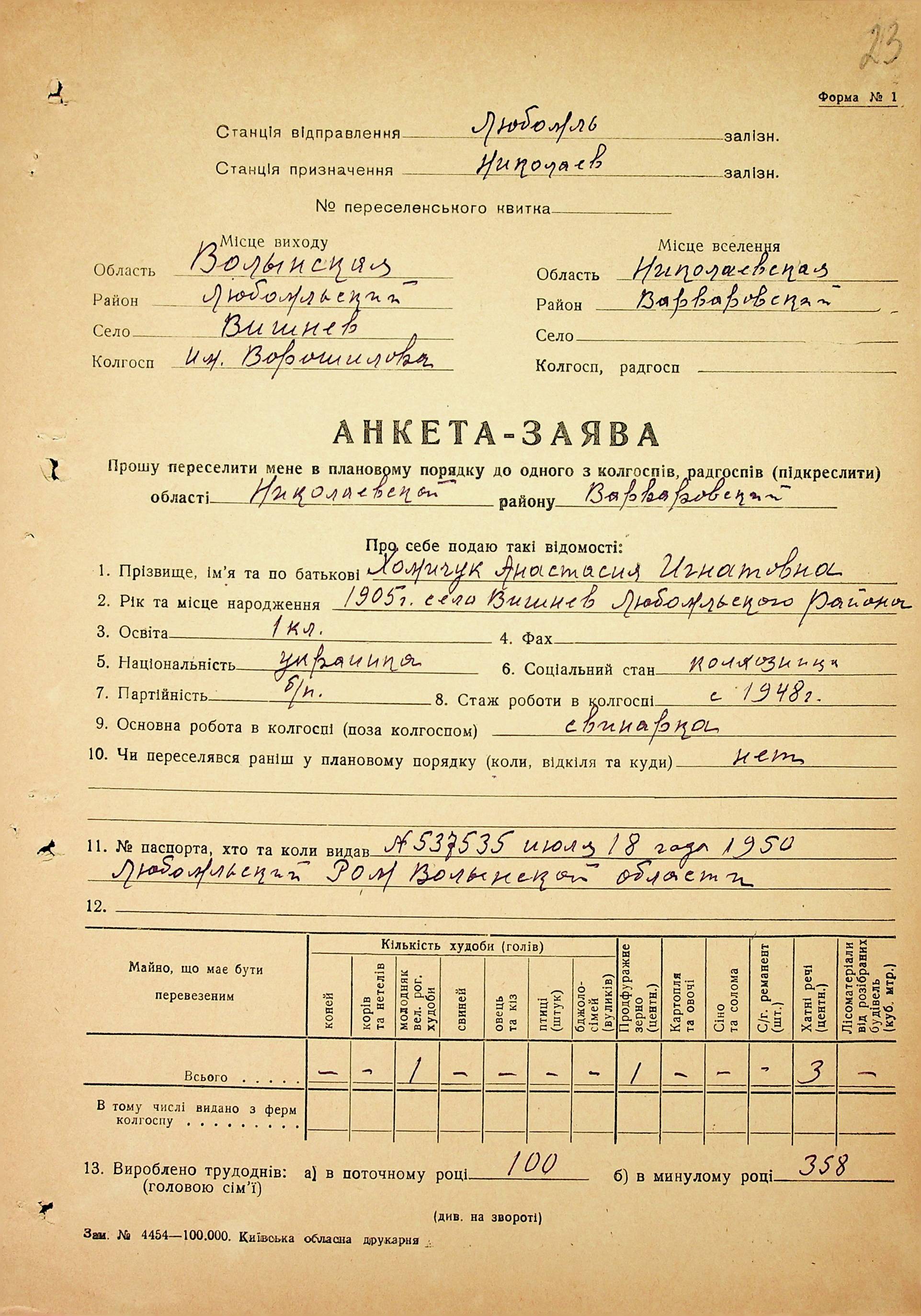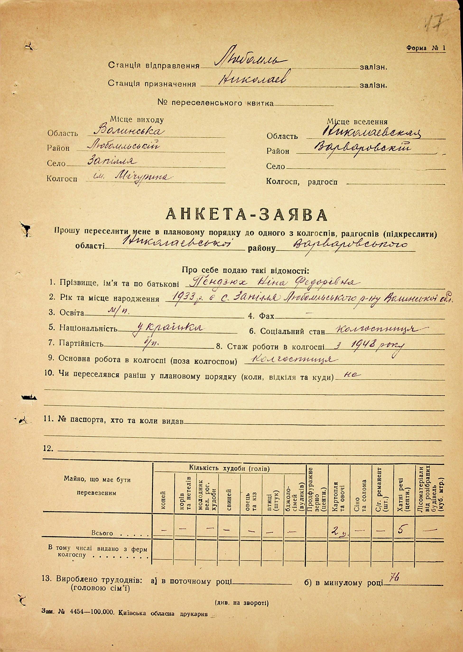 • • • • Справа № 73 “Анкети-заяви про планове переселення сімей з Волинської до Миколаївської області”