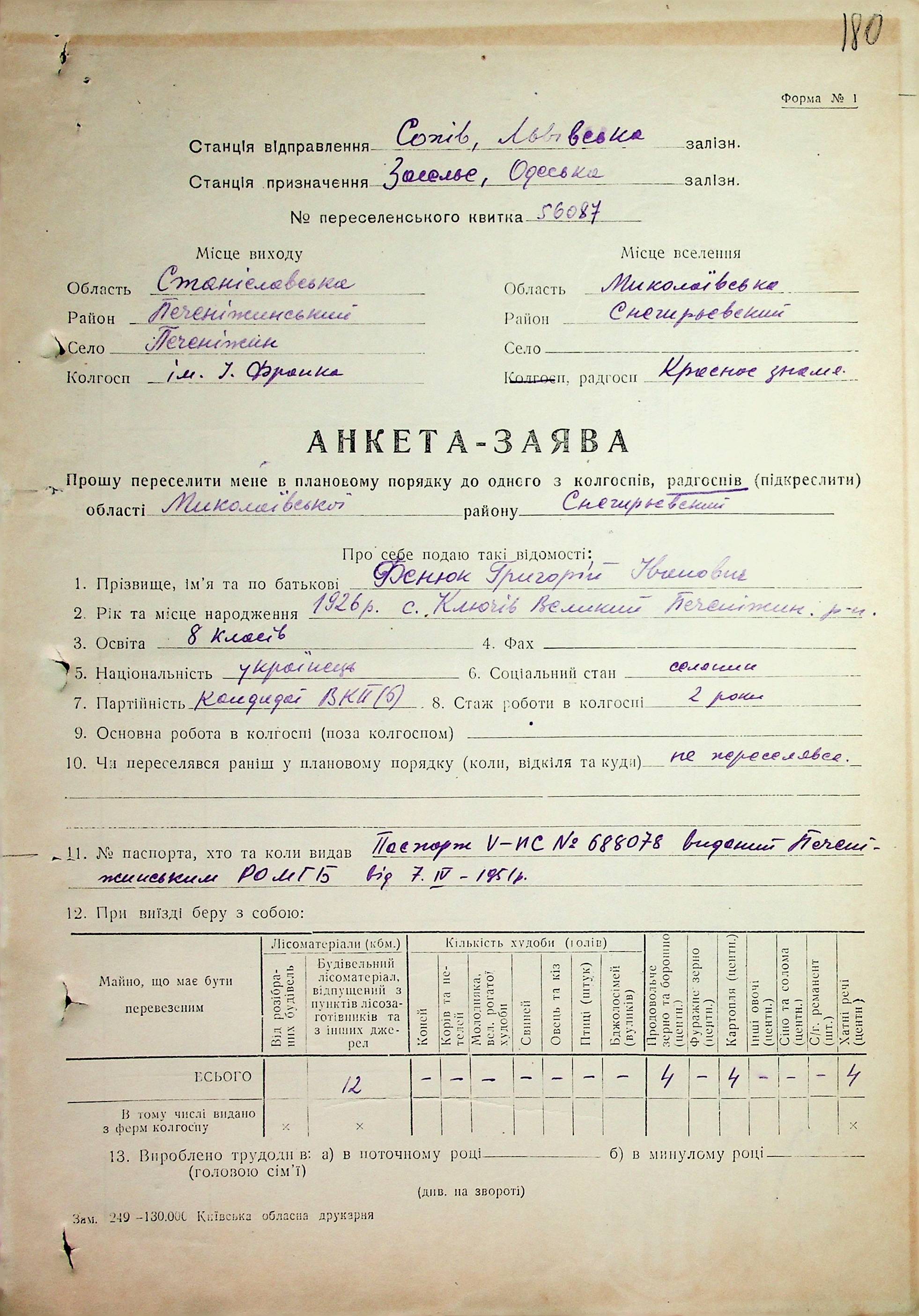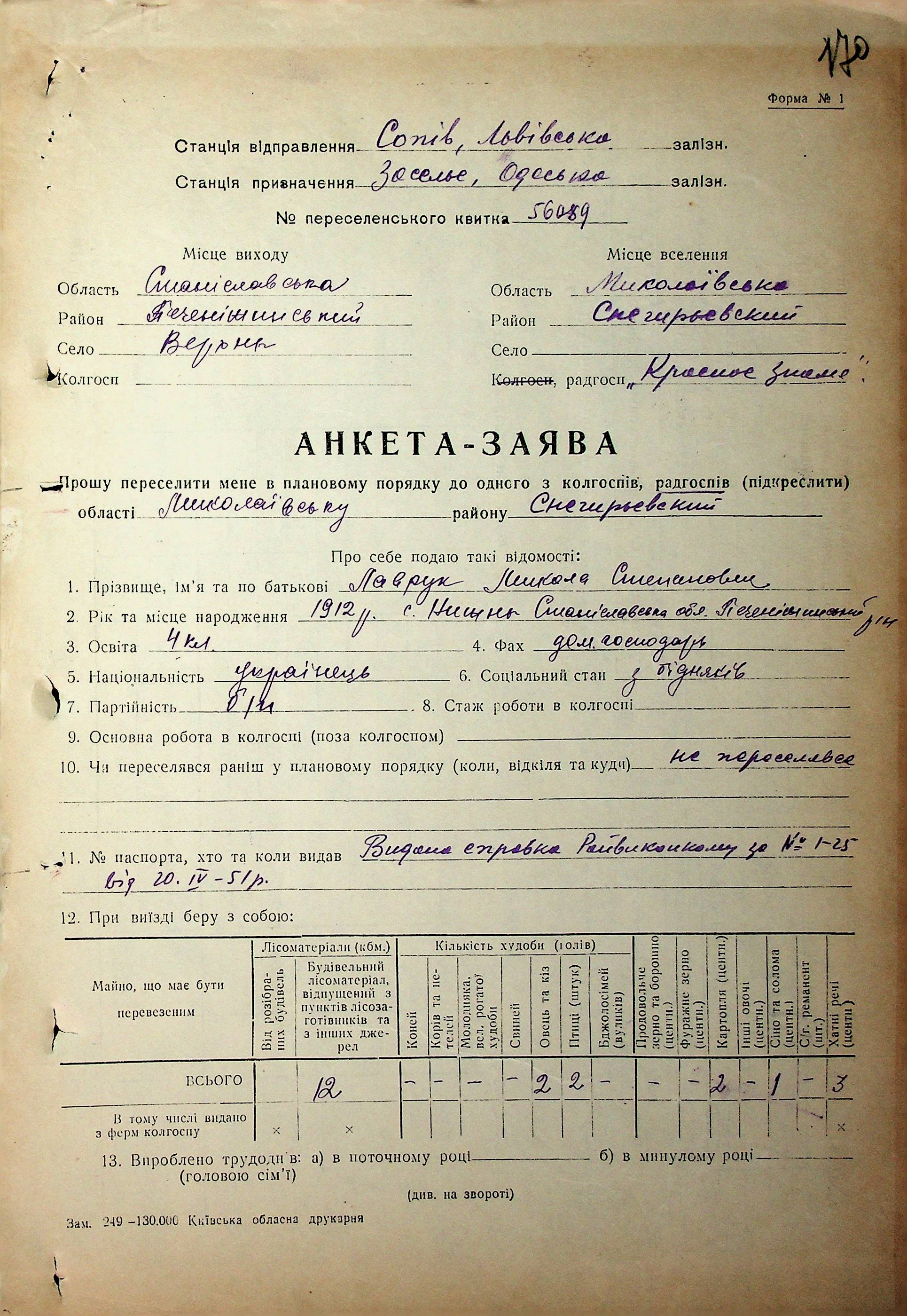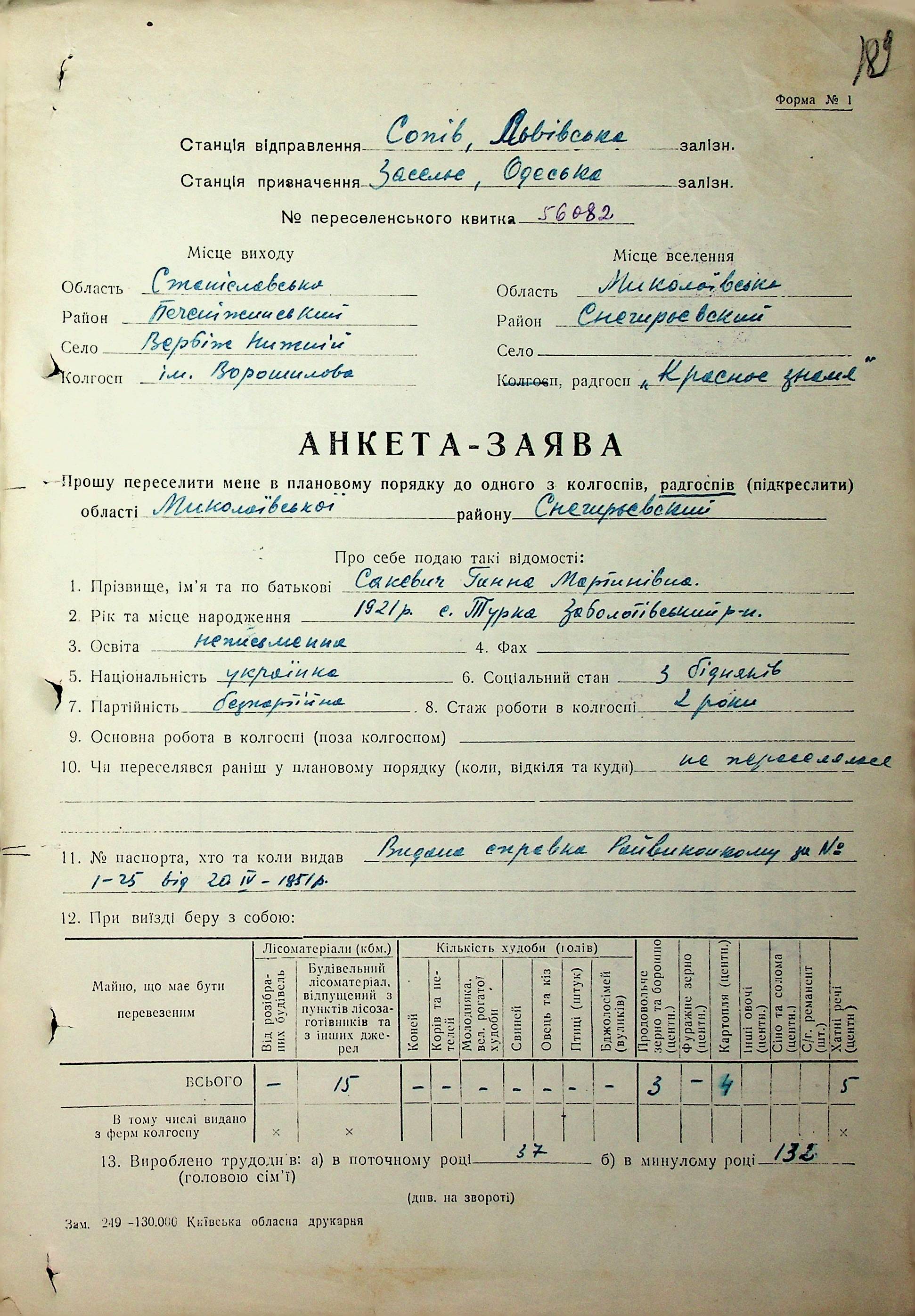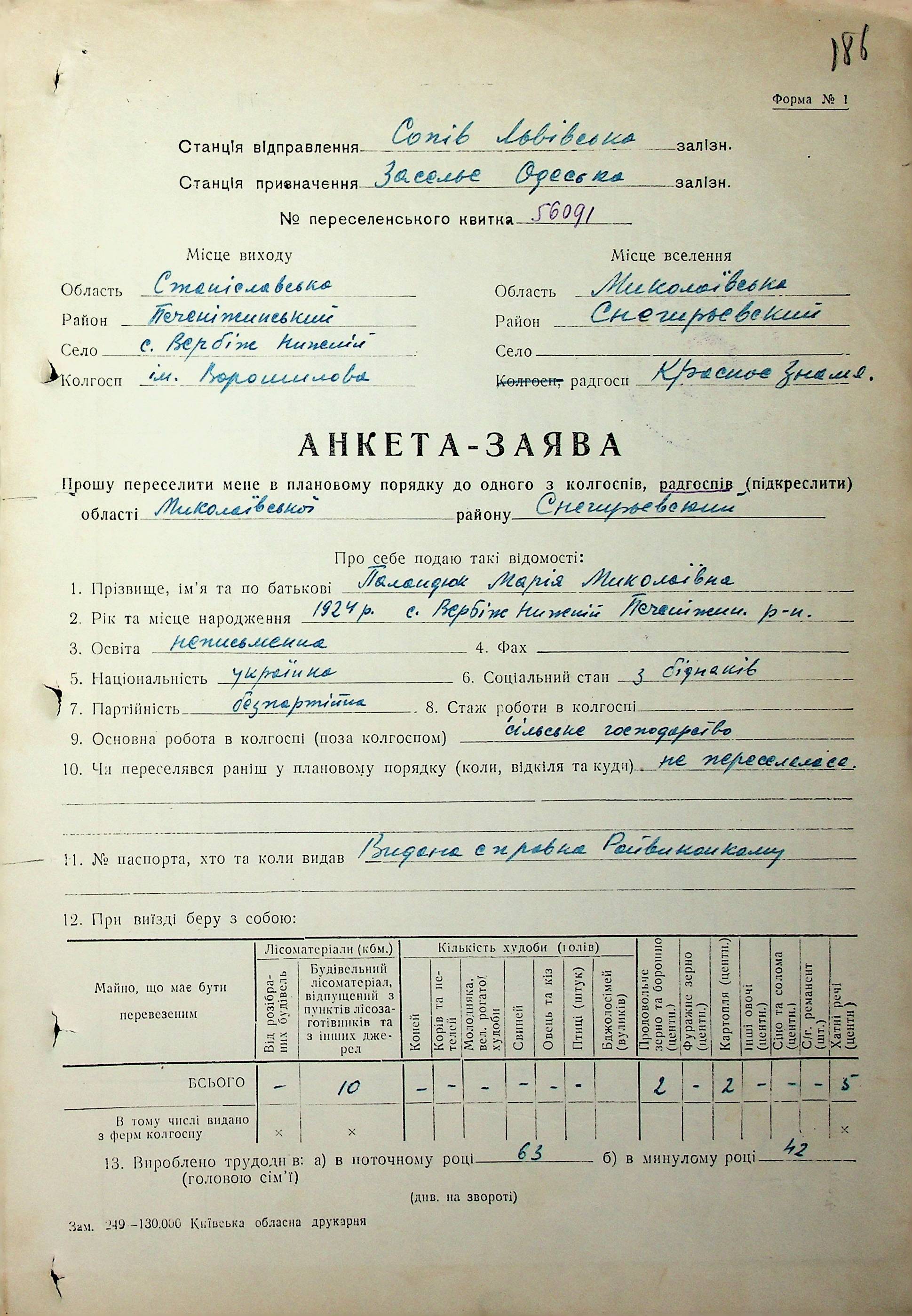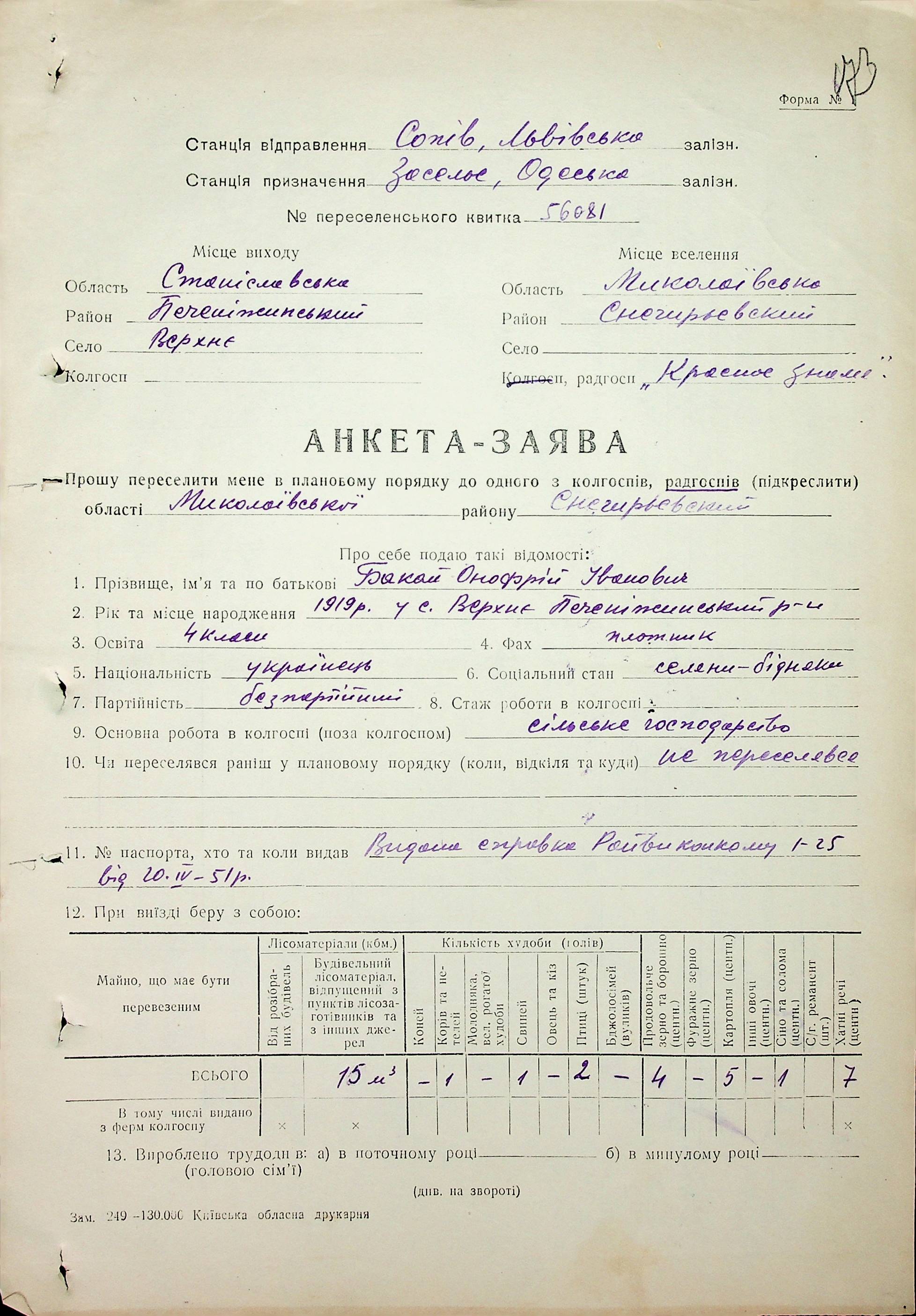 • • • • Справа № 74 “Анкети-заяви про планове переселення сімей з Станіславської до Миколаївської області. Характеристики на господарства, надані виконкомами районних Рад депутатів трудящих особам, які виявили бажання переселитися. Санітарний паспорт і дублікат ветеринарного свідоцтва на право посадки в ешелони. Том 1”