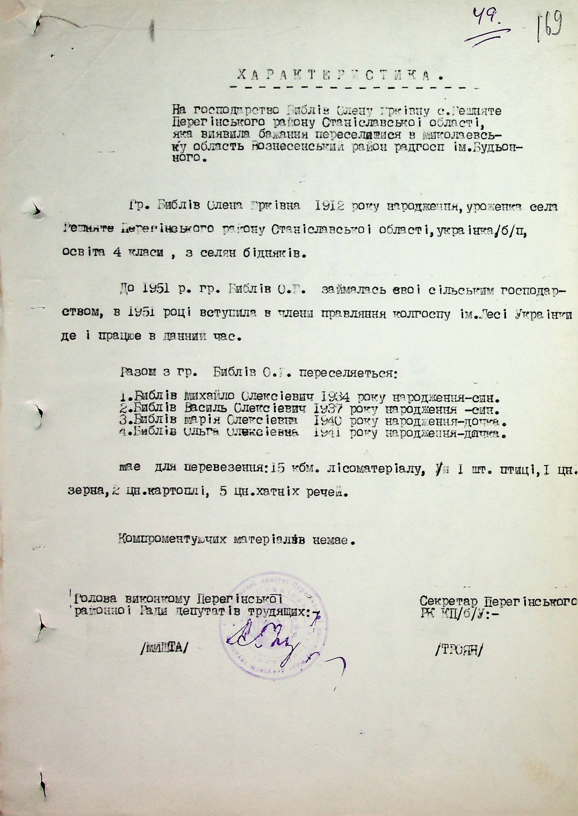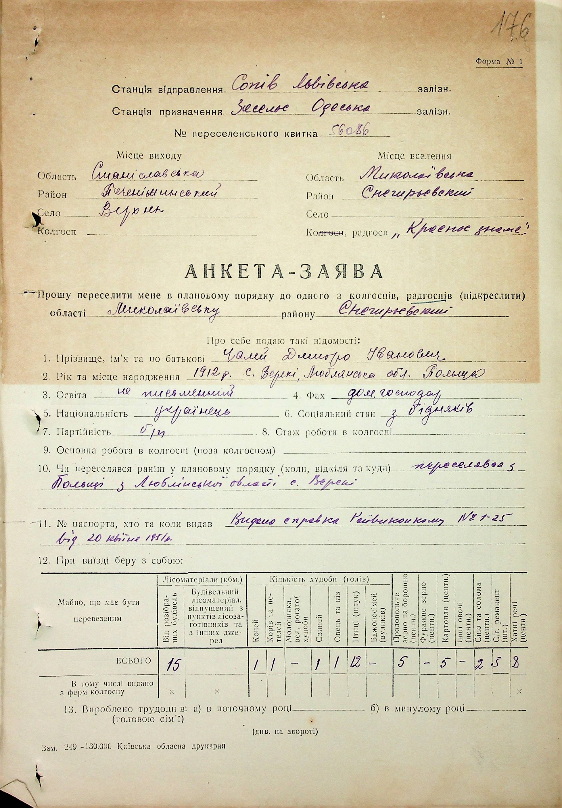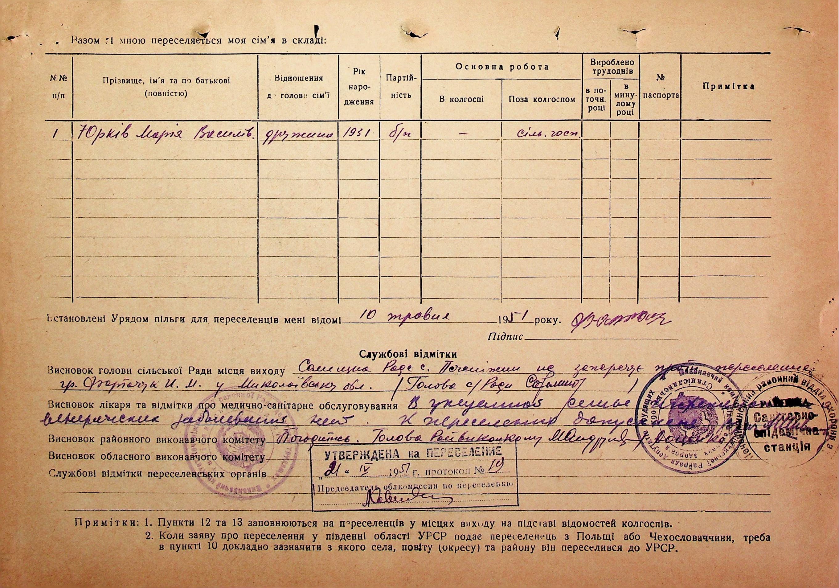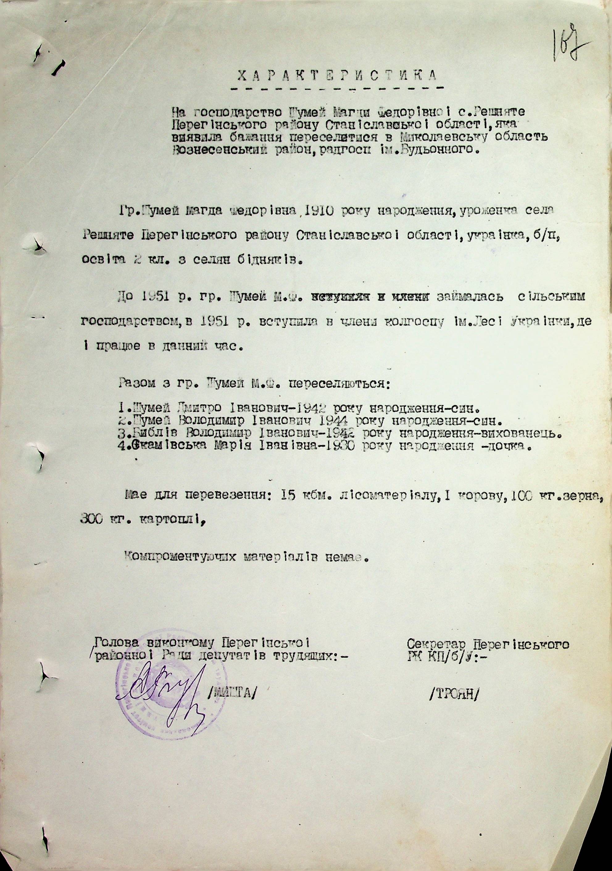 • • • • Справа № 74 “Анкети-заяви про планове переселення сімей з Станіславської до Миколаївської області. Характеристики на господарства, надані виконкомами районних Рад депутатів трудящих особам, які виявили бажання переселитися. Санітарний паспорт і дублікат ветеринарного свідоцтва на право посадки в ешелони. Том 1”