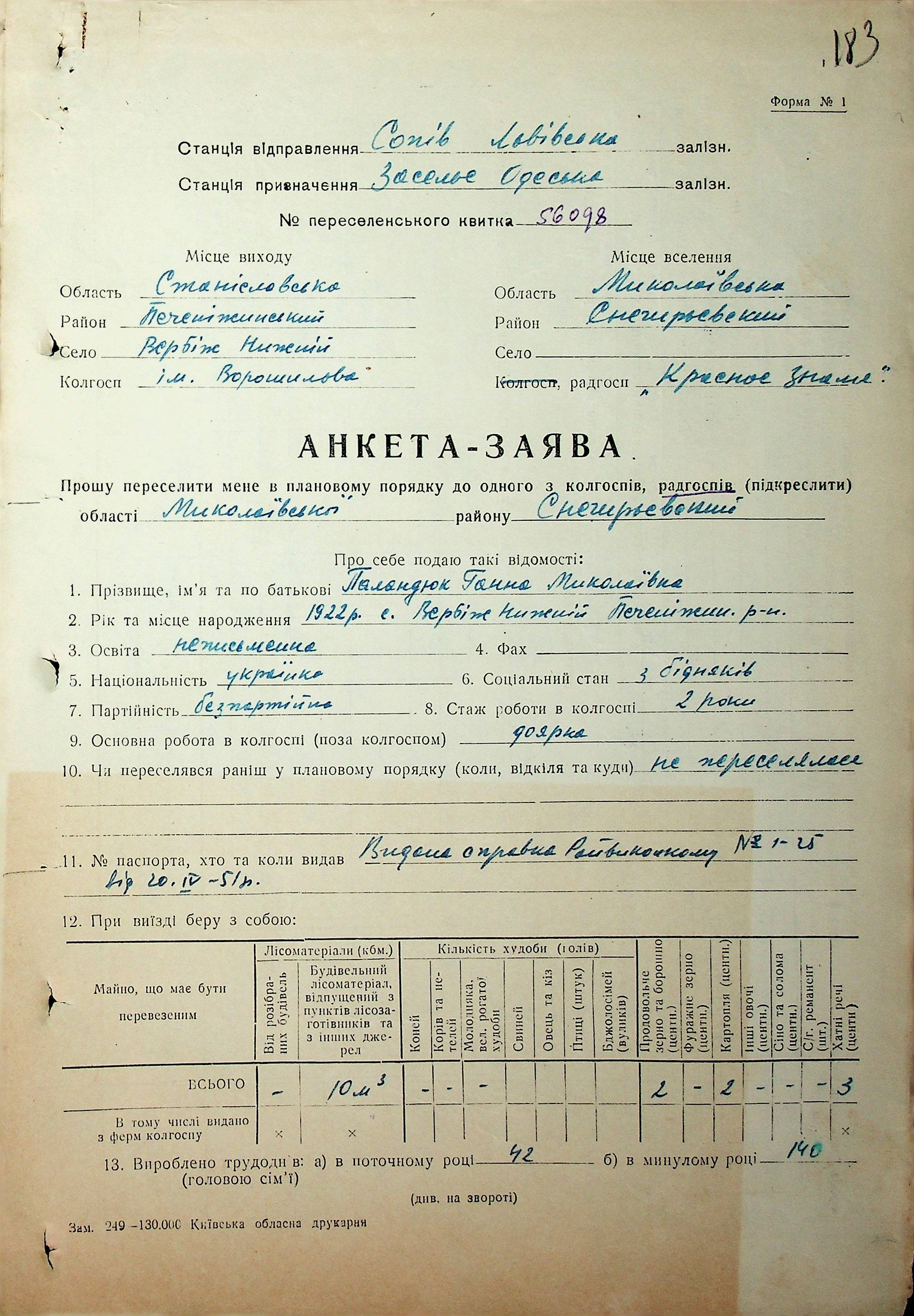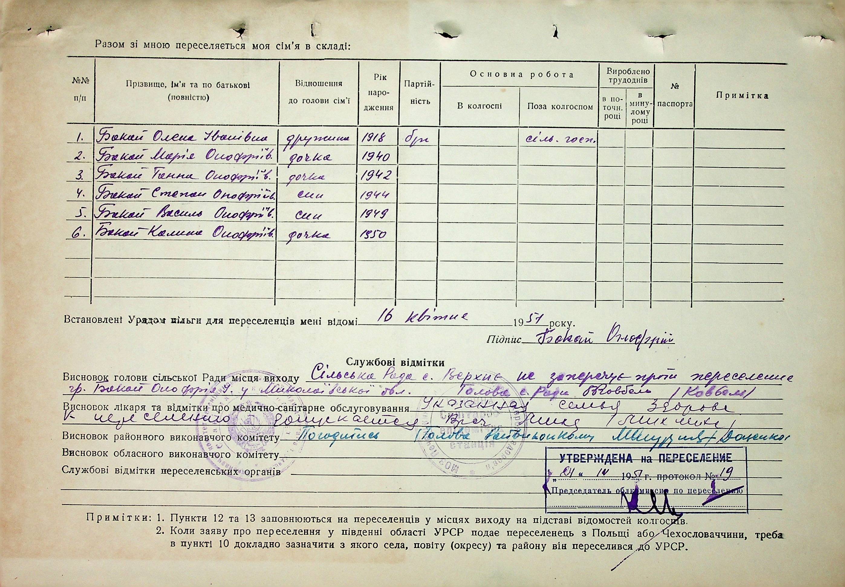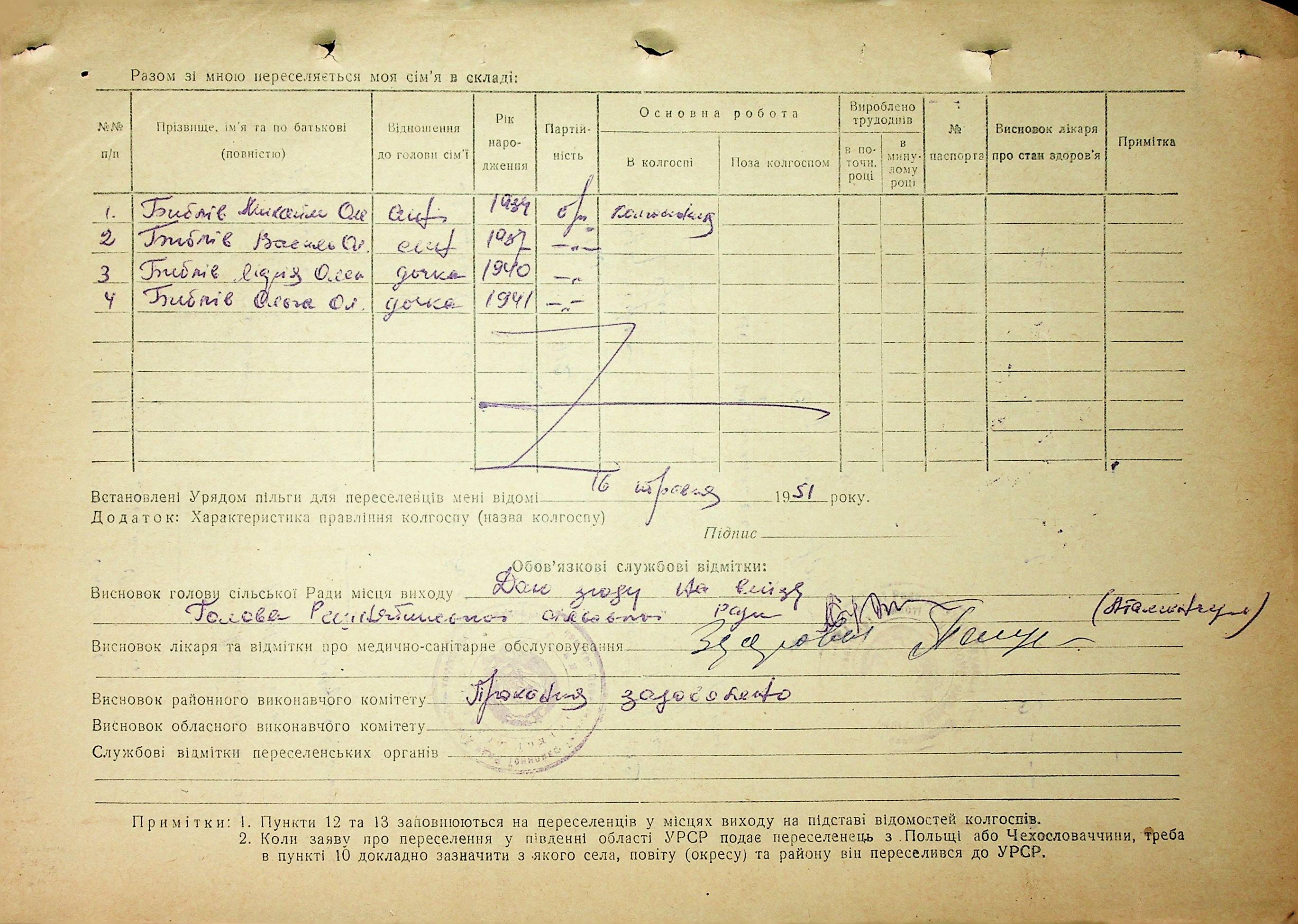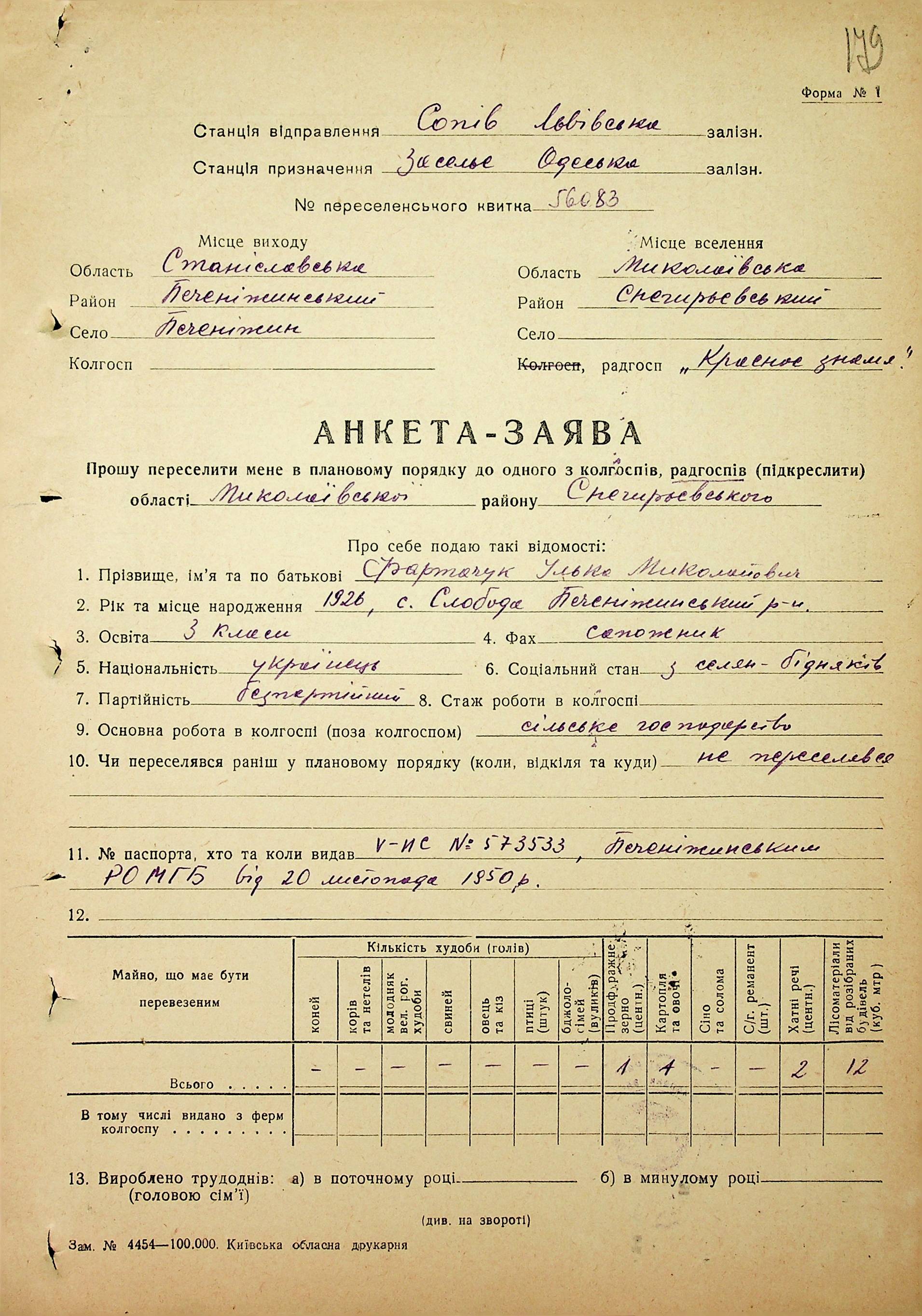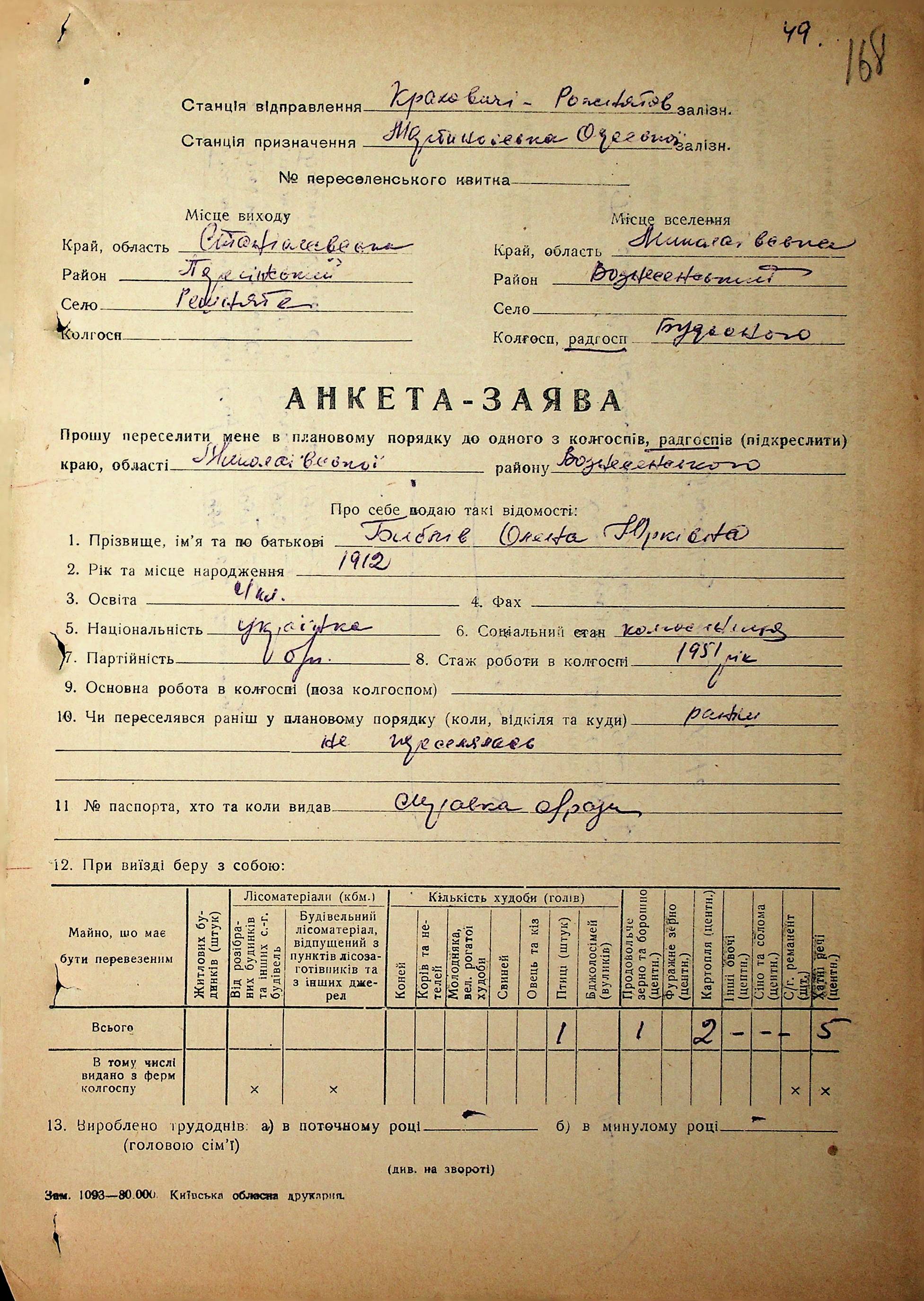 • • • • Справа № 74 “Анкети-заяви про планове переселення сімей з Станіславської до Миколаївської області. Характеристики на господарства, надані виконкомами районних Рад депутатів трудящих особам, які виявили бажання переселитися. Санітарний паспорт і дублікат ветеринарного свідоцтва на право посадки в ешелони. Том 1”
