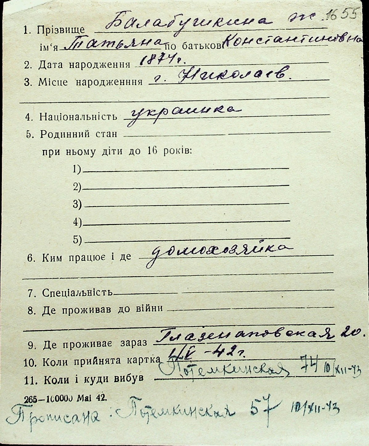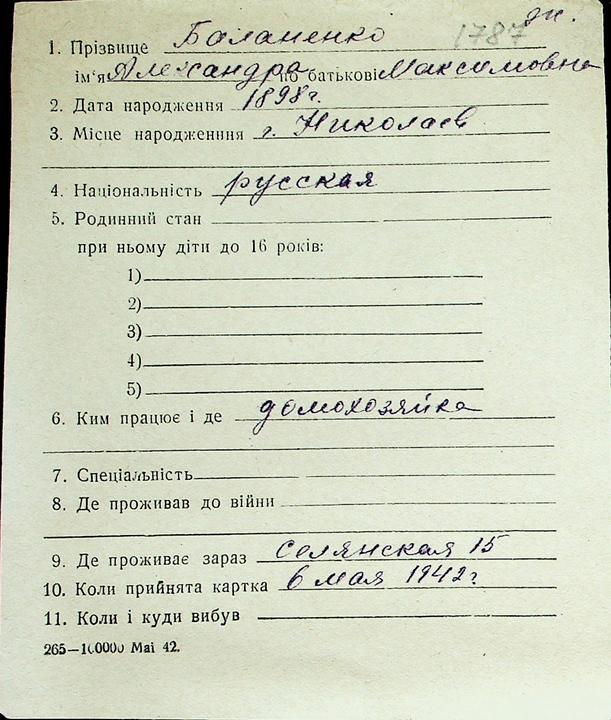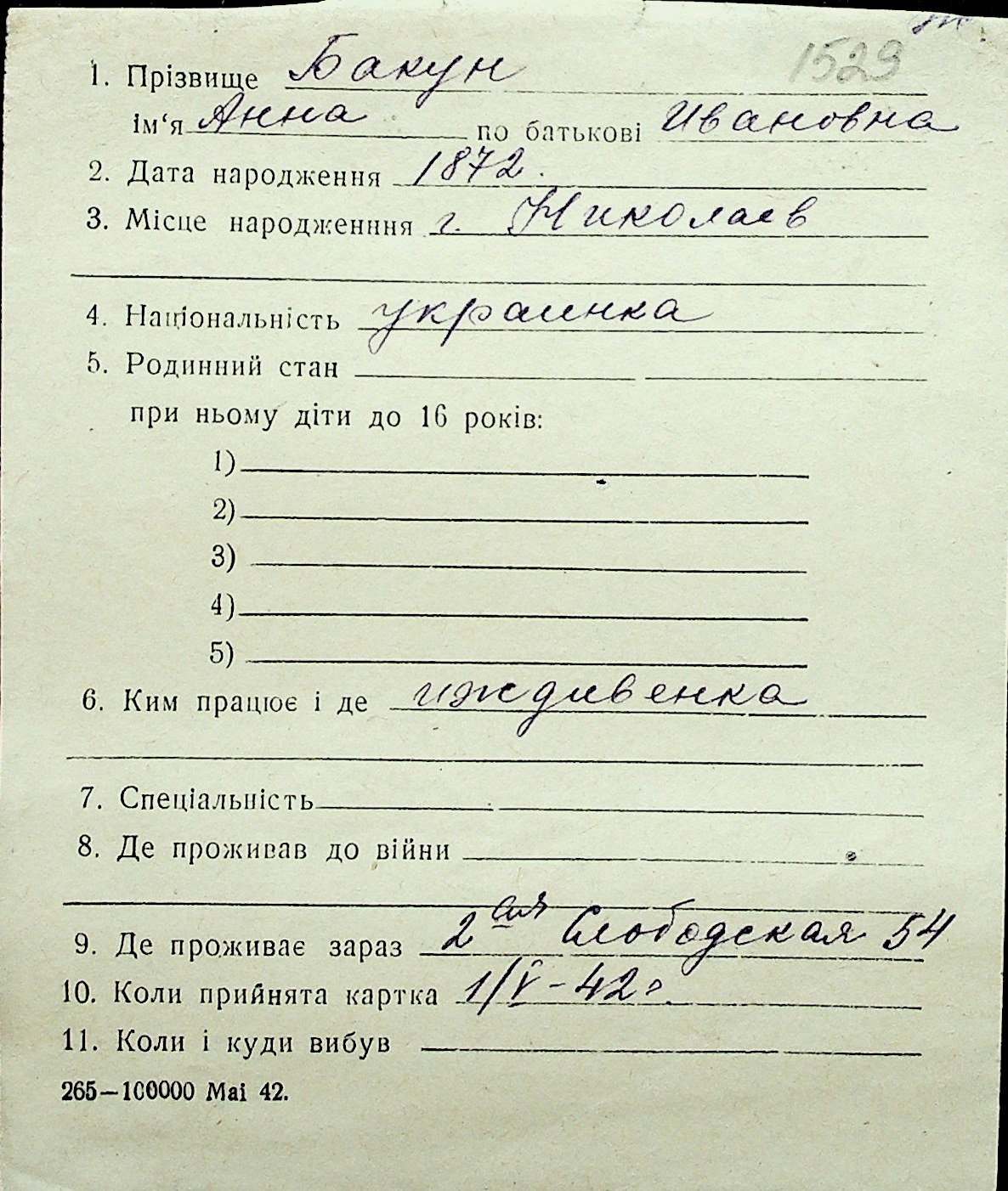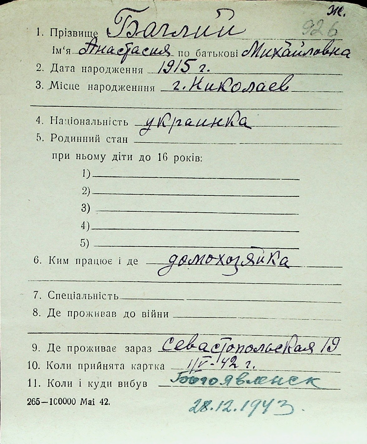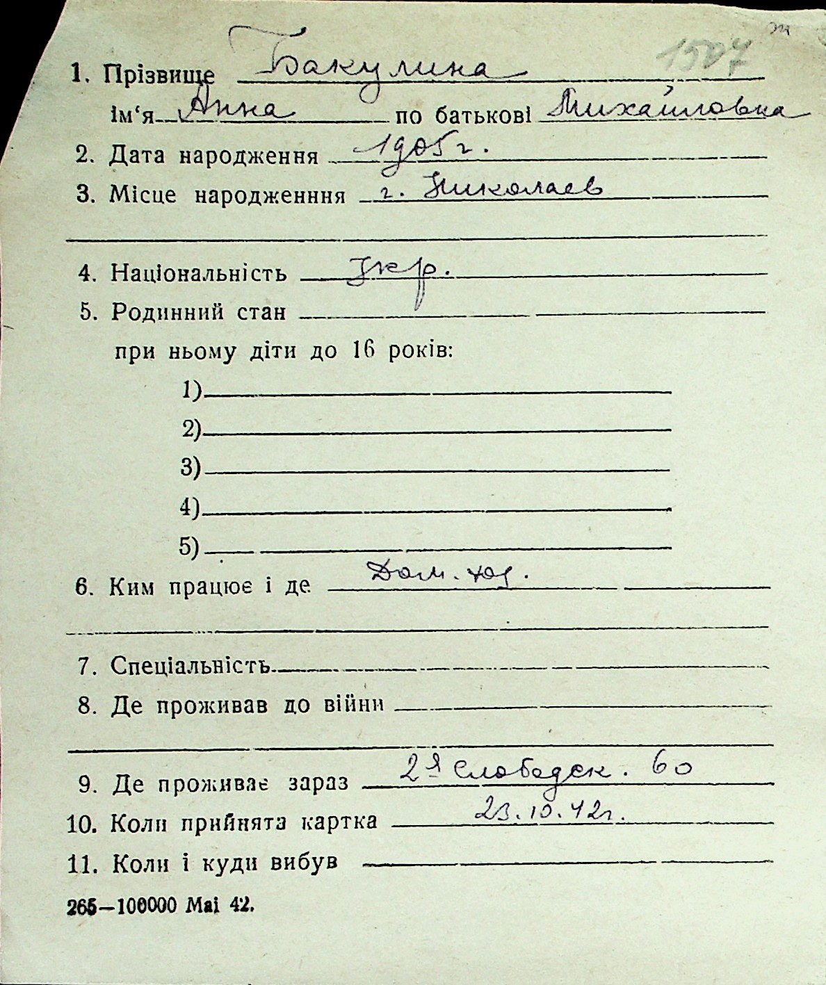 ◦ ◦ Перелік карток на осіб, які мешкали у м. Миколаїв у період окупації 1941–1944 років