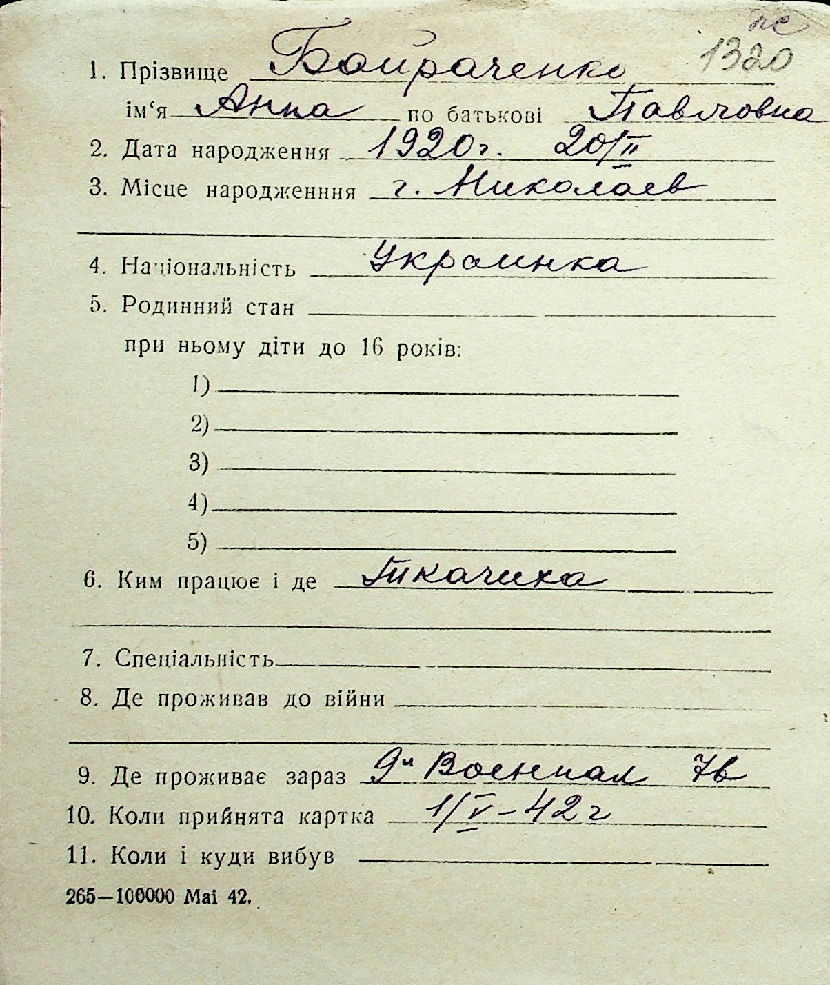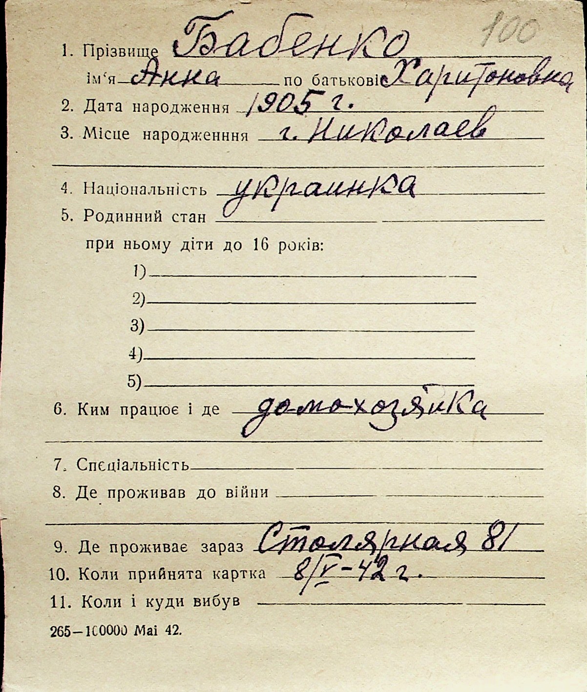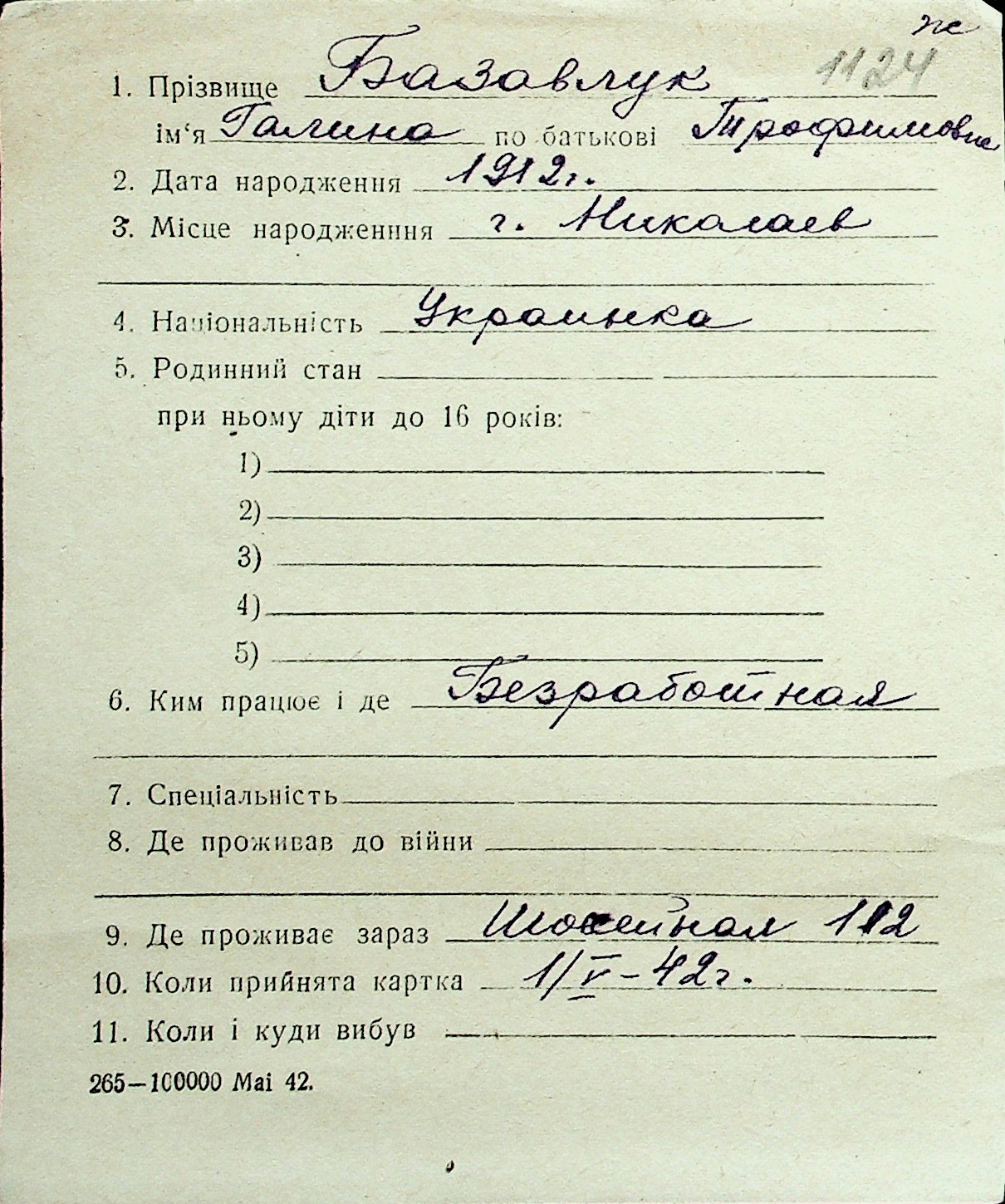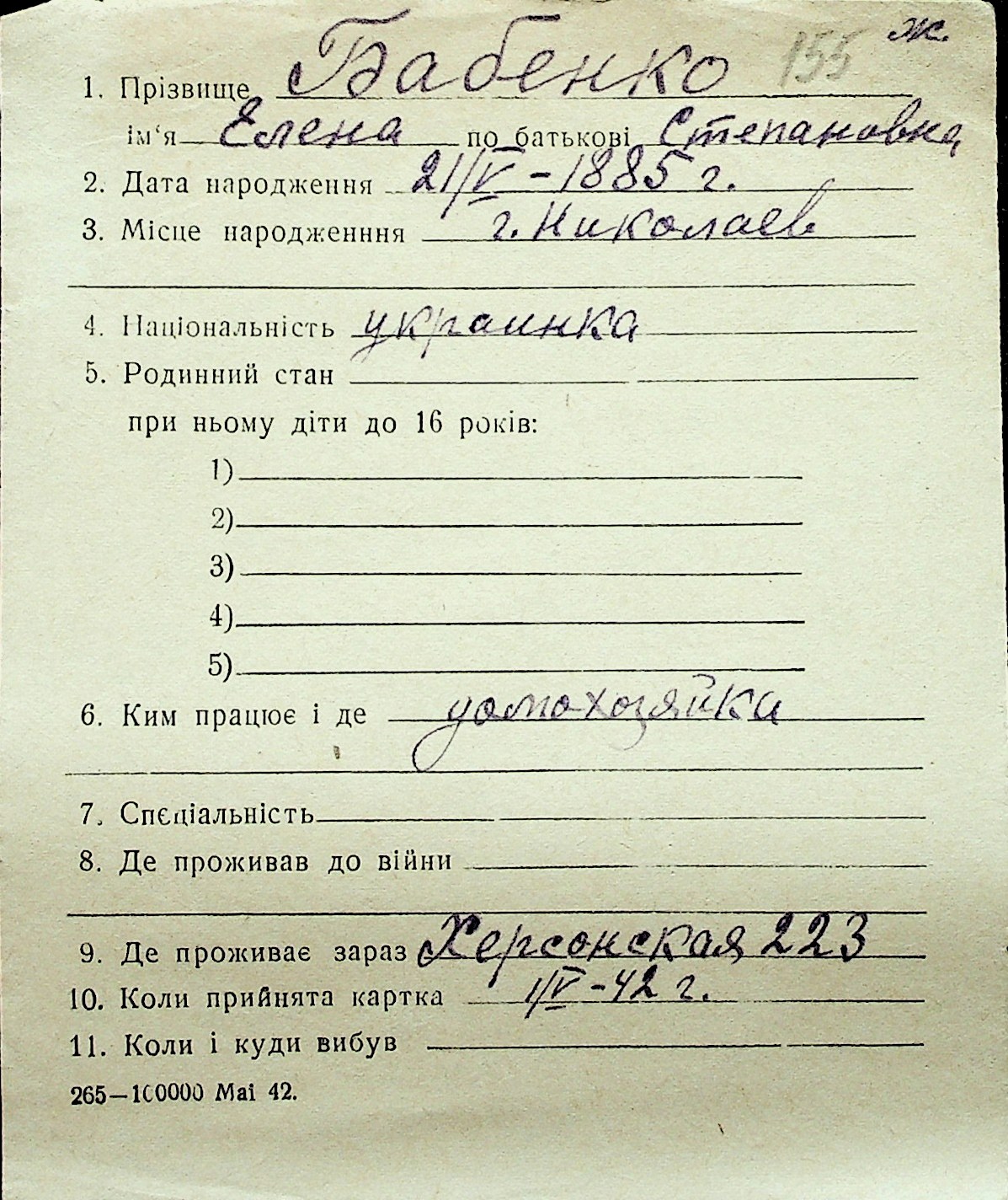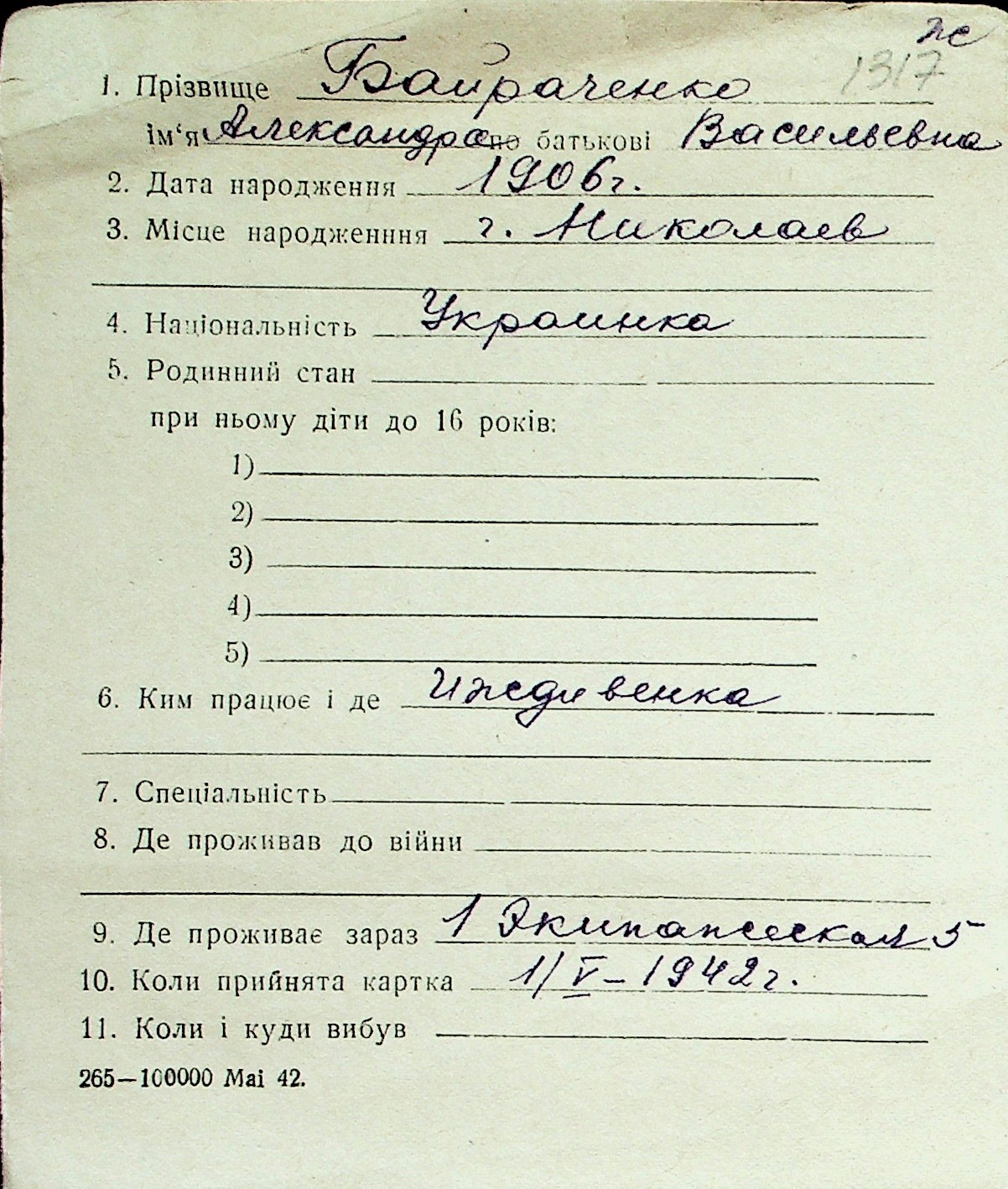 ◦ ◦ Перелік карток на осіб, які мешкали у м. Миколаїв у період окупації 1941–1944 років