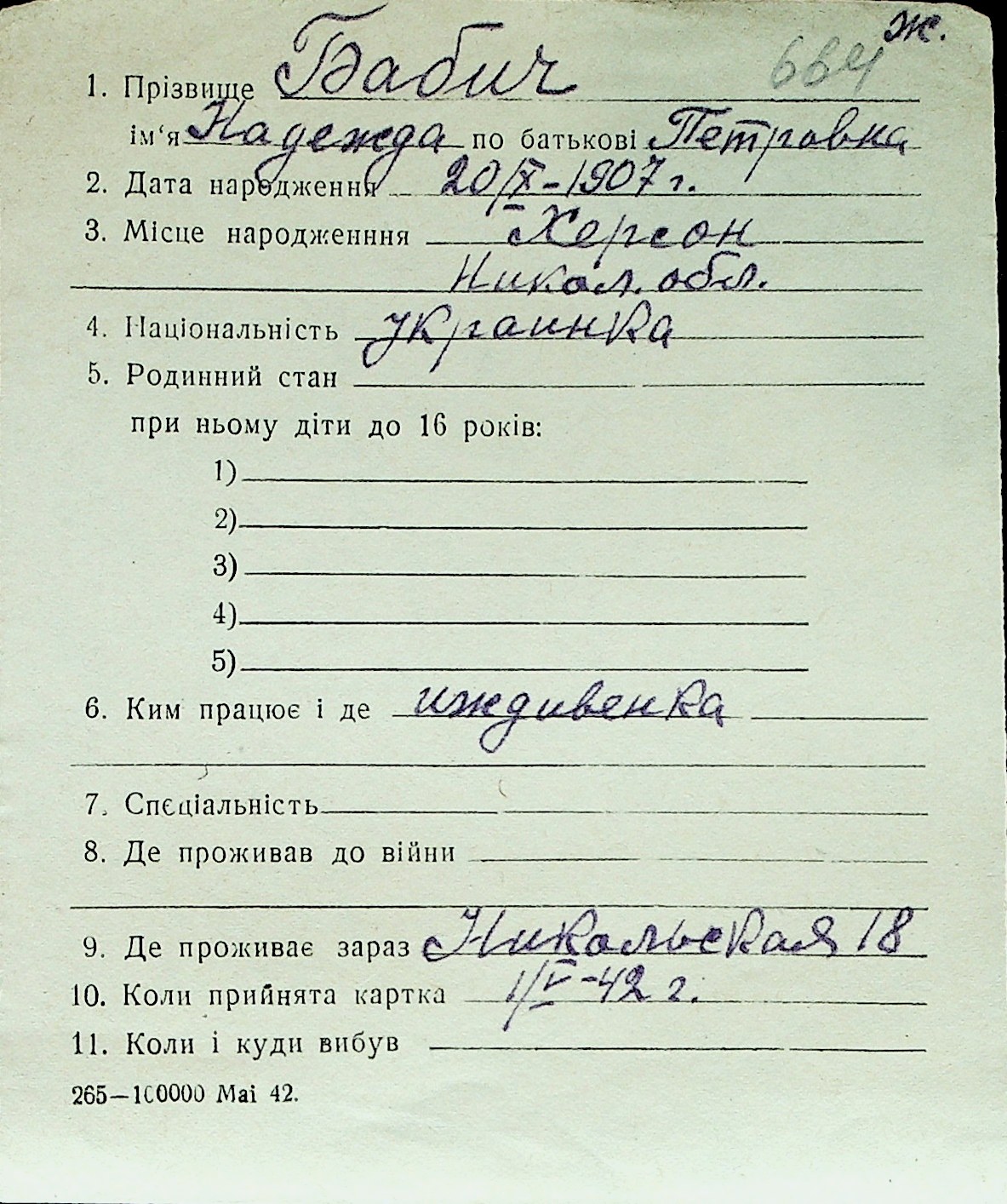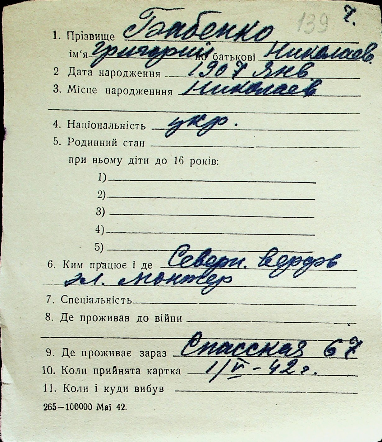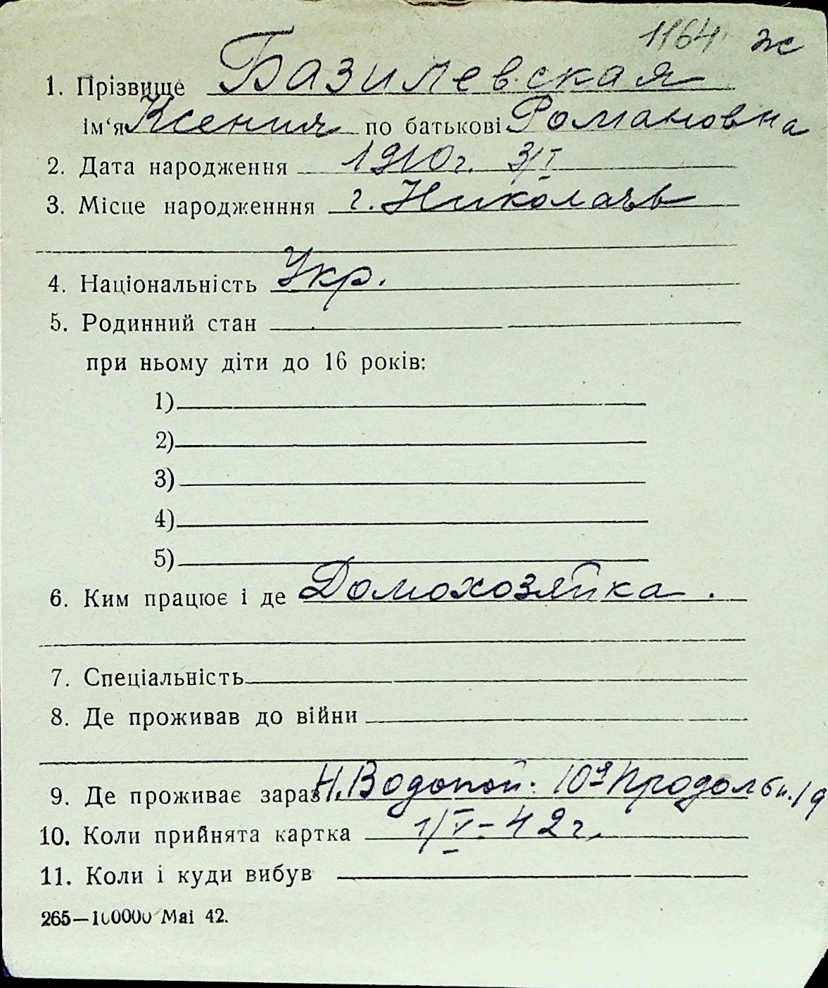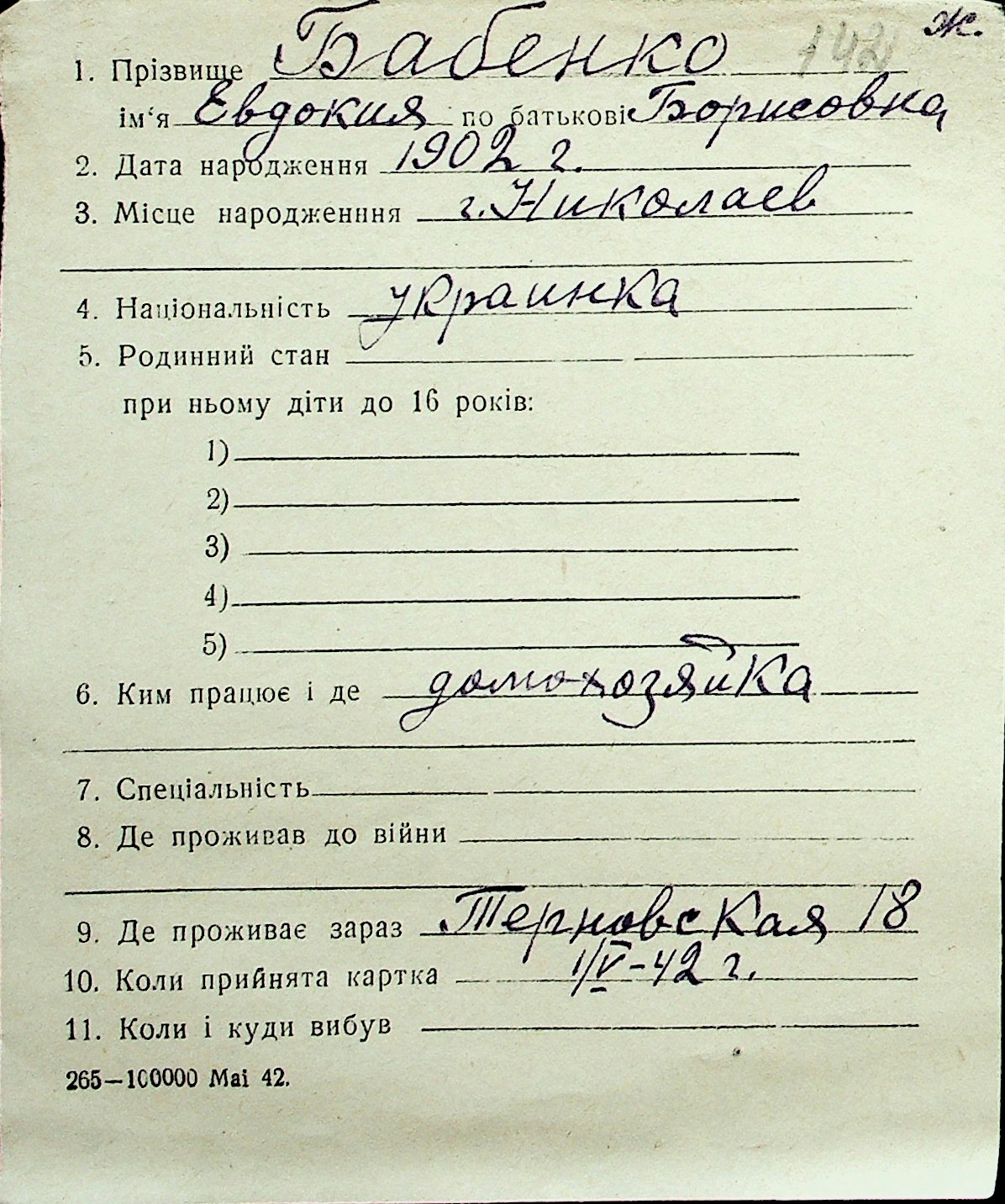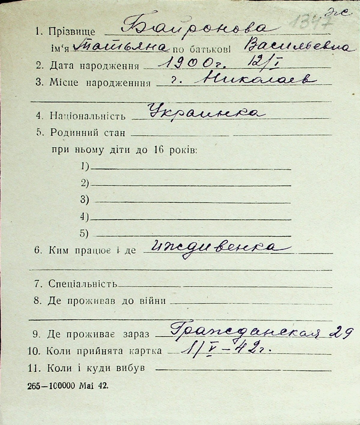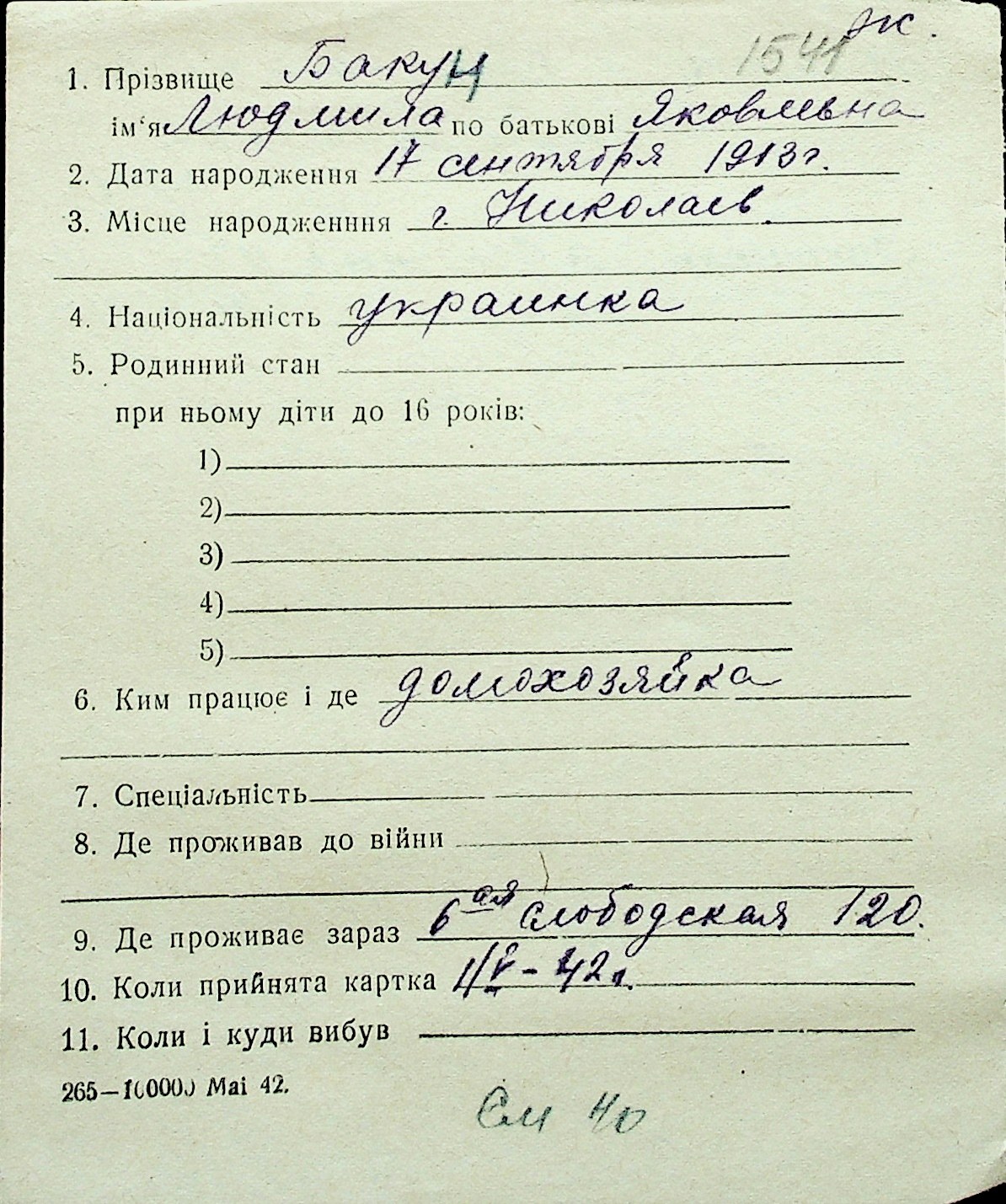 ◦ ◦ Перелік карток на осіб, які мешкали у м. Миколаїв у період окупації 1941–1944 років