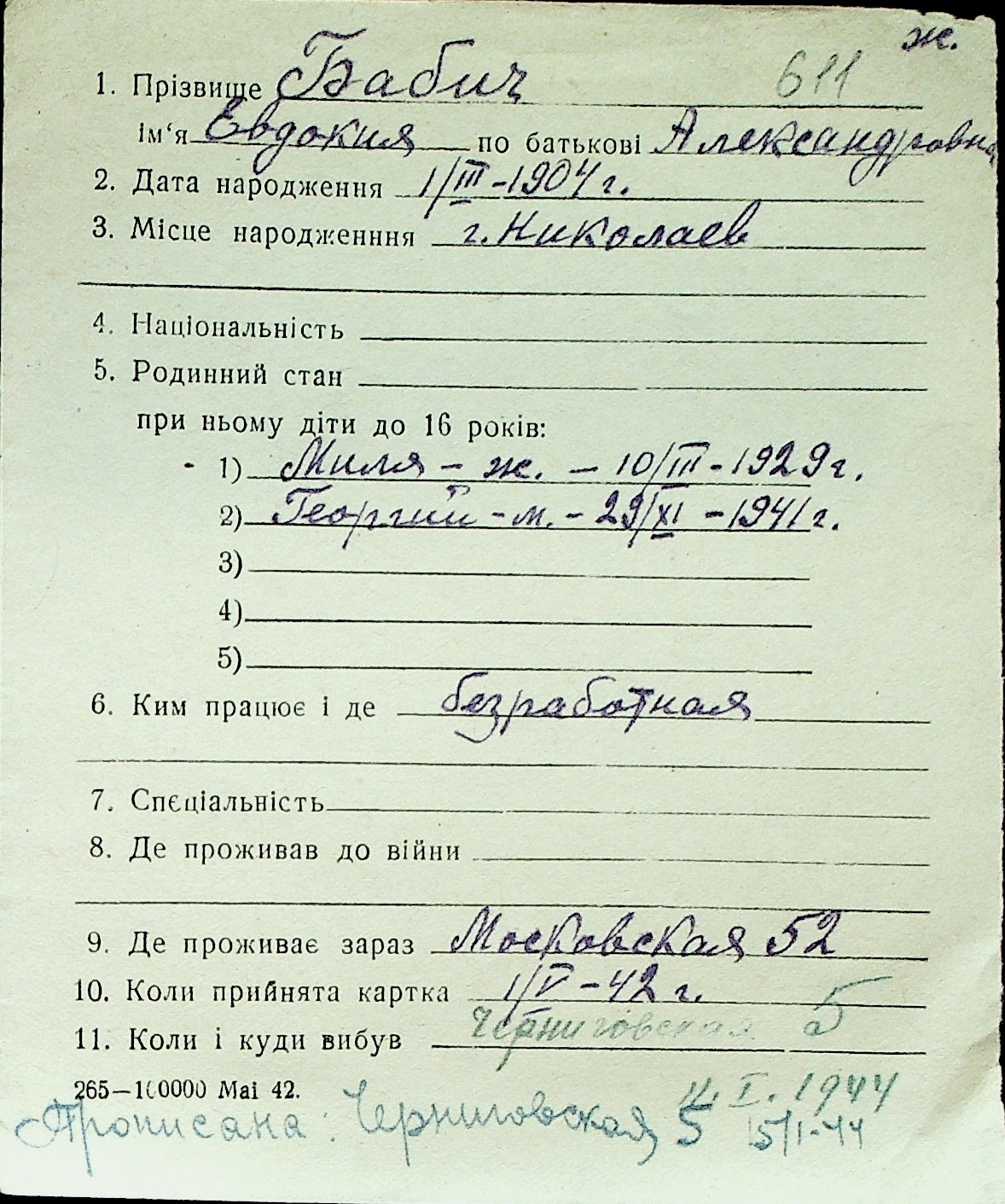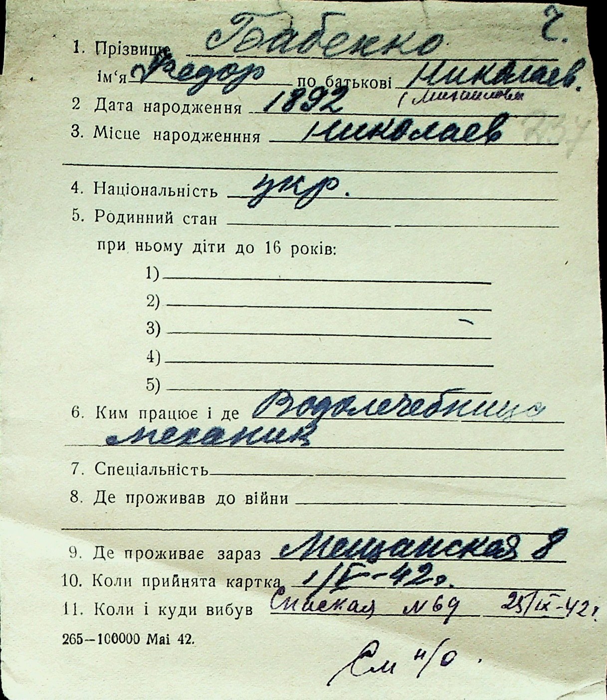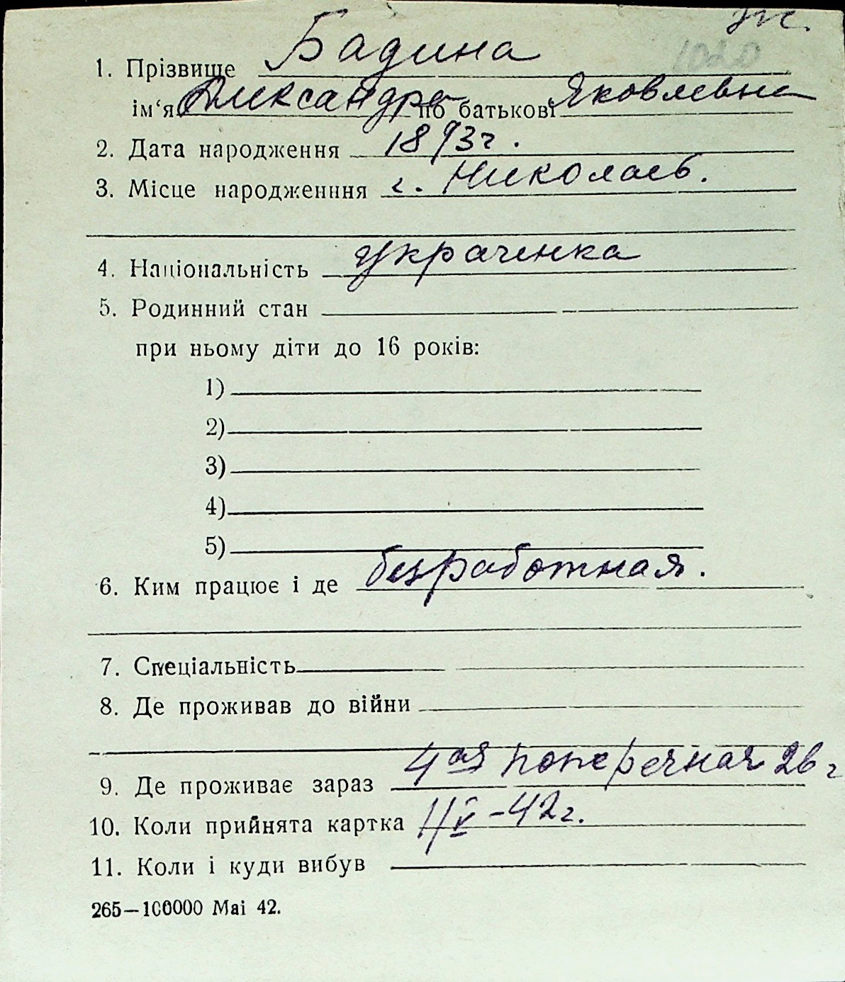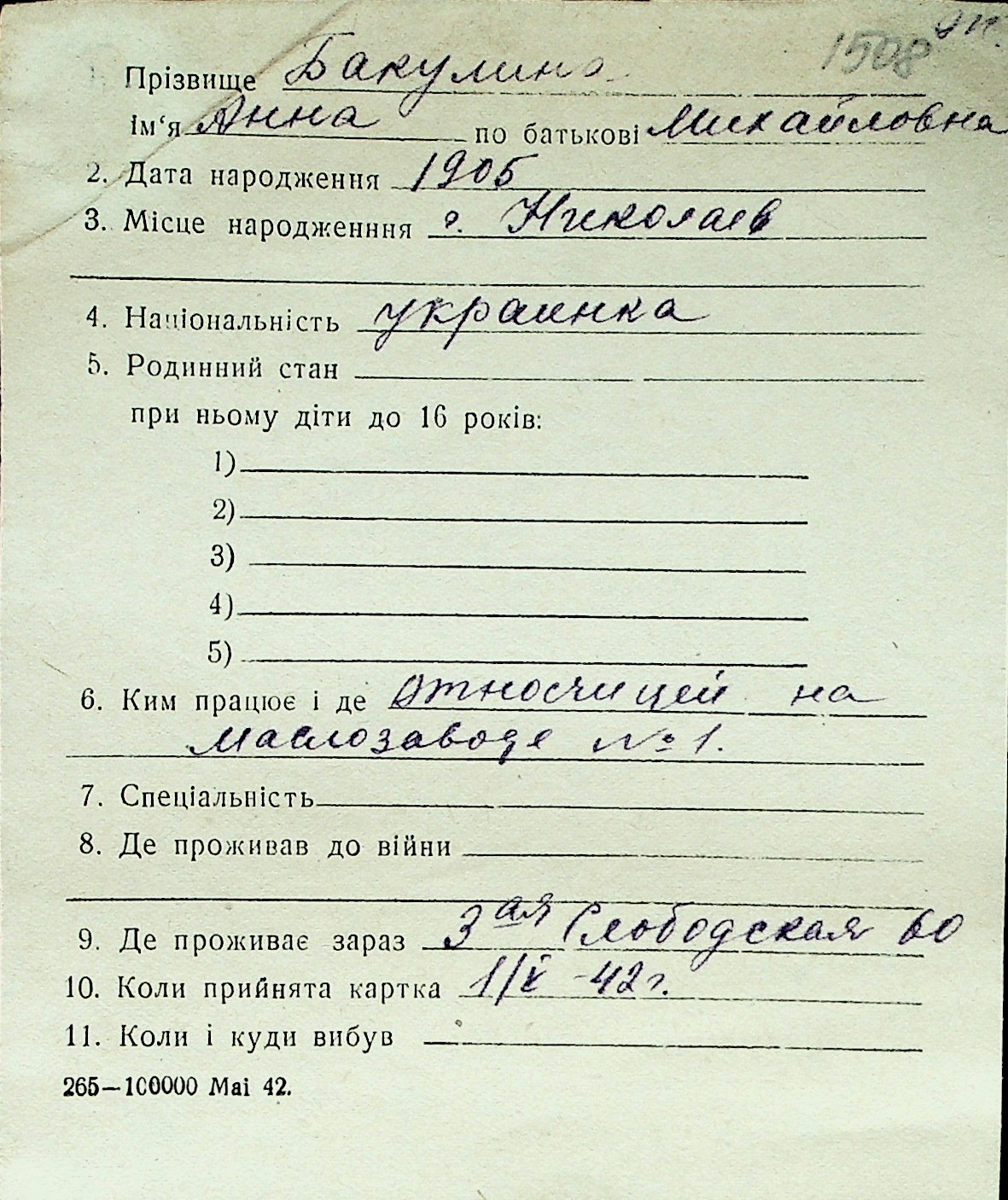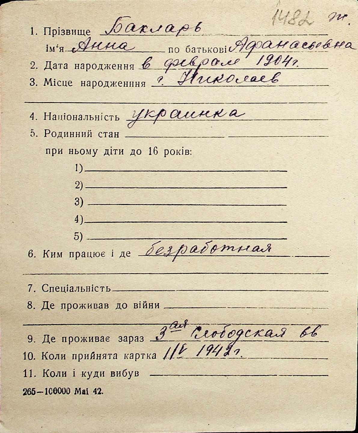 ◦ ◦ Перелік карток на осіб, які мешкали у м. Миколаїв у період окупації 1941–1944 років