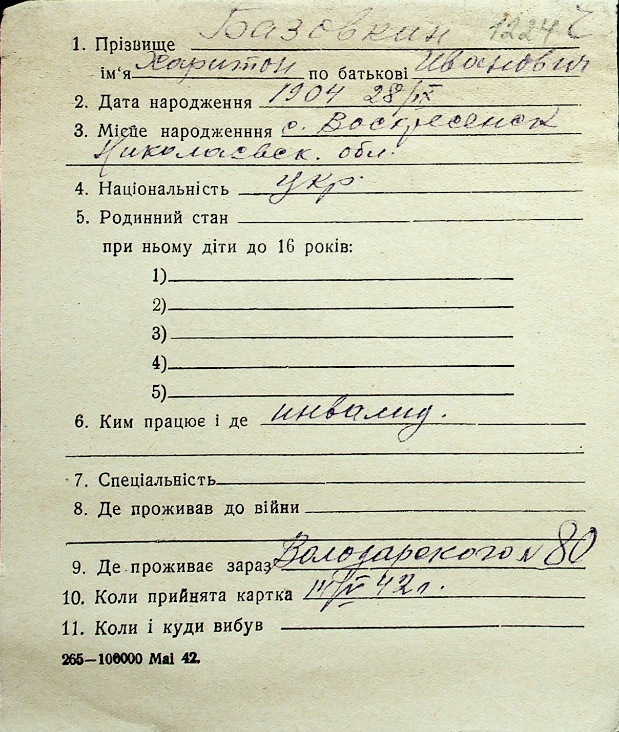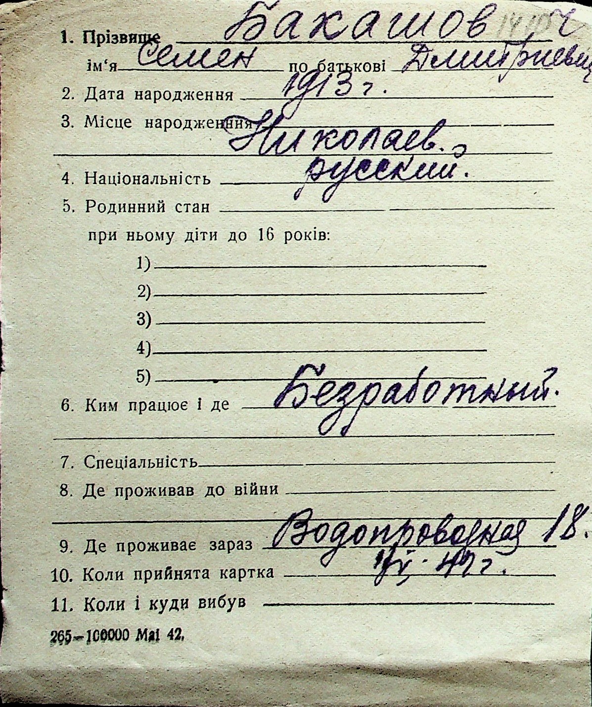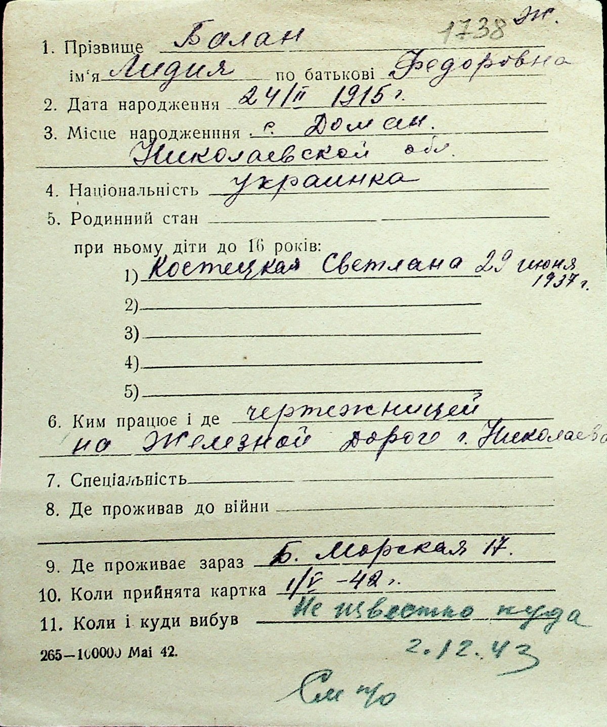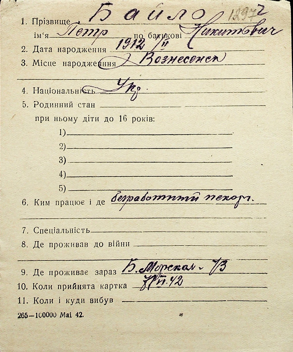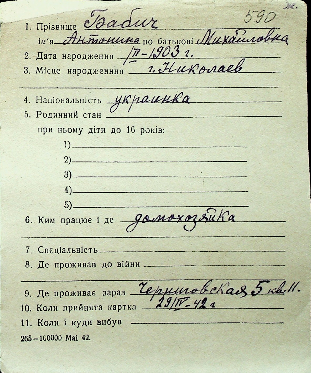 ◦ ◦ Перелік карток на осіб, які мешкали у м. Миколаїв у період окупації 1941–1944 років