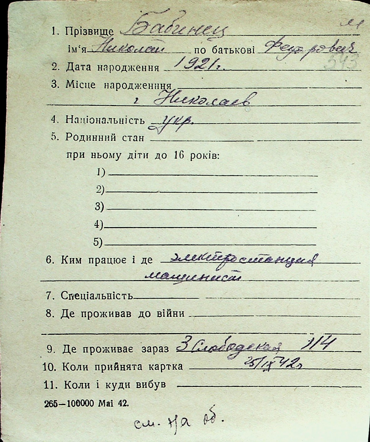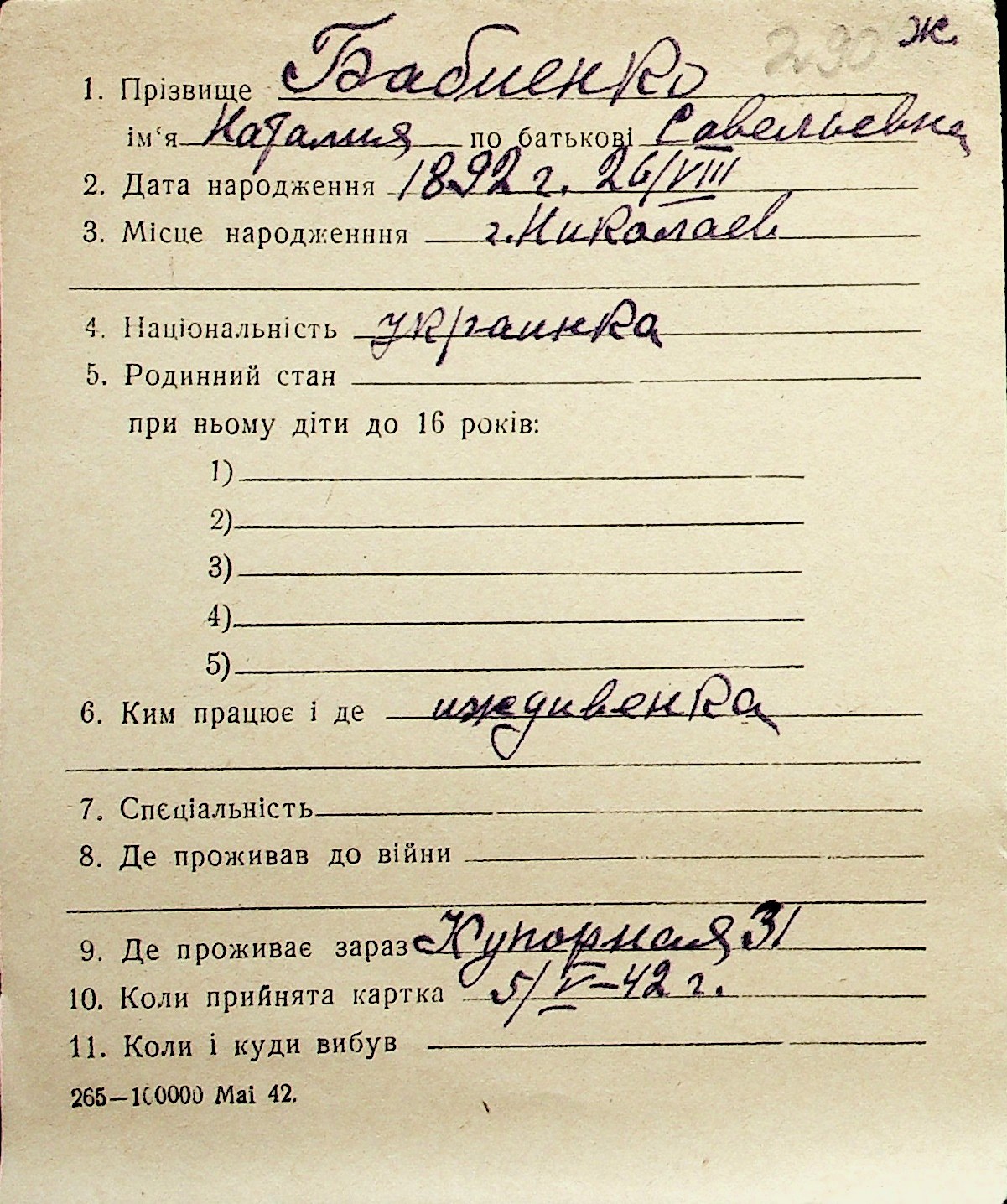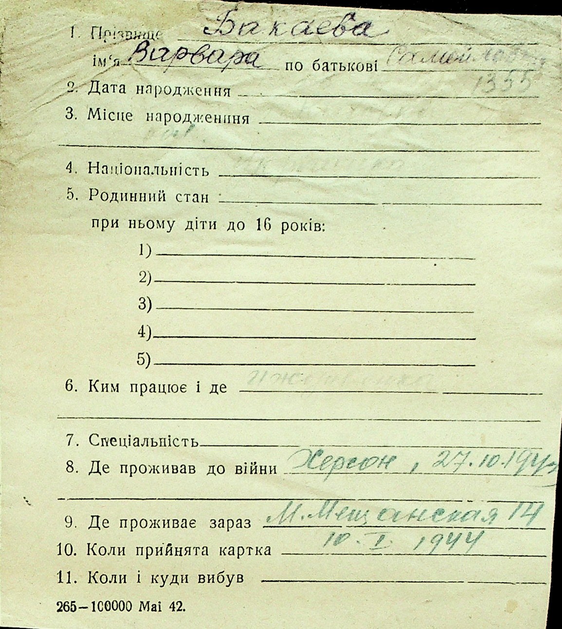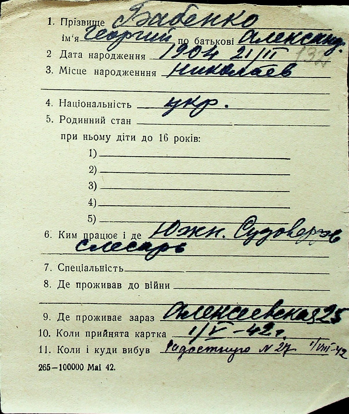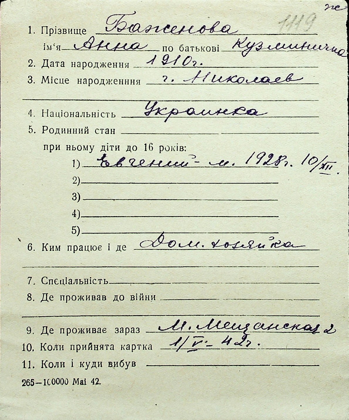 ◦ ◦ Перелік карток на осіб, які мешкали у м. Миколаїв у період окупації 1941–1944 років