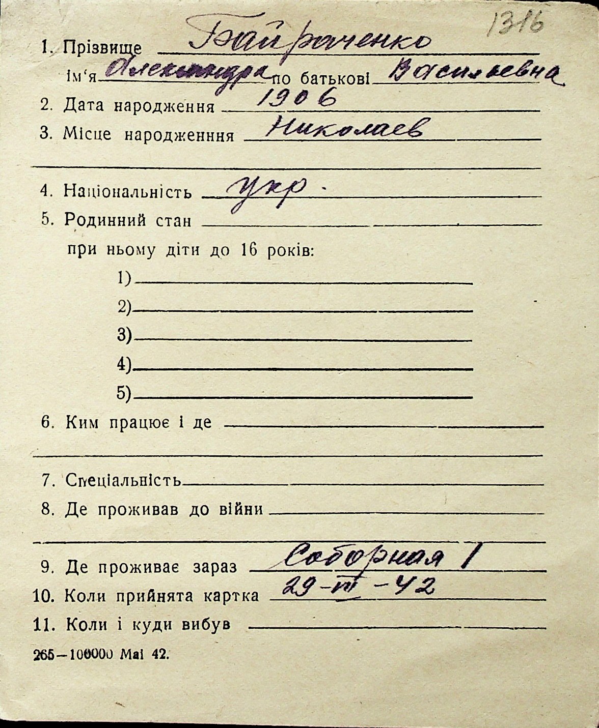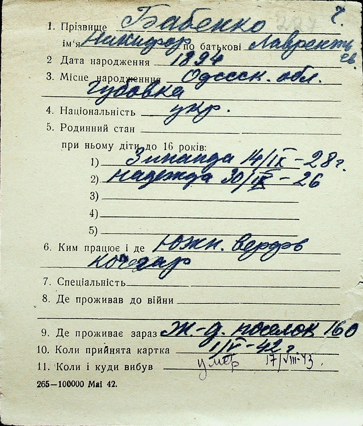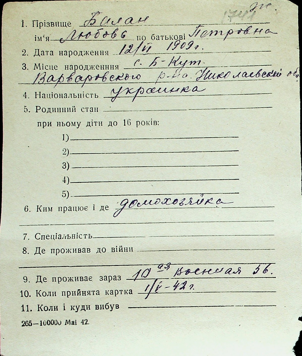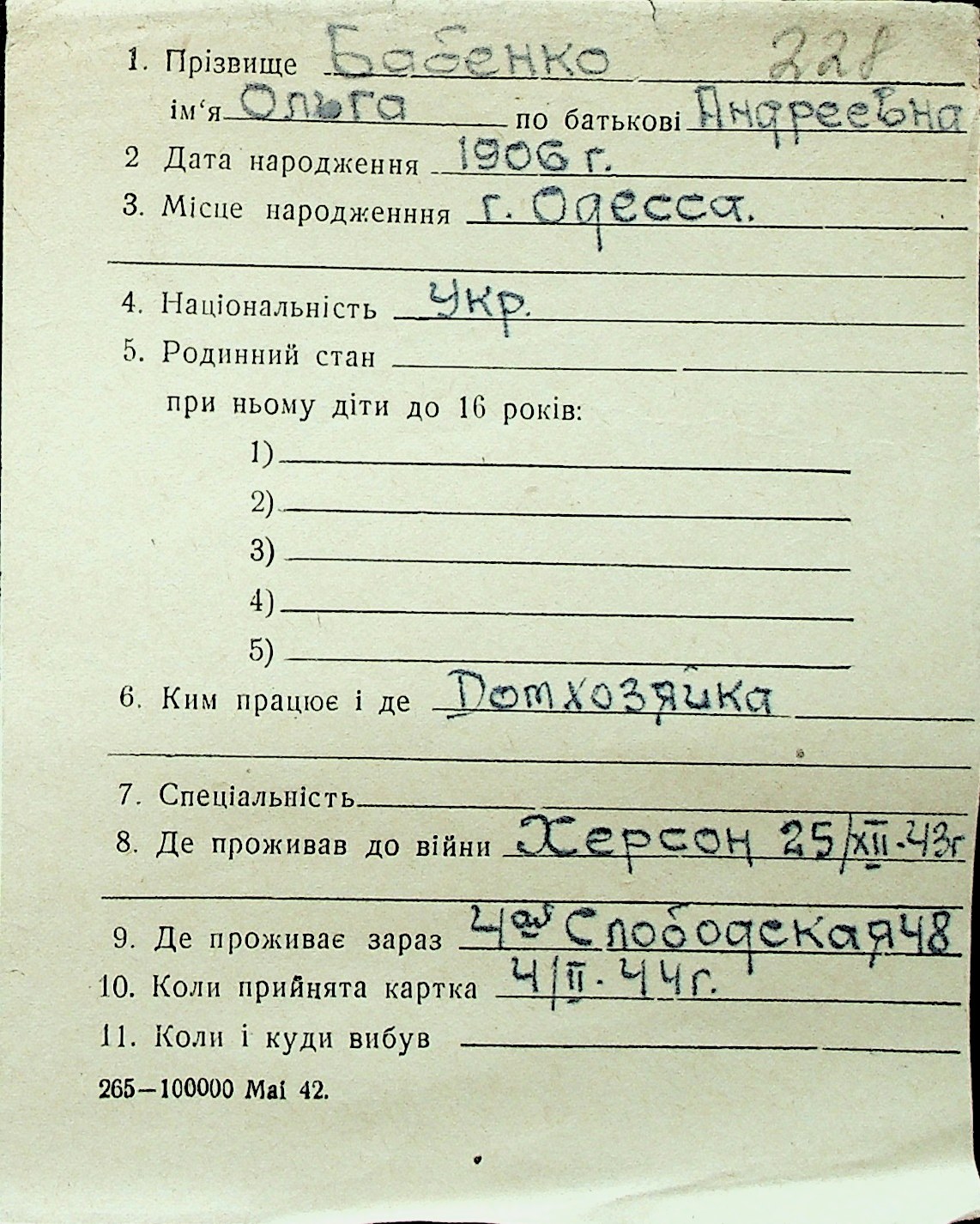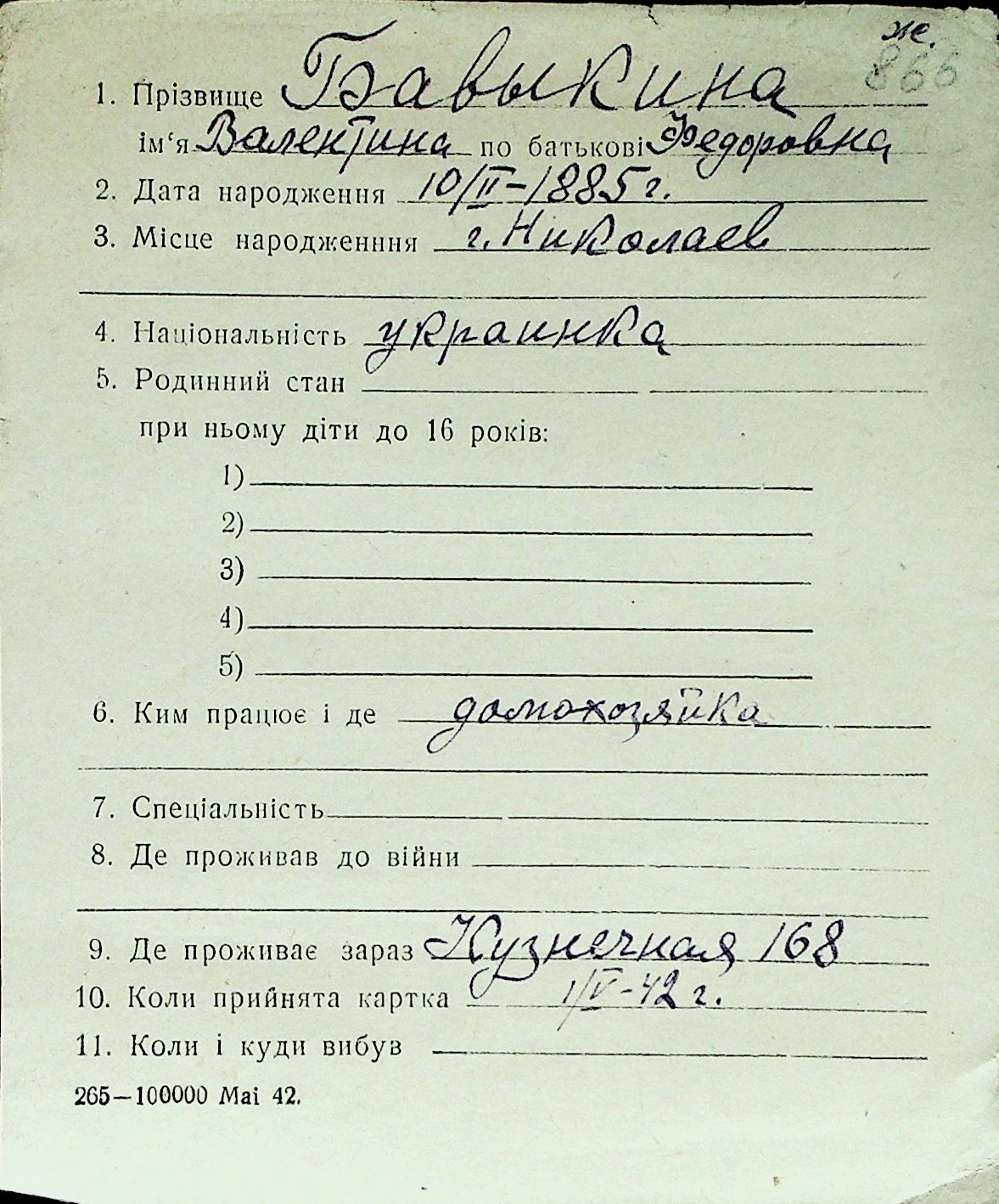 ◦ ◦ Перелік карток на осіб, які мешкали у м. Миколаїв у період окупації 1941–1944 років