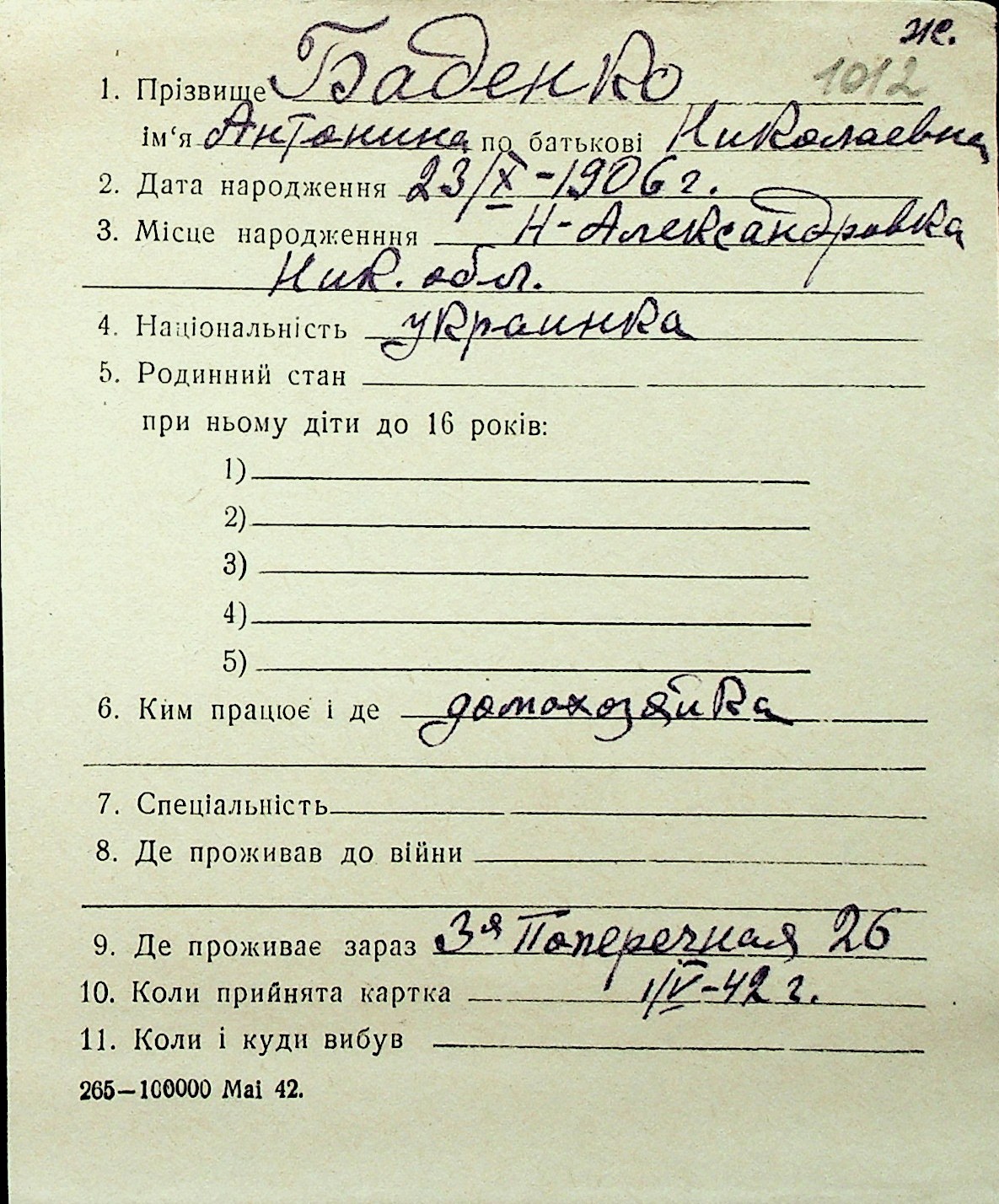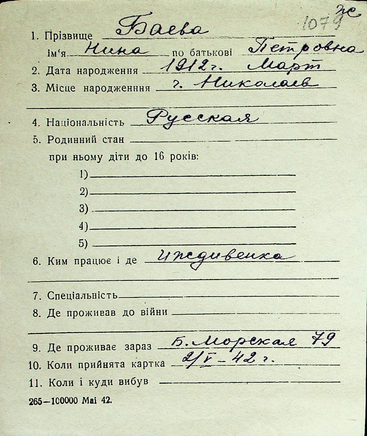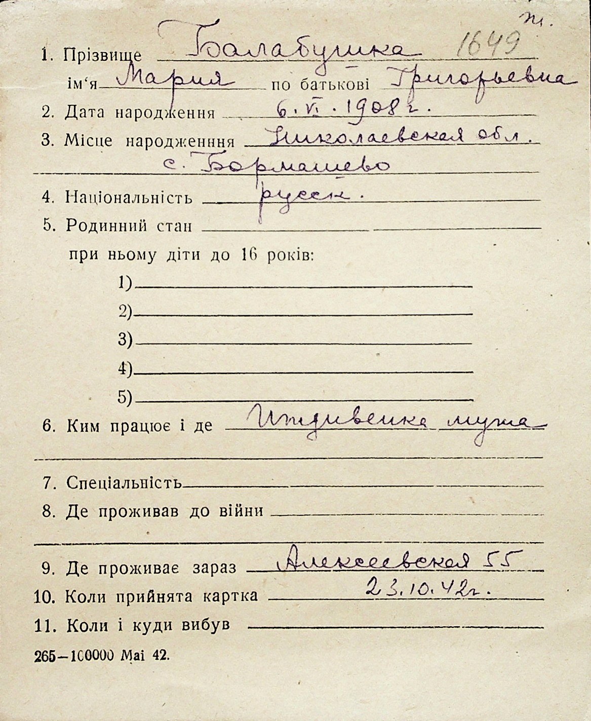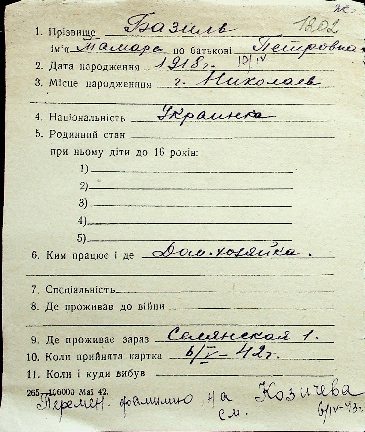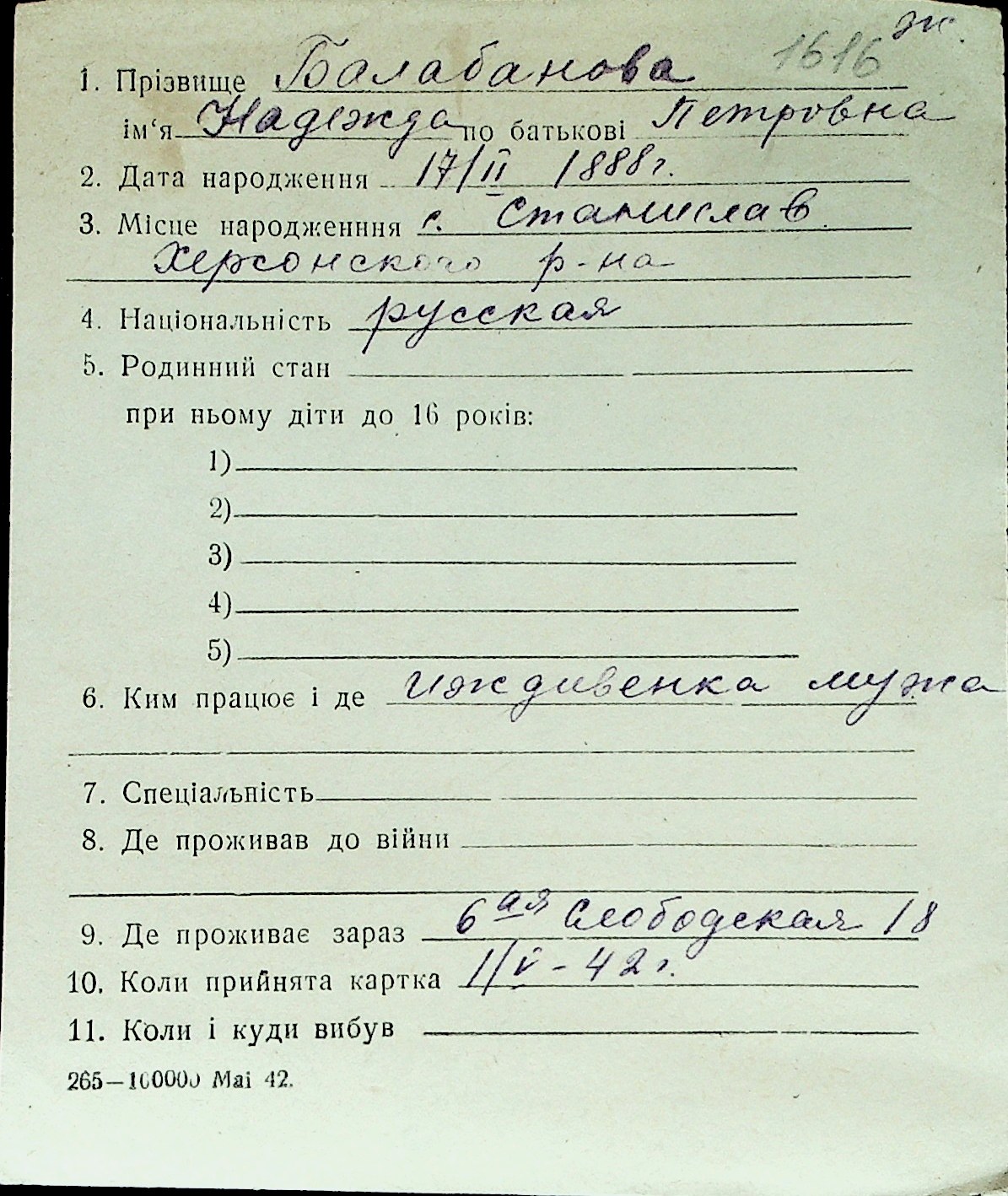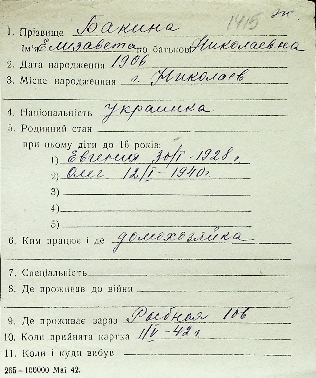 ◦ ◦ Перелік карток на осіб, які мешкали у м. Миколаїв у період окупації 1941–1944 років