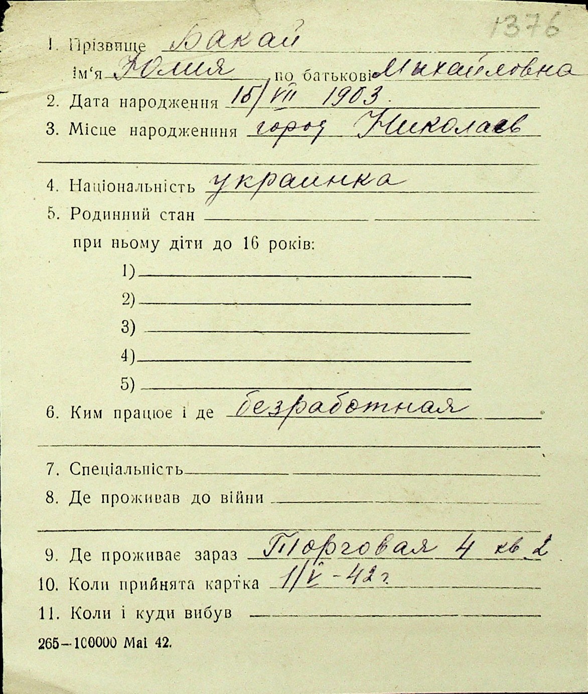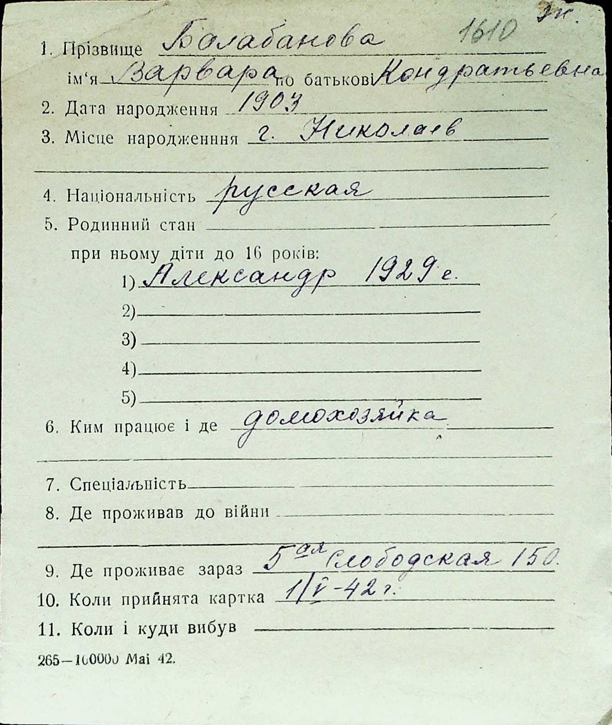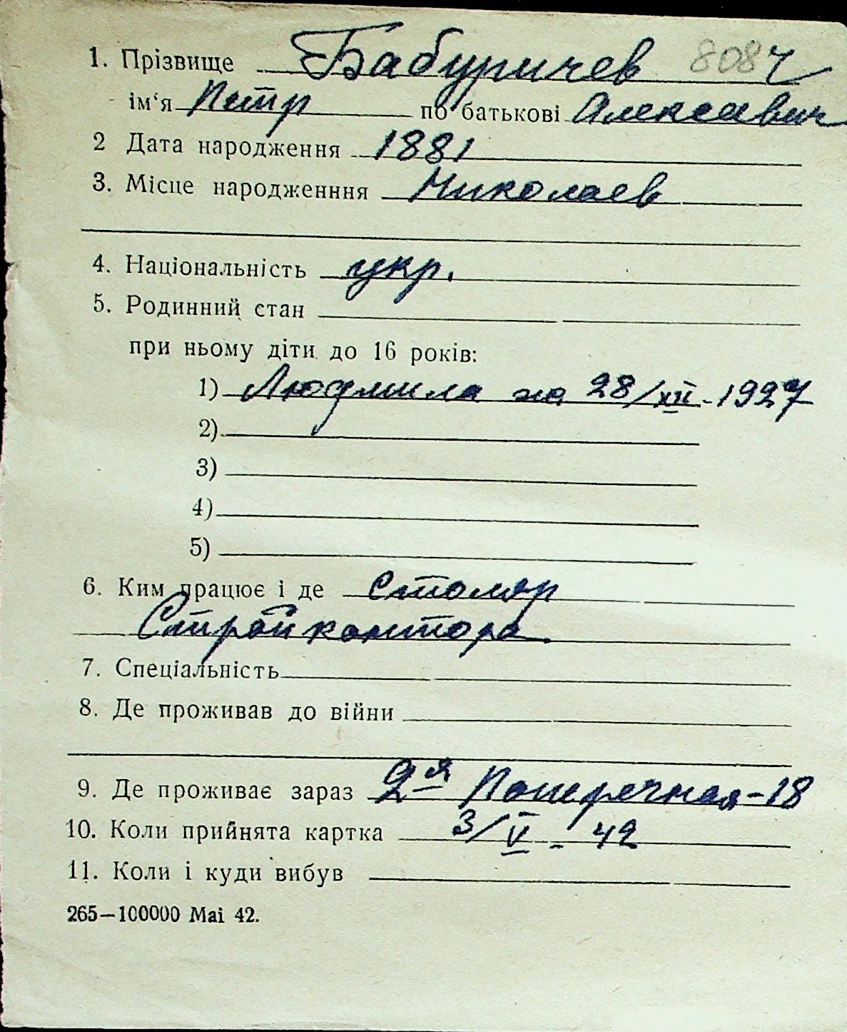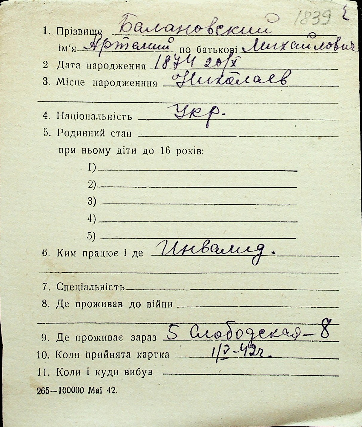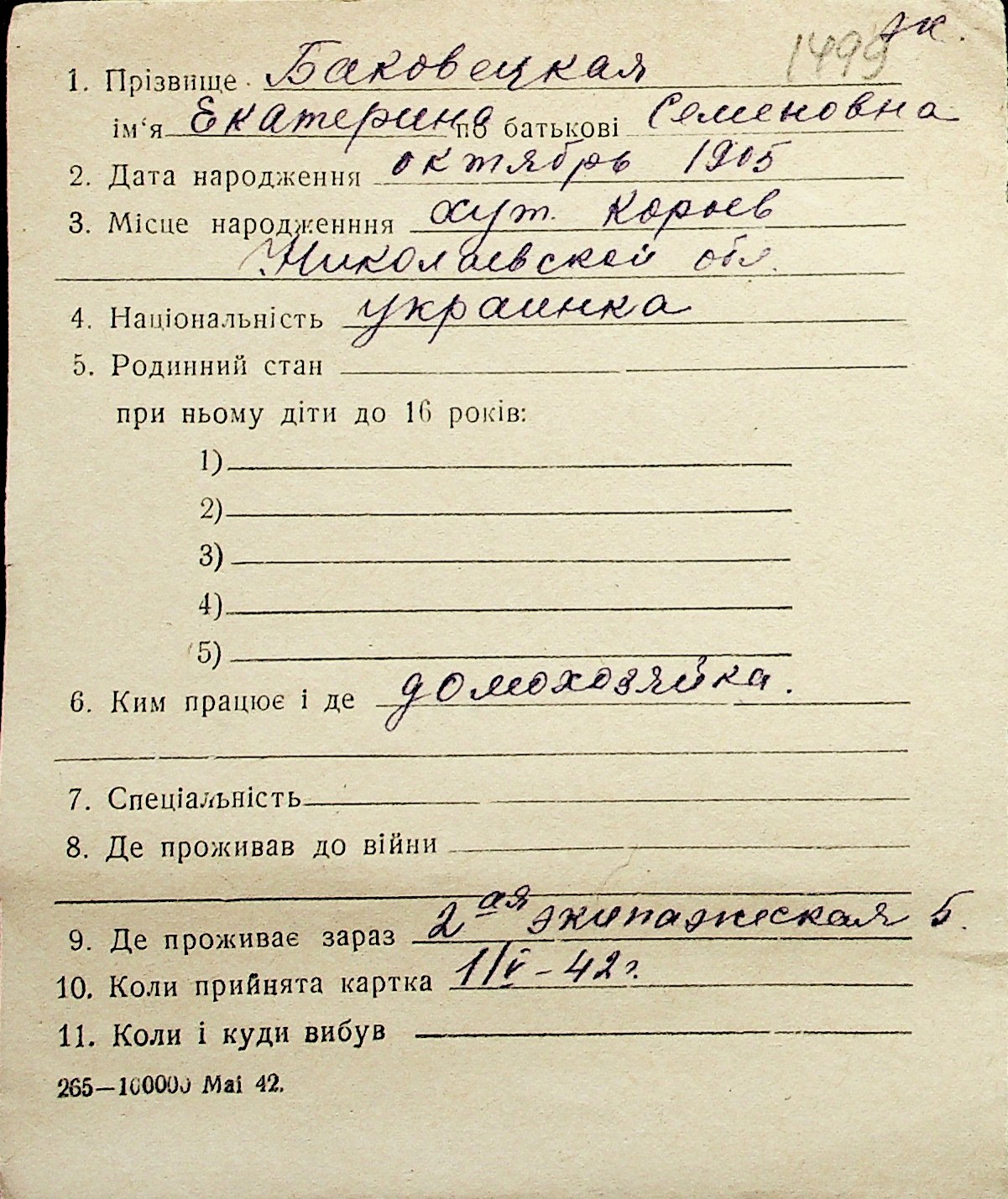 ◦ ◦ Перелік карток на осіб, які мешкали у м. Миколаїв у період окупації 1941–1944 років