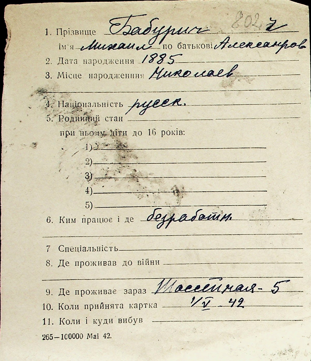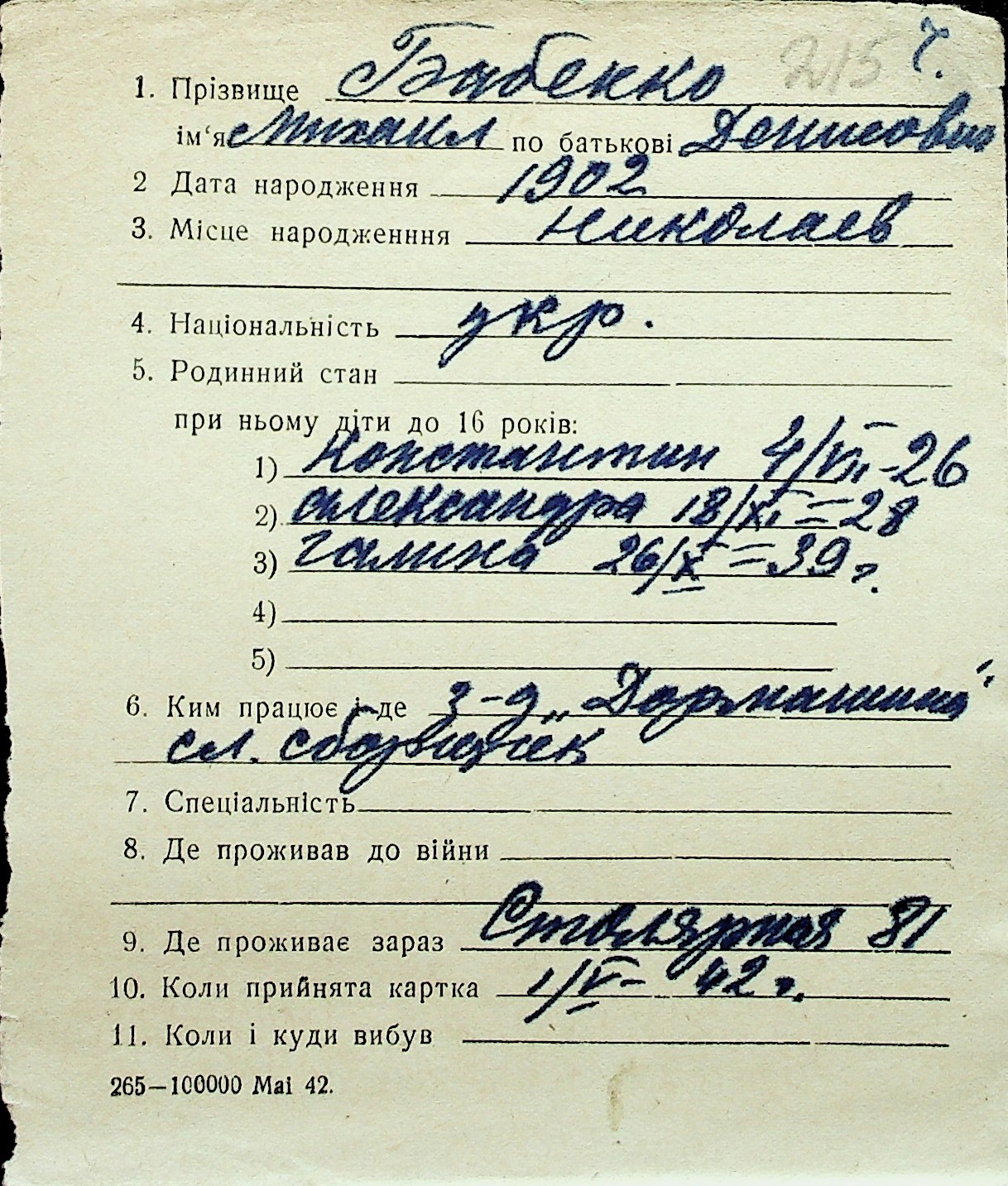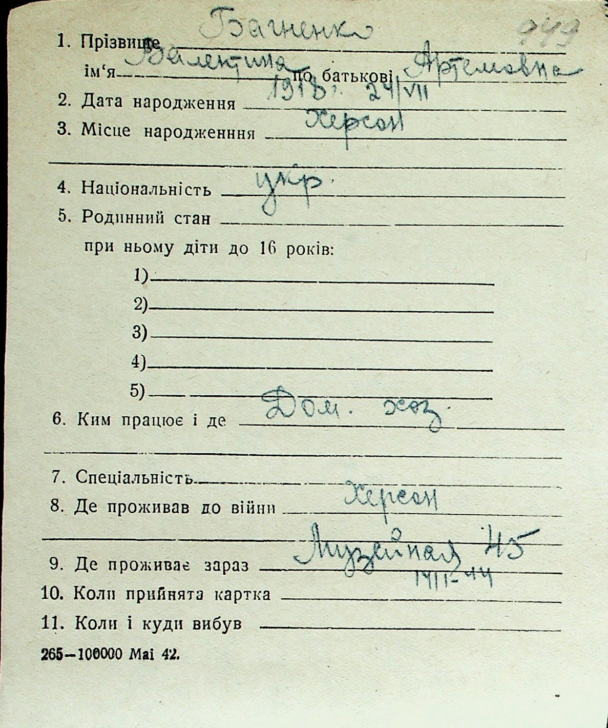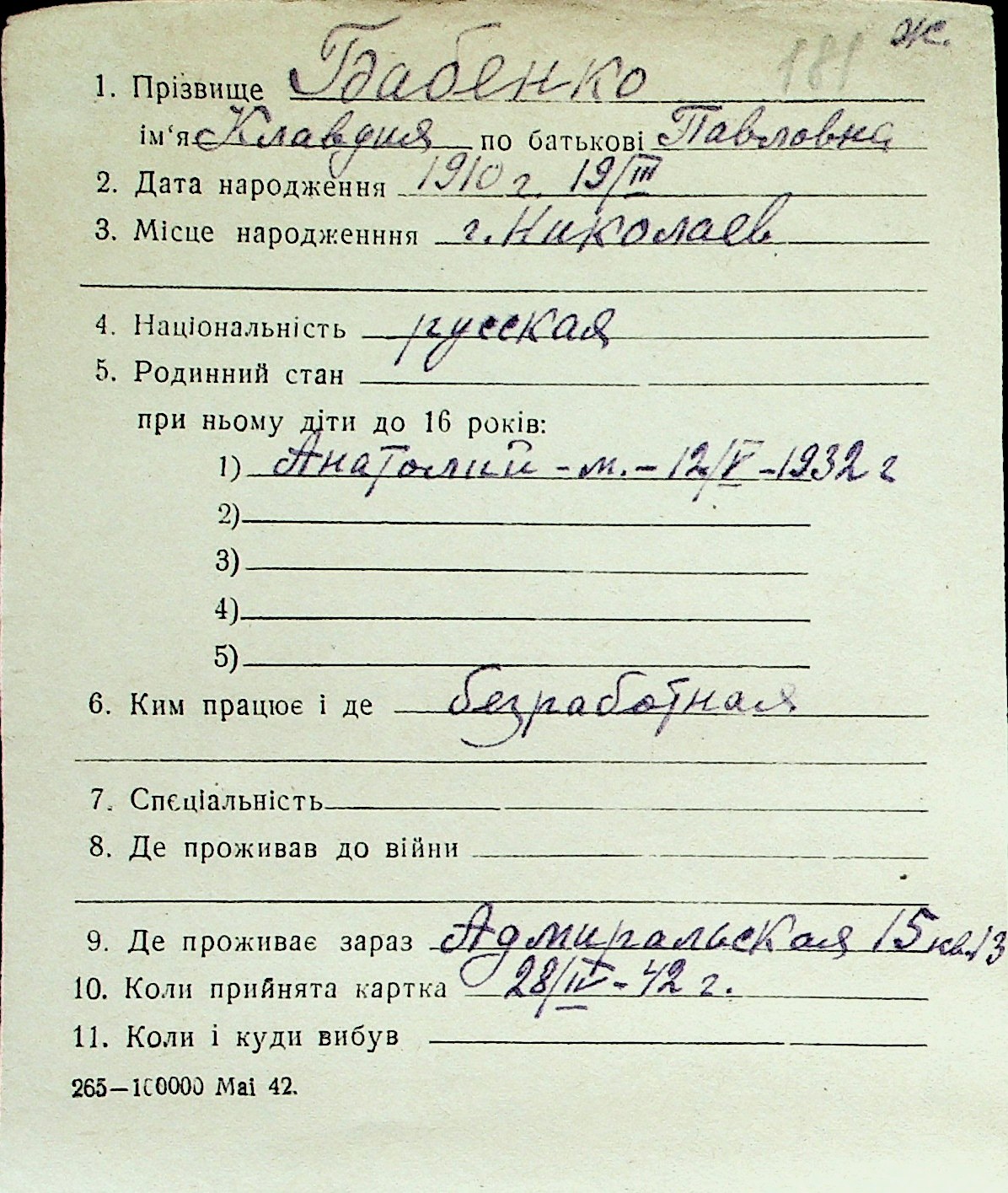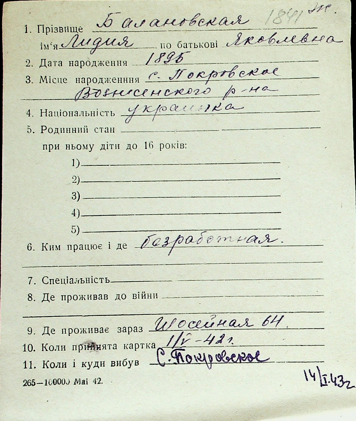 ◦ ◦ Перелік карток на осіб, які мешкали у м. Миколаїв у період окупації 1941–1944 років