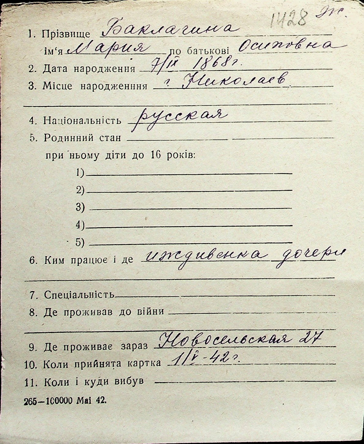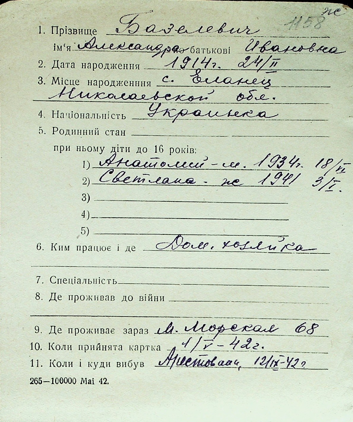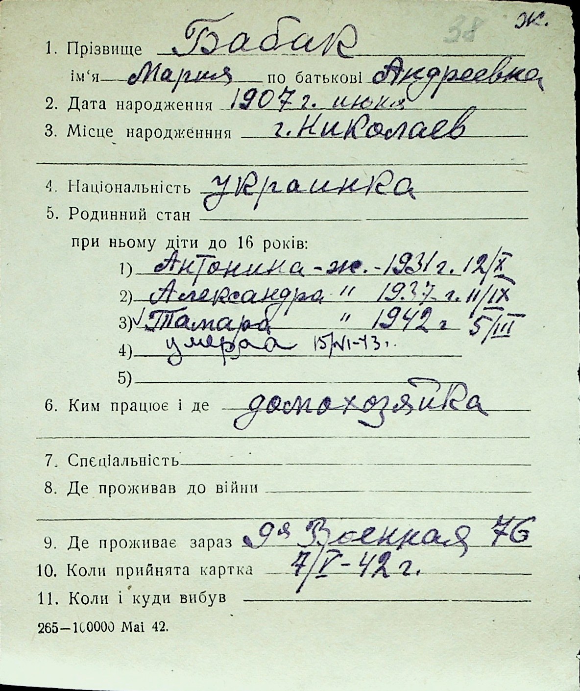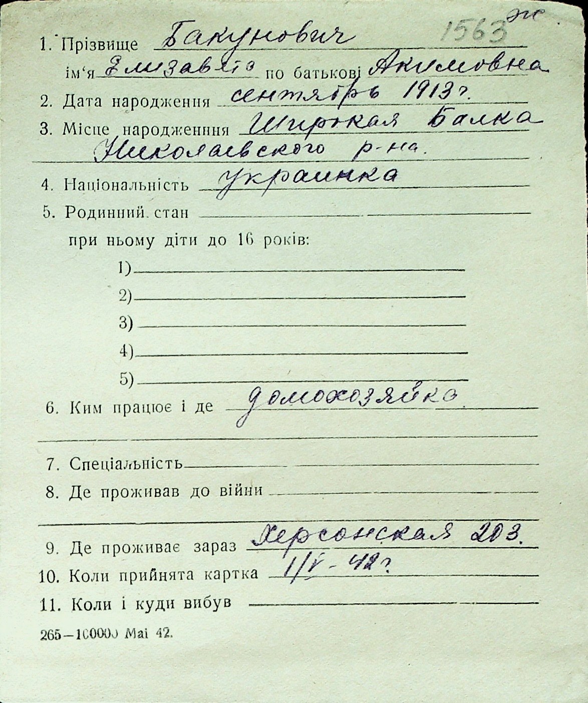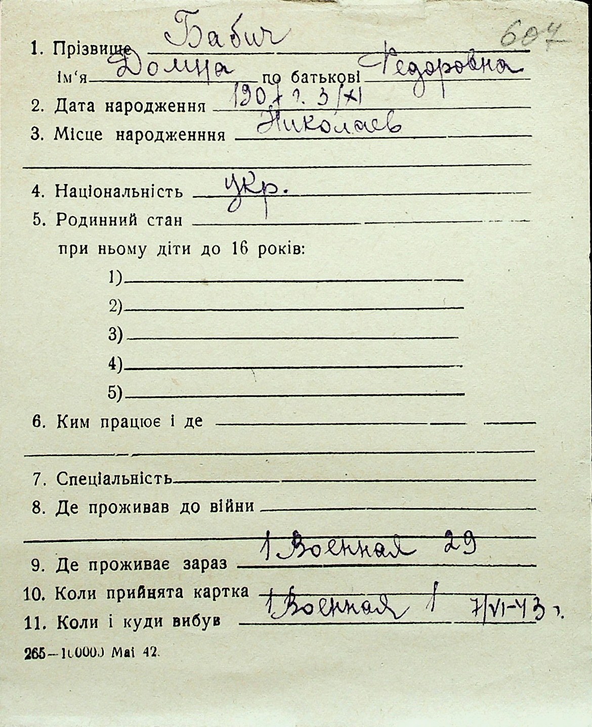 ◦ ◦ Перелік карток на осіб, які мешкали у м. Миколаїв у період окупації 1941–1944 років