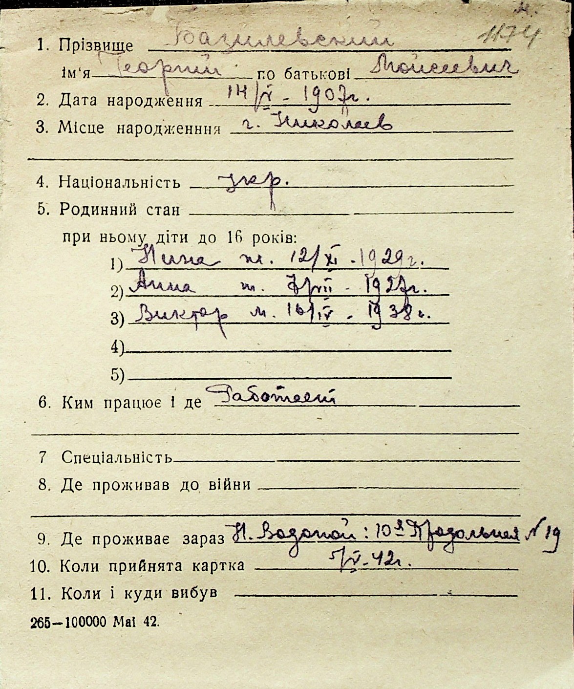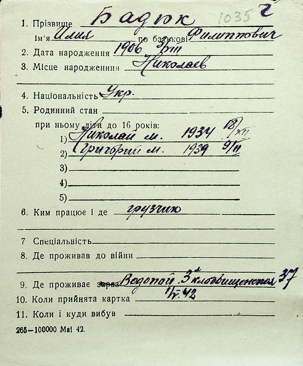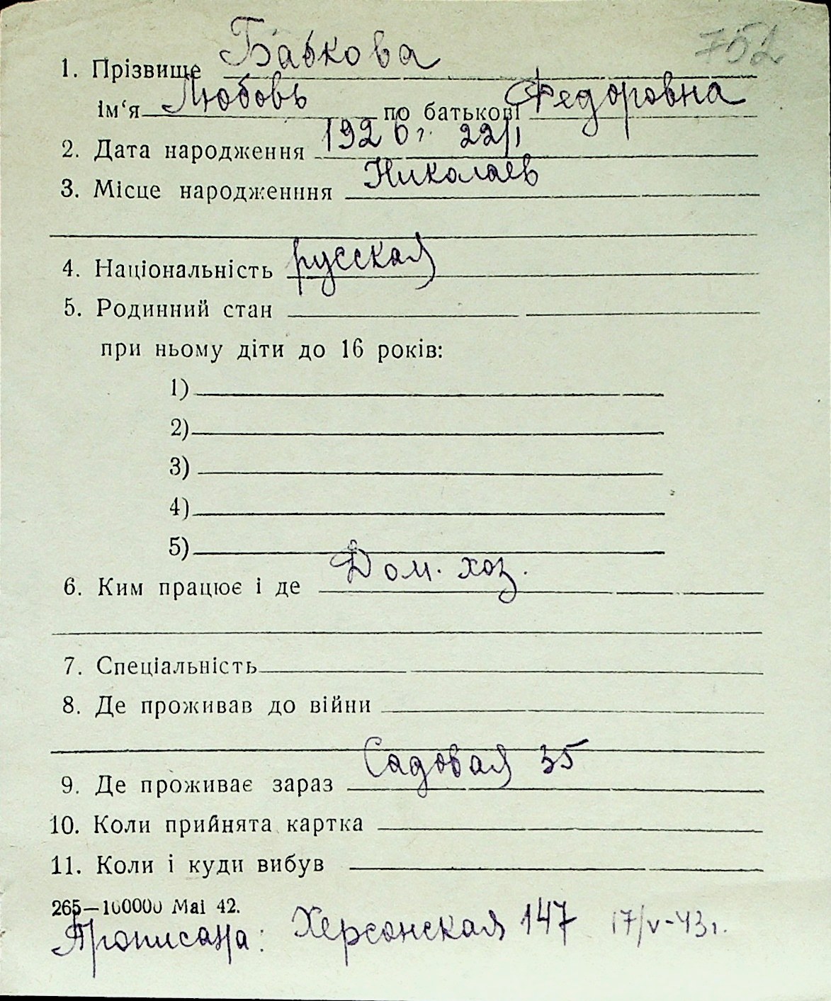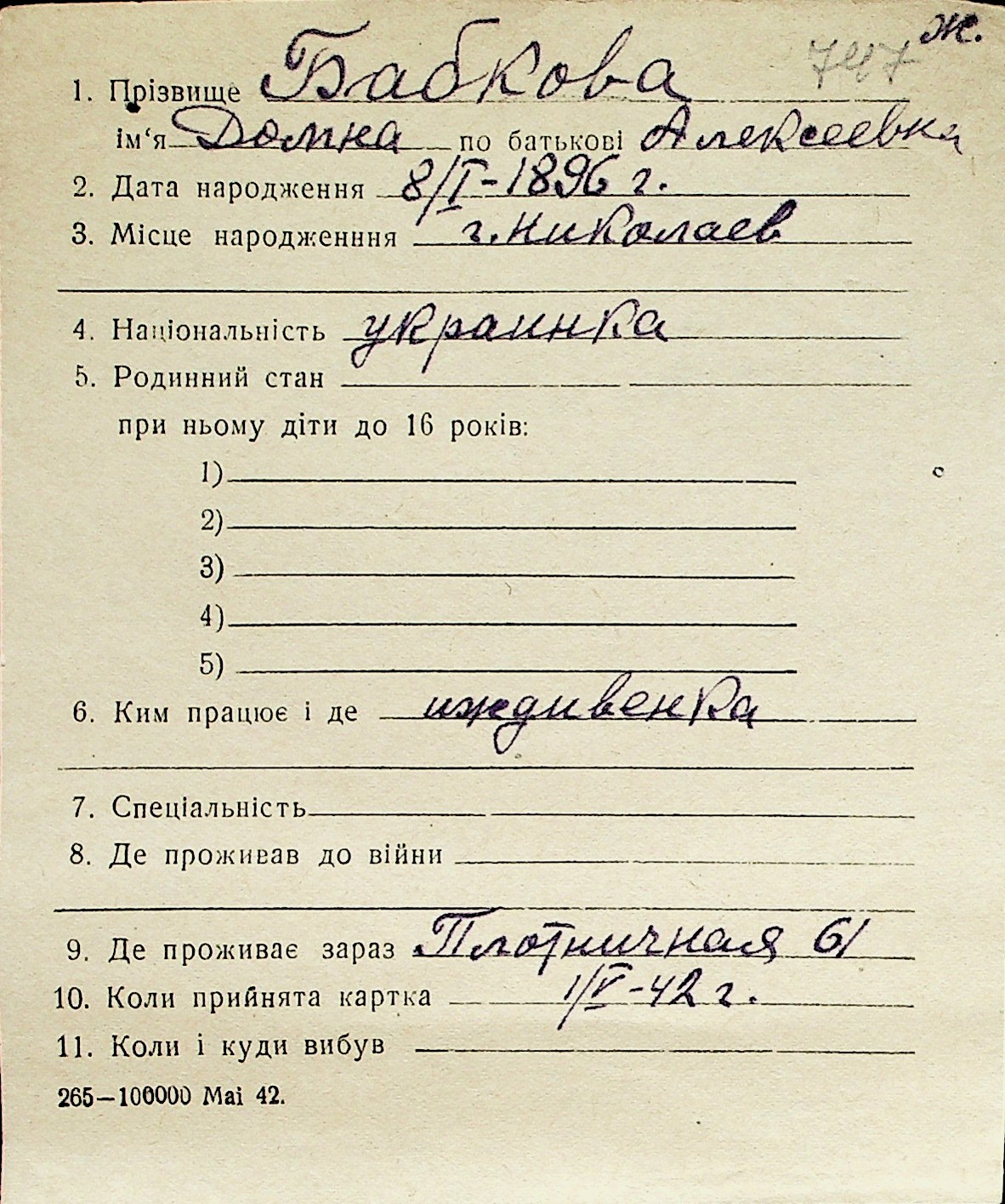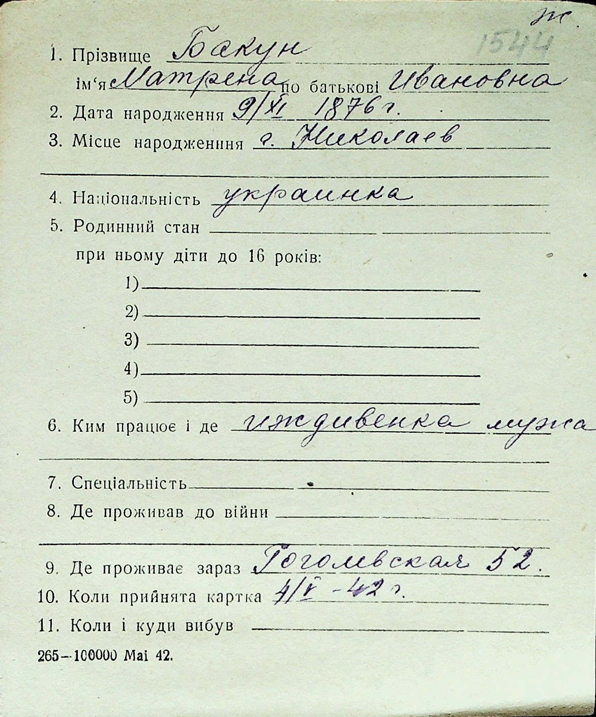 ◦ ◦ Перелік карток на осіб, які мешкали у м. Миколаїв у період окупації 1941–1944 років