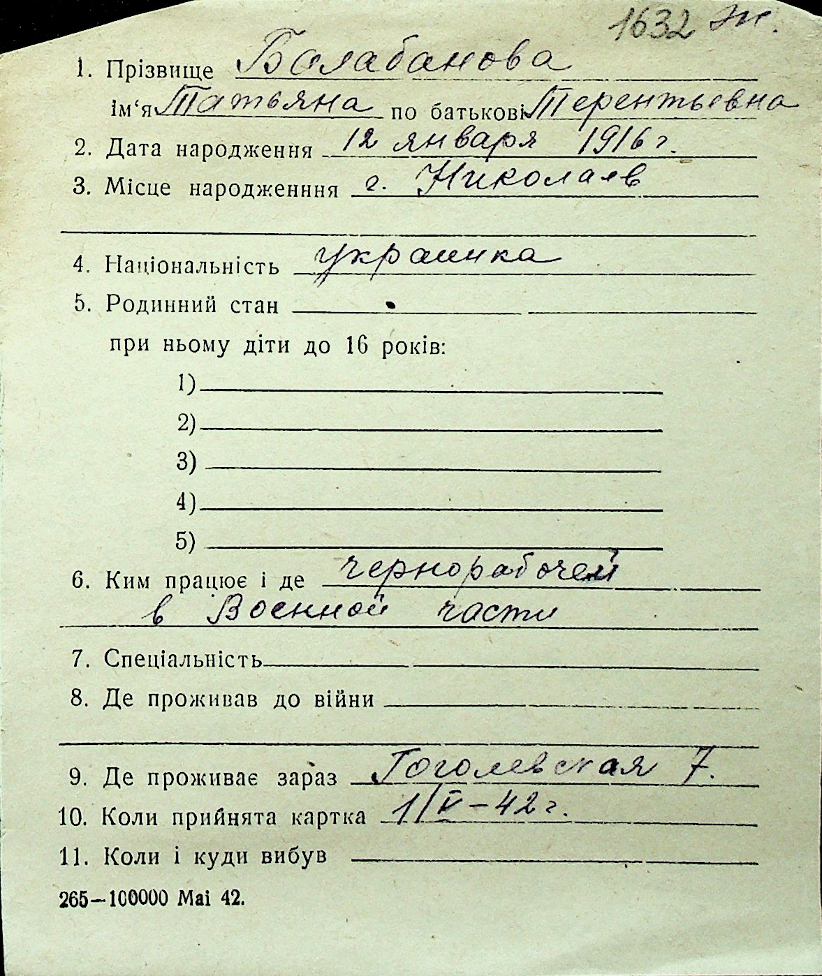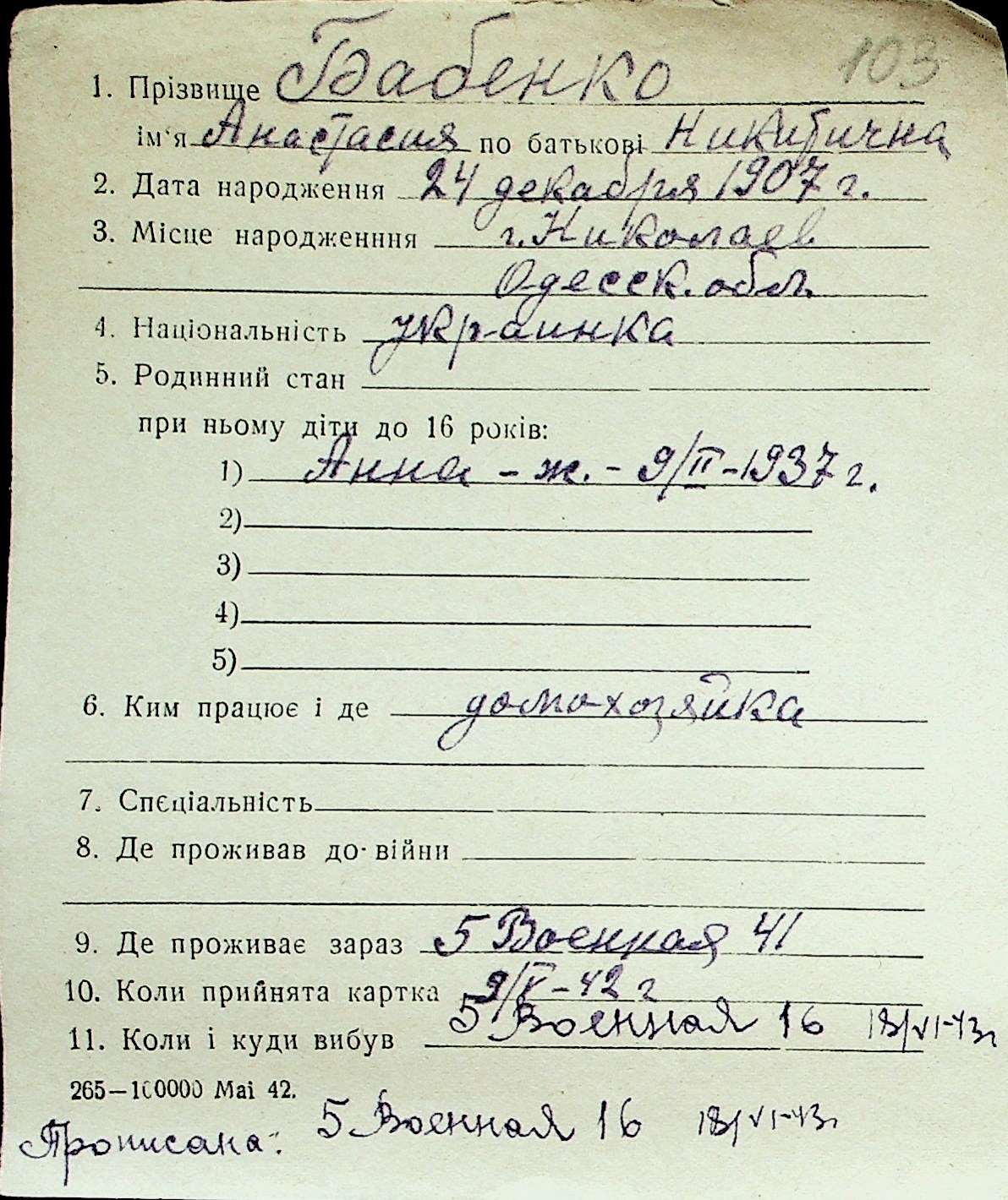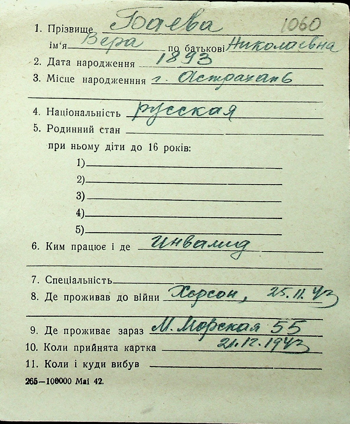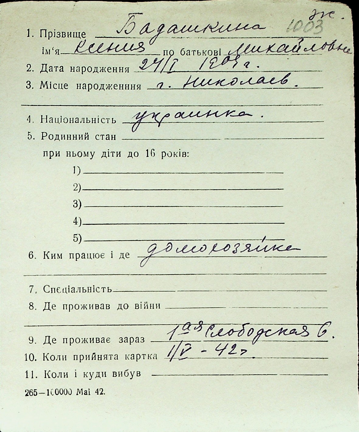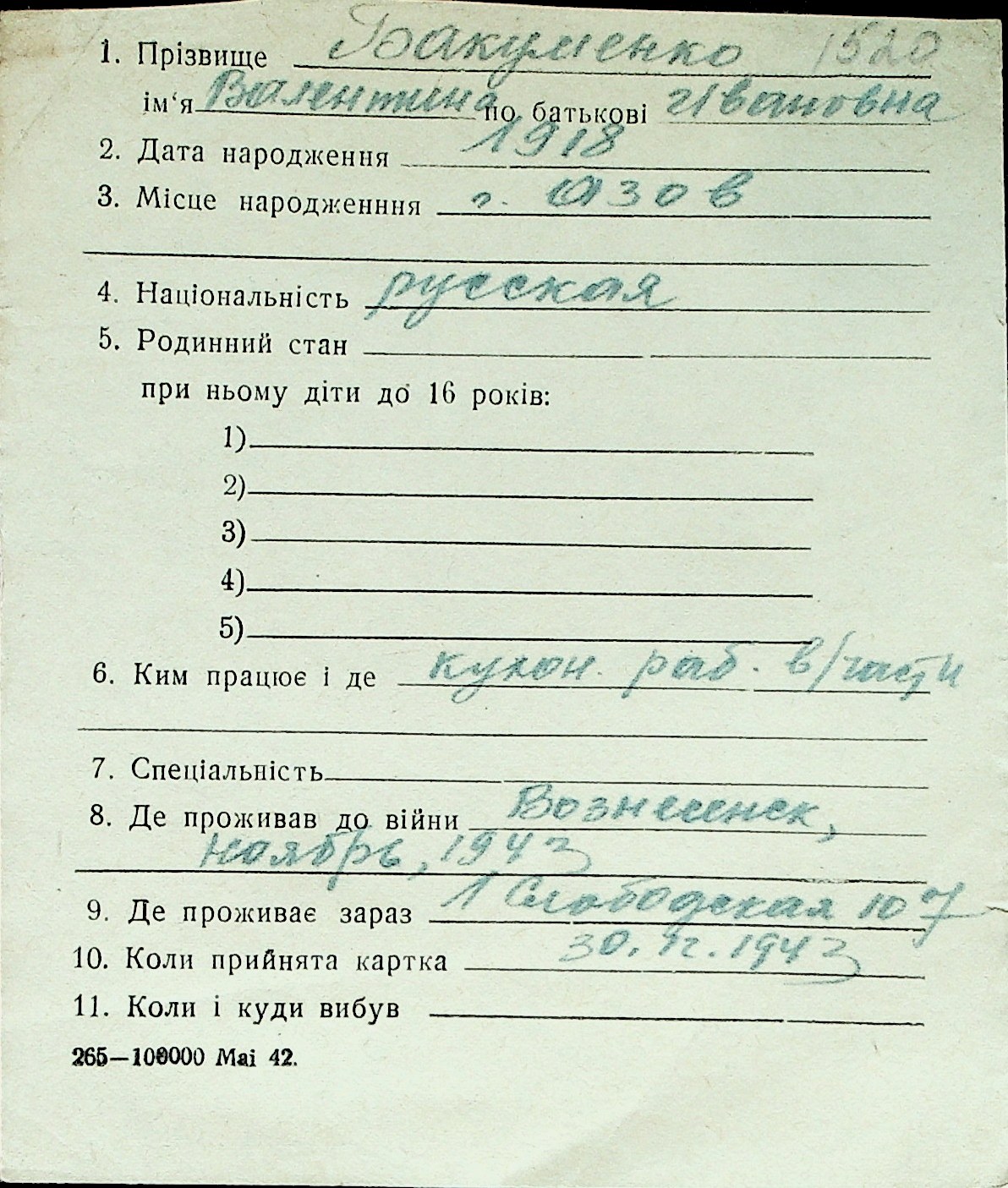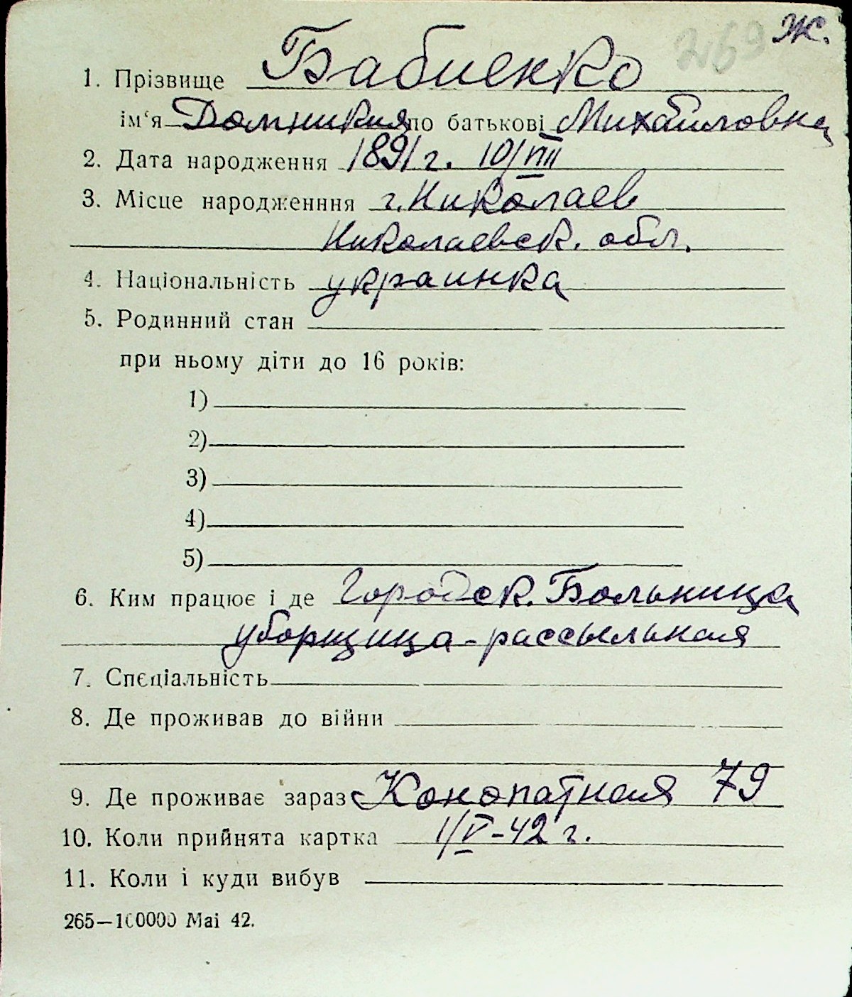 ◦ ◦ Перелік карток на осіб, які мешкали у м. Миколаїв у період окупації 1941–1944 років