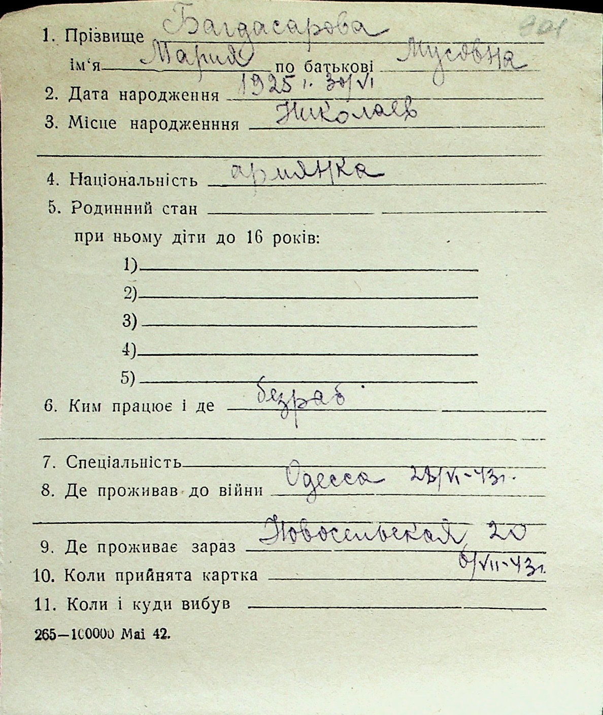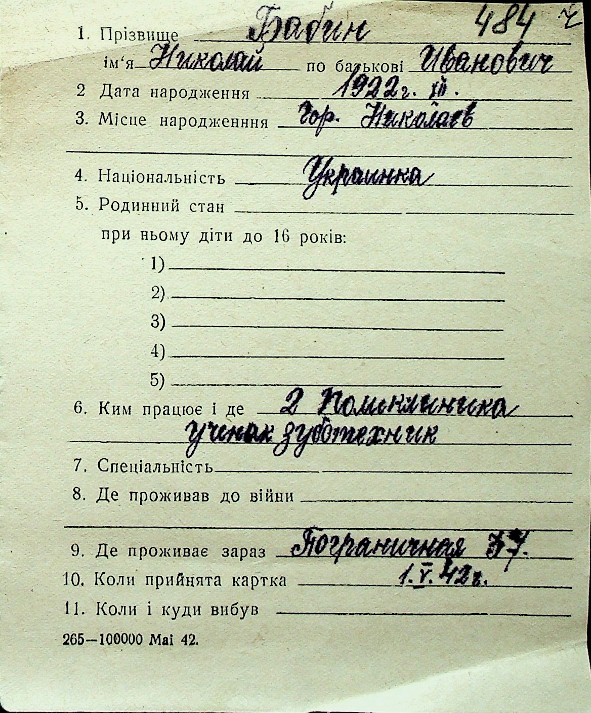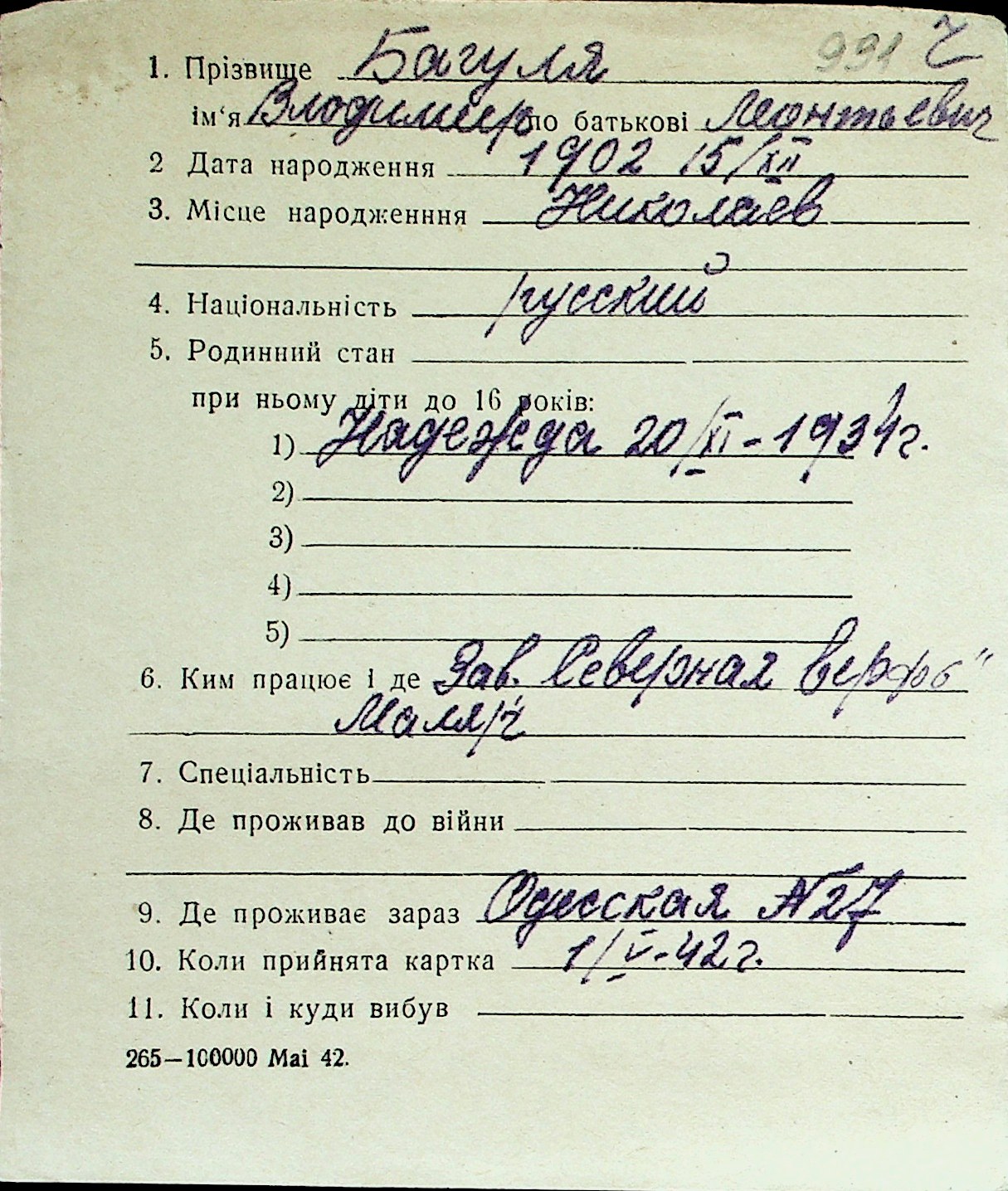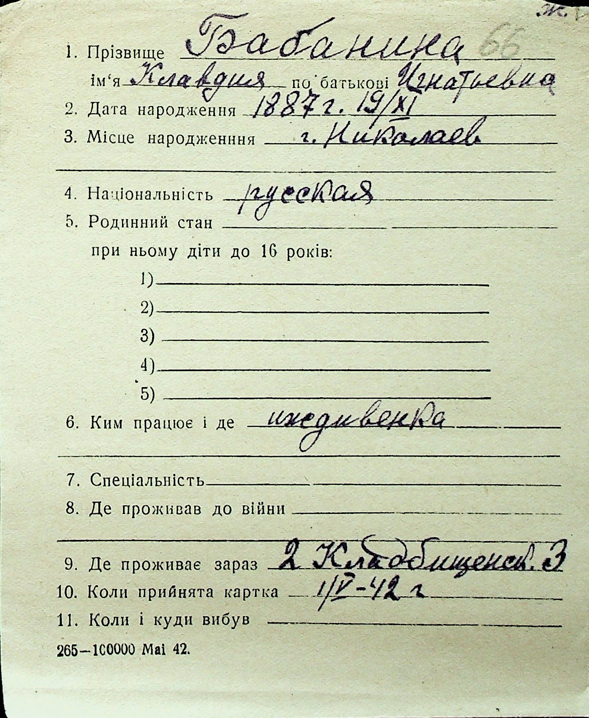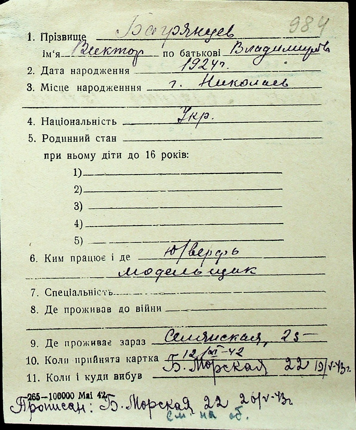 ◦ ◦ Перелік карток на осіб, які мешкали у м. Миколаїв у період окупації 1941–1944 років