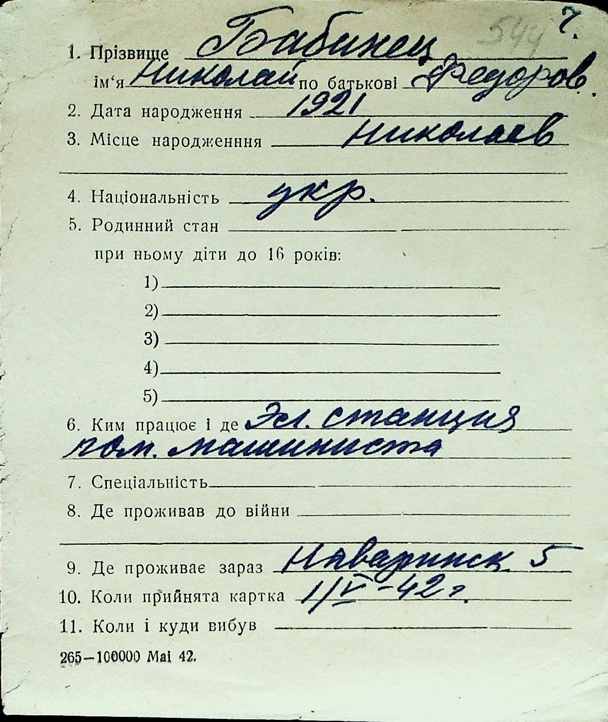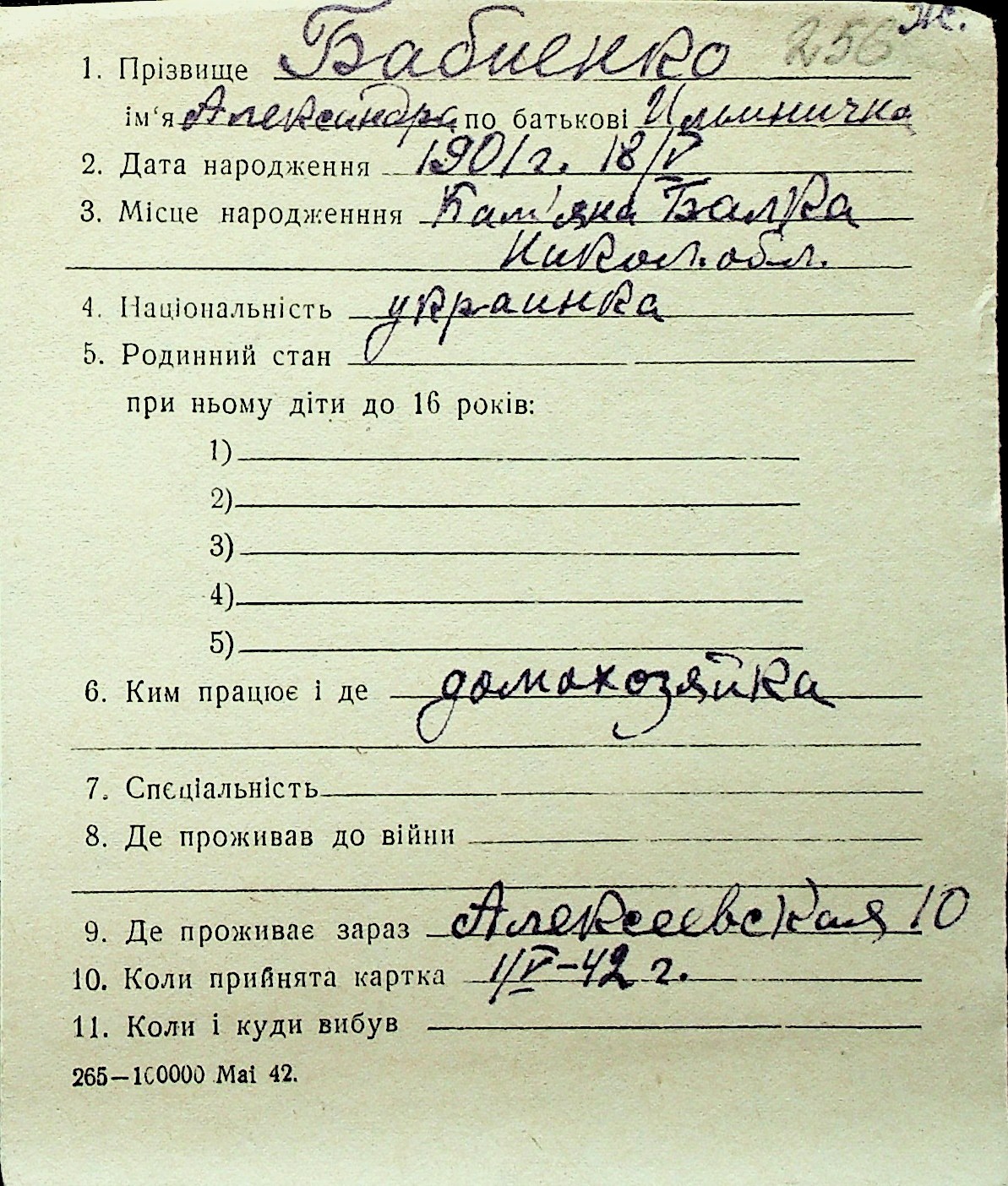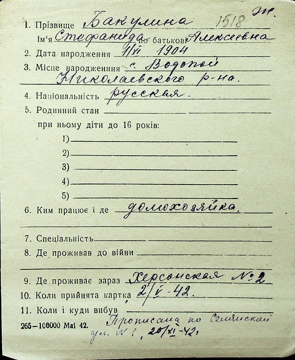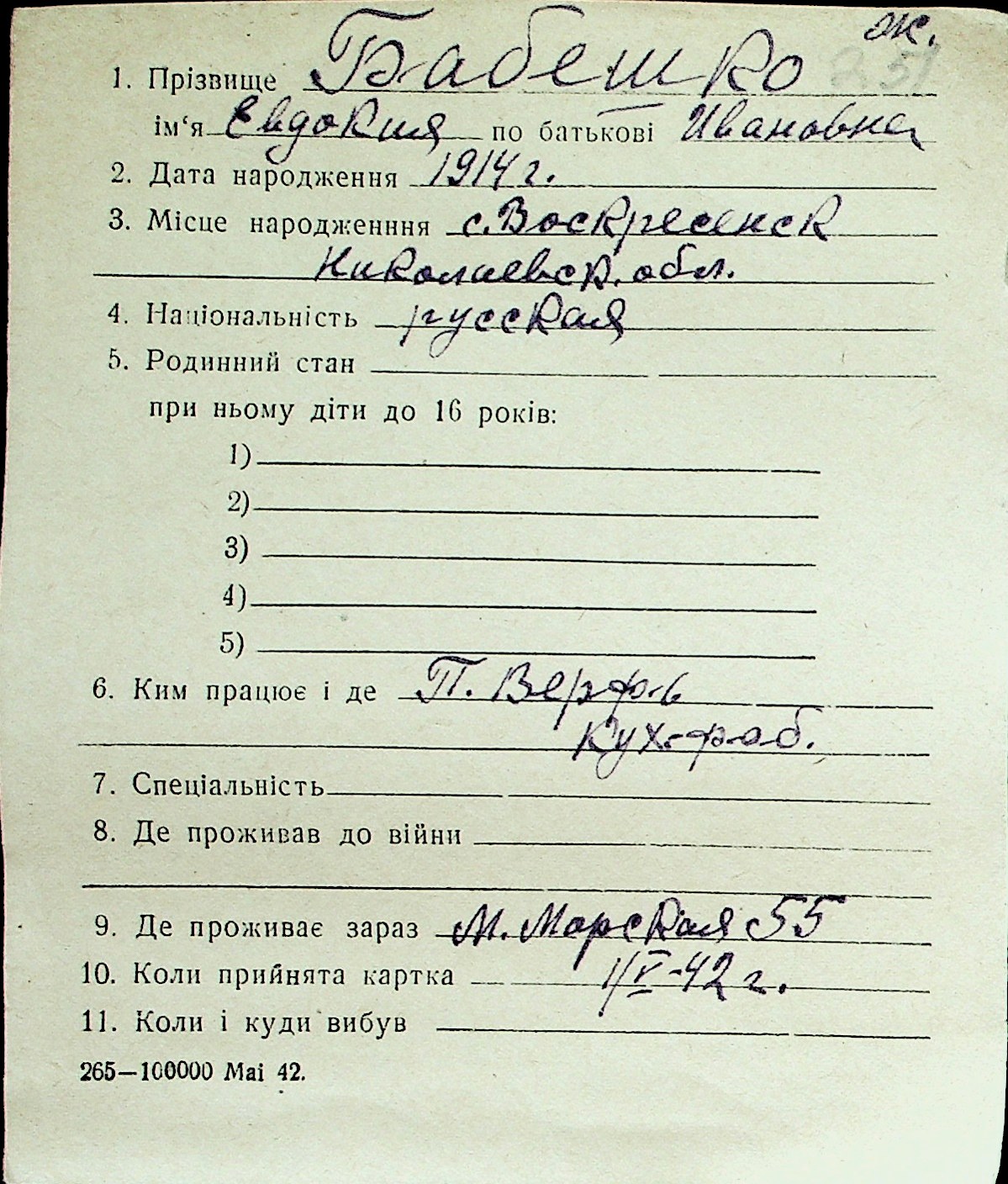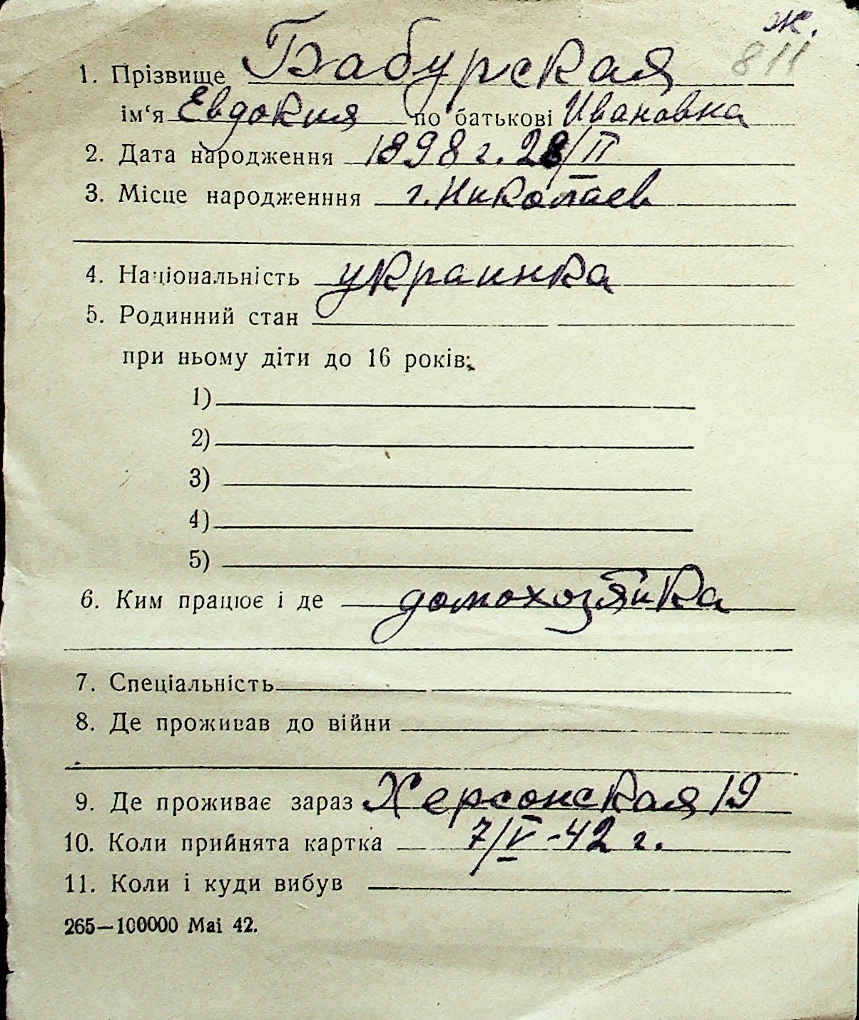 ◦ ◦ Перелік карток на осіб, які мешкали у м. Миколаїв у період окупації 1941–1944 років