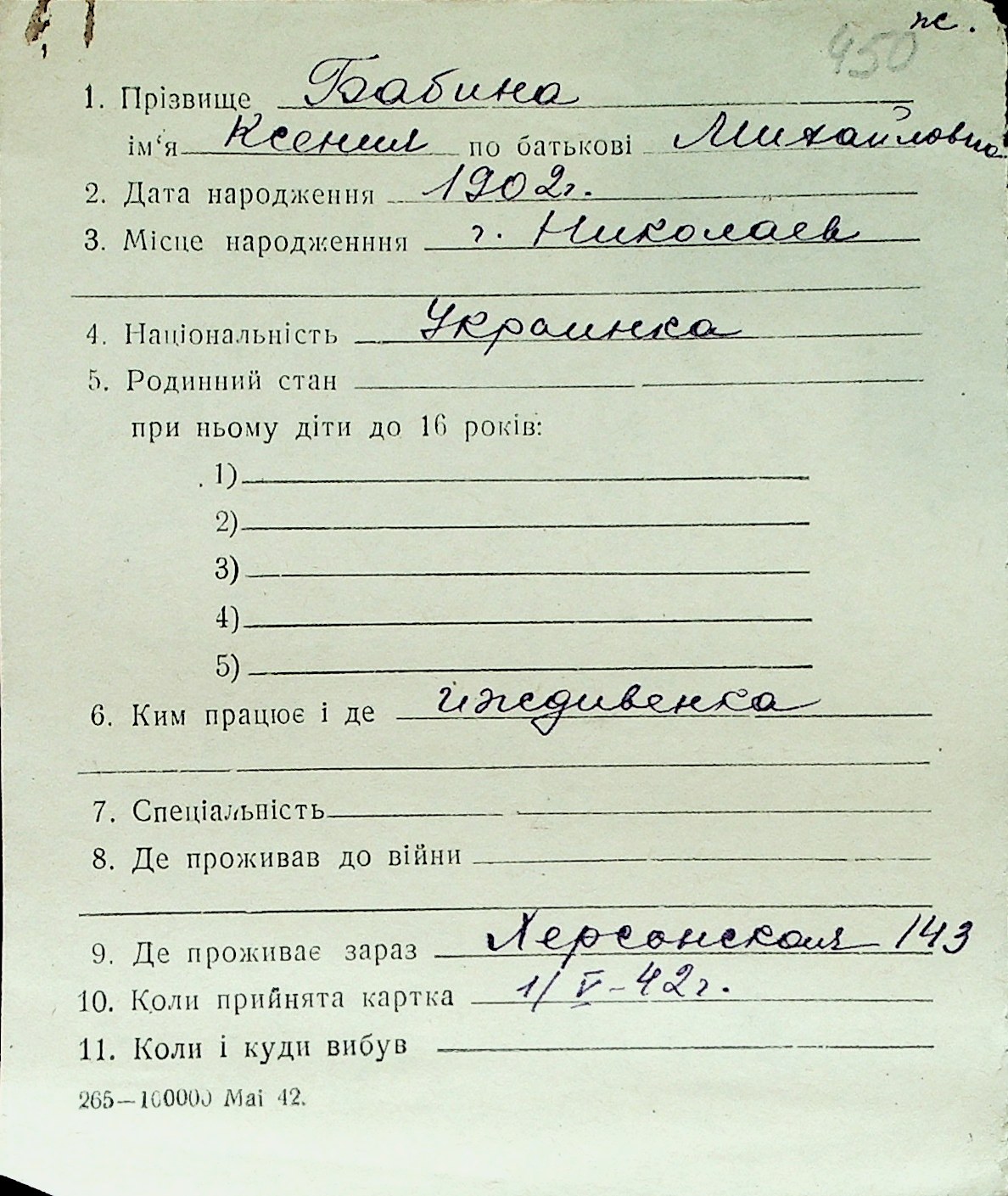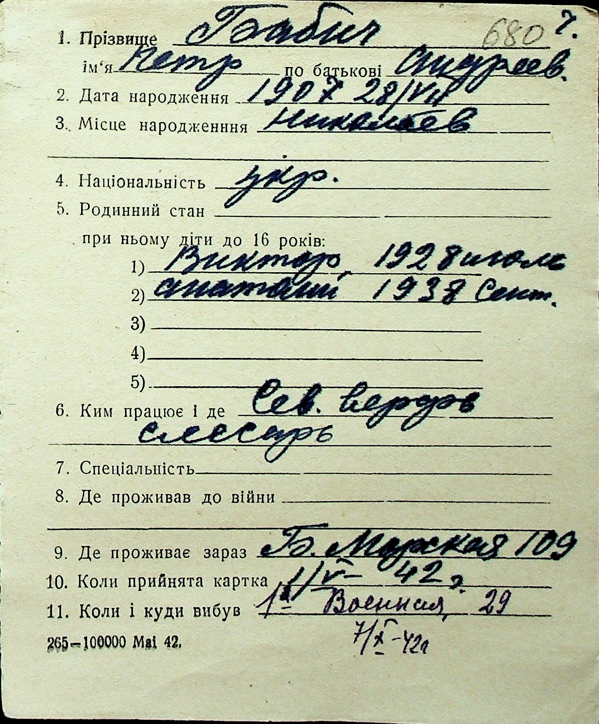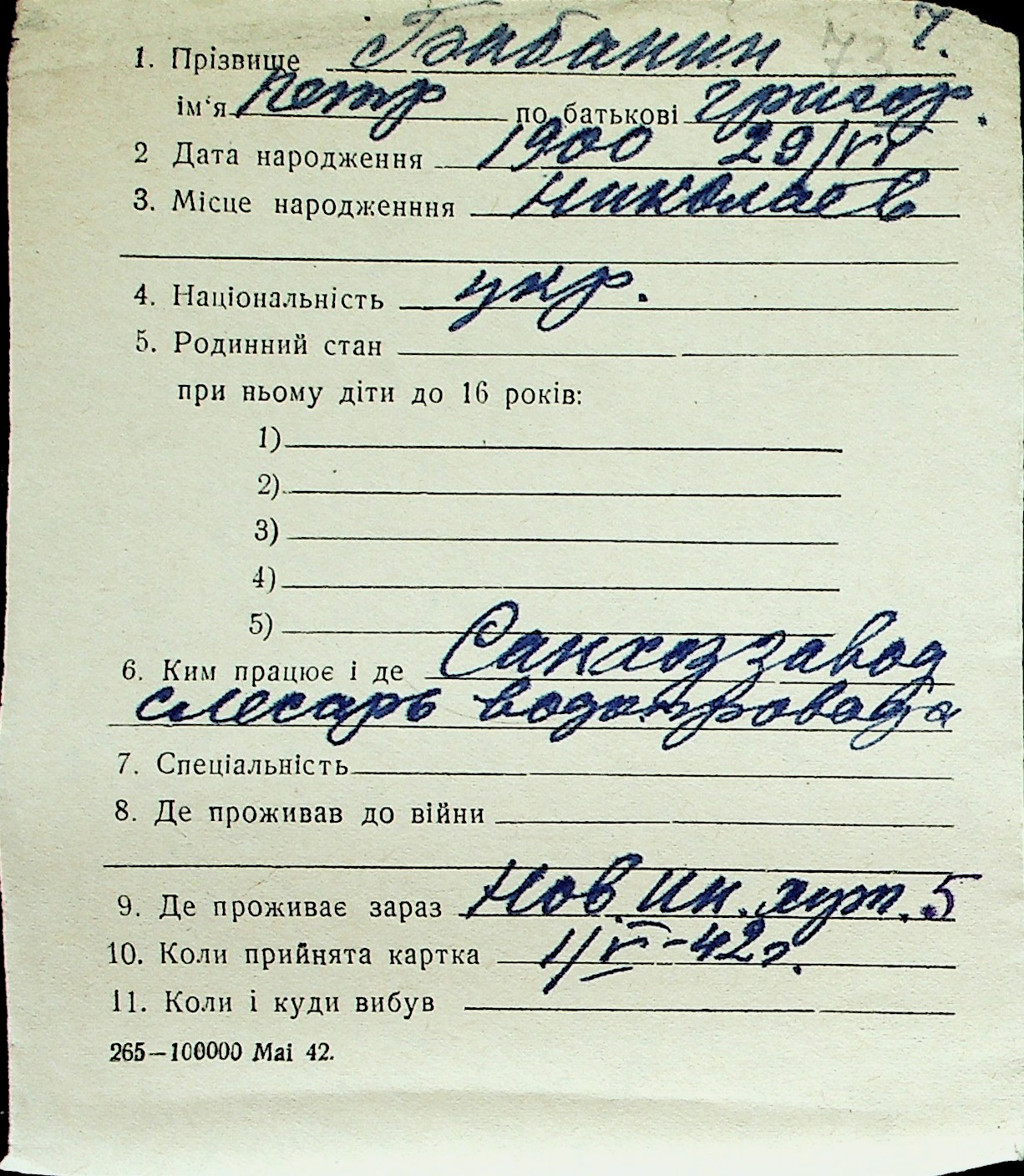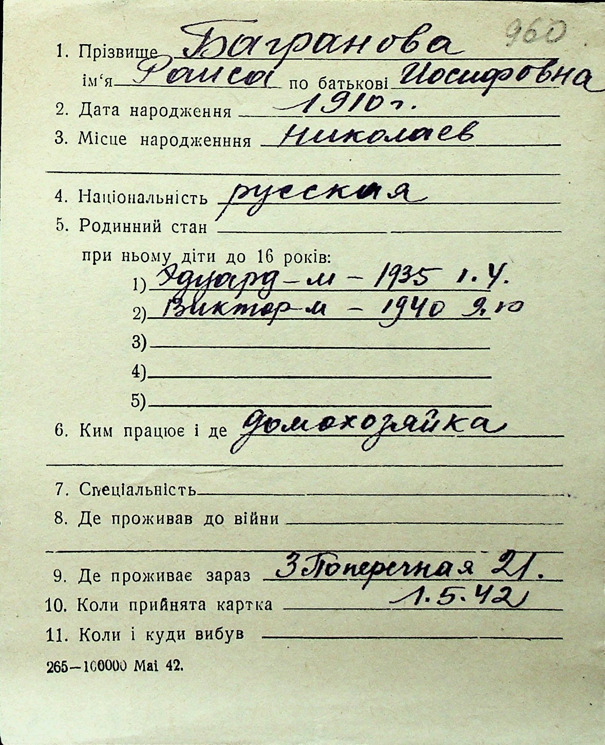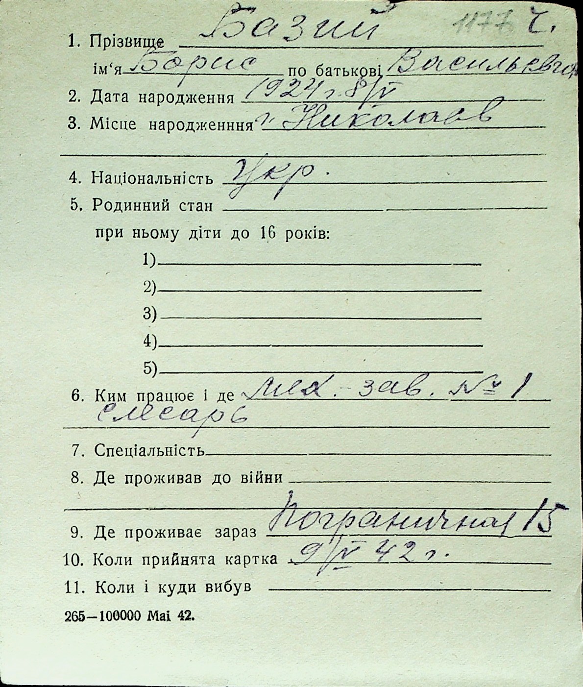 ◦ ◦ Перелік карток на осіб, які мешкали у м. Миколаїв у період окупації 1941–1944 років