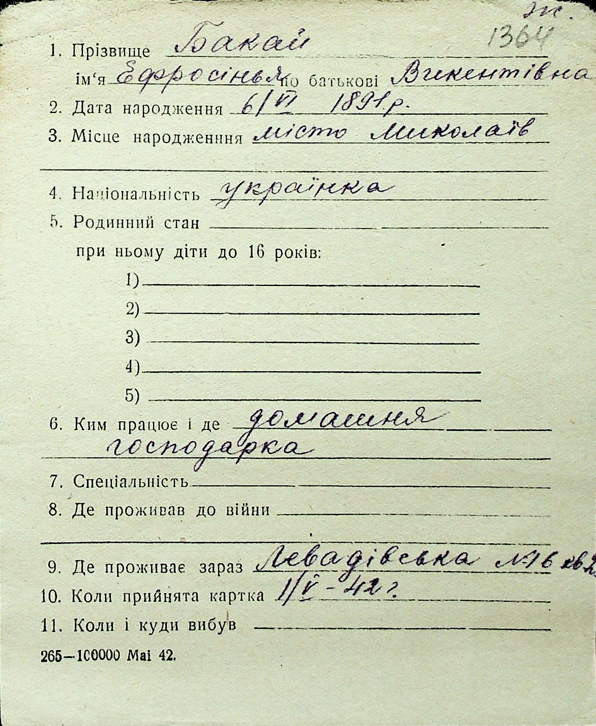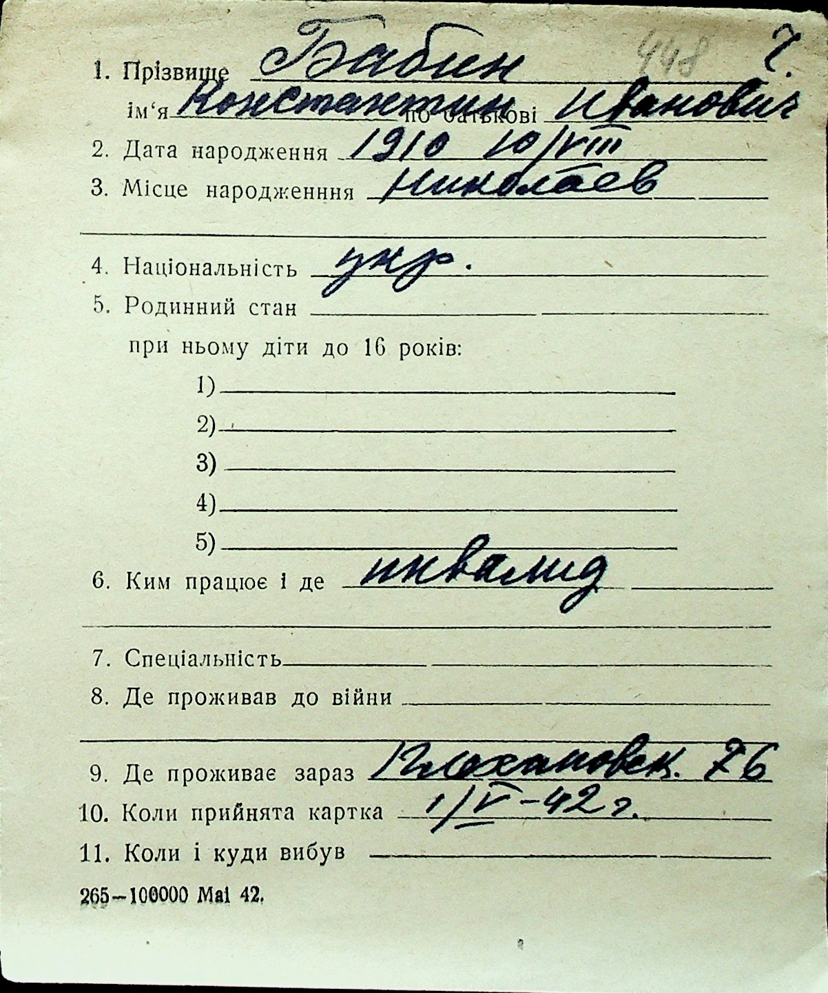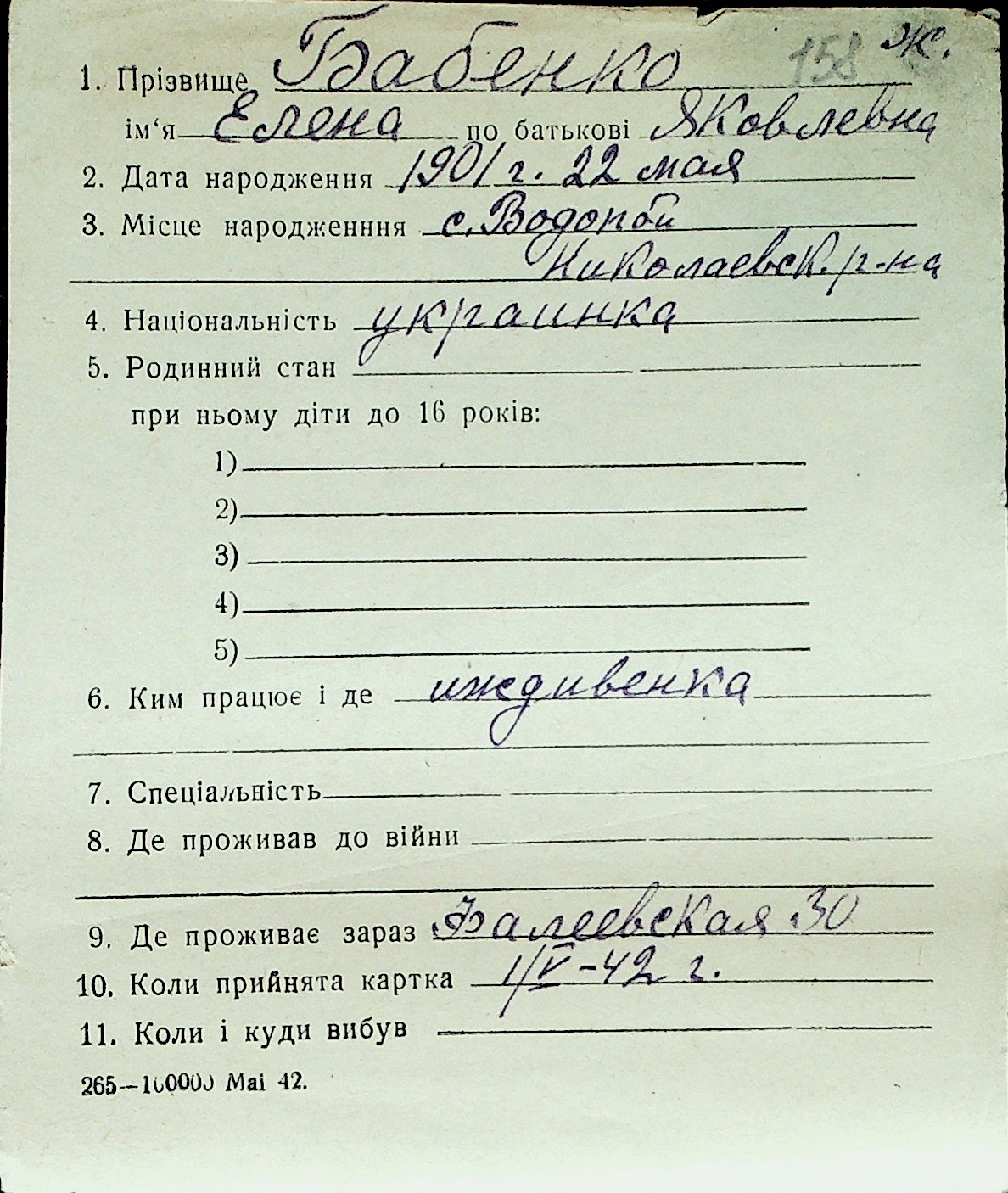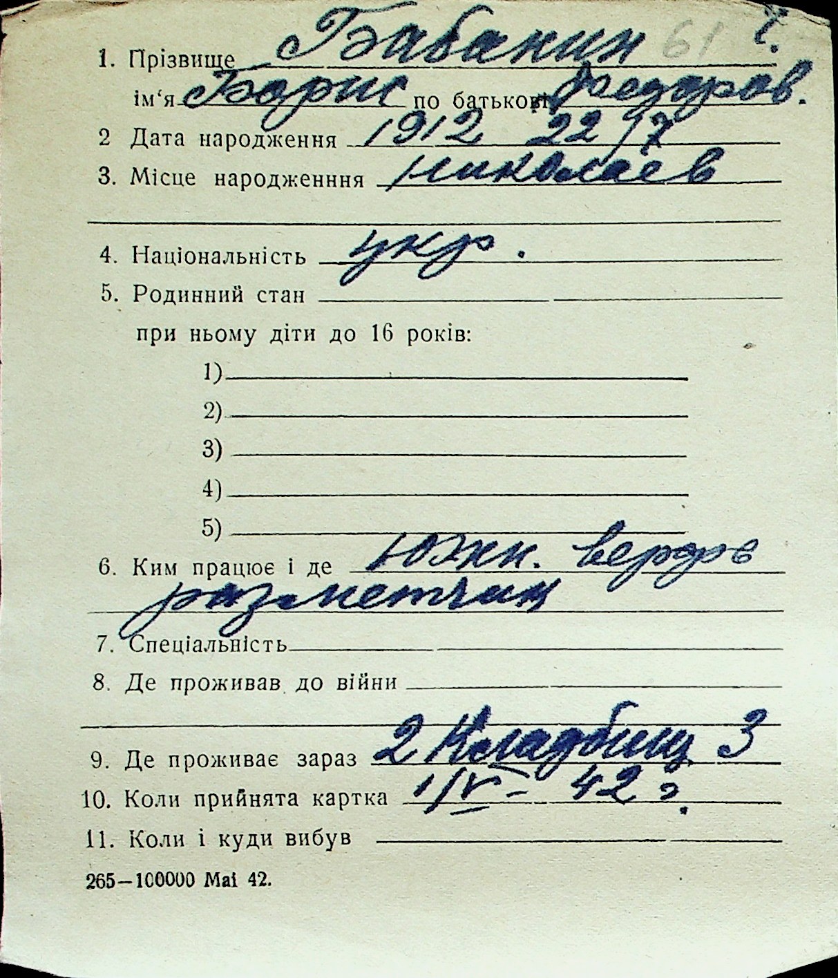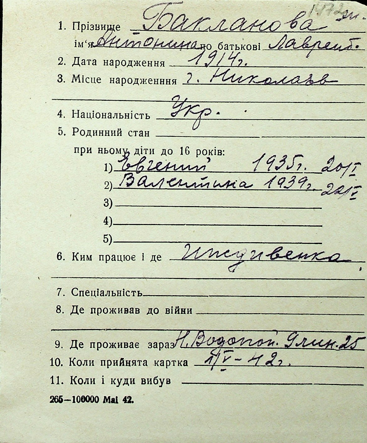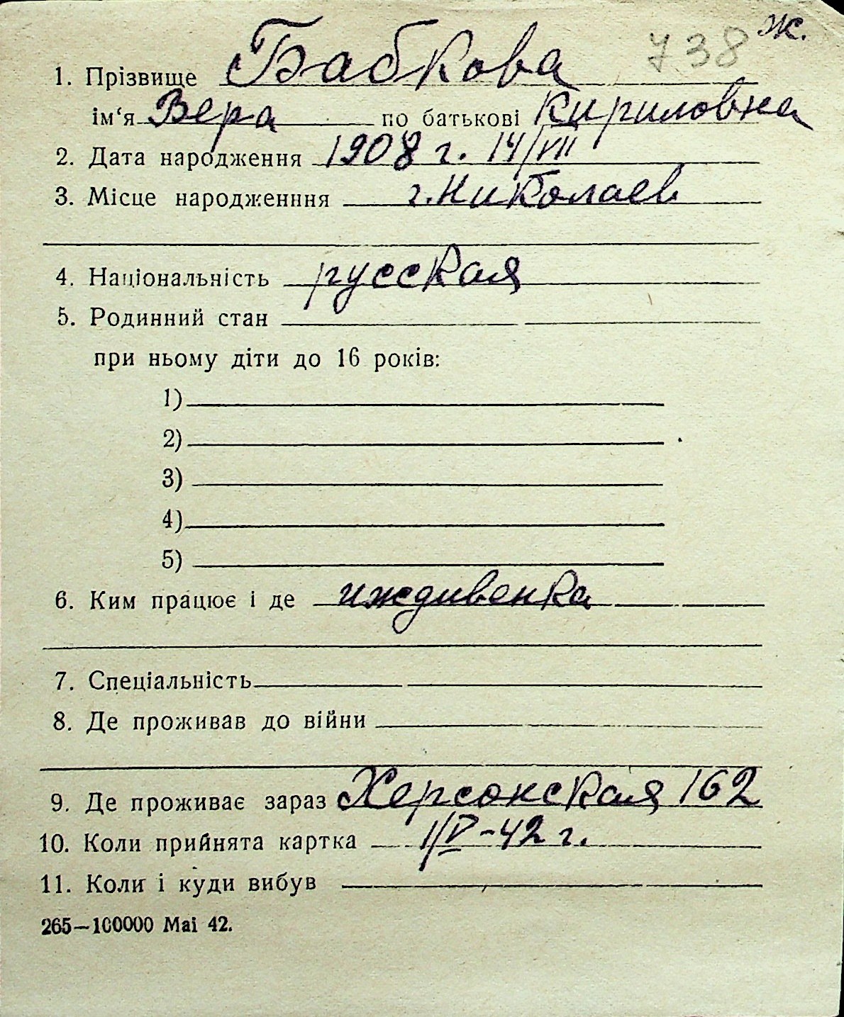 ◦ ◦ Перелік карток на осіб, які мешкали у м. Миколаїв у період окупації 1941–1944 років
