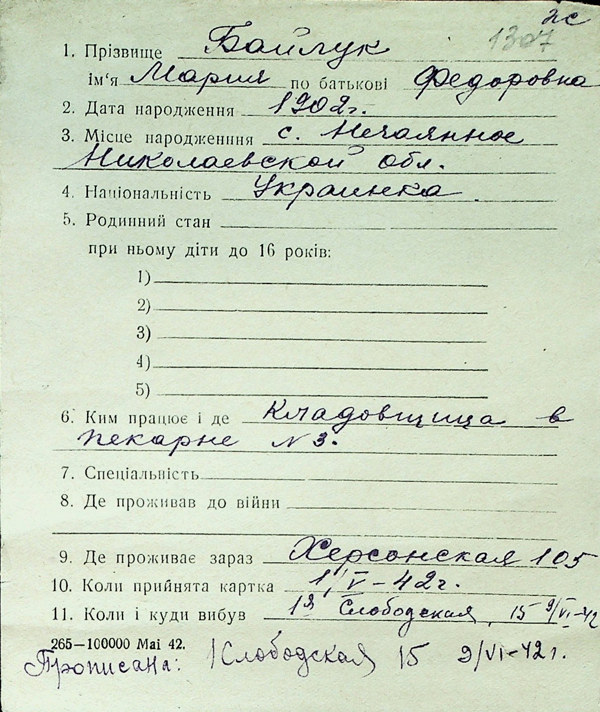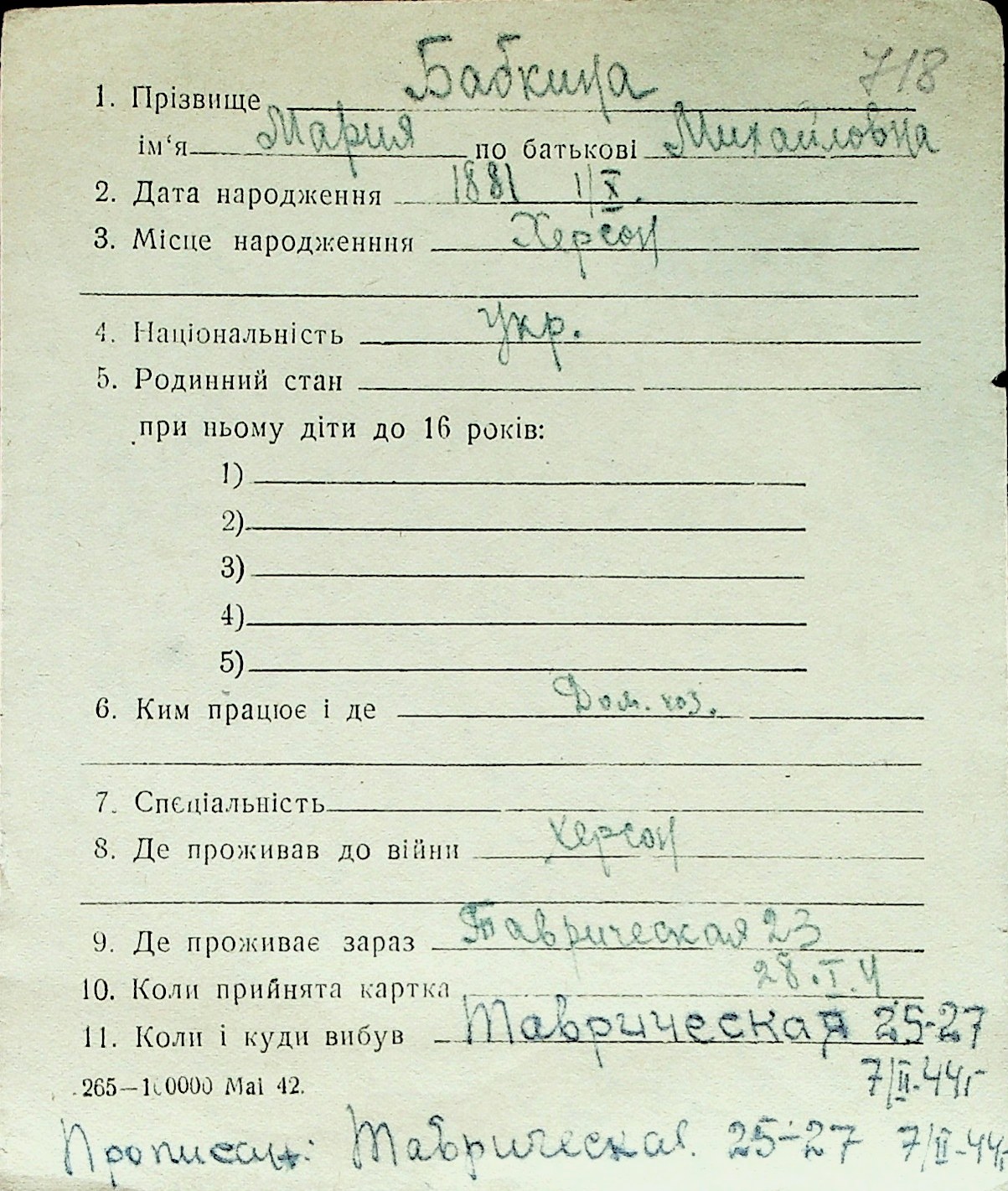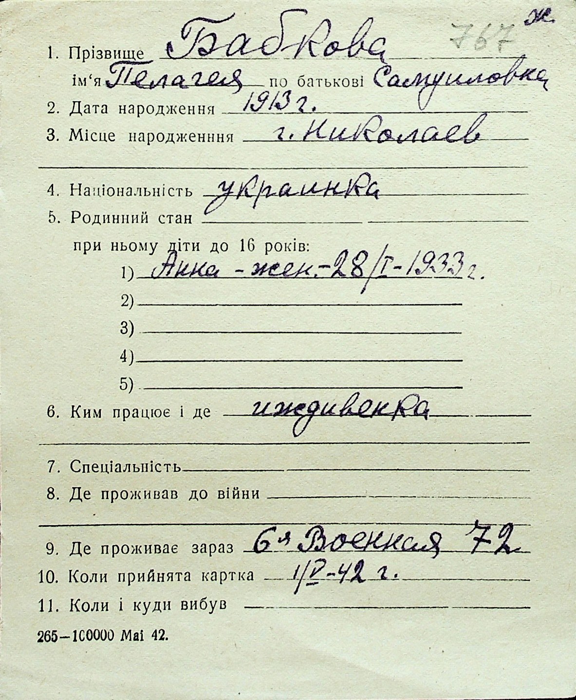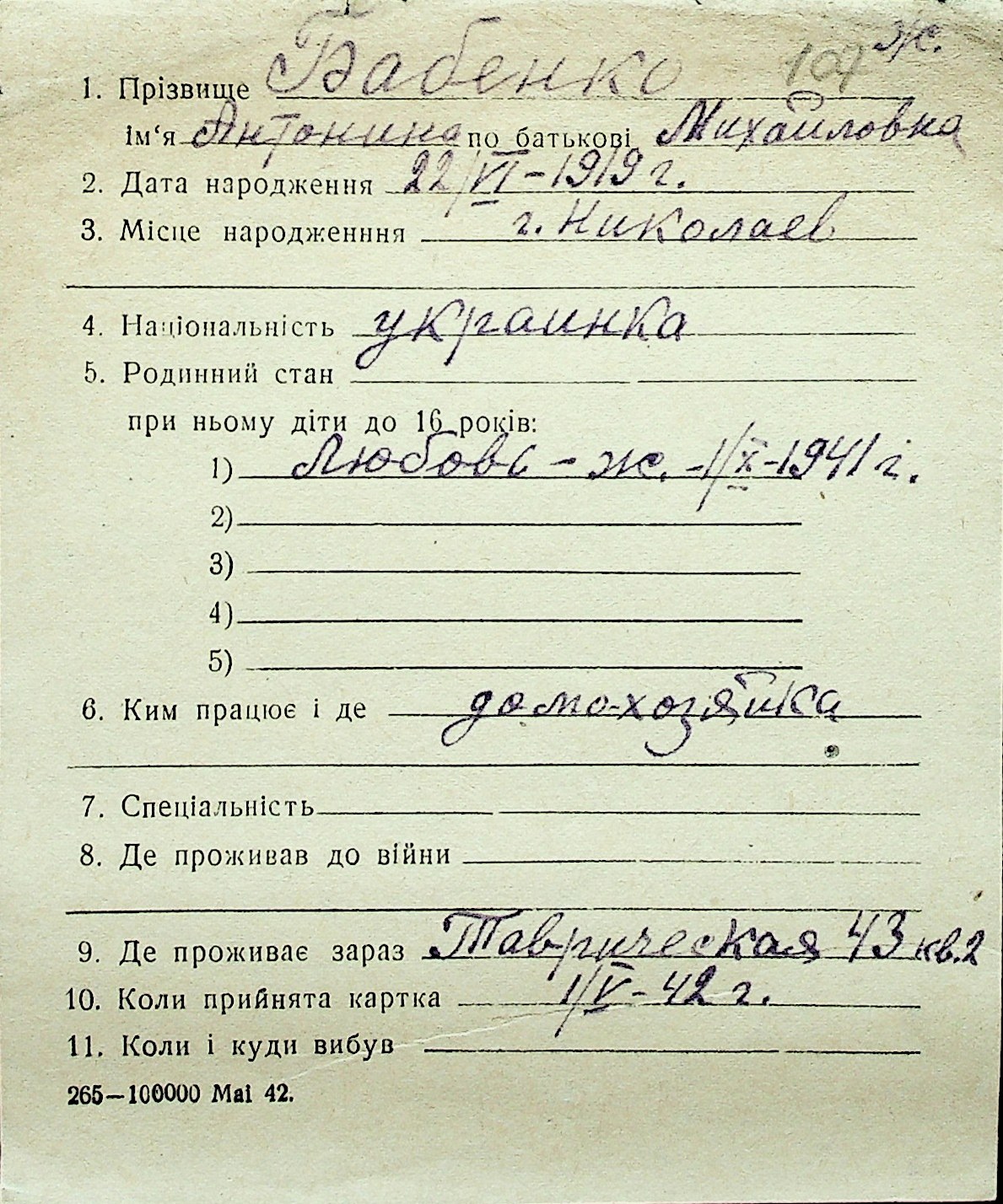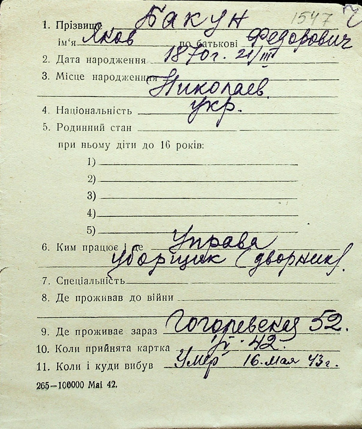 ◦ ◦ Перелік карток на осіб, які мешкали у м. Миколаїв у період окупації 1941–1944 років