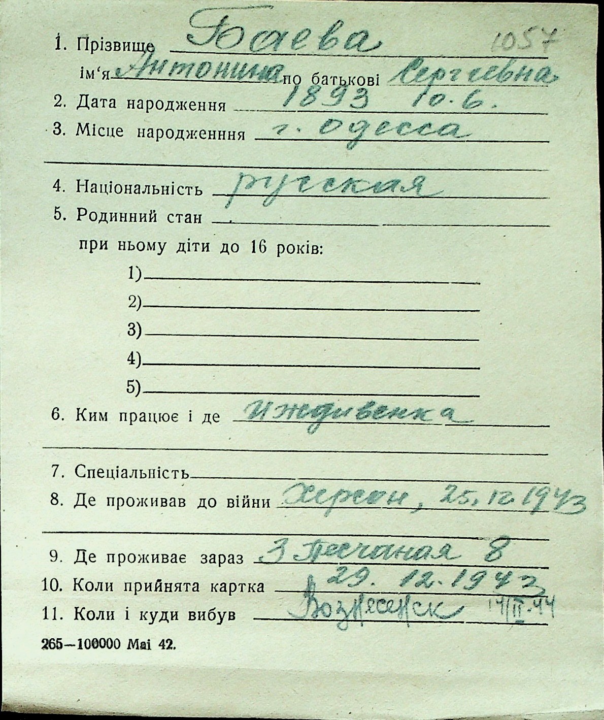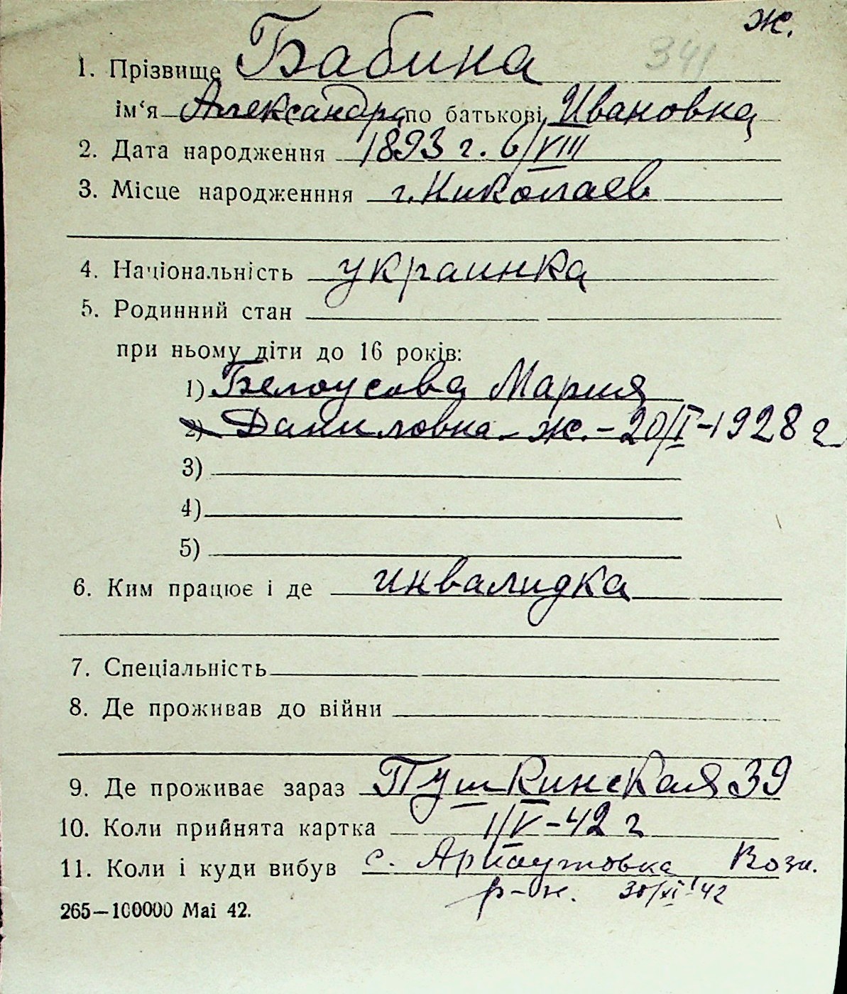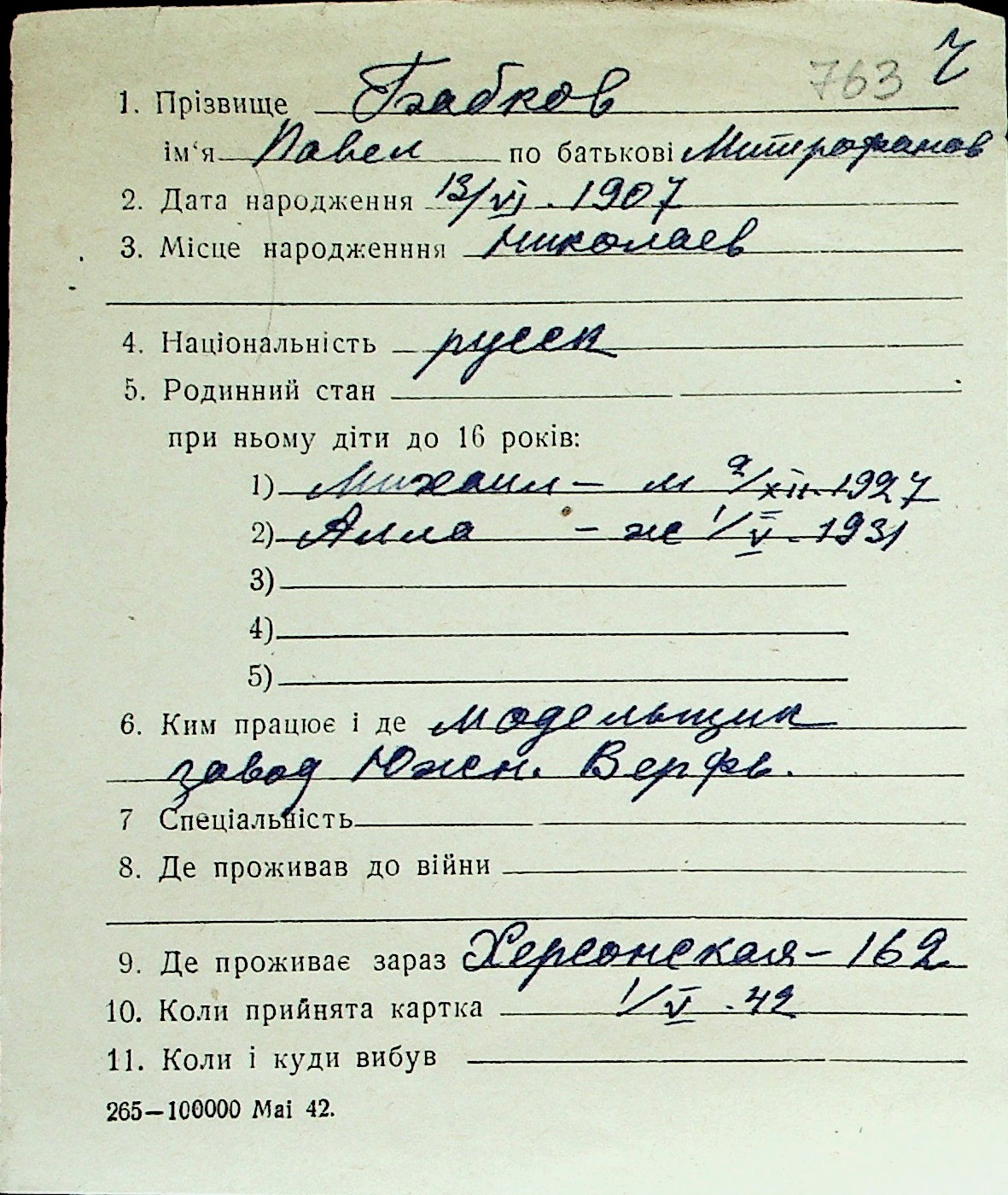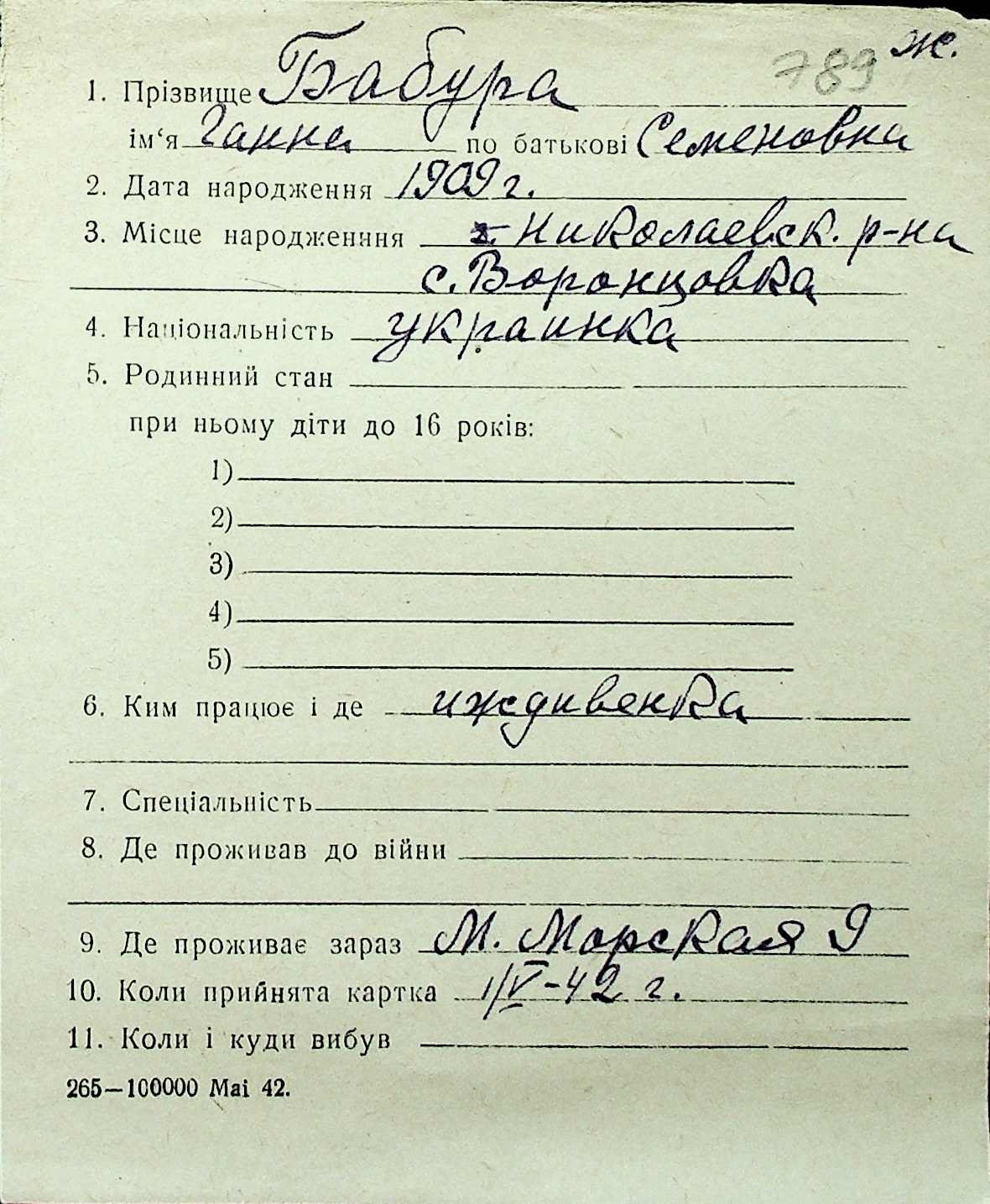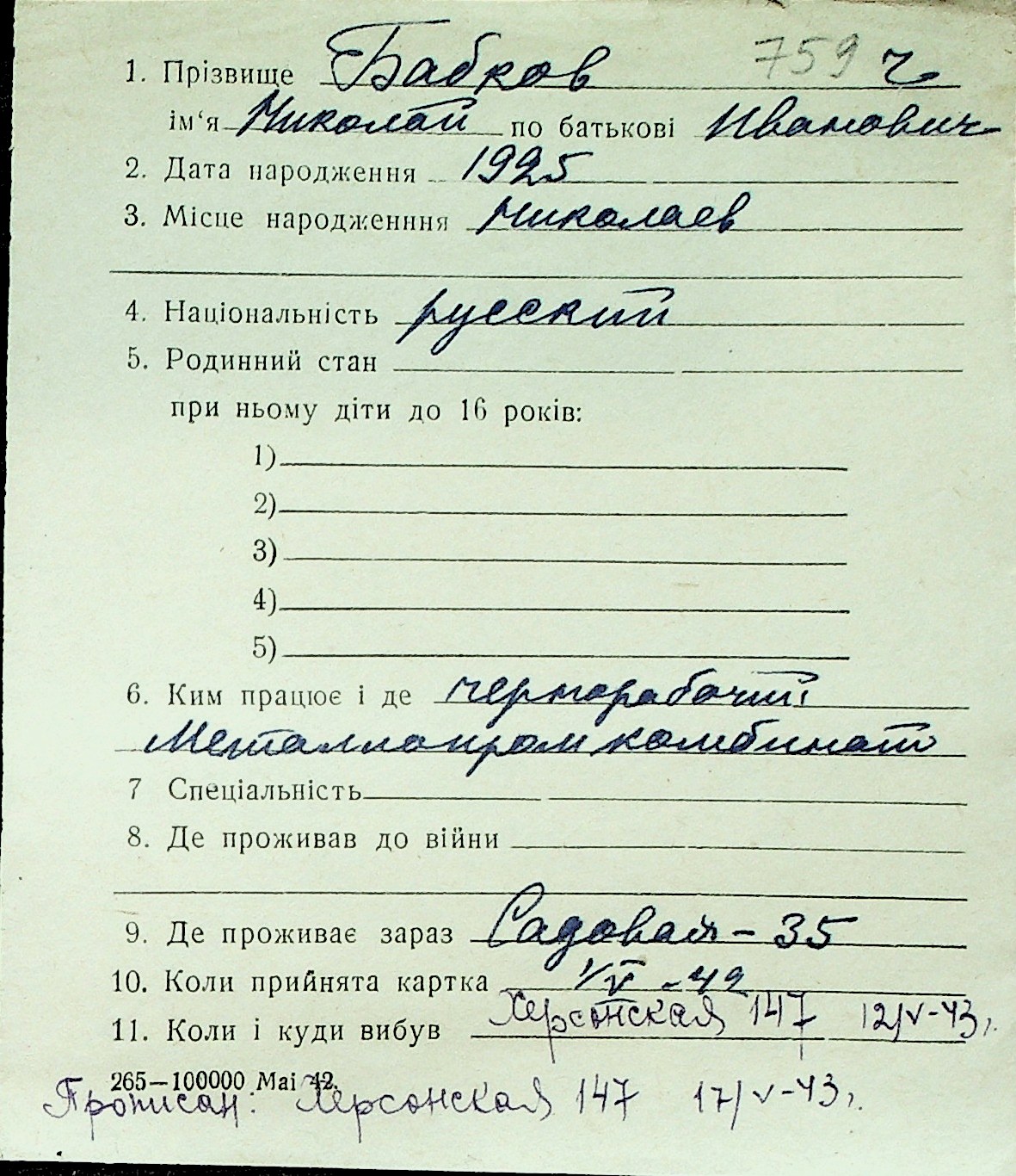 ◦ ◦ Перелік карток на осіб, які мешкали у м. Миколаїв у період окупації 1941–1944 років