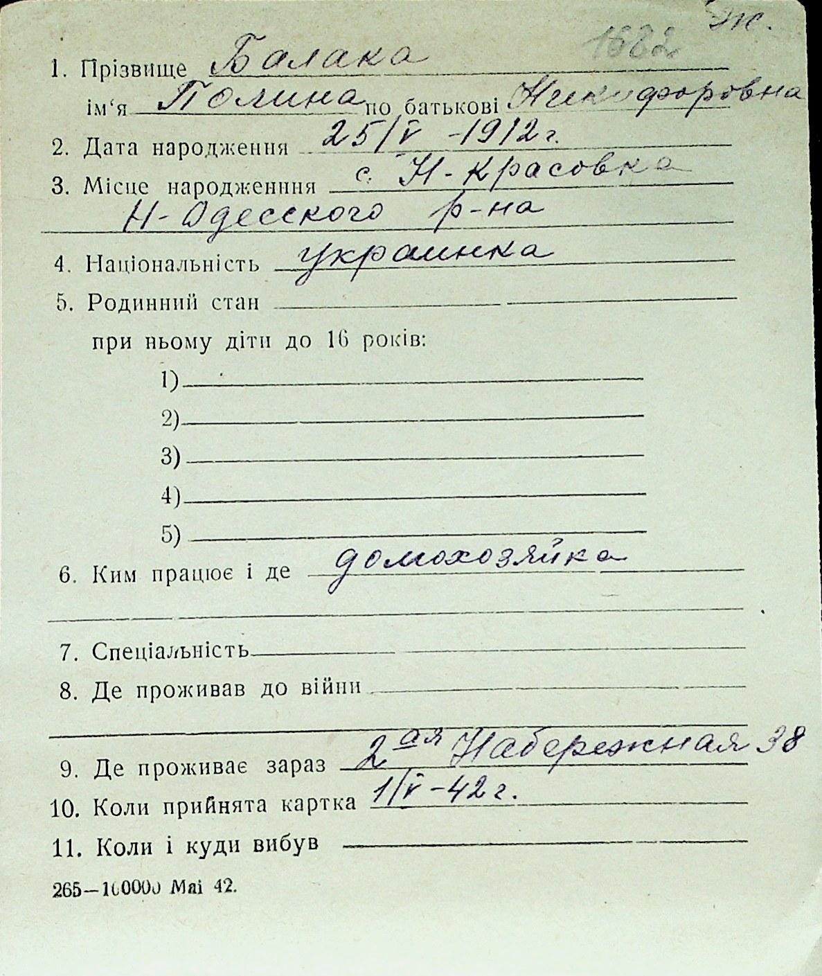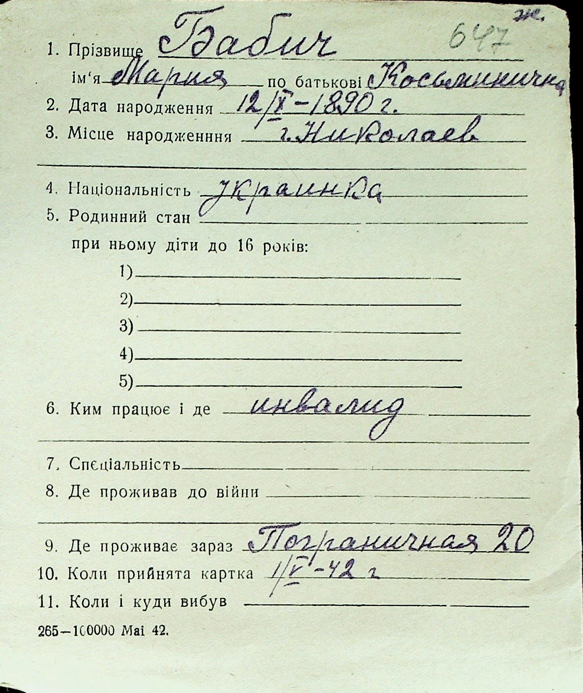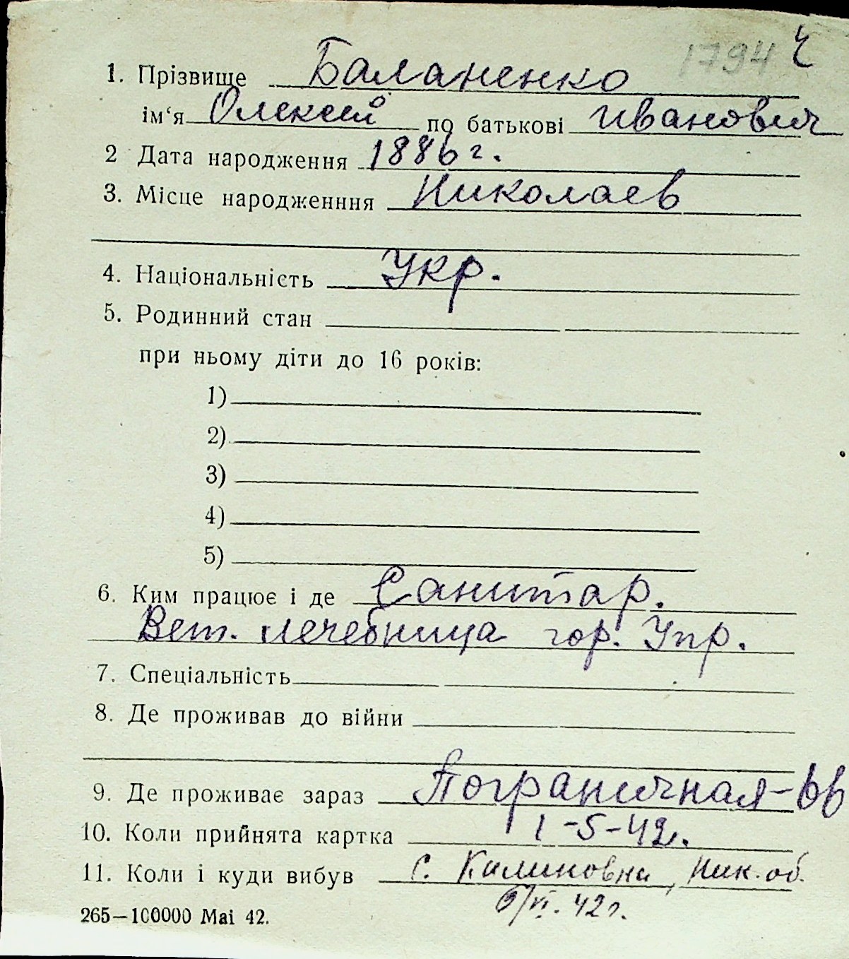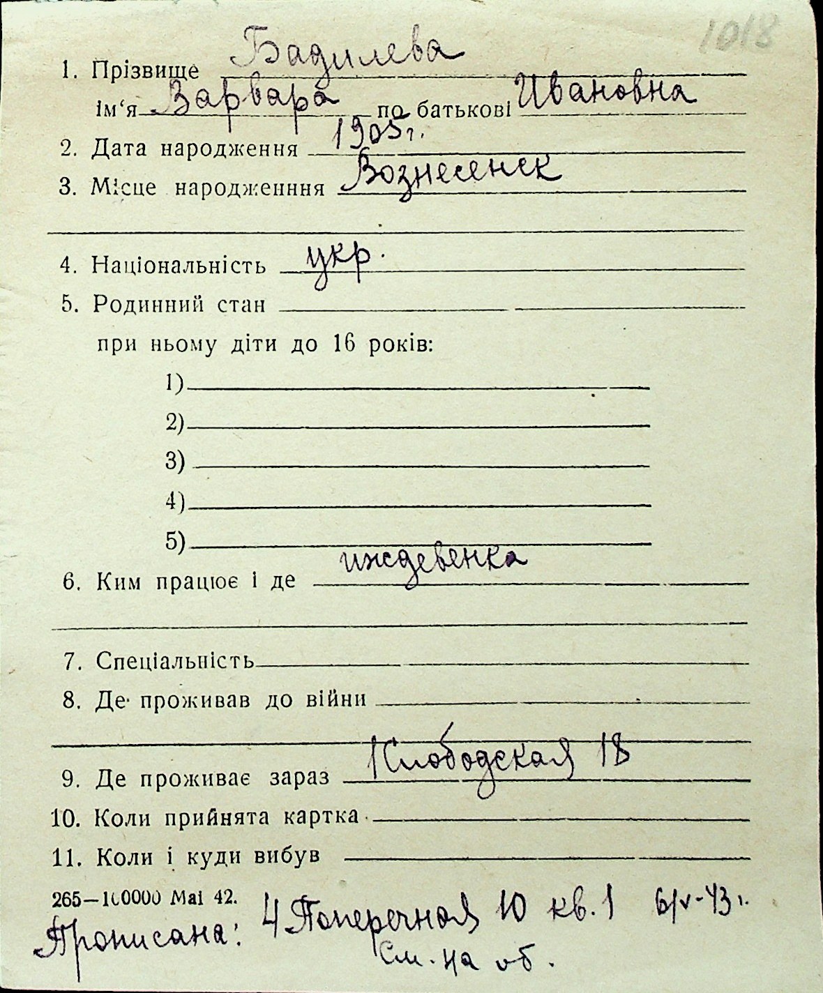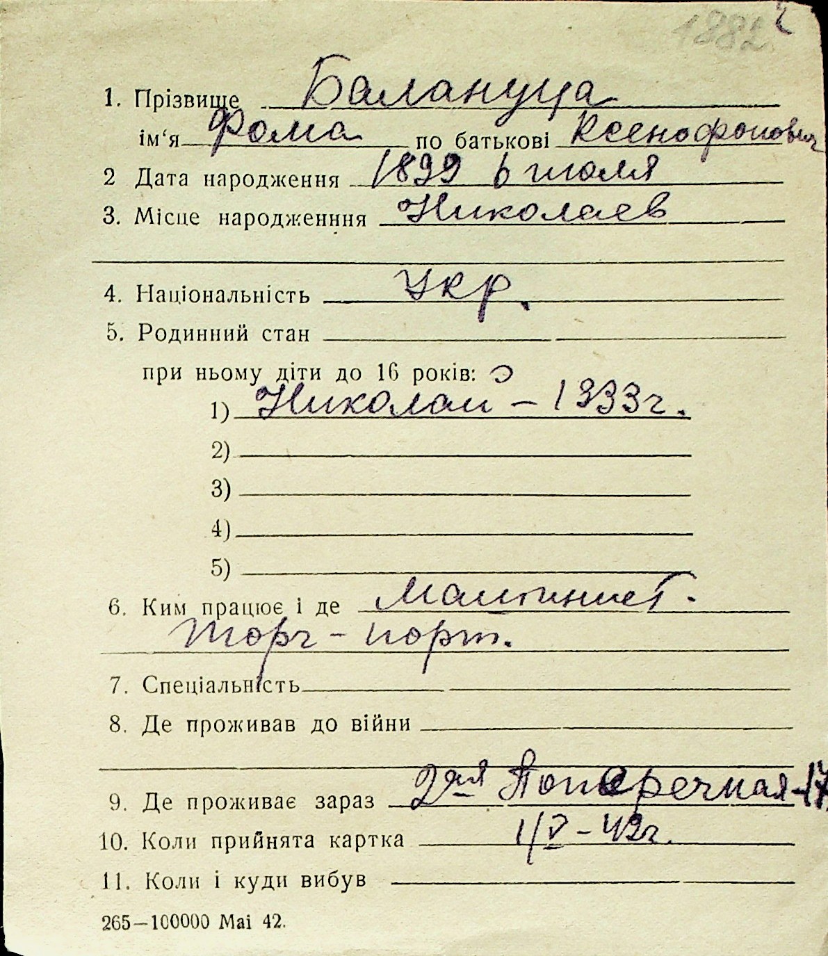 ◦ ◦ Перелік карток на осіб, які мешкали у м. Миколаїв у період окупації 1941–1944 років