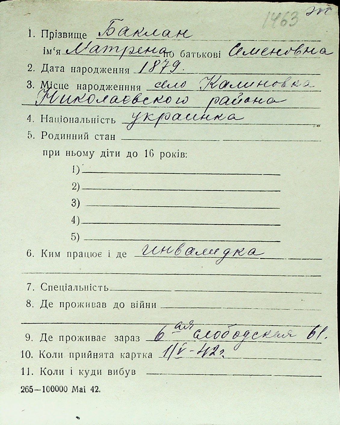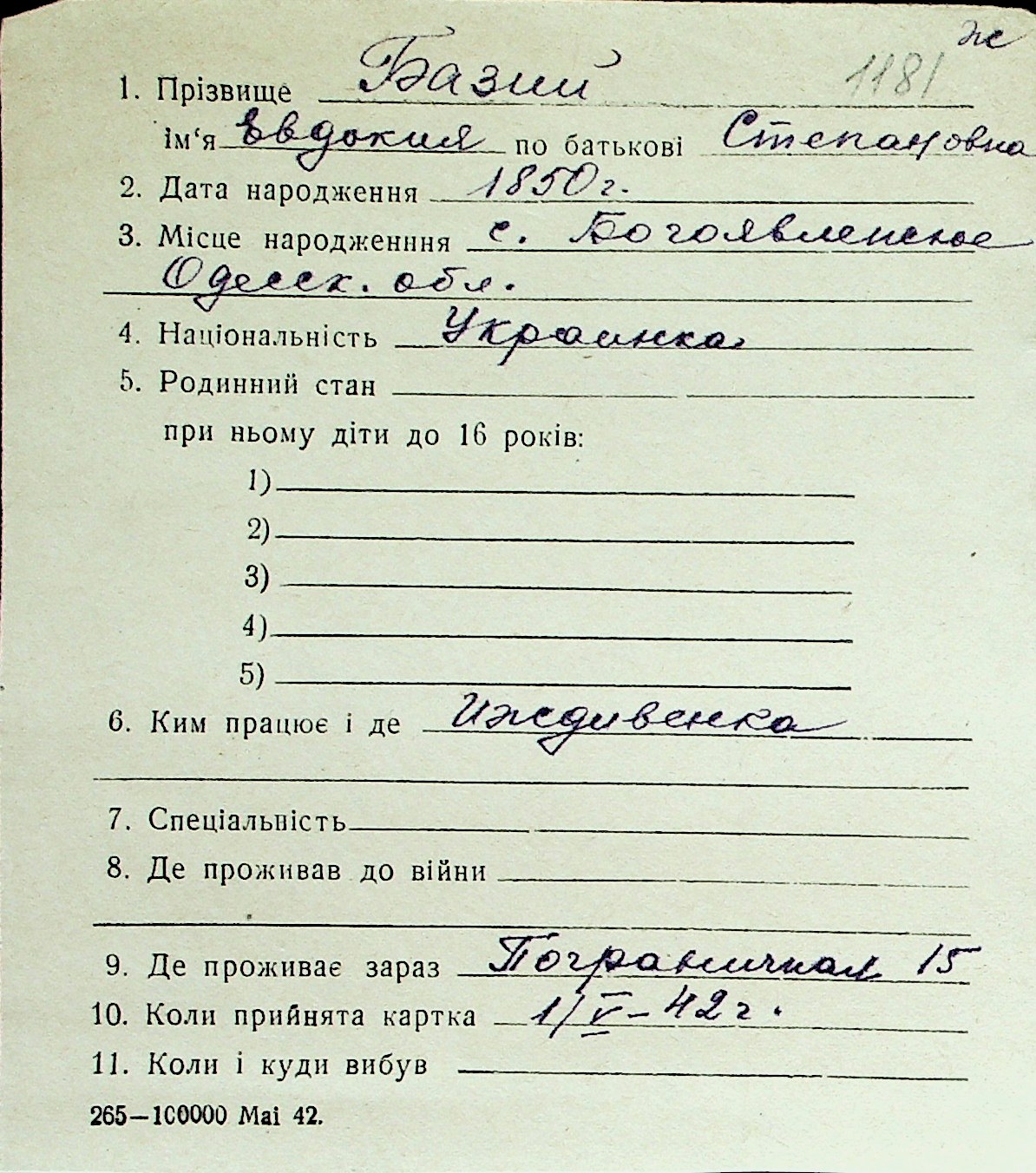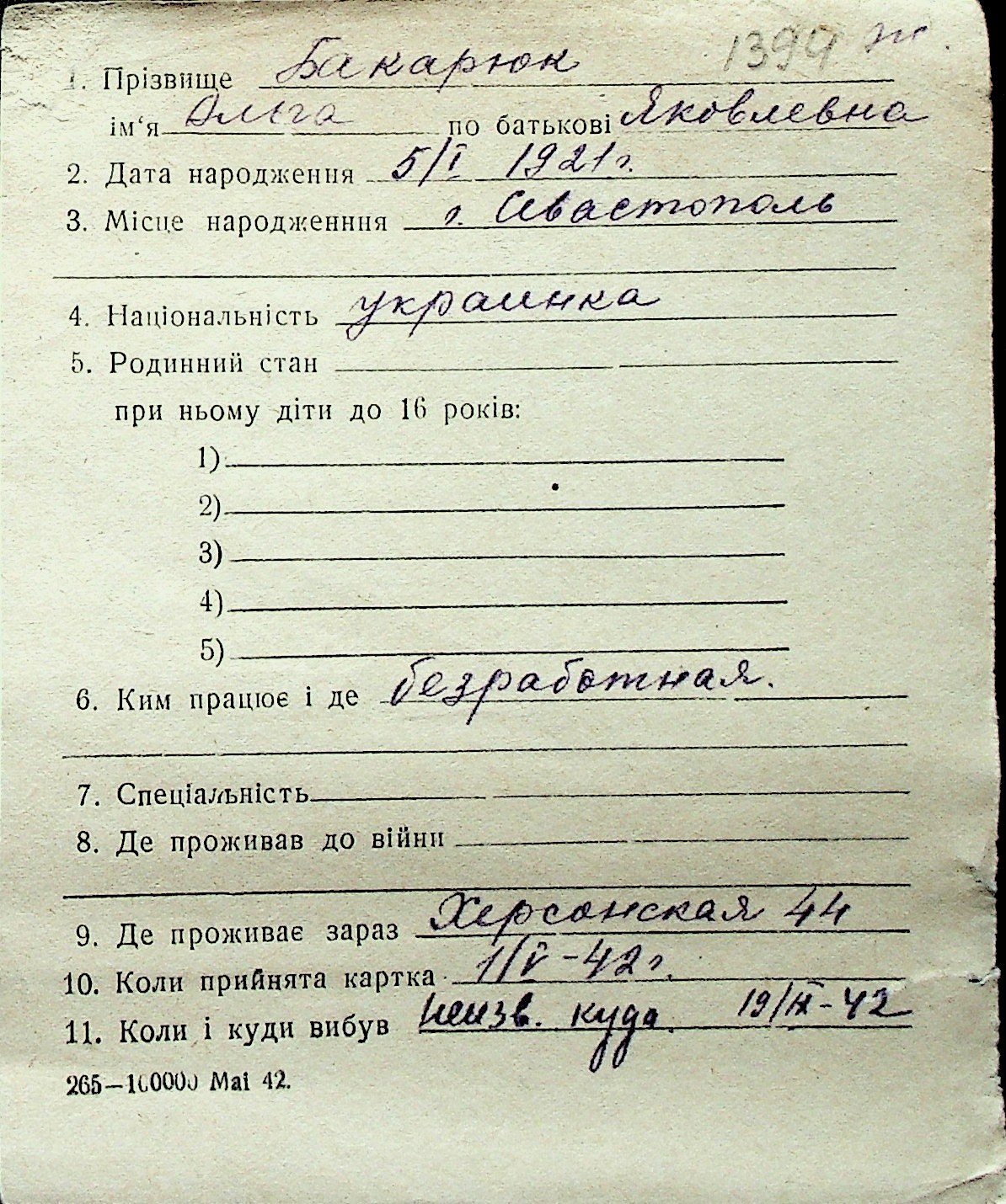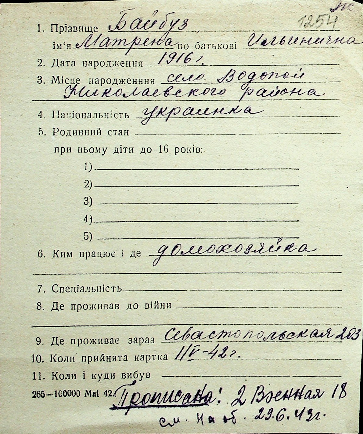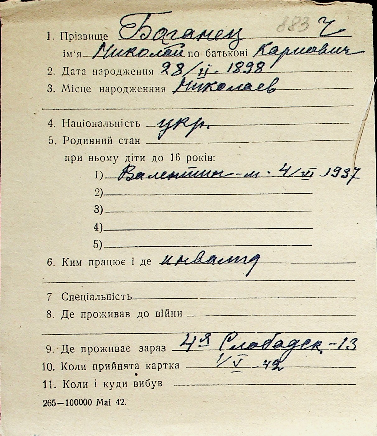 ◦ ◦ Перелік карток на осіб, які мешкали у м. Миколаїв у період окупації 1941–1944 років