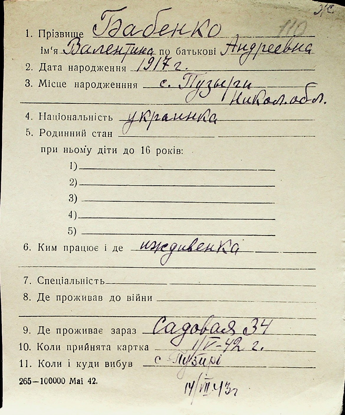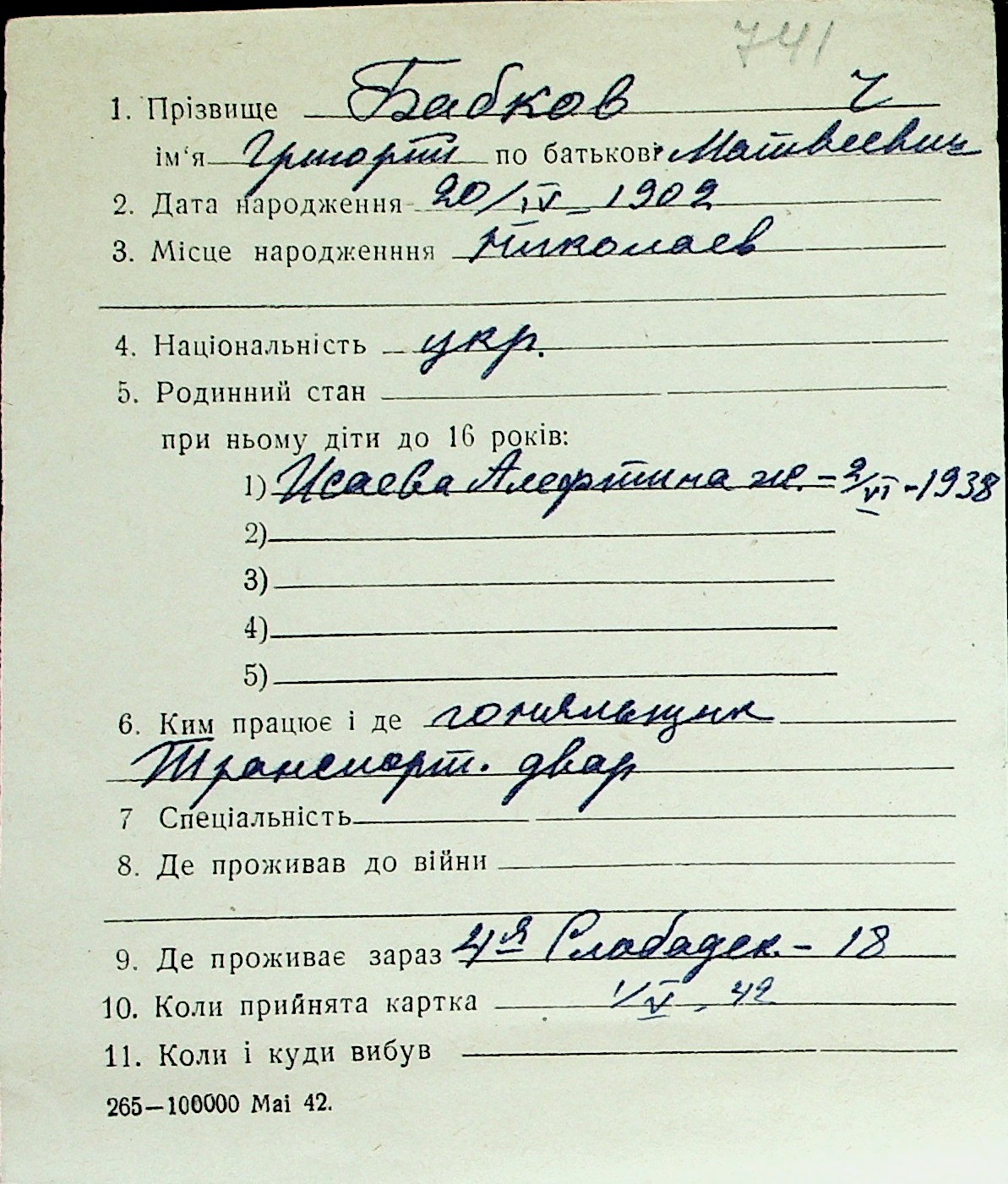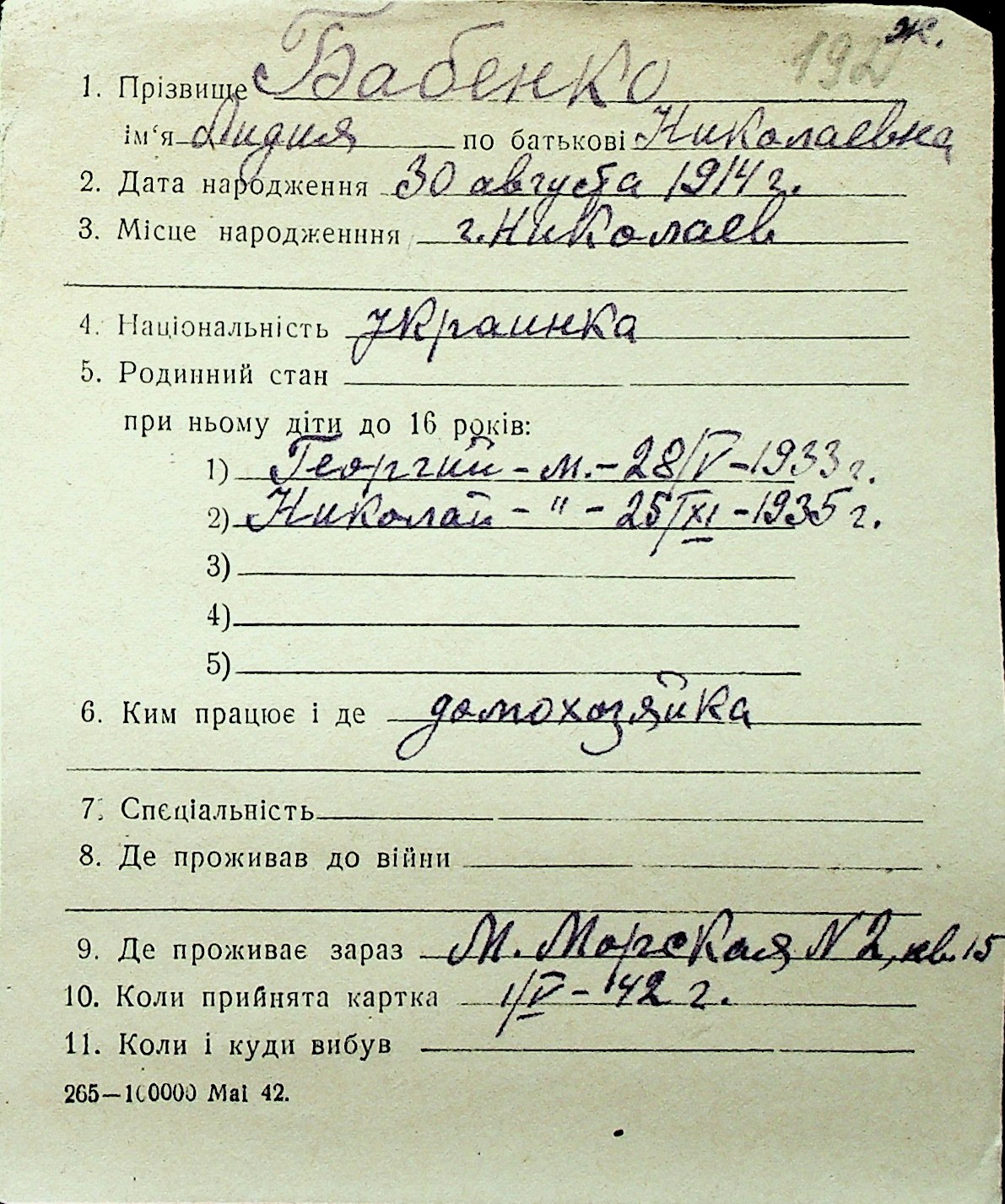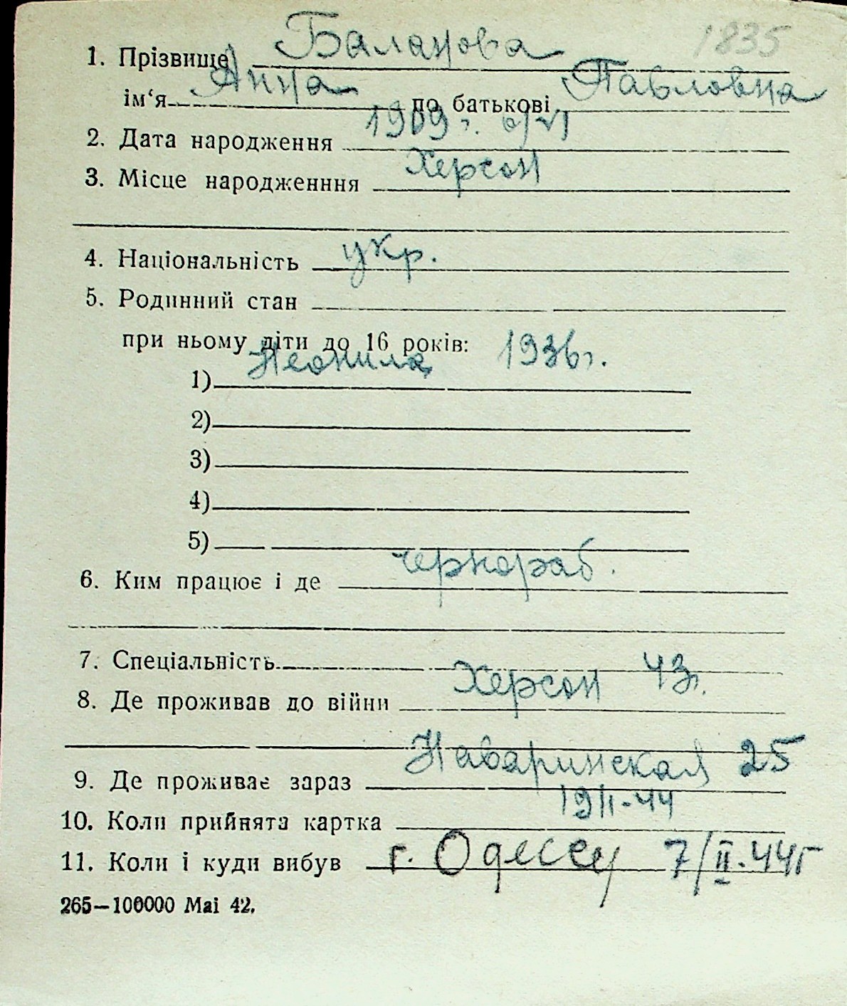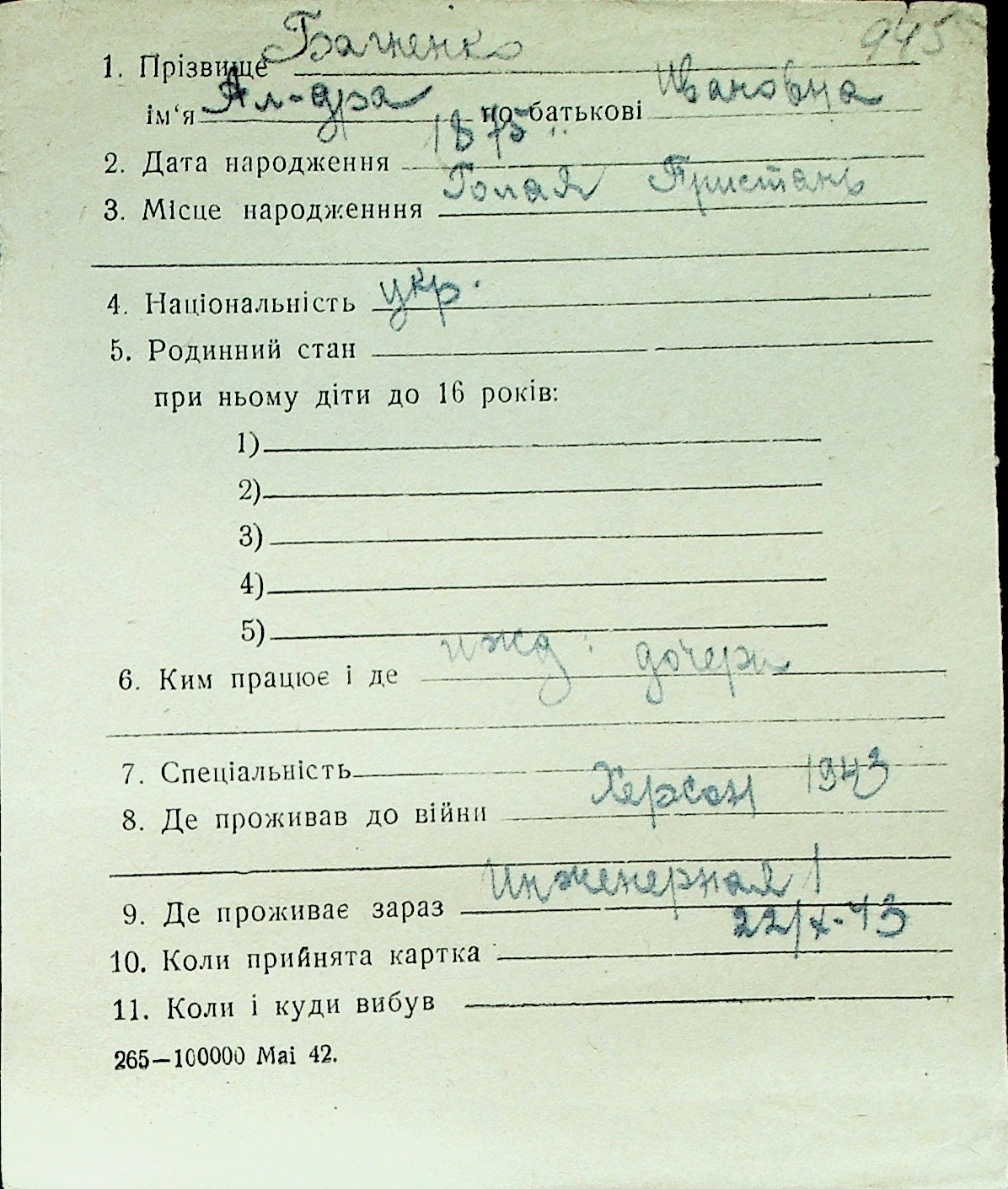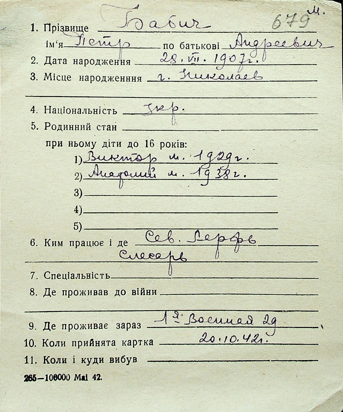 ◦ ◦ Перелік карток на осіб, які мешкали у м. Миколаїв у період окупації 1941–1944 років