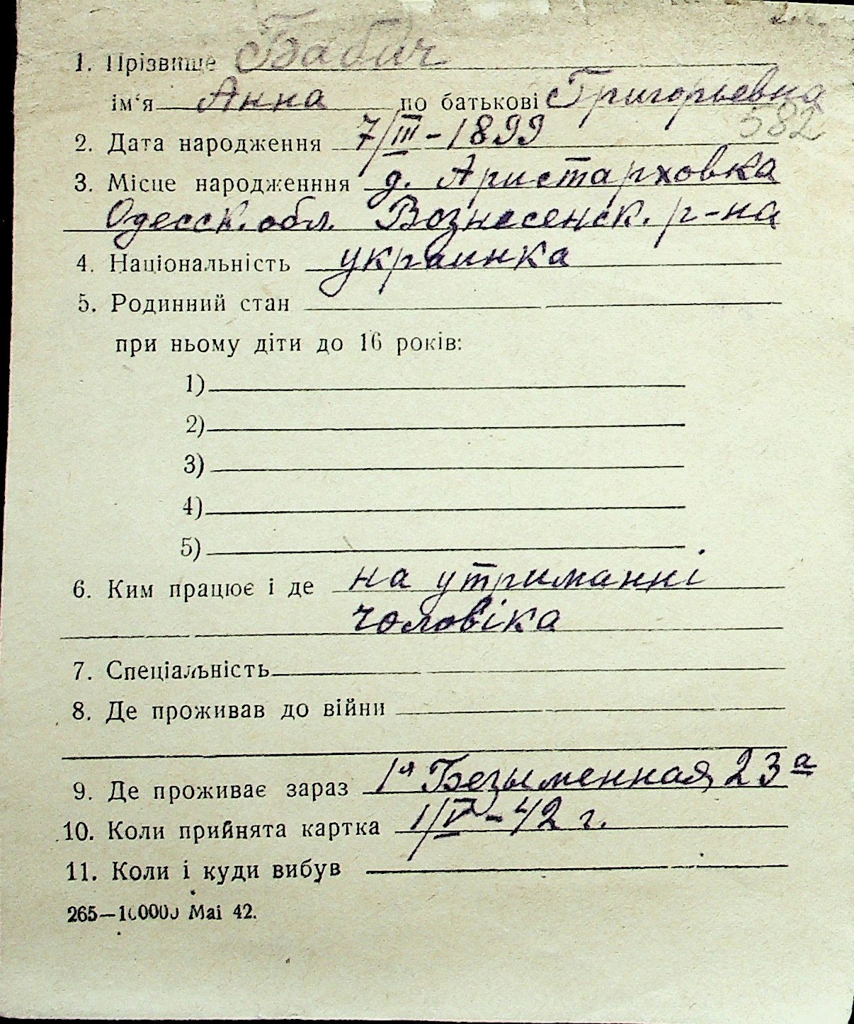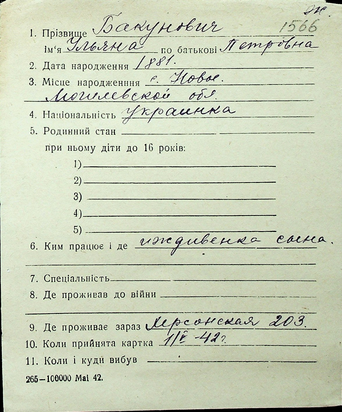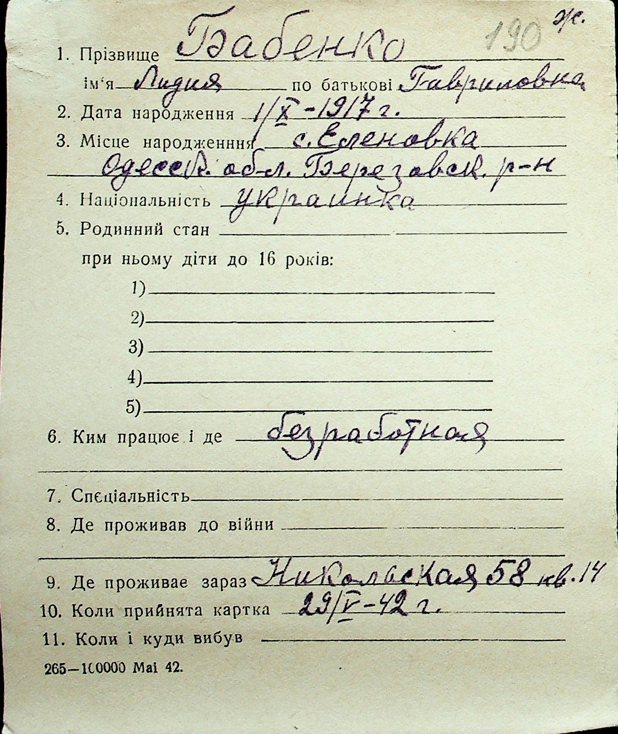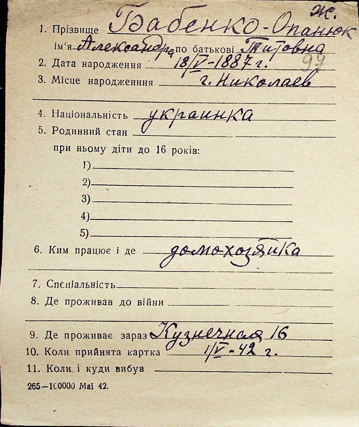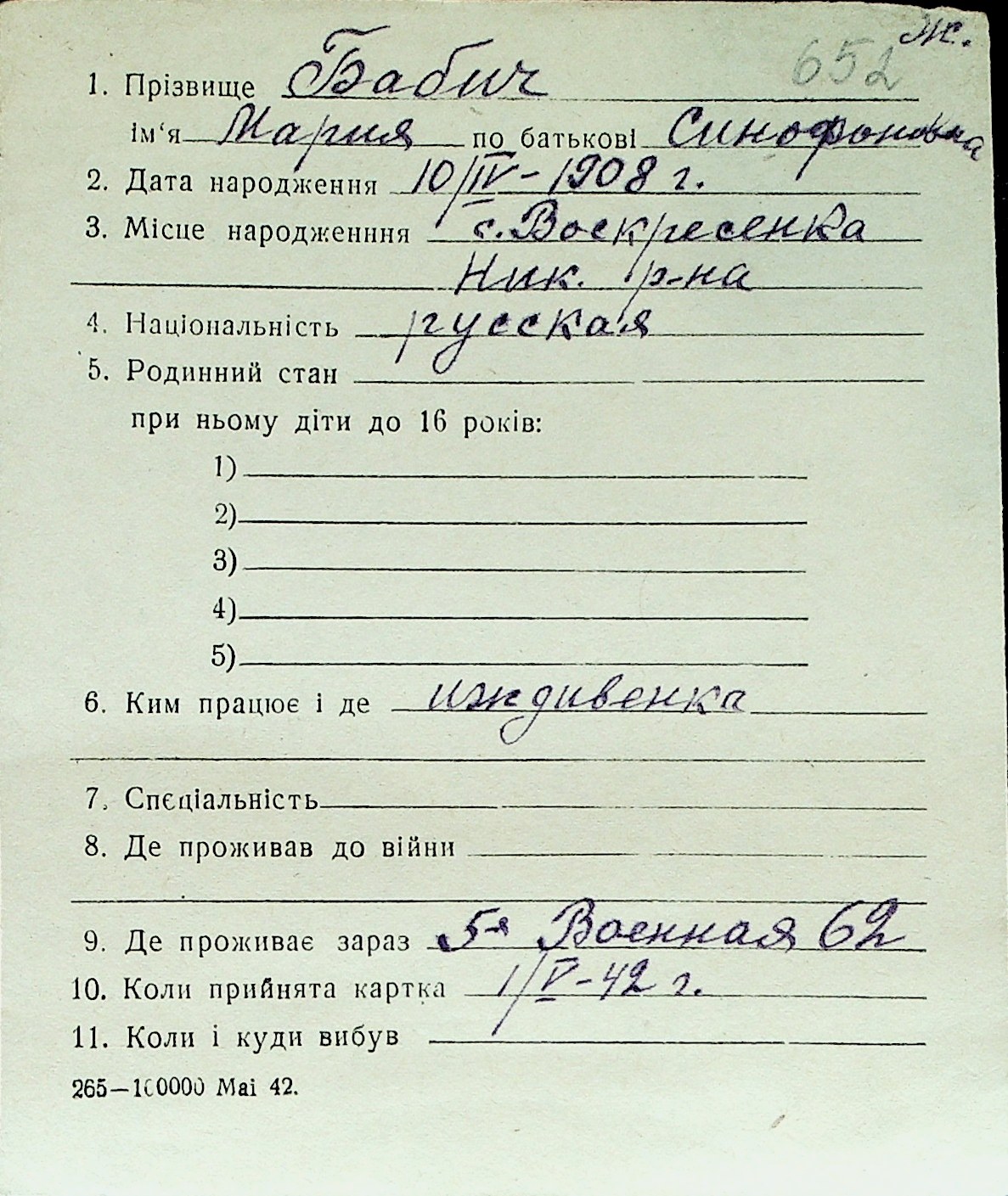 ◦ ◦ Перелік карток на осіб, які мешкали у м. Миколаїв у період окупації 1941–1944 років