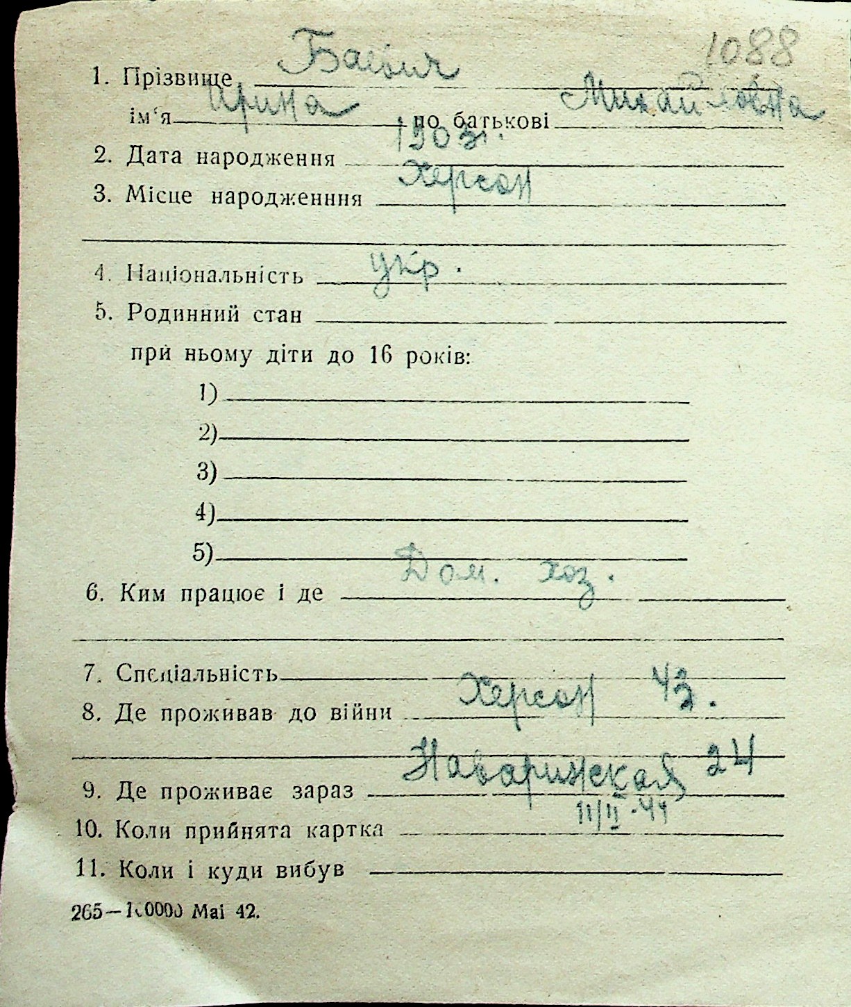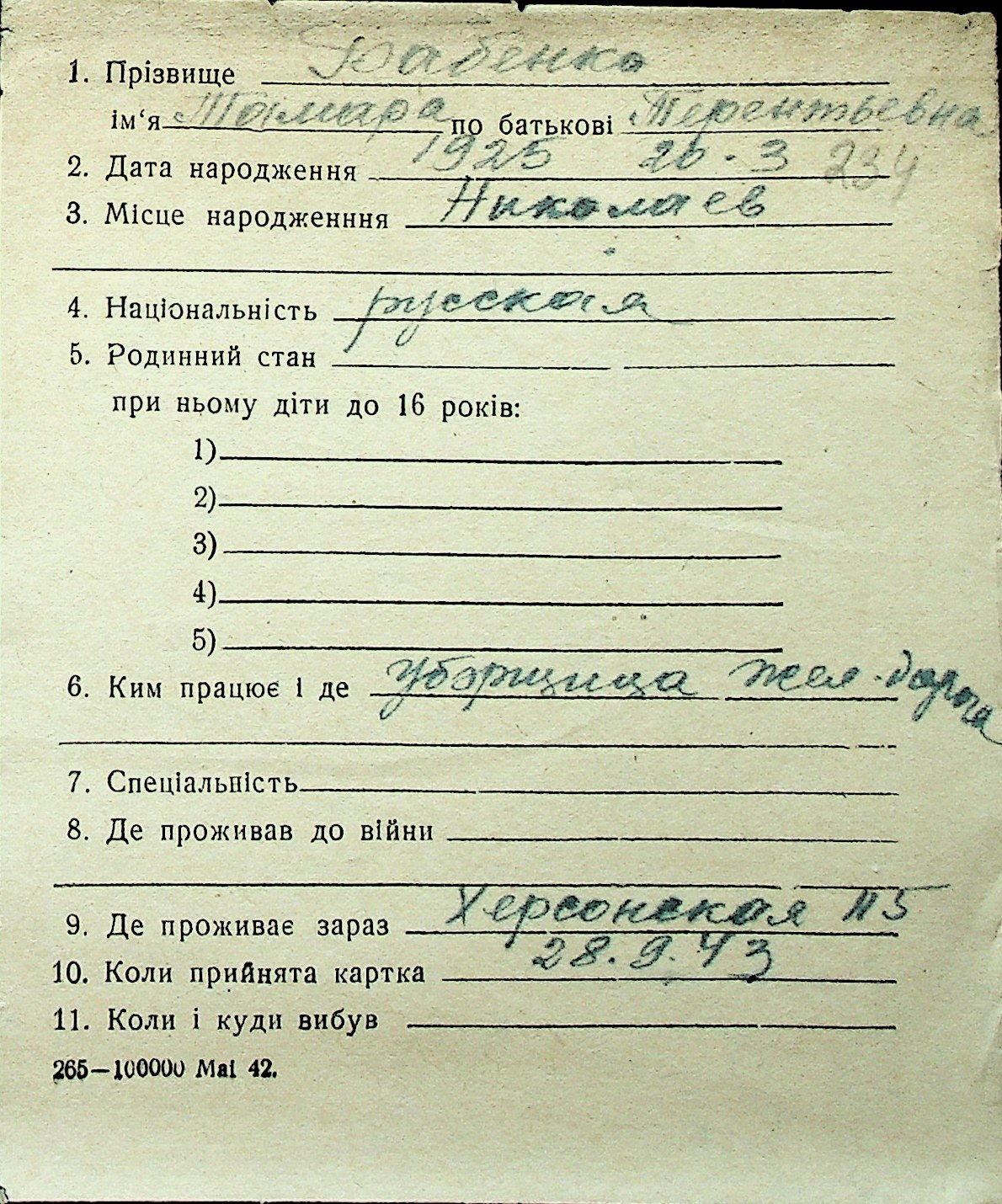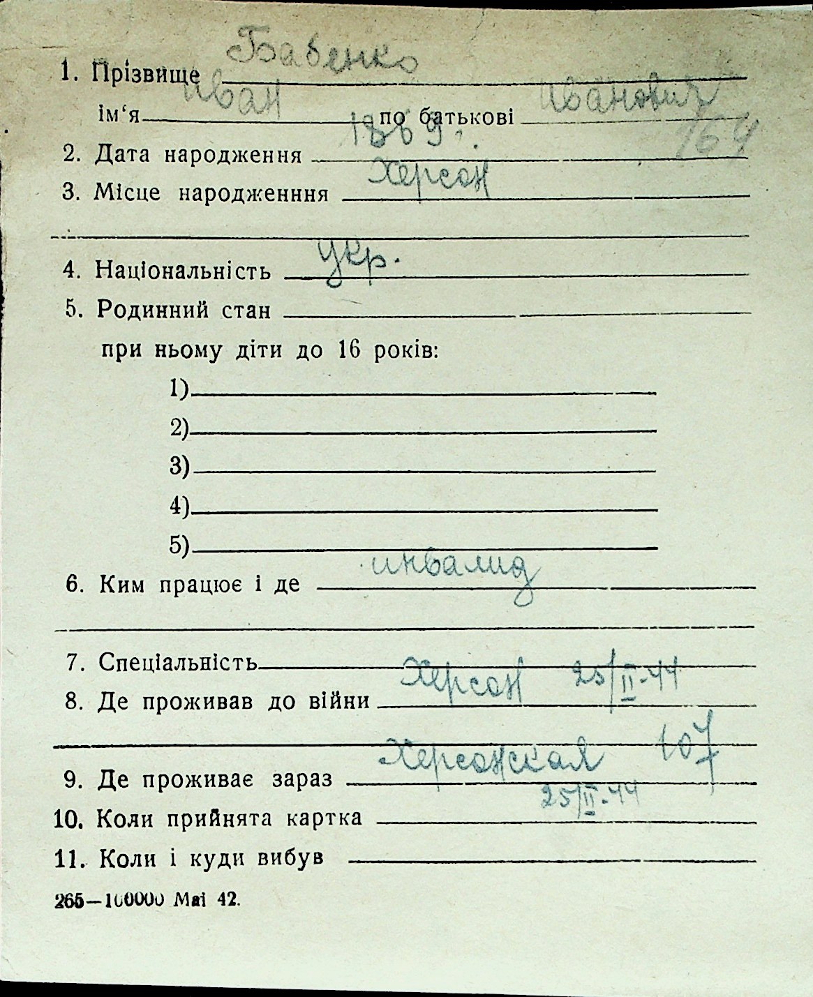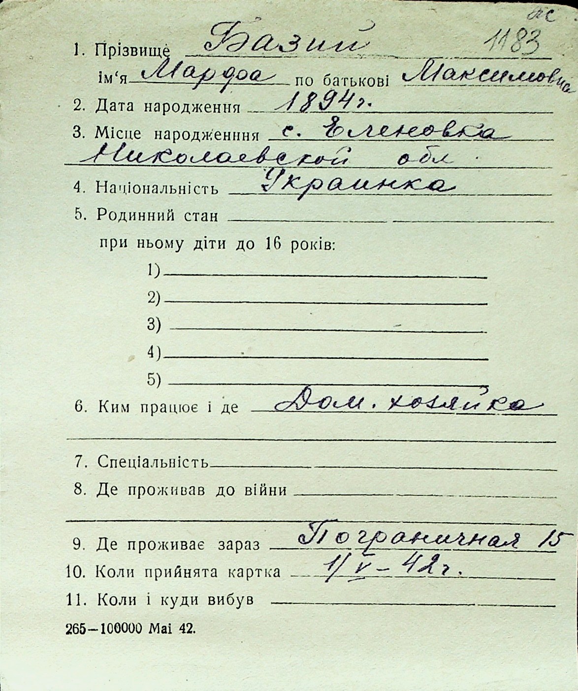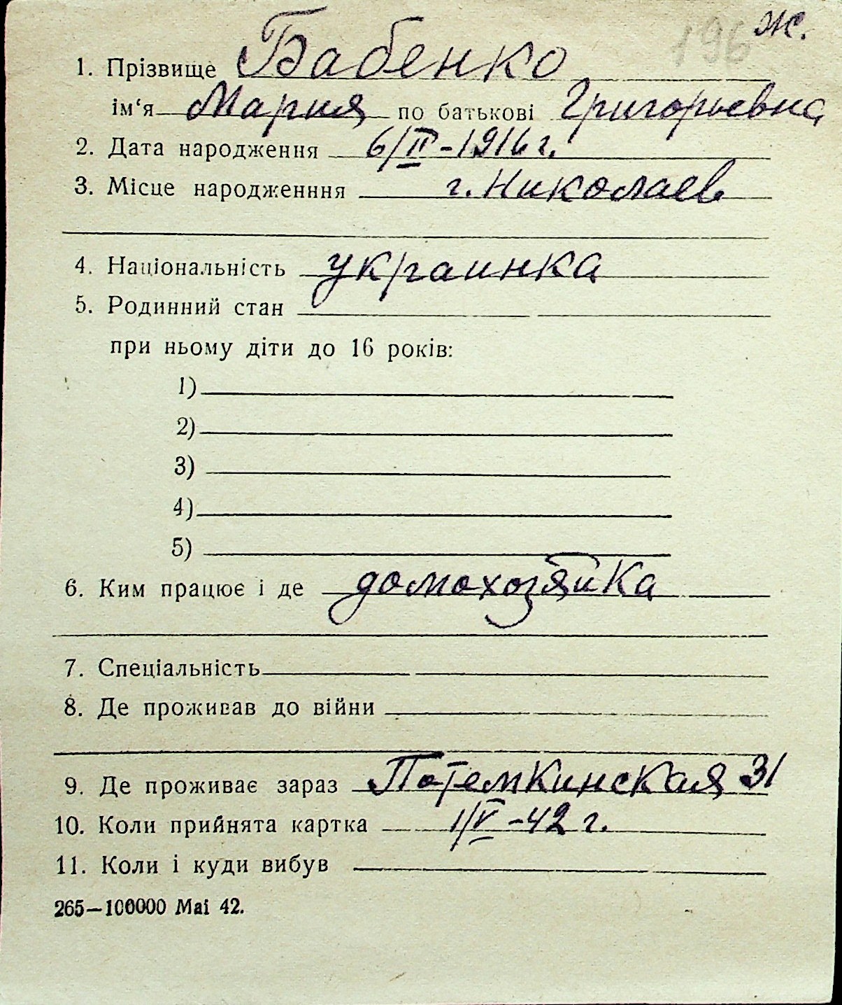 ◦ ◦ Перелік карток на осіб, які мешкали у м. Миколаїв у період окупації 1941–1944 років