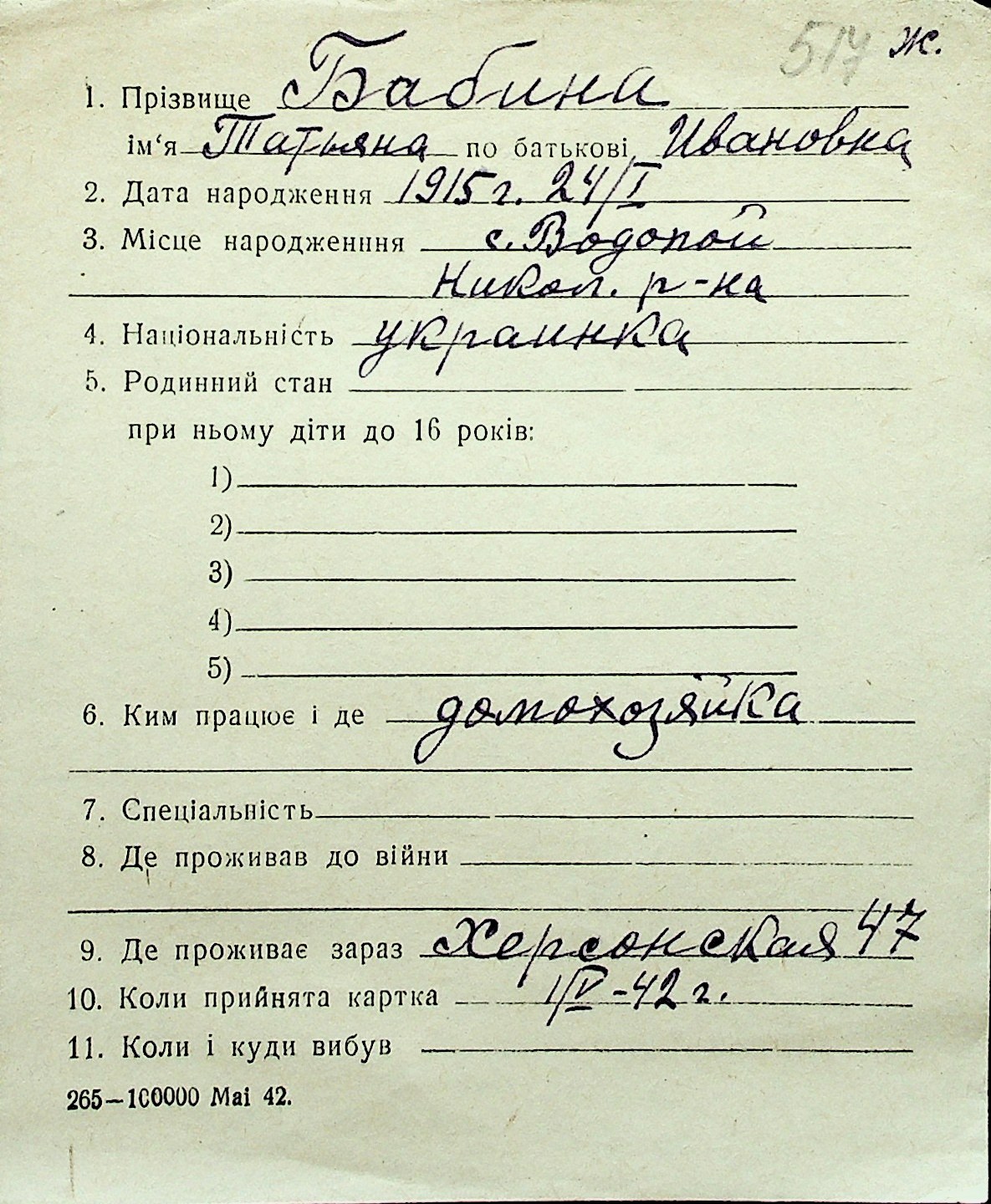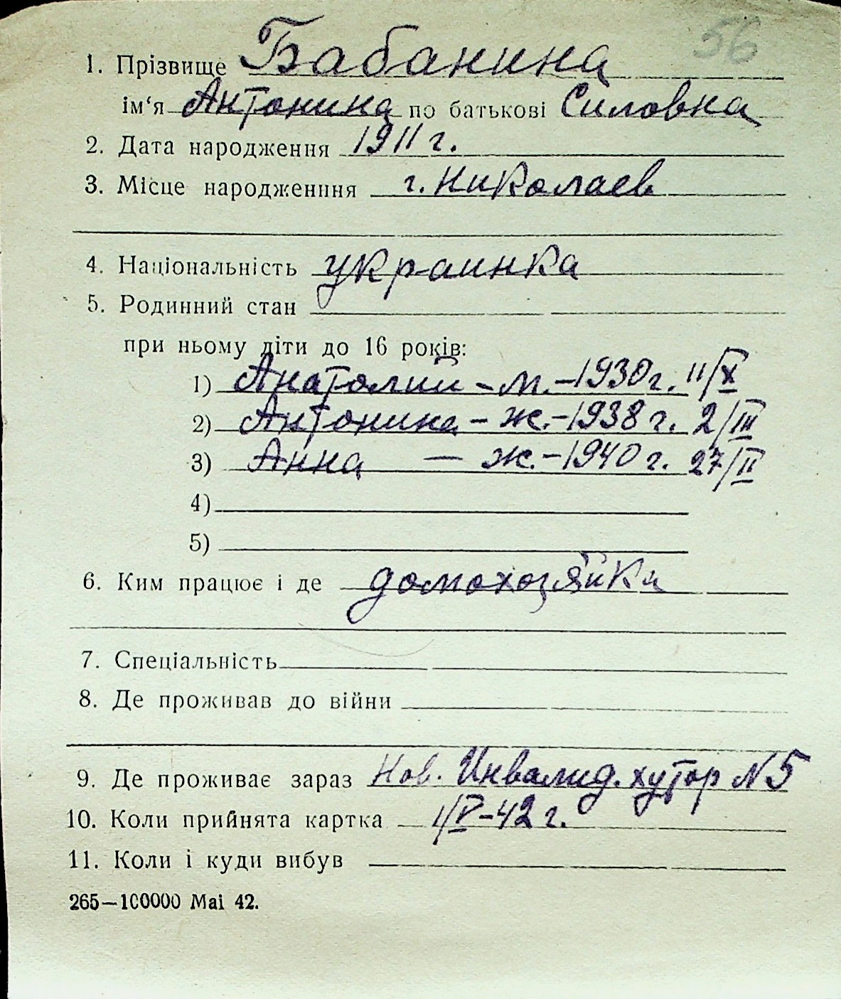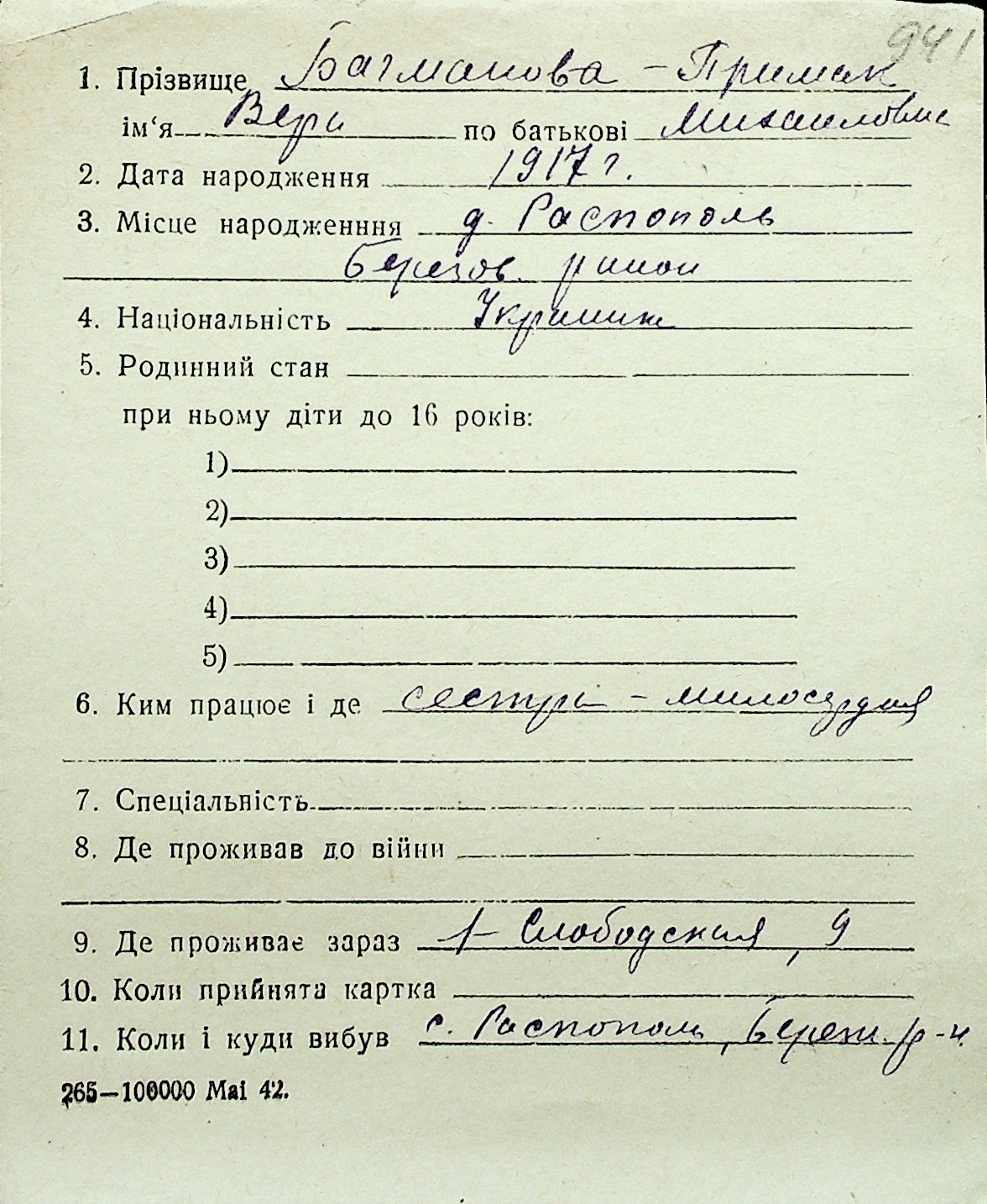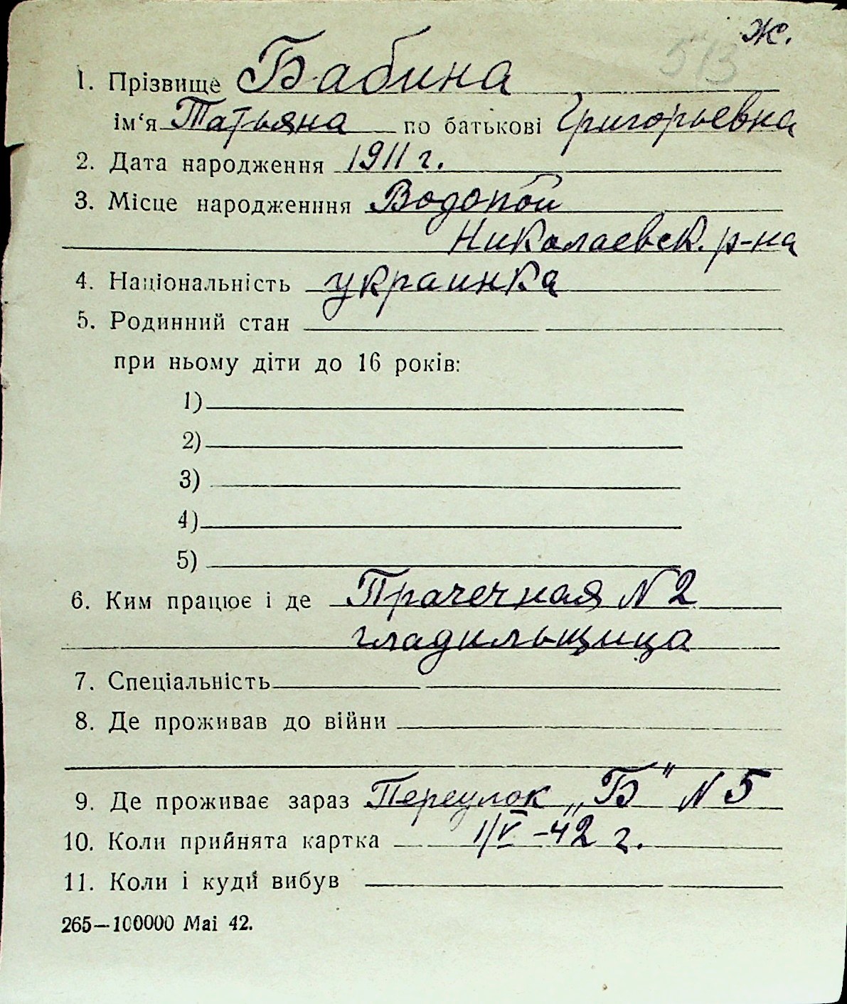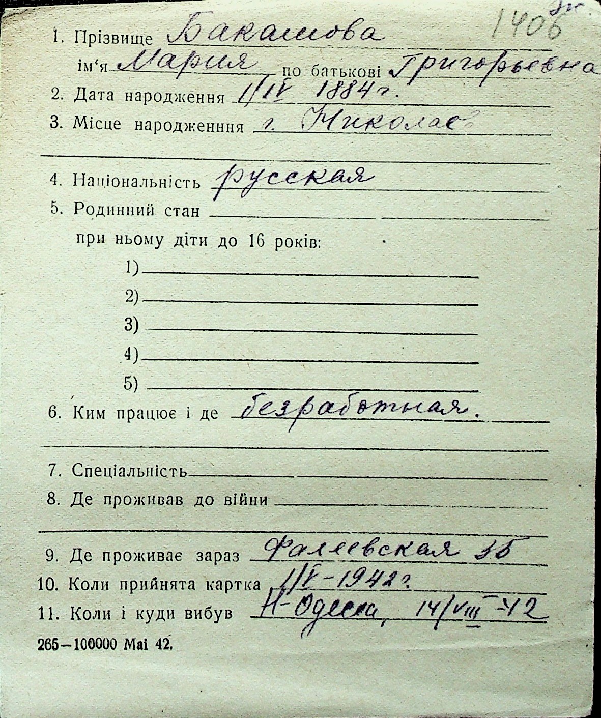 ◦ ◦ Перелік карток на осіб, які мешкали у м. Миколаїв у період окупації 1941–1944 років