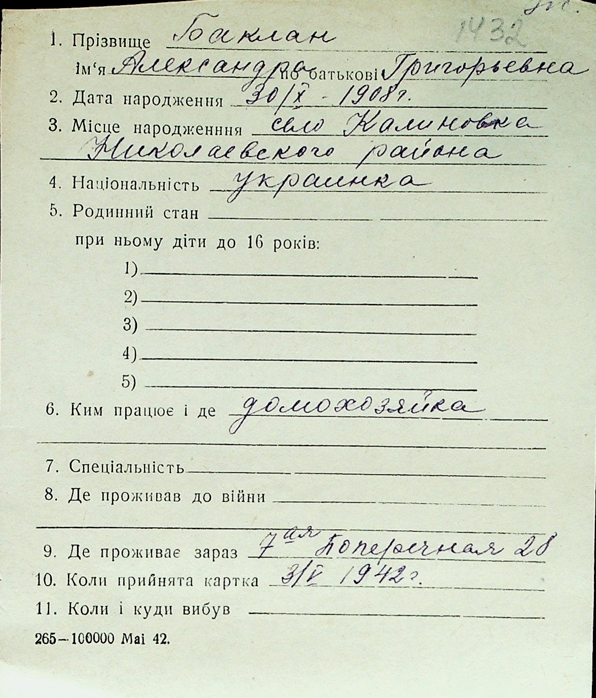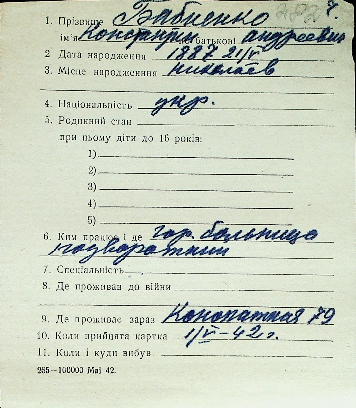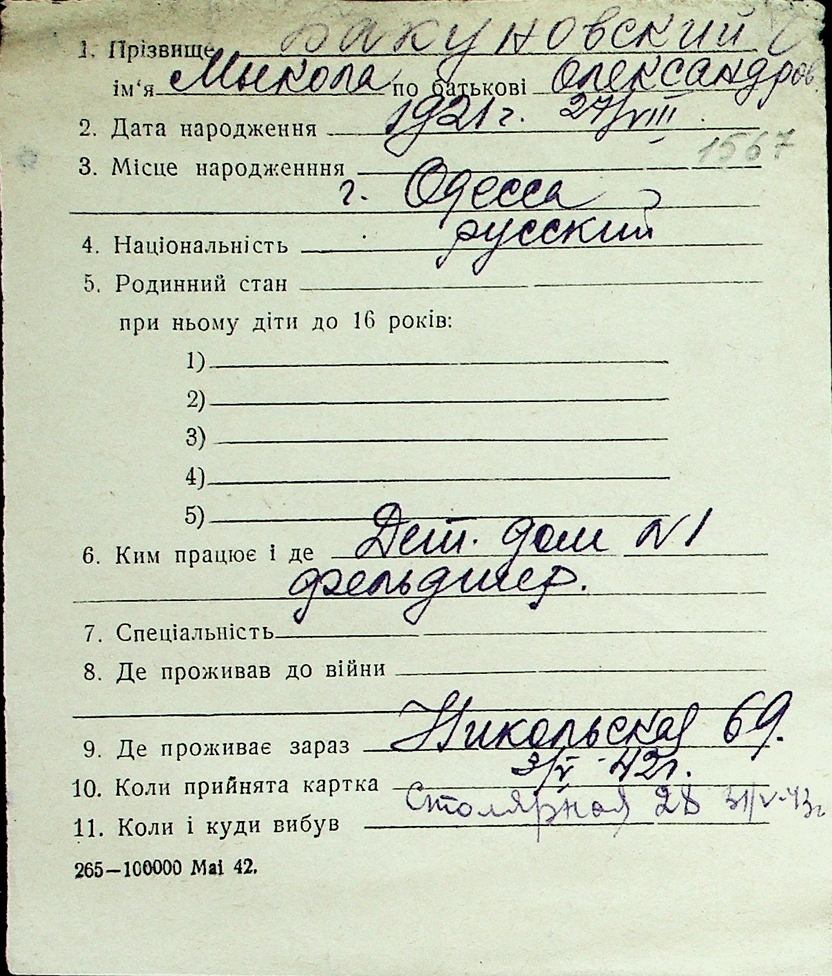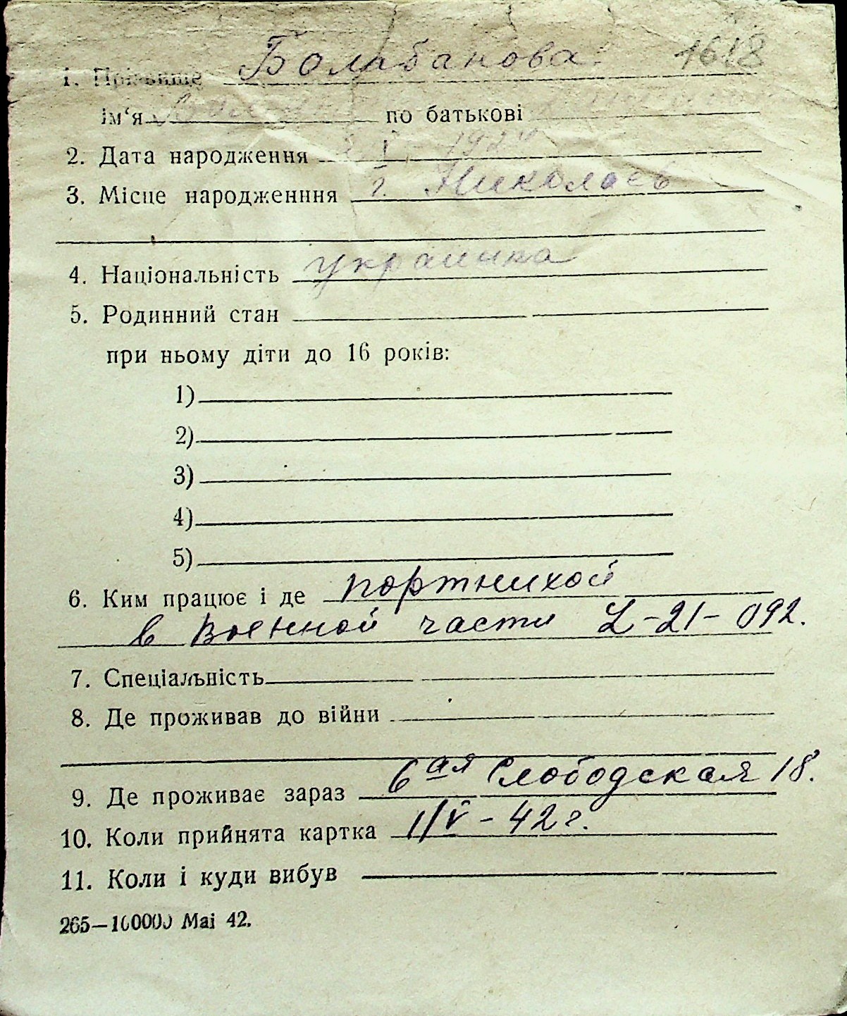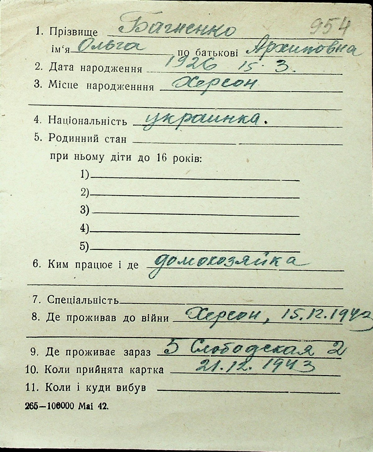 ◦ ◦ Перелік карток на осіб, які мешкали у м. Миколаїв у період окупації 1941–1944 років