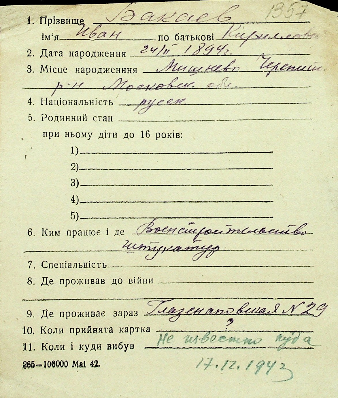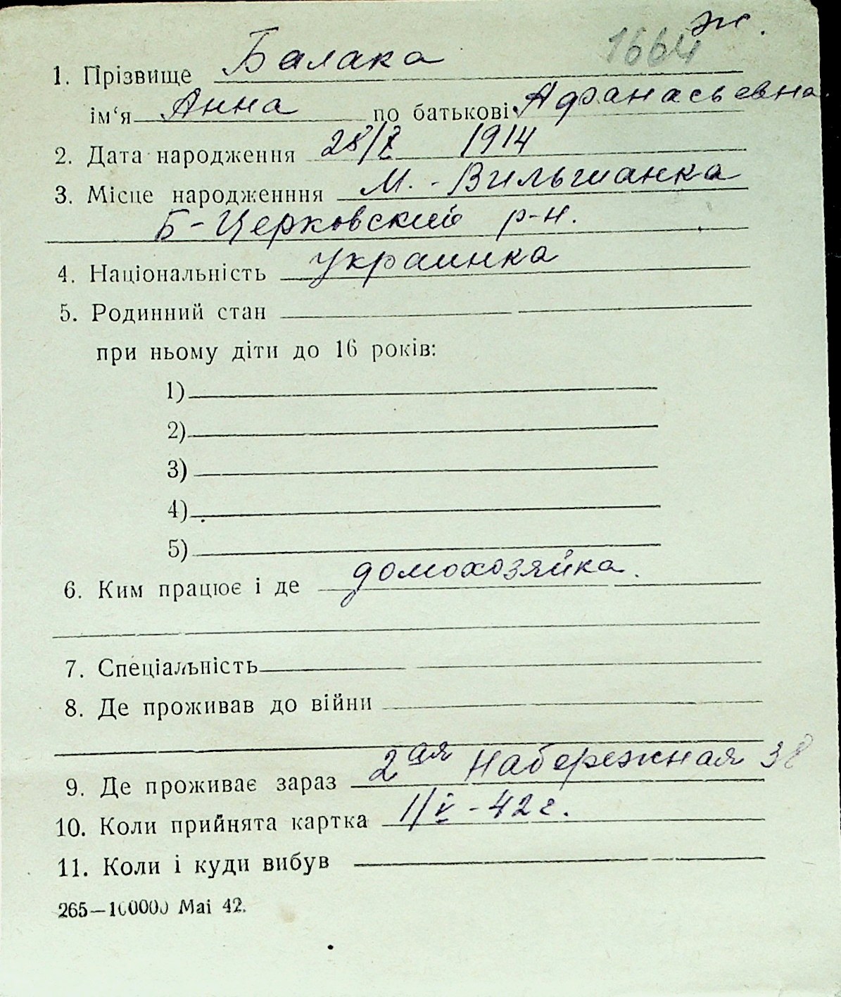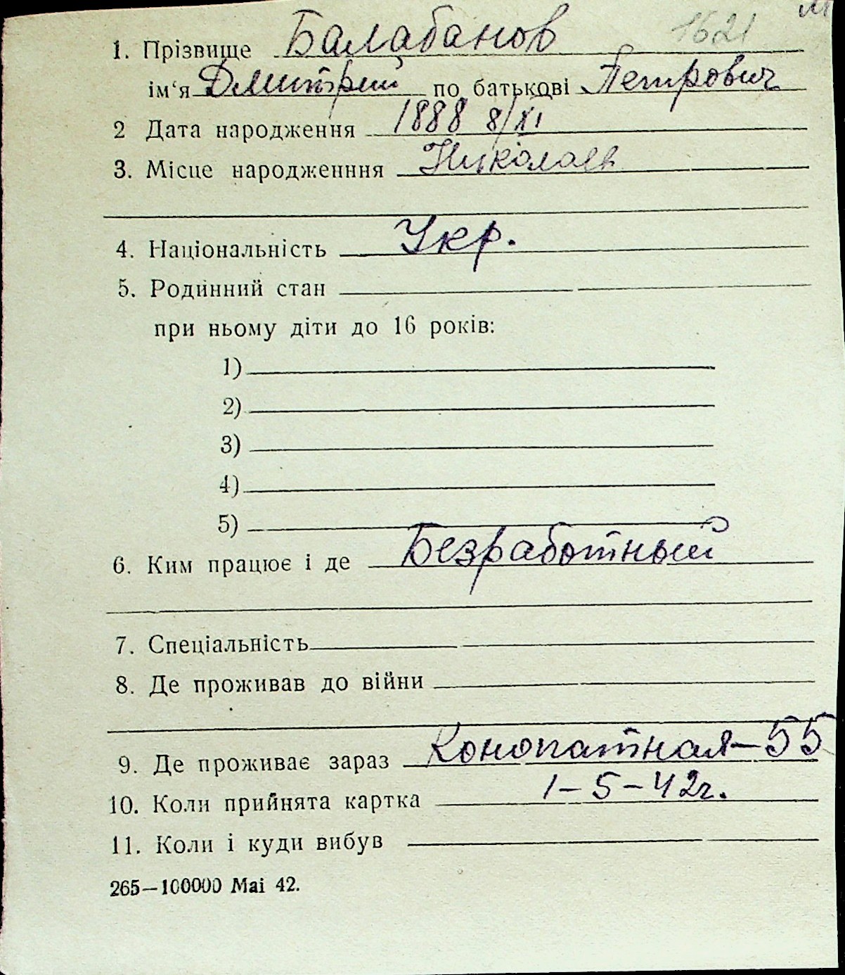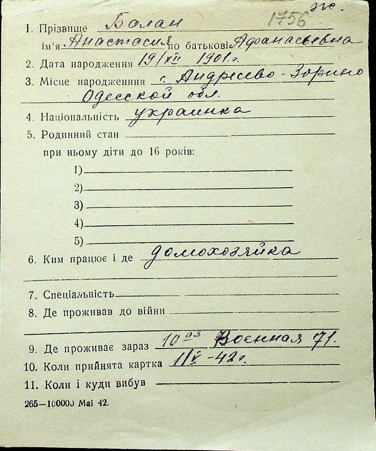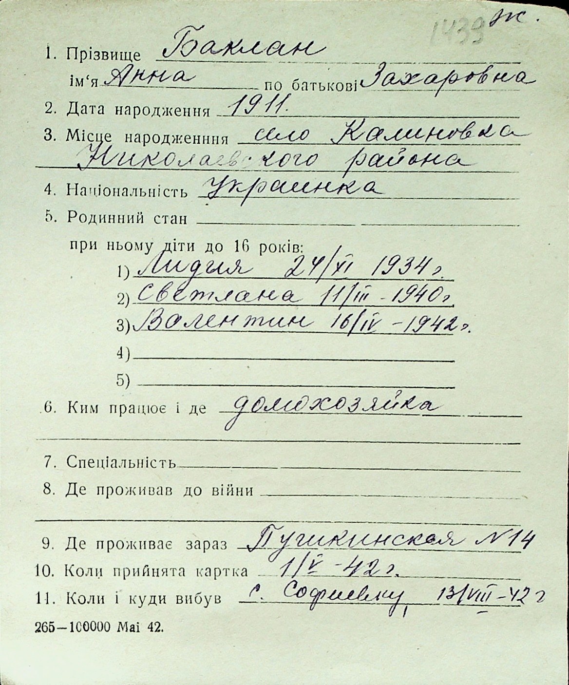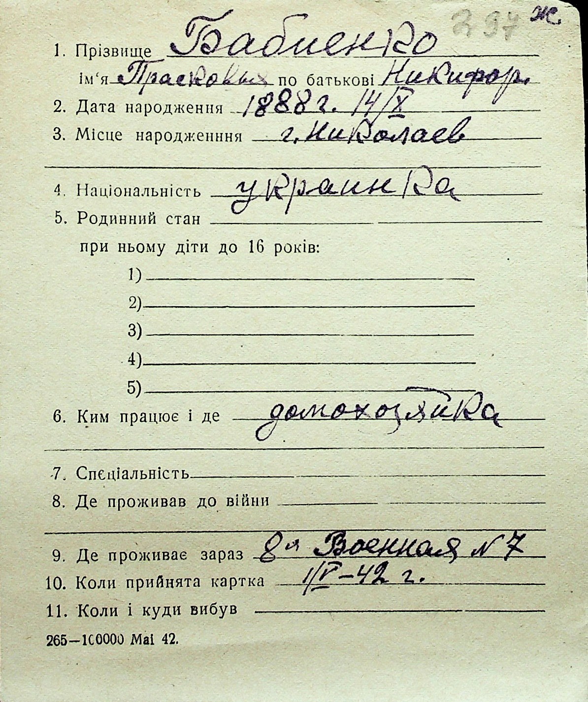 ◦ ◦ Перелік карток на осіб, які мешкали у м. Миколаїв у період окупації 1941–1944 років
