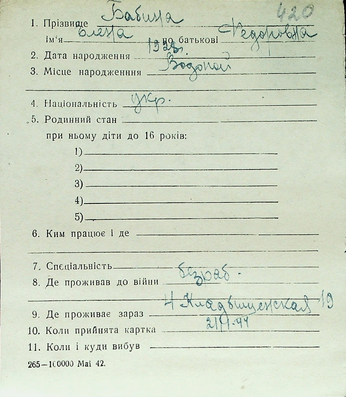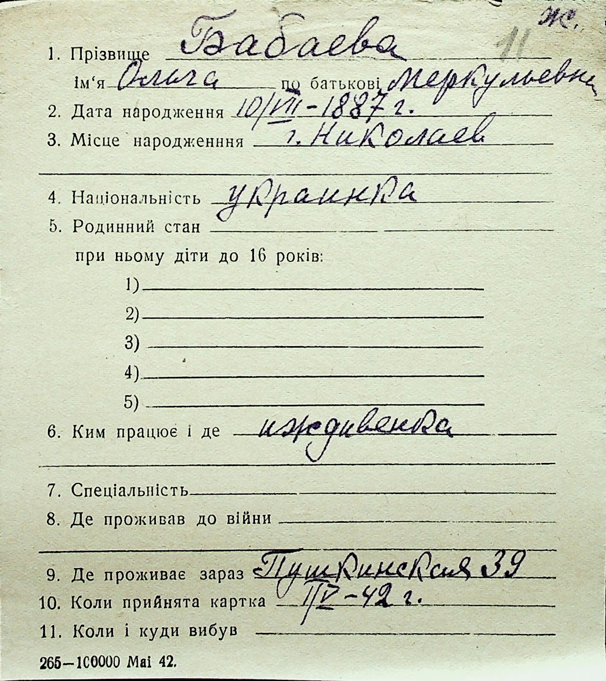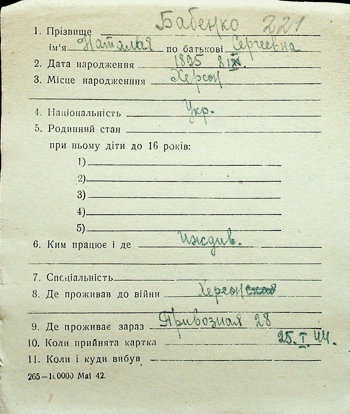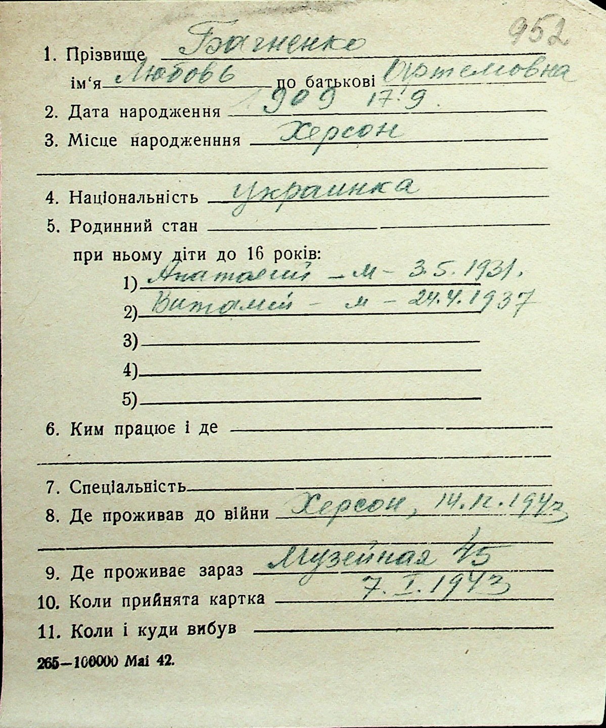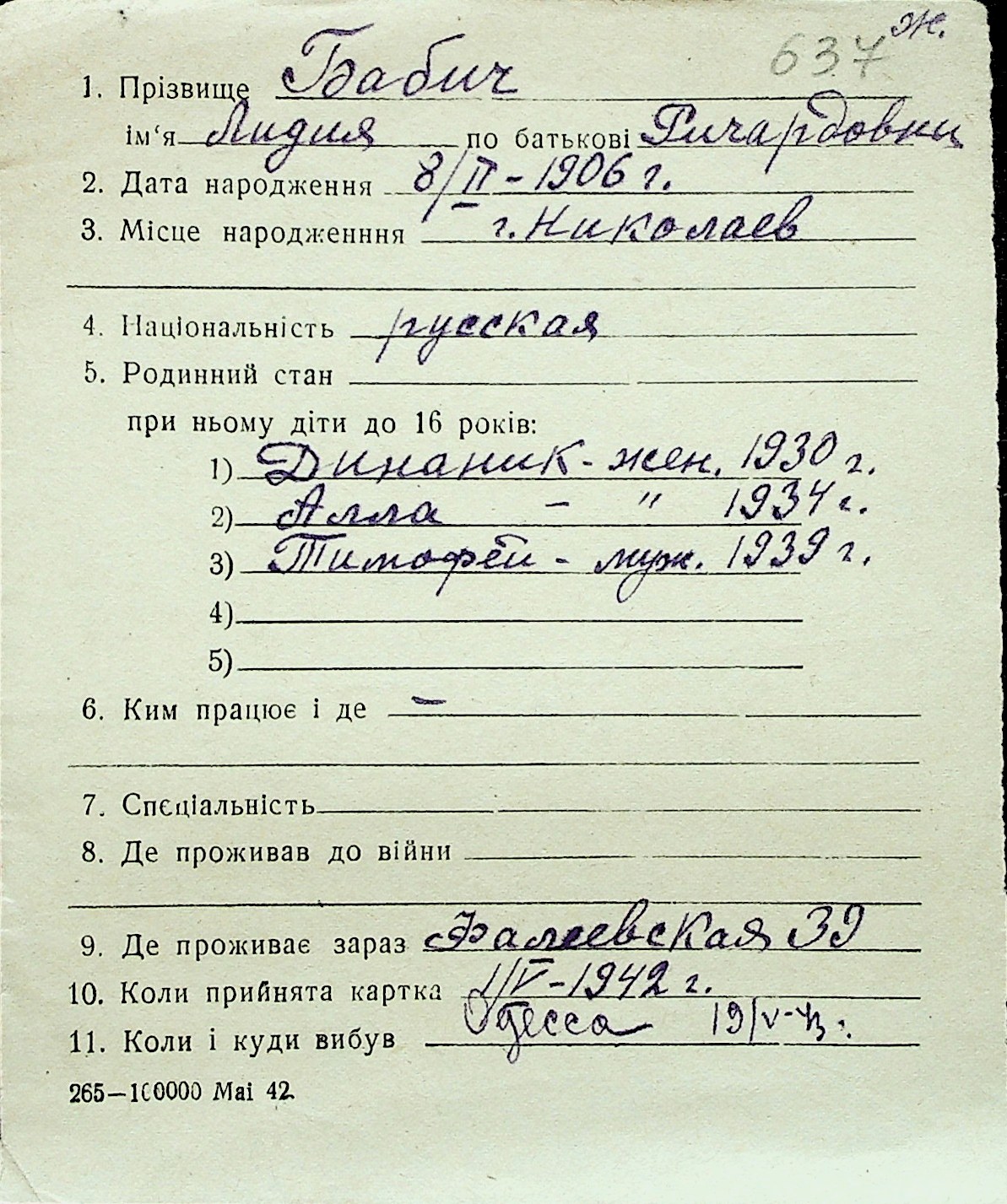 ◦ ◦ Перелік карток на осіб, які мешкали у м. Миколаїв у період окупації 1941–1944 років