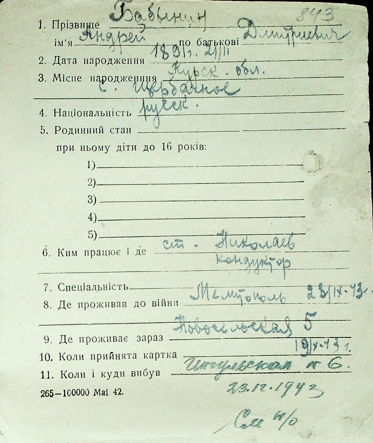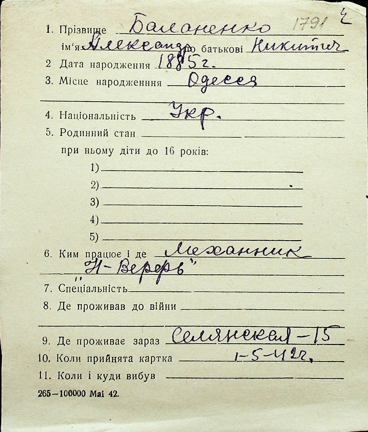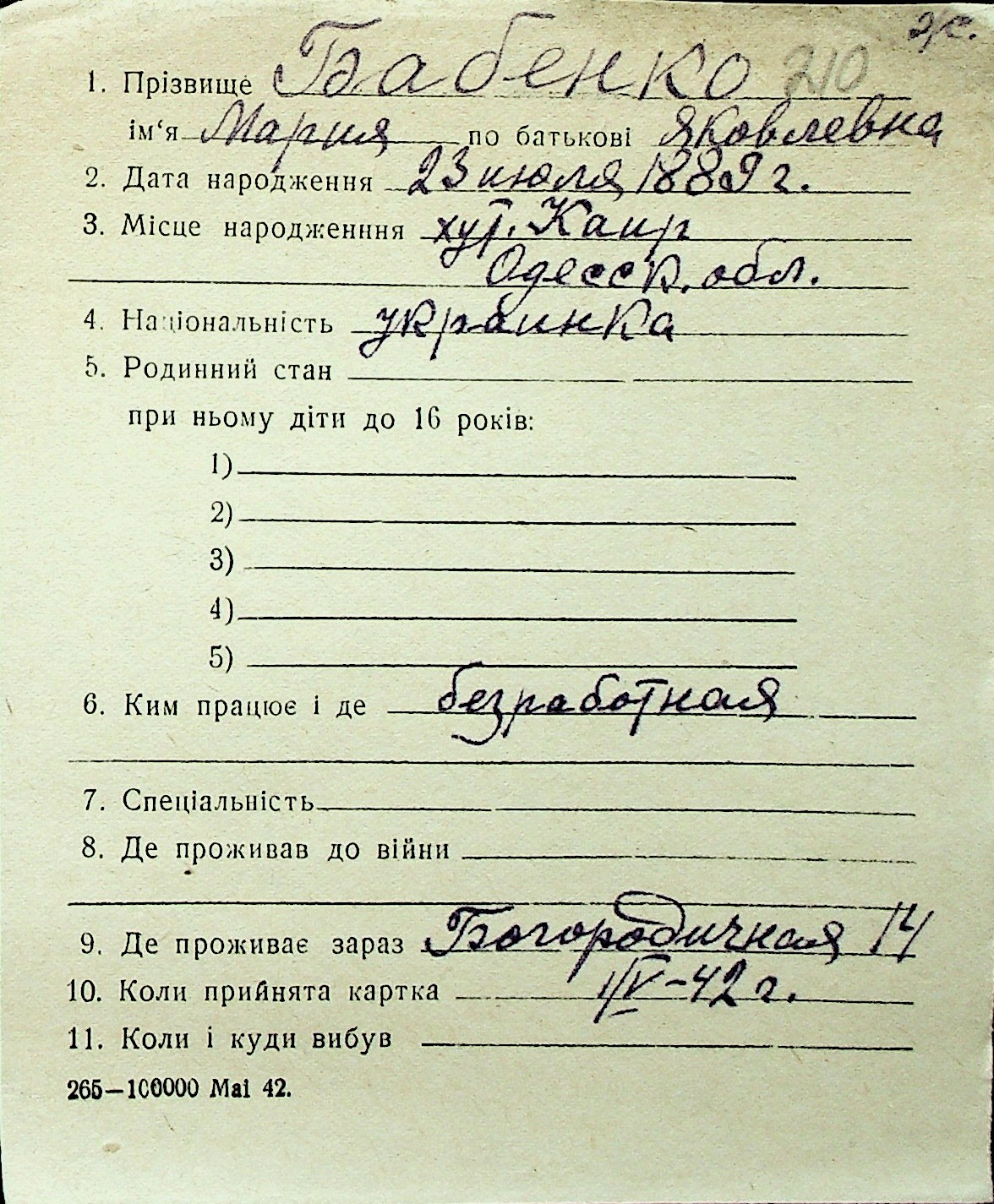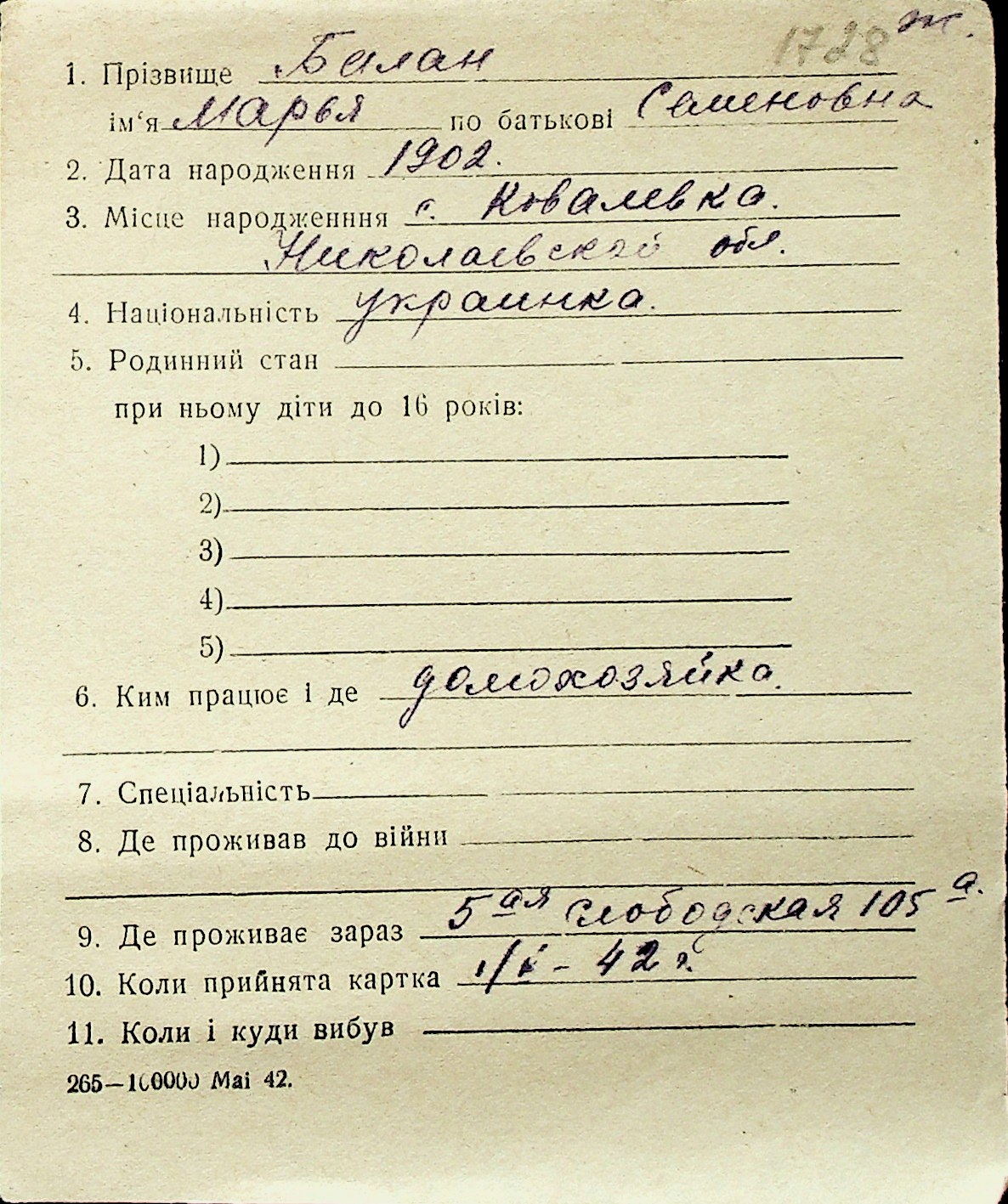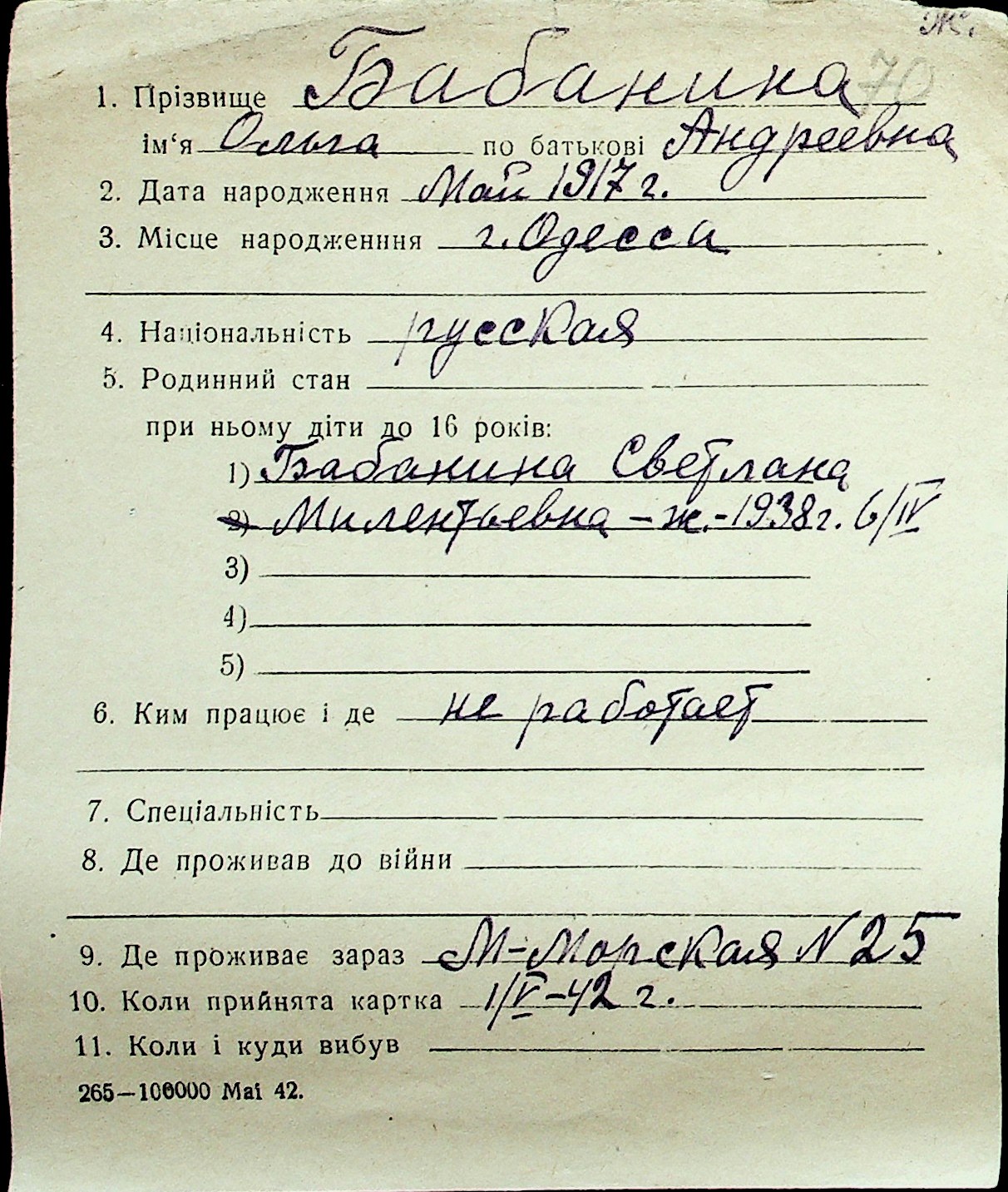 ◦ ◦ Перелік карток на осіб, які мешкали у м. Миколаїв у період окупації 1941–1944 років