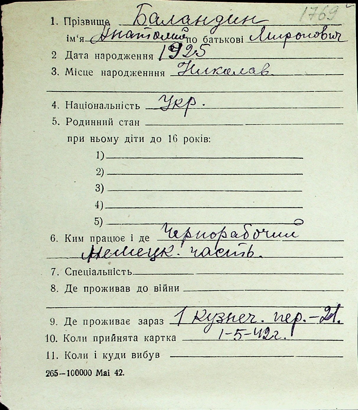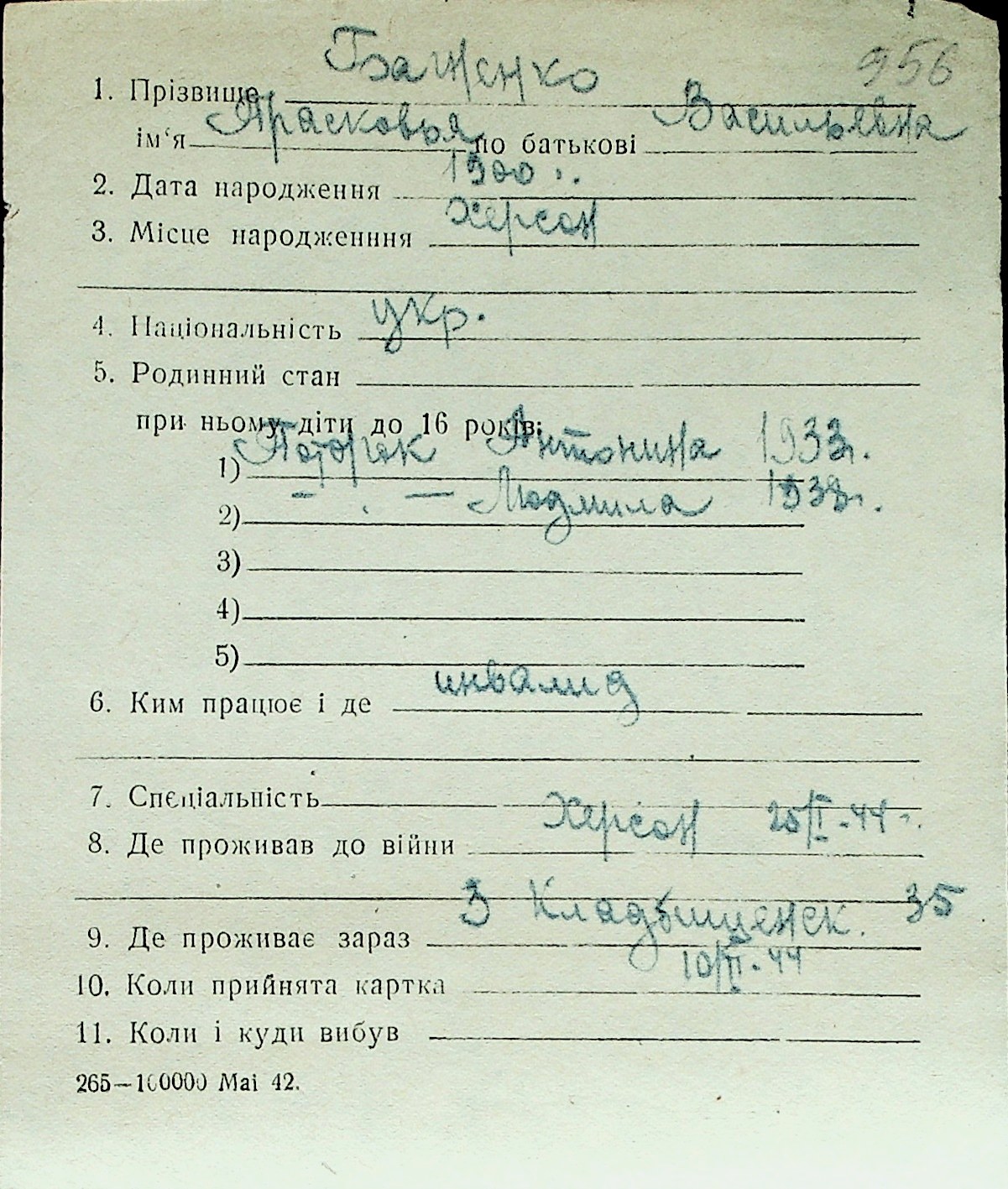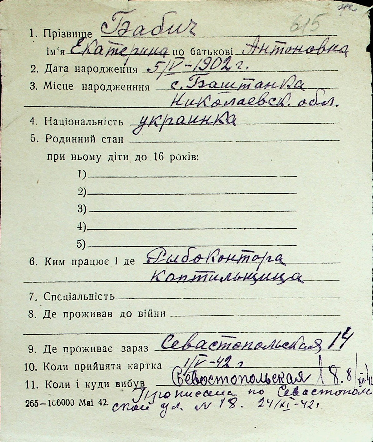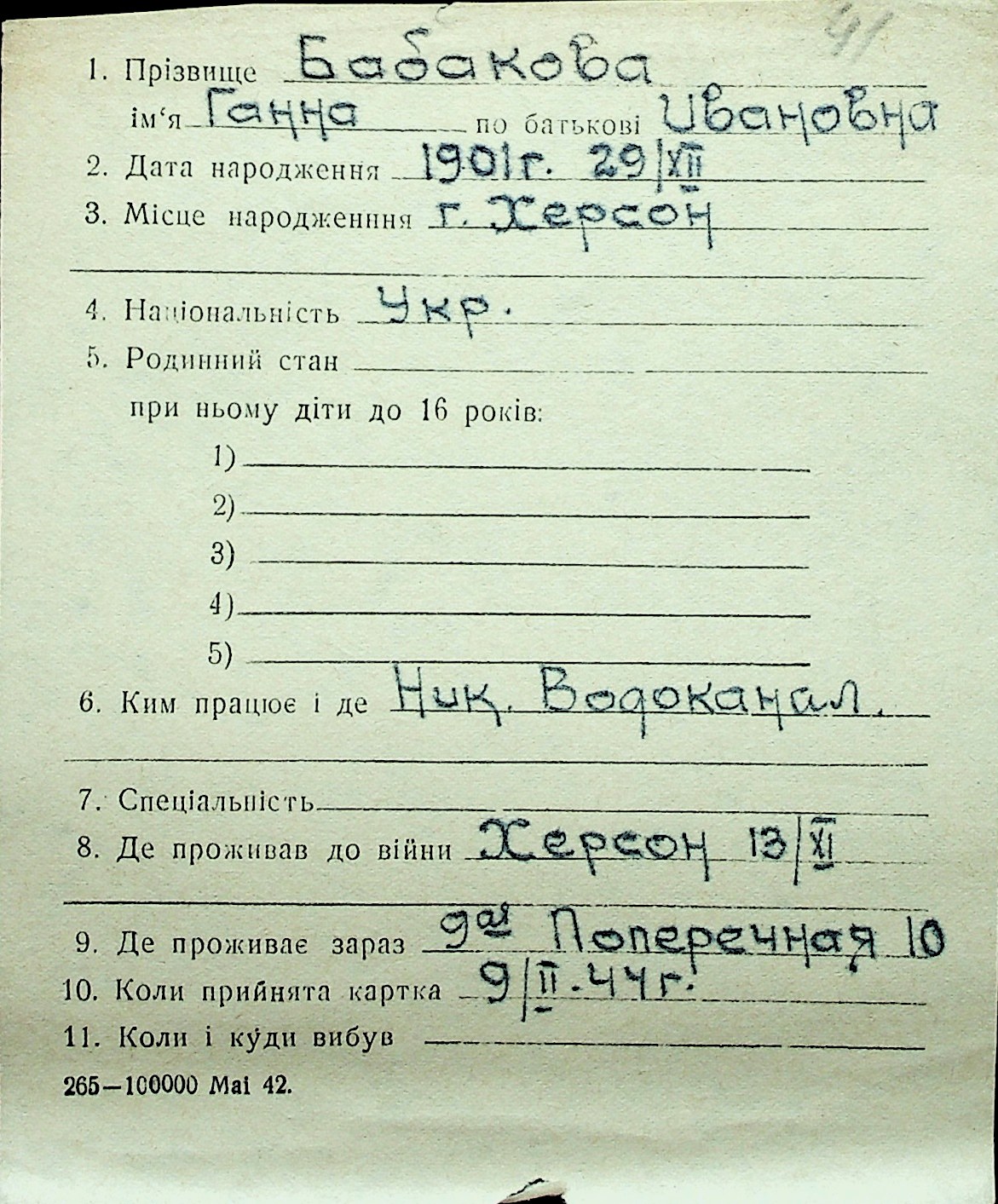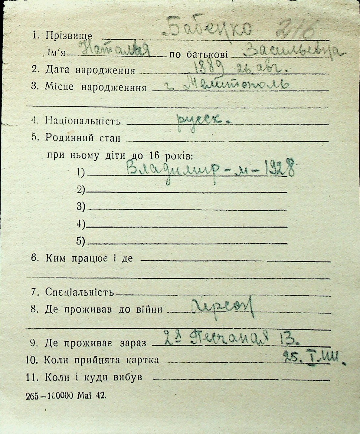 ◦ ◦ Перелік карток на осіб, які мешкали у м. Миколаїв у період окупації 1941–1944 років