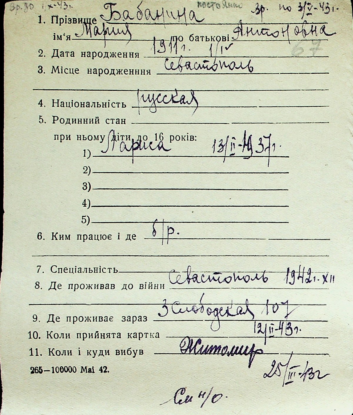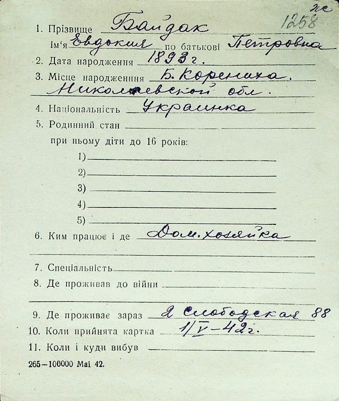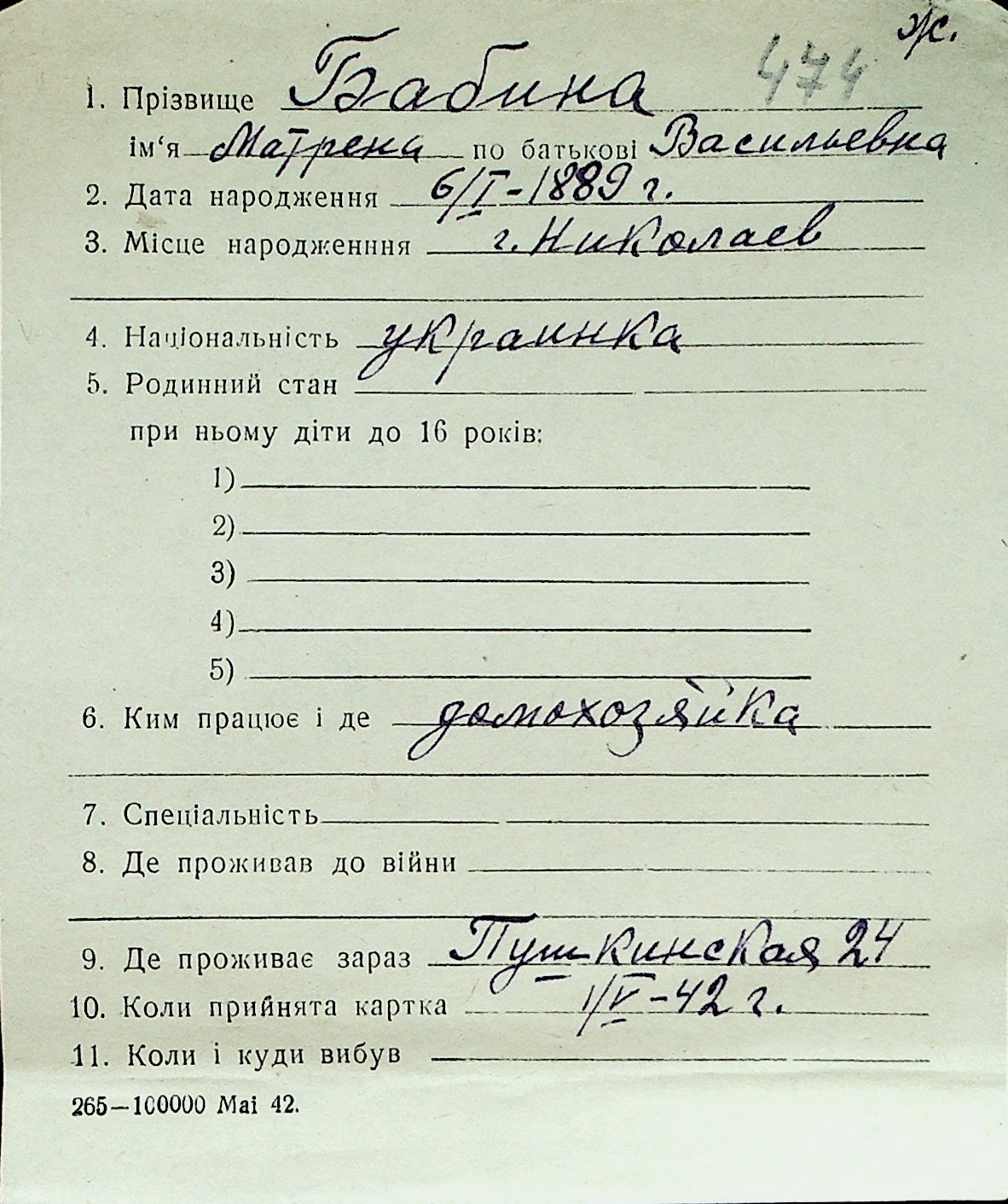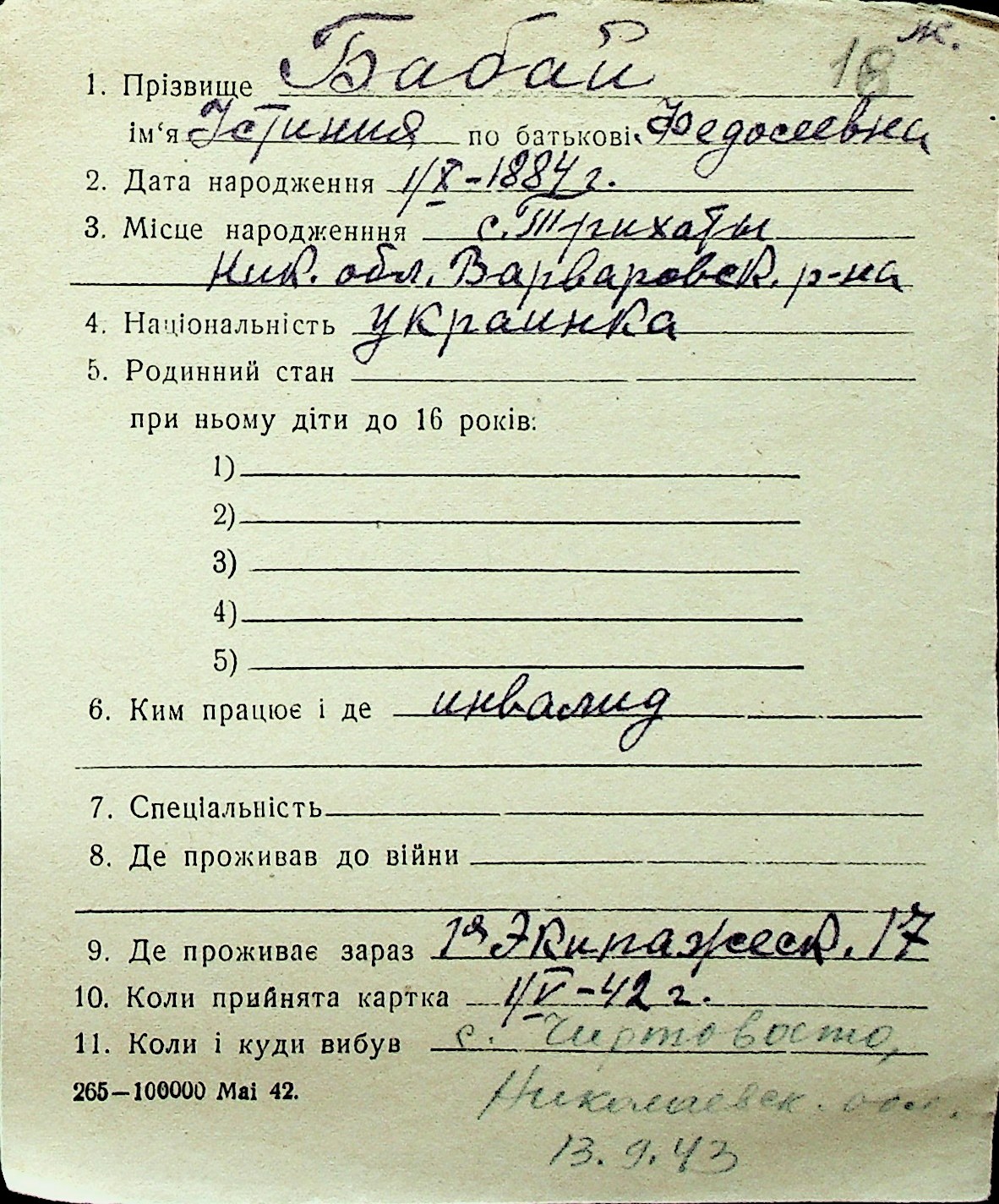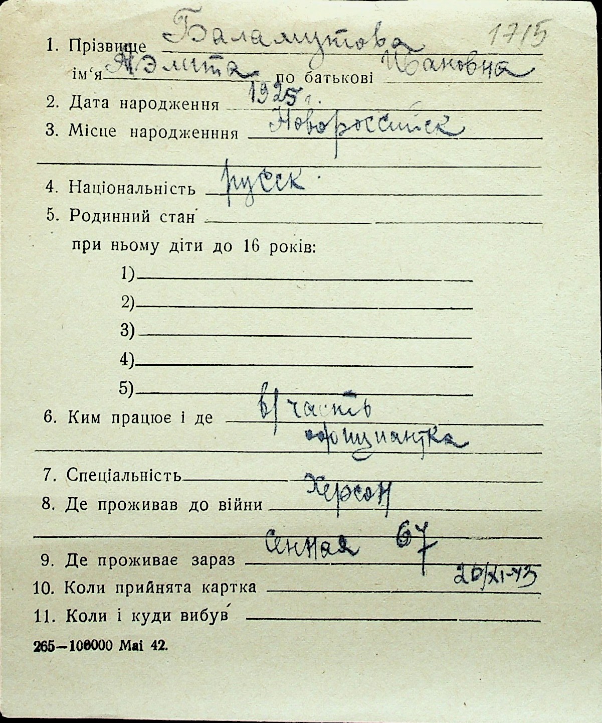 ◦ ◦ Перелік карток на осіб, які мешкали у м. Миколаїв у період окупації 1941–1944 років