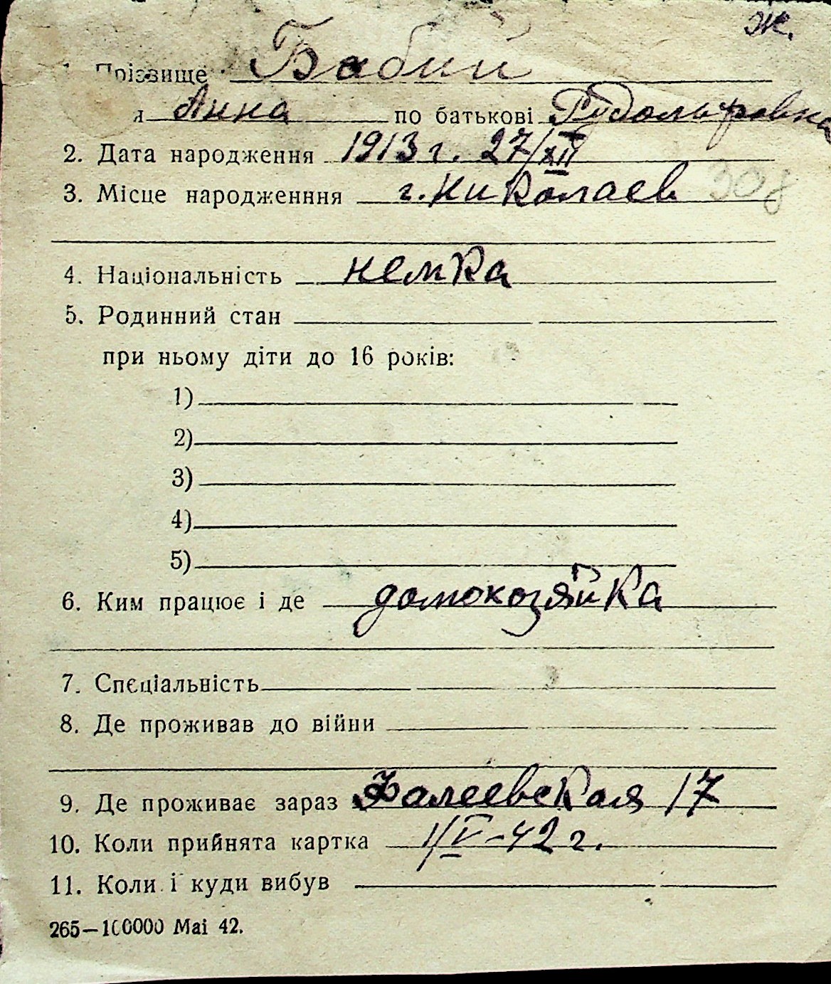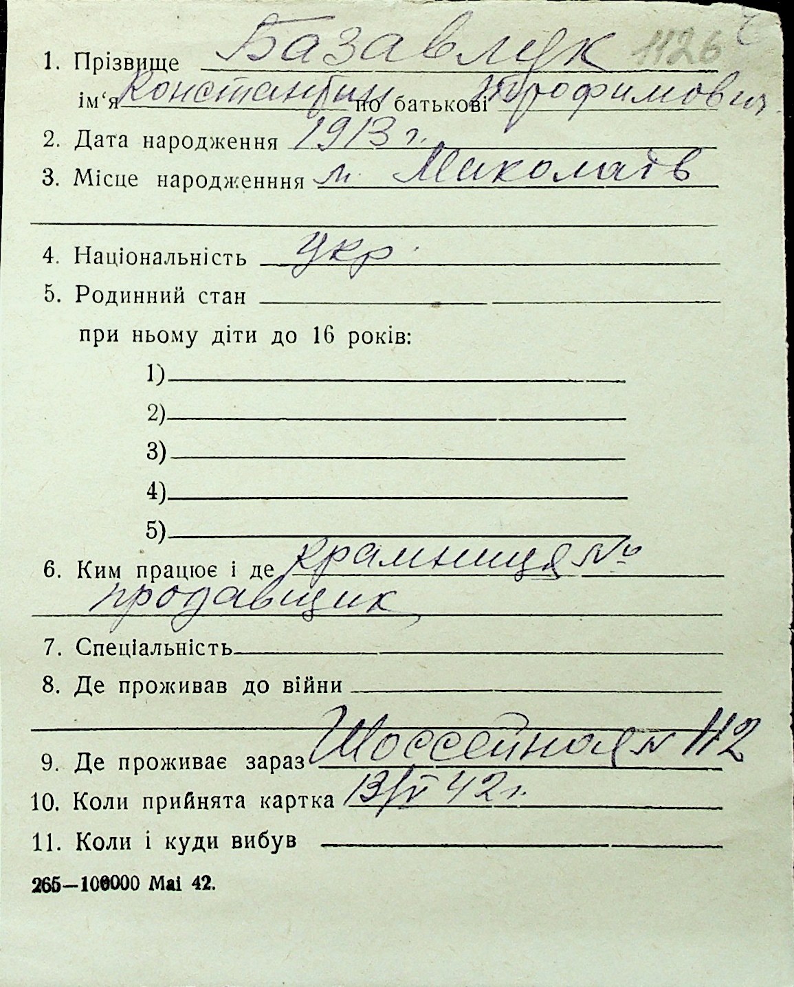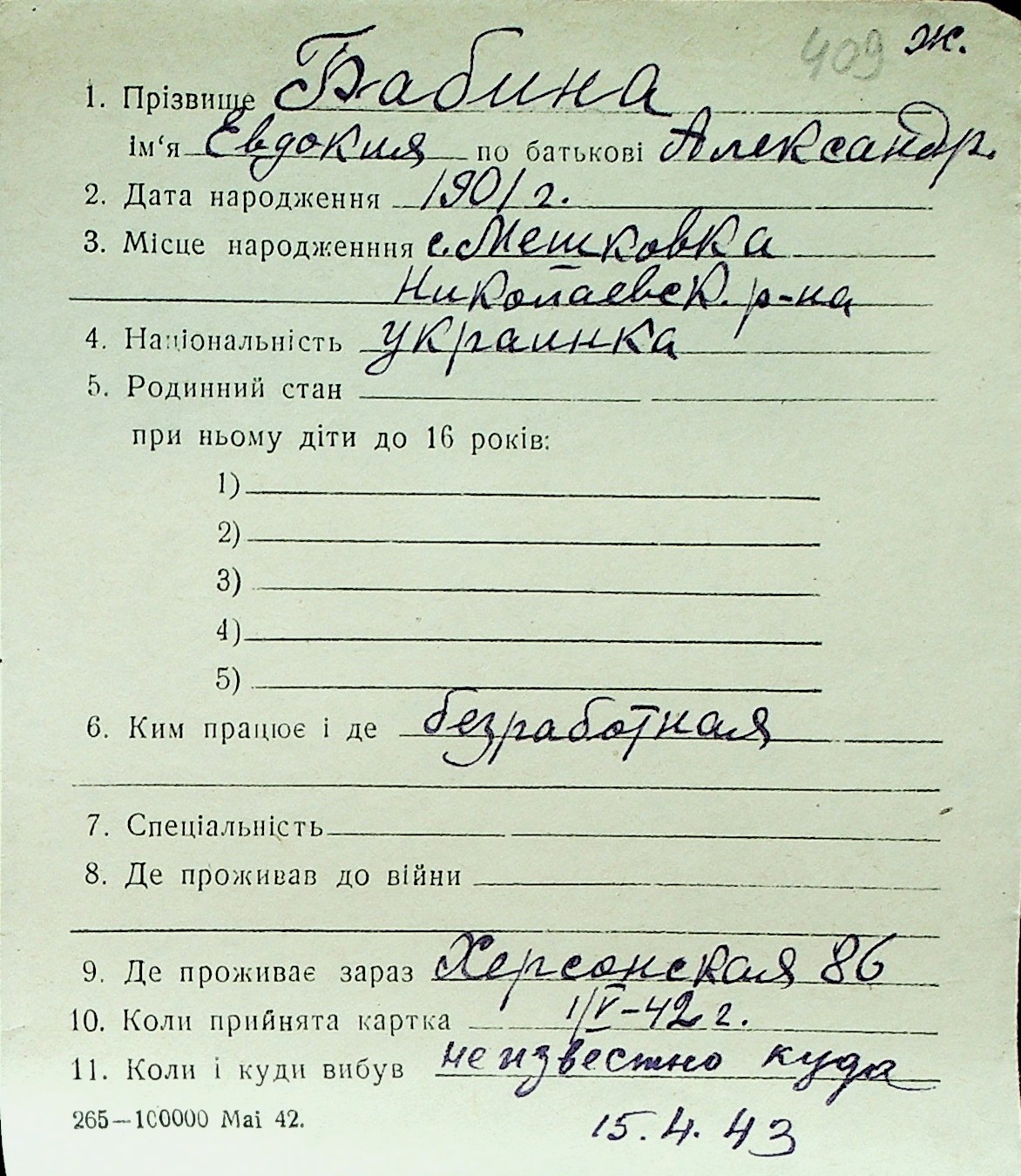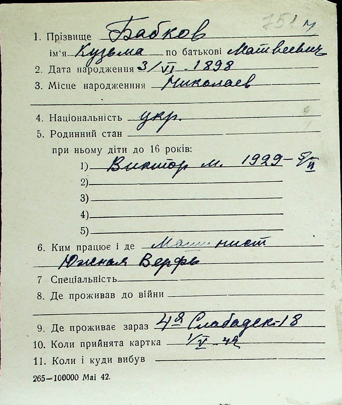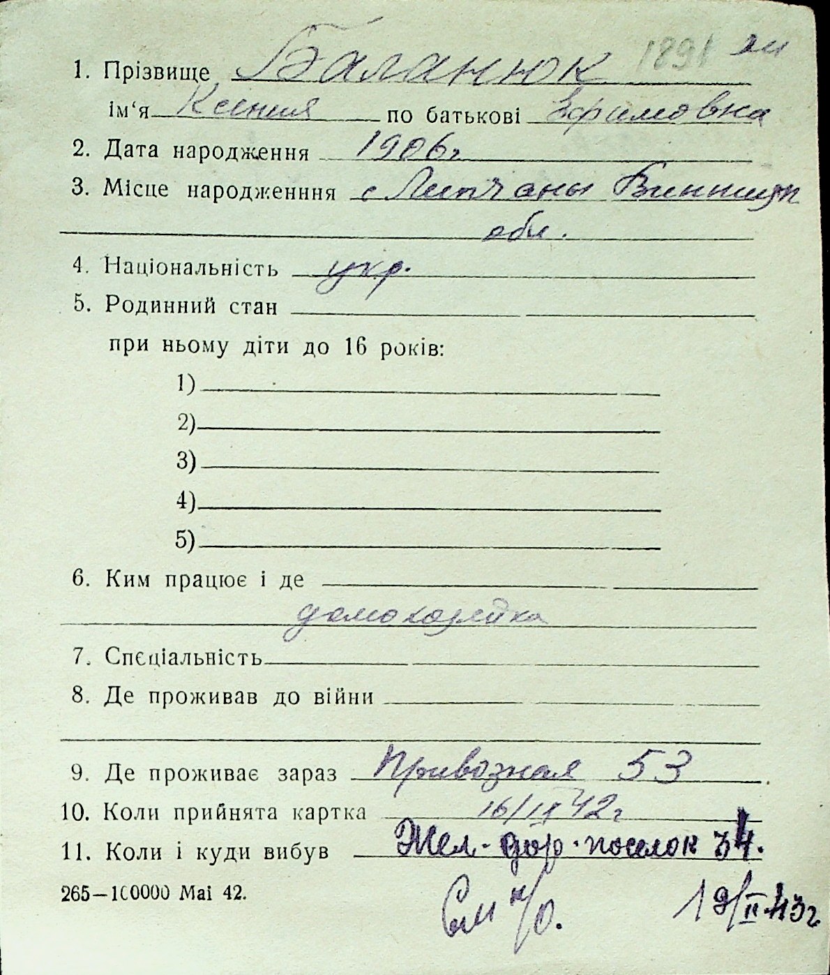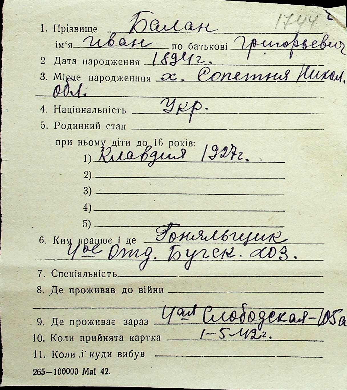 ◦ ◦ Перелік карток на осіб, які мешкали у м. Миколаїв у період окупації 1941–1944 років
