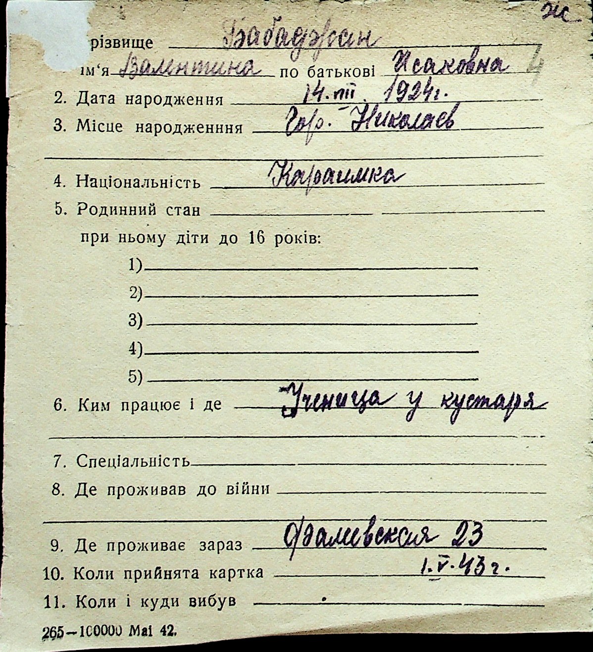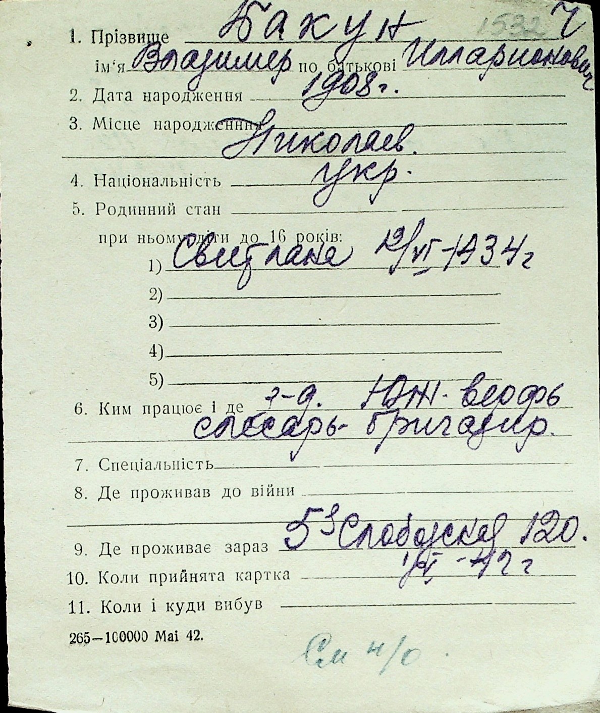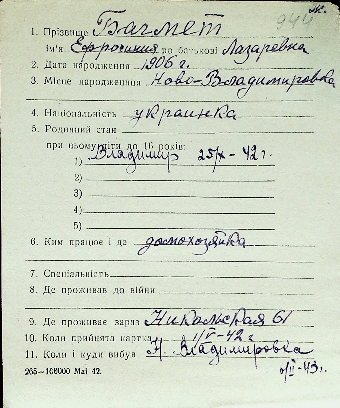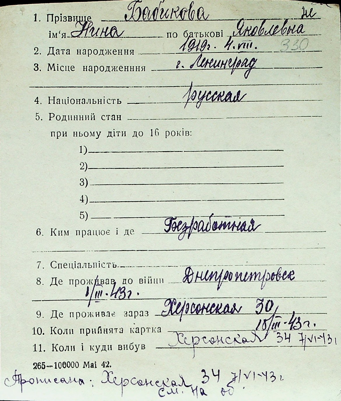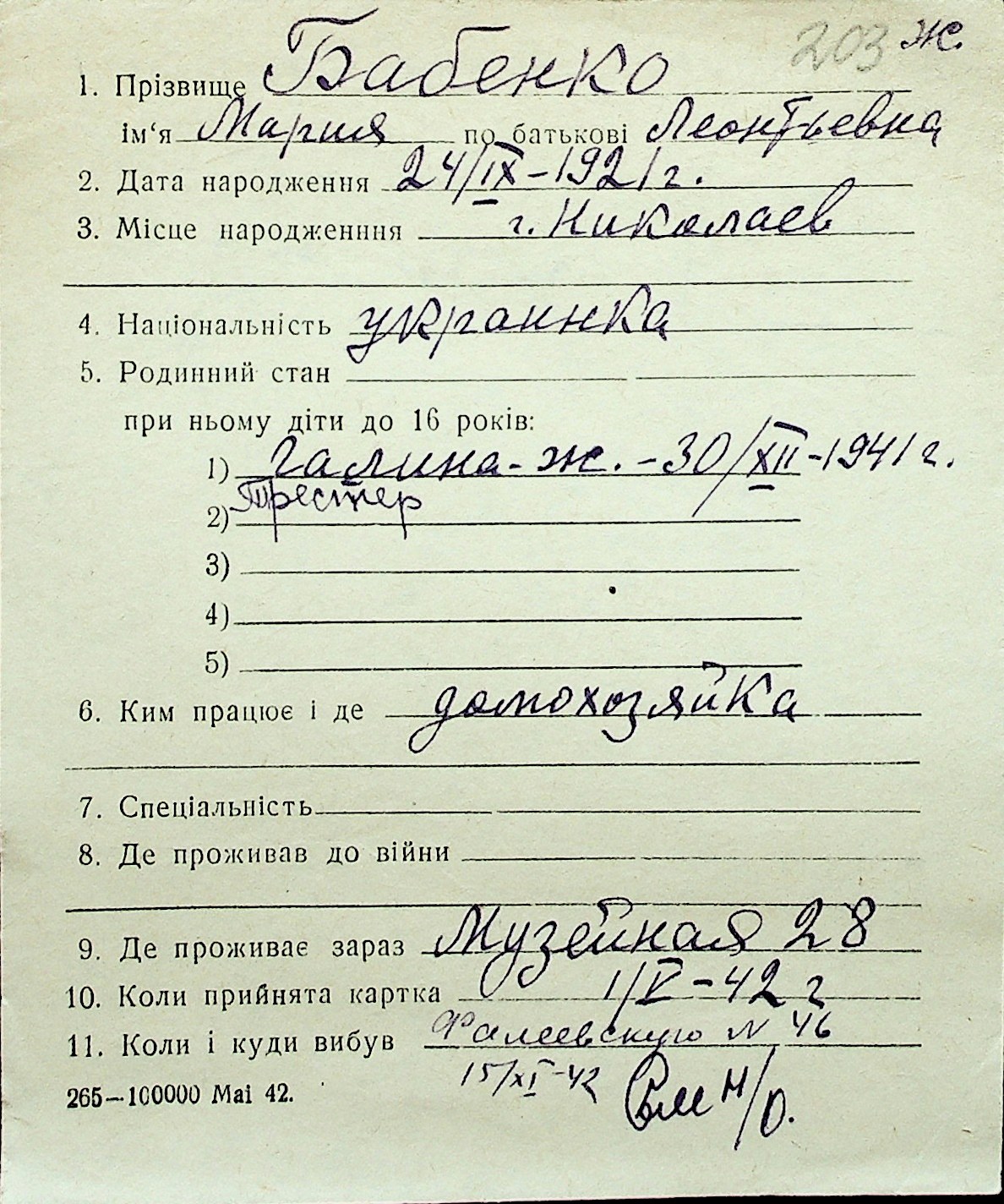◦ ◦ Перелік карток на осіб, які мешкали у м. Миколаїв у період окупації 1941–1944 років